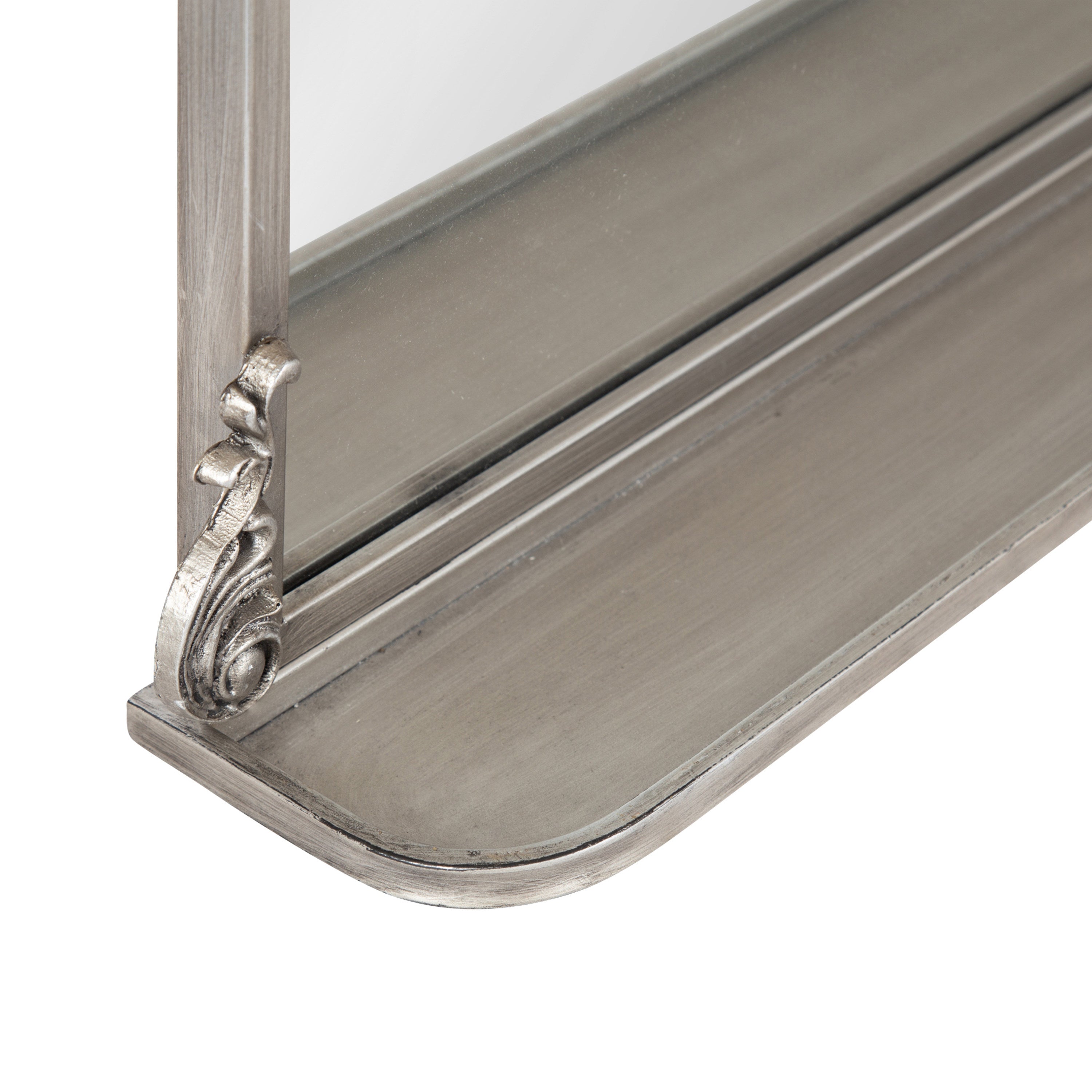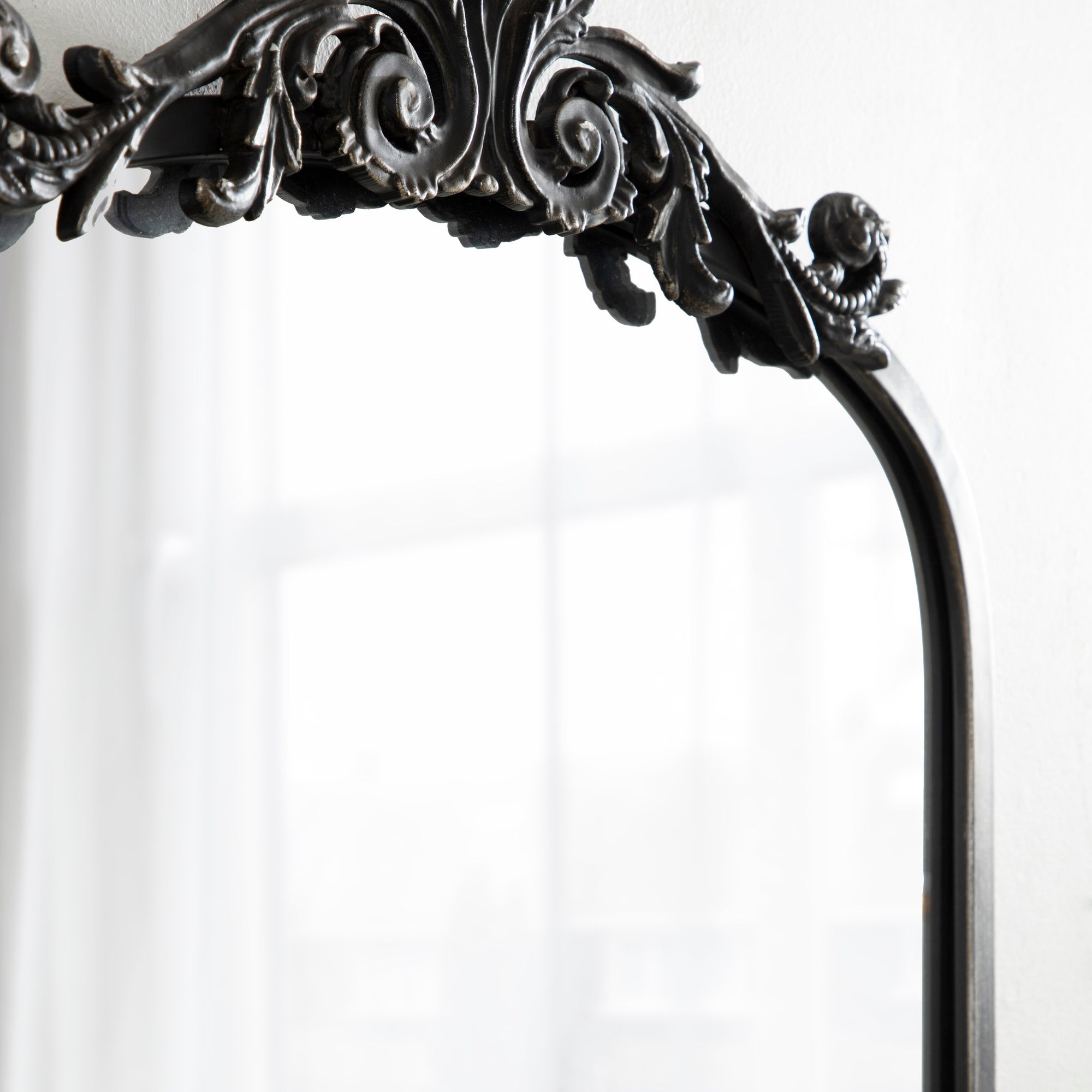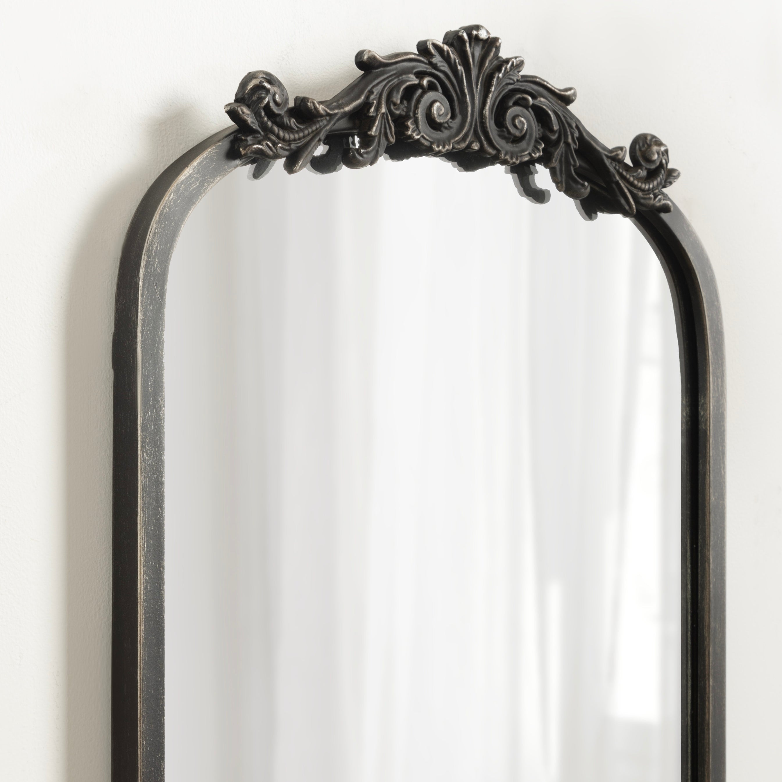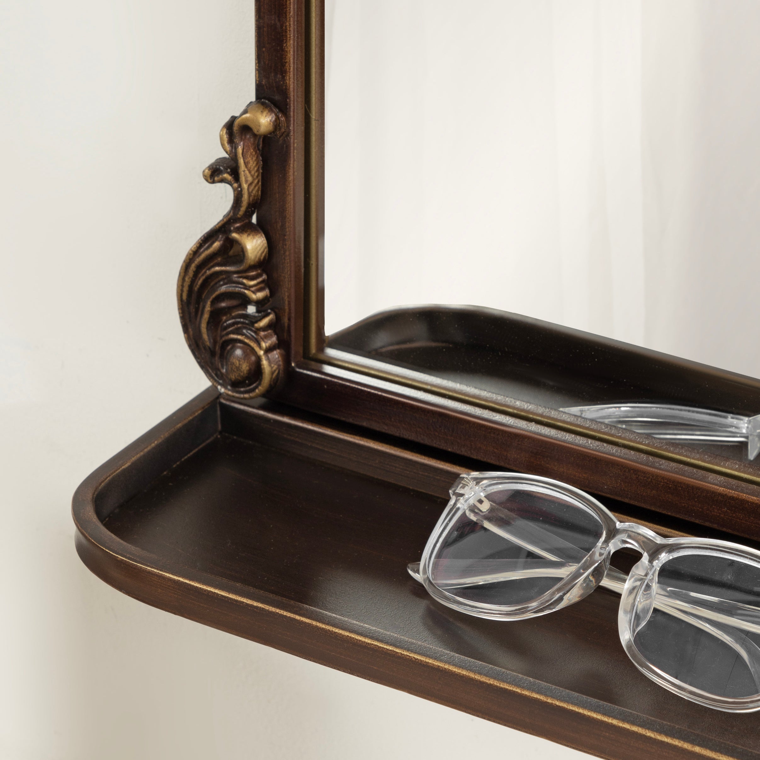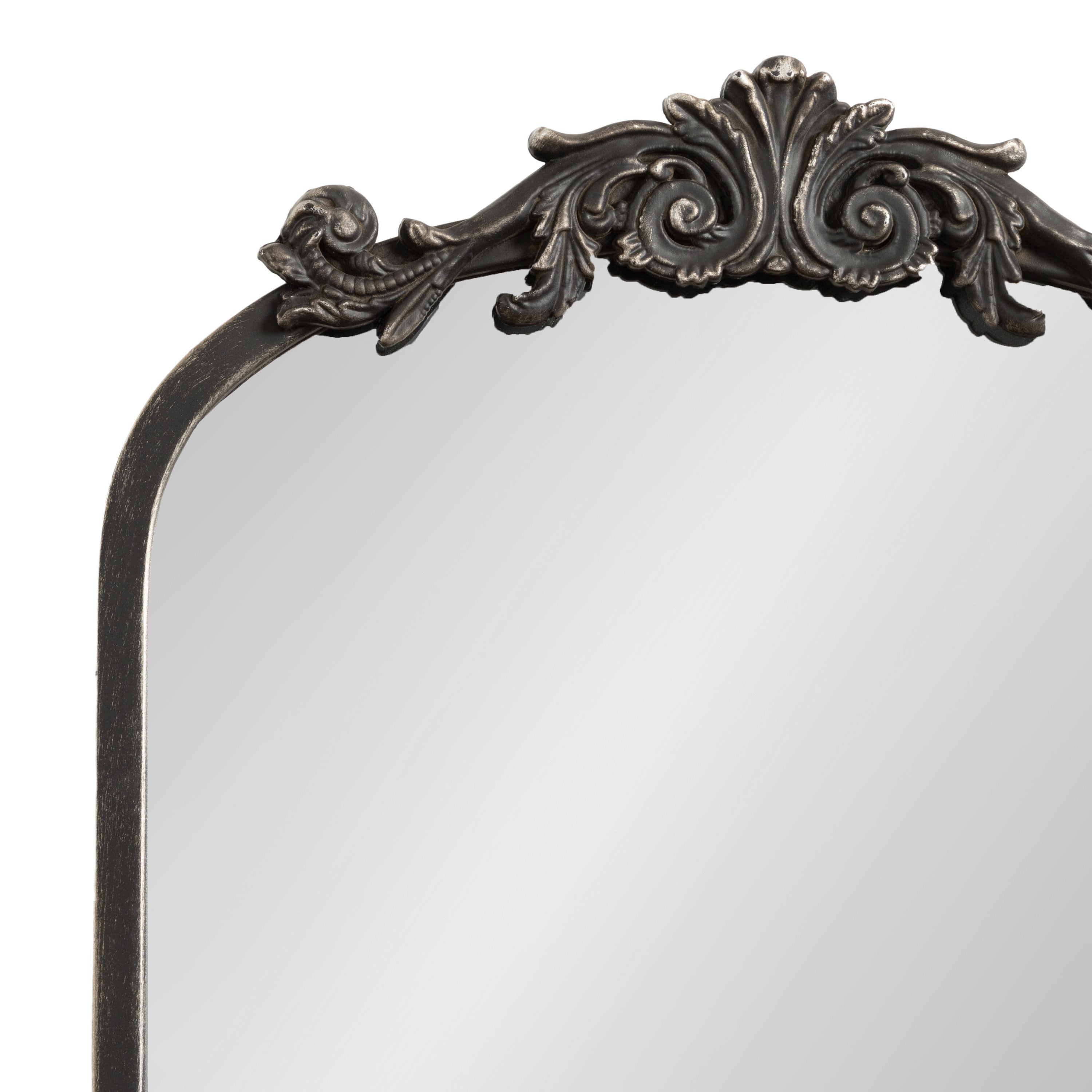 The Arendahl wall mirror brings a brilliant and decadent accent to any traditional home design. This wall mirror features a baroque-inspired design, with a resin garland crown cascading down a wide arched iron frame. The stunning antique finish brings it together as a vintage piece to display anywhere in your home. This version of the Arendahl features a functional shelf to place some small decor accents or necessary household items. Use the fabulous Arendahl wall mirror to bring dimension to your smaller spaces, opening up the area, and illuminating the darker corners. This framed mirror is also easy to hang, with metal keyhole wall hangers discreetly and securely attached to the back. Assembling this arch mirror is simple with a one-step assembly process to attach the shelf to the mirror.