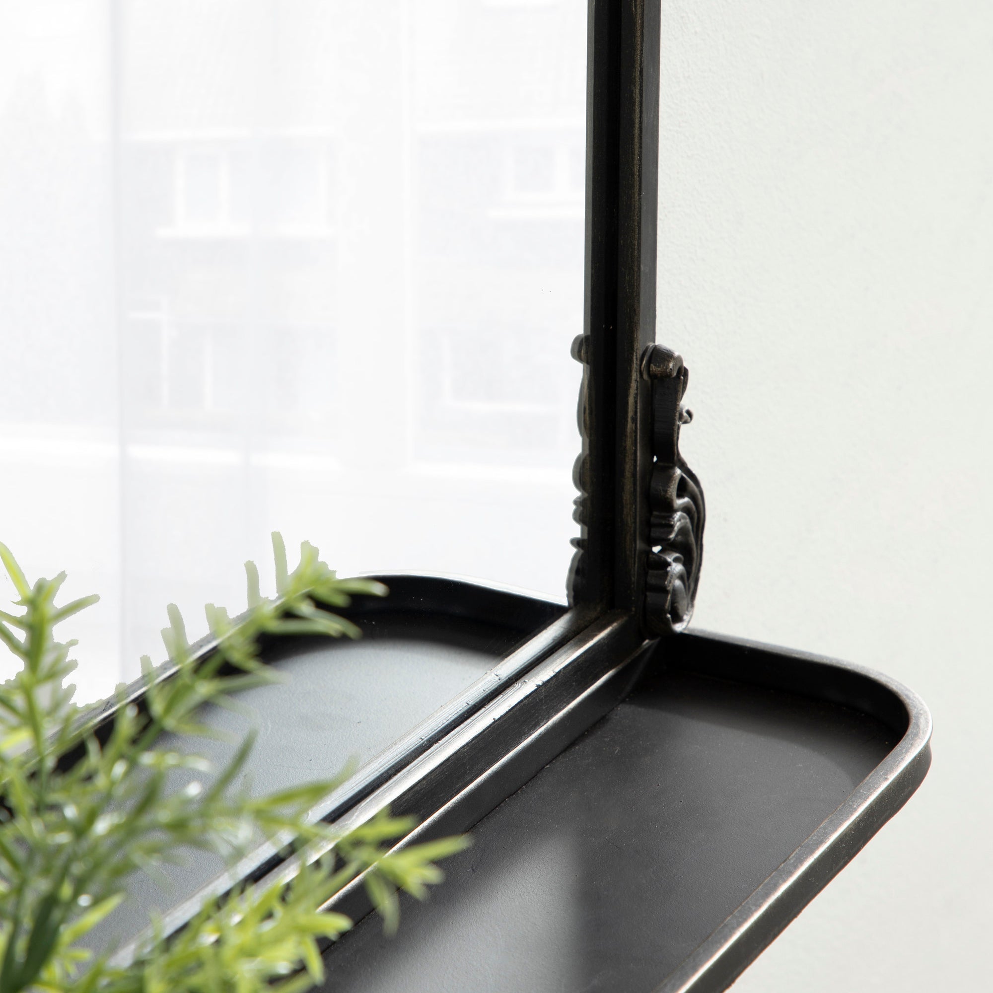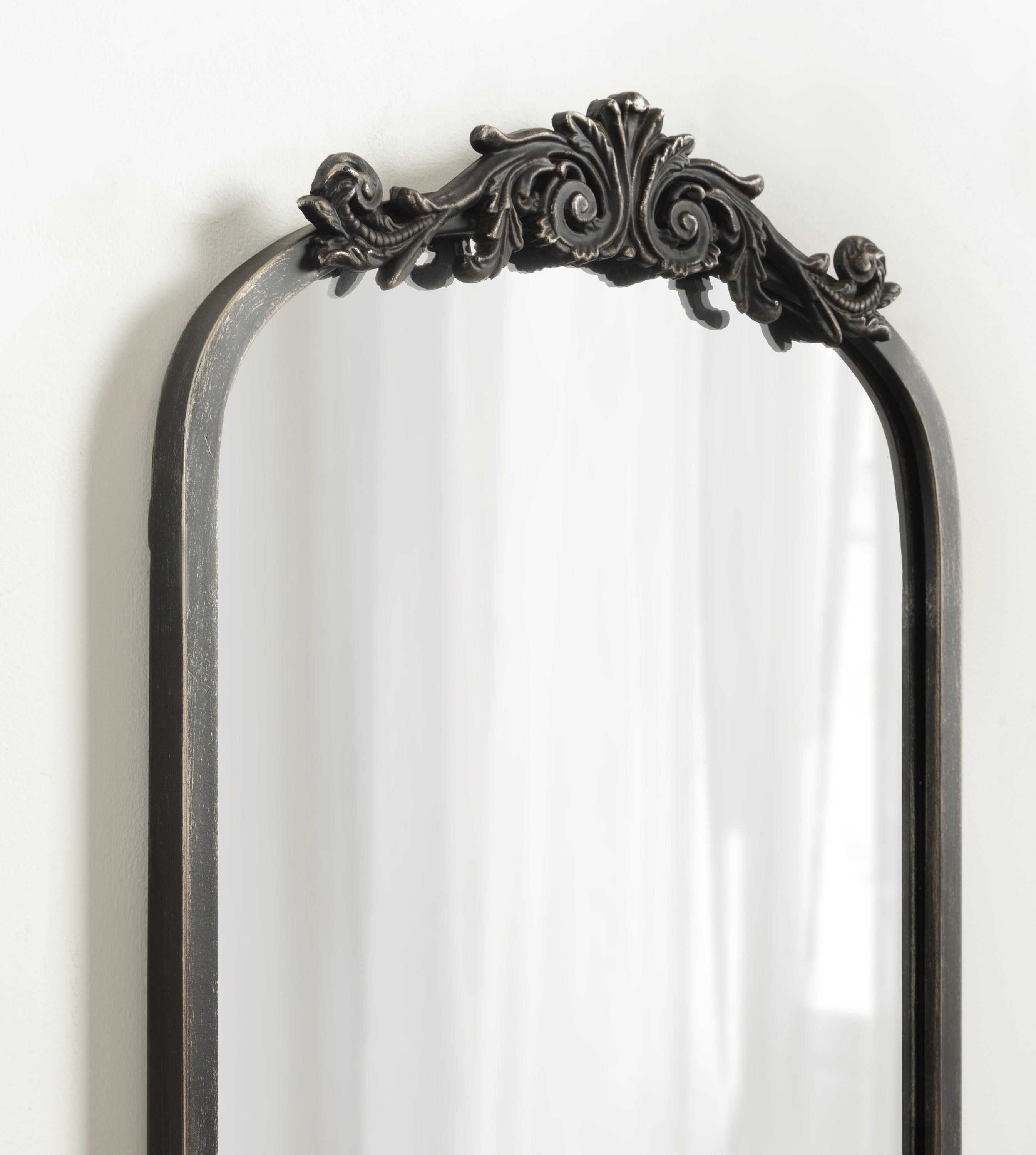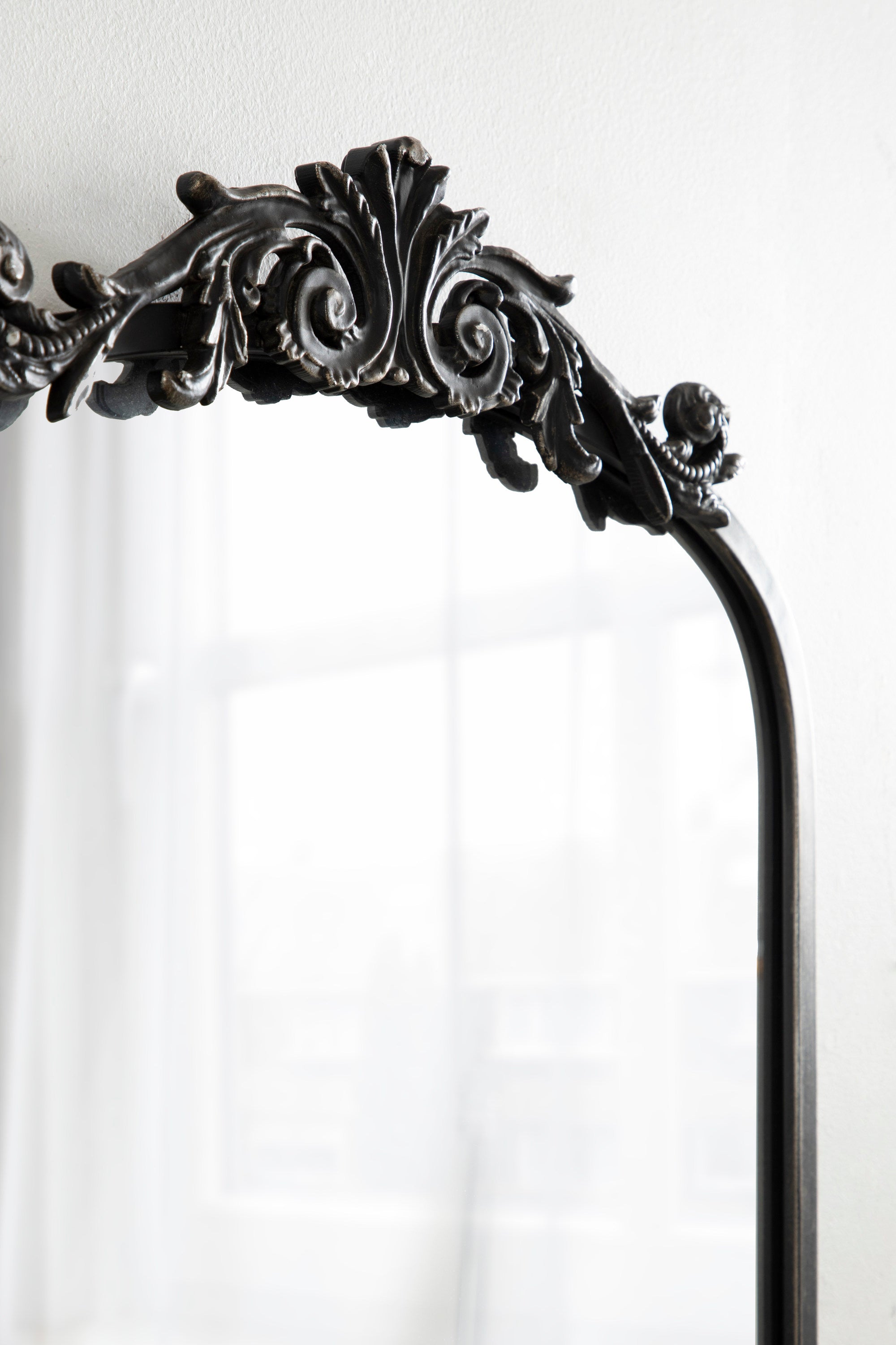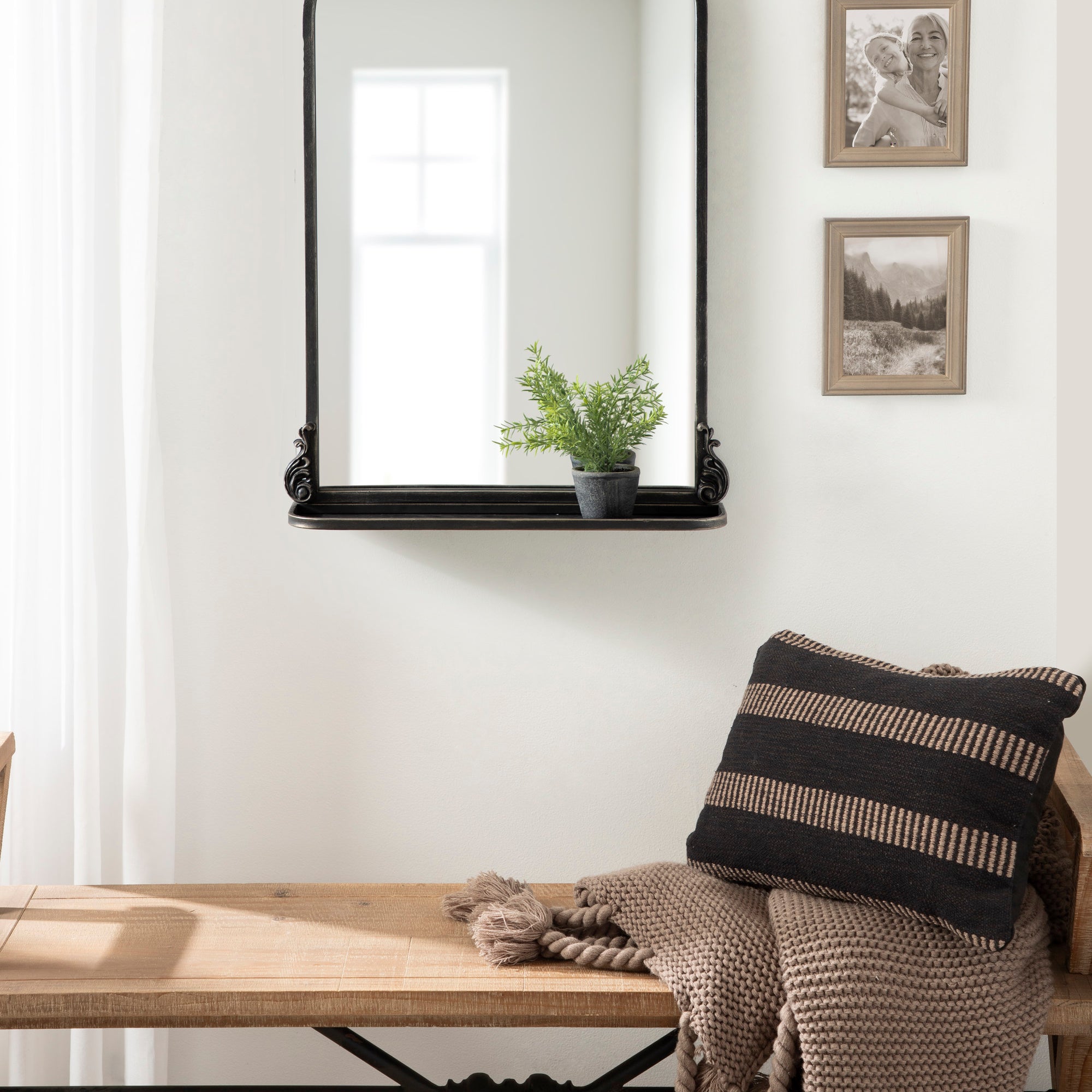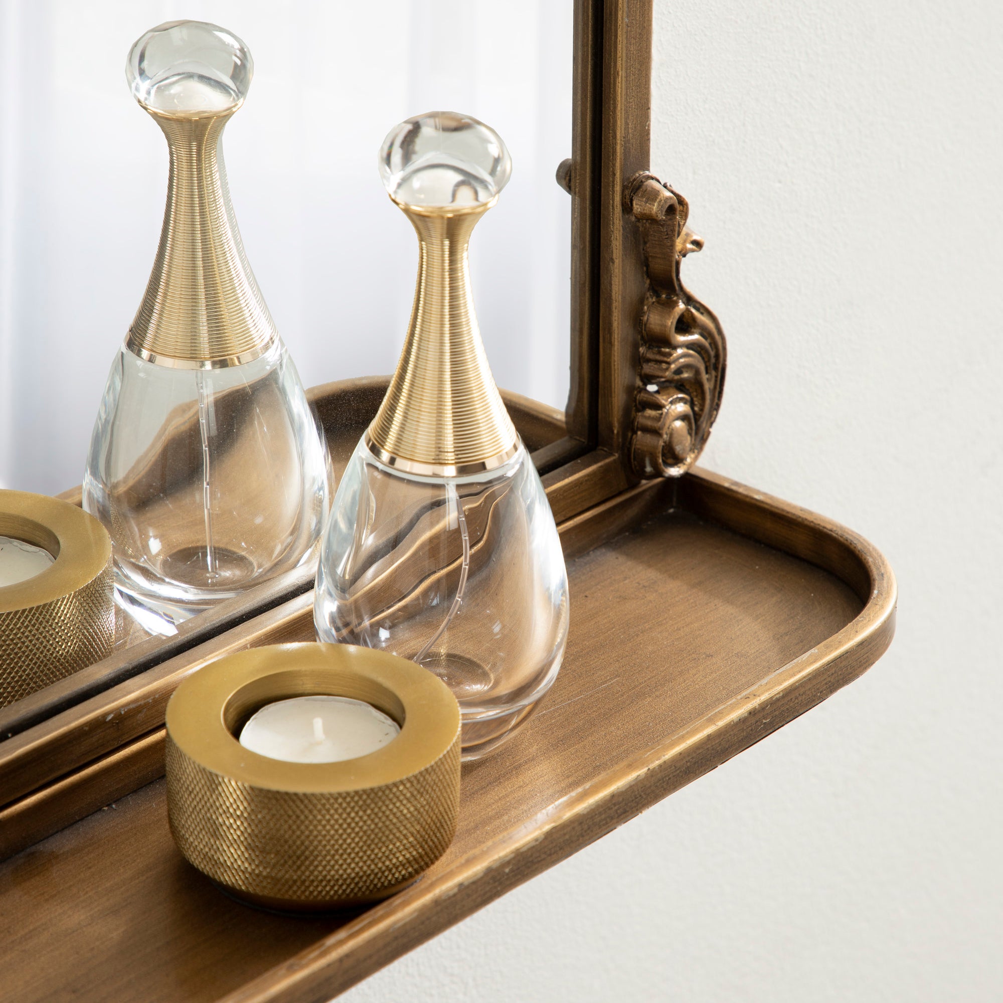 The Arendahl wall mirror brings a brilliant and decadent accent to any traditional home design. This wall mirror features a baroque-inspired design, with a resin garland crown cascading down a wide arched iron frame. The stunning antique finish brings it together as a vintage piece to display anywhere in your home. This version of the Arendahl features a functional shelf to place some small decor accents or necessary household items. Use the fabulous Arendahl wall mirror to bring dimension to your smaller spaces, opening up the area, and illuminating the darker corners. This framed mirror is also easy to hang, with metal keyhole wall hangers discreetly and securely attached to the back. Assembling this arch mirror is simple with a one-step assembly process to attach the shelf to the mirror.