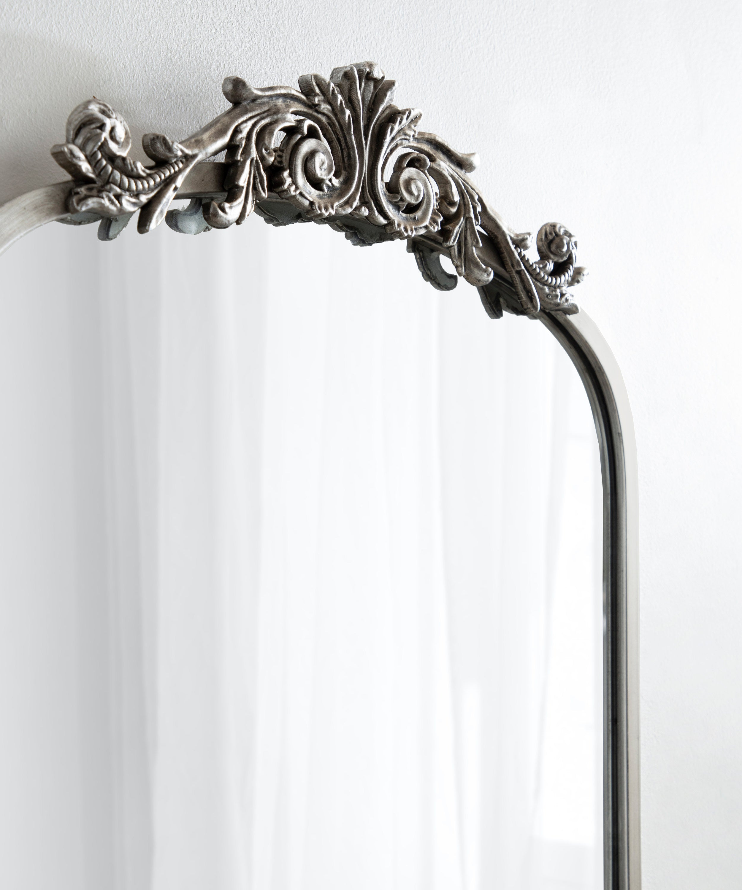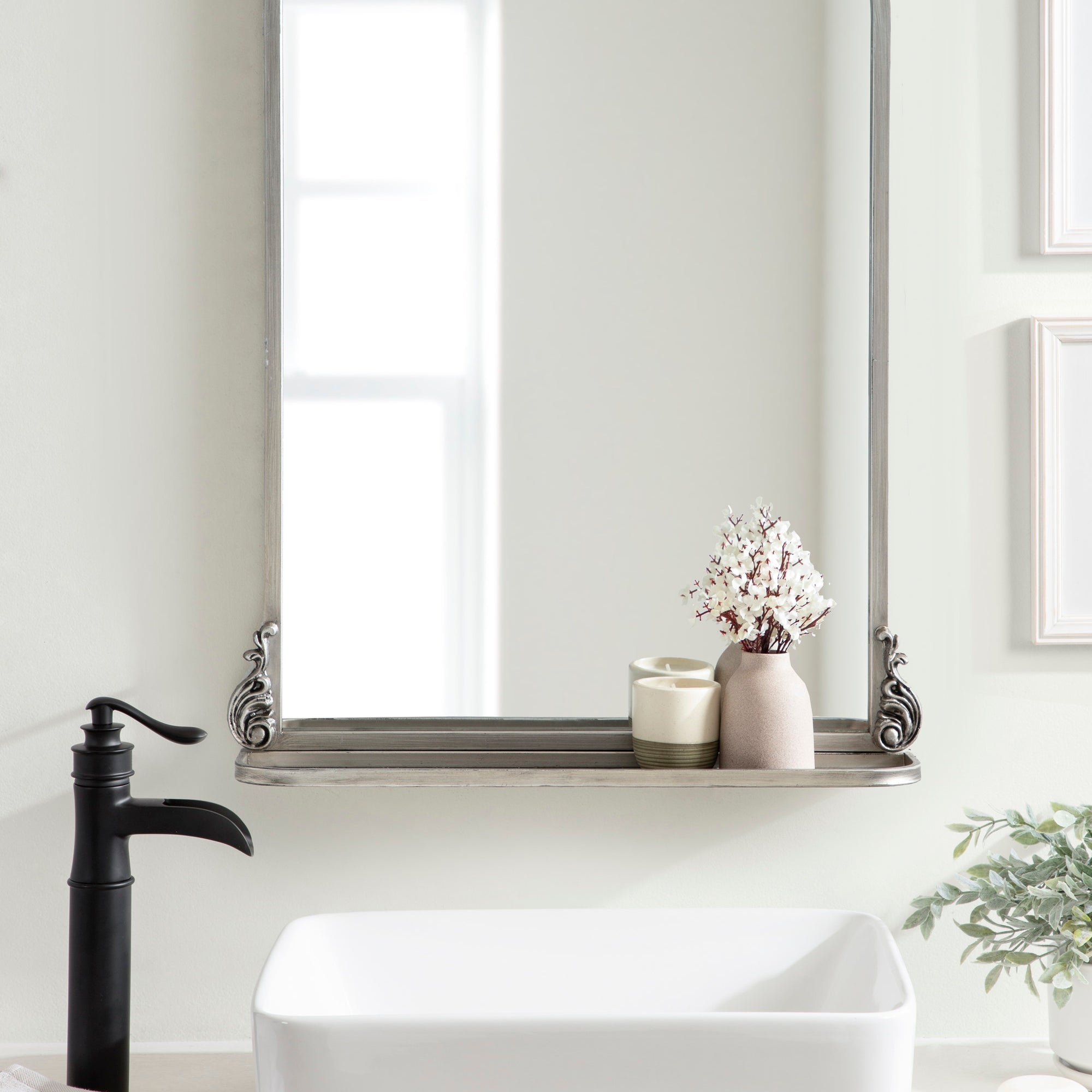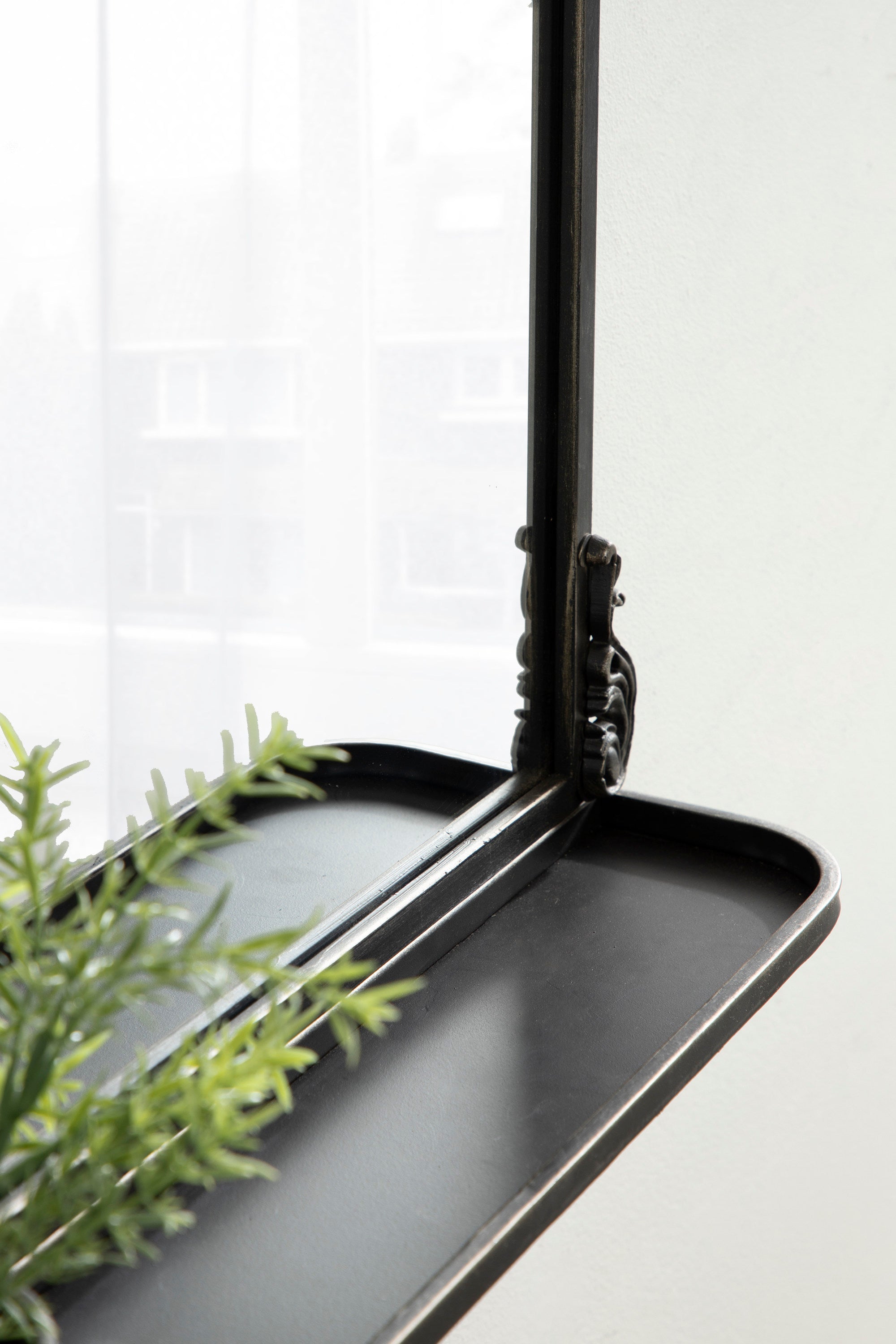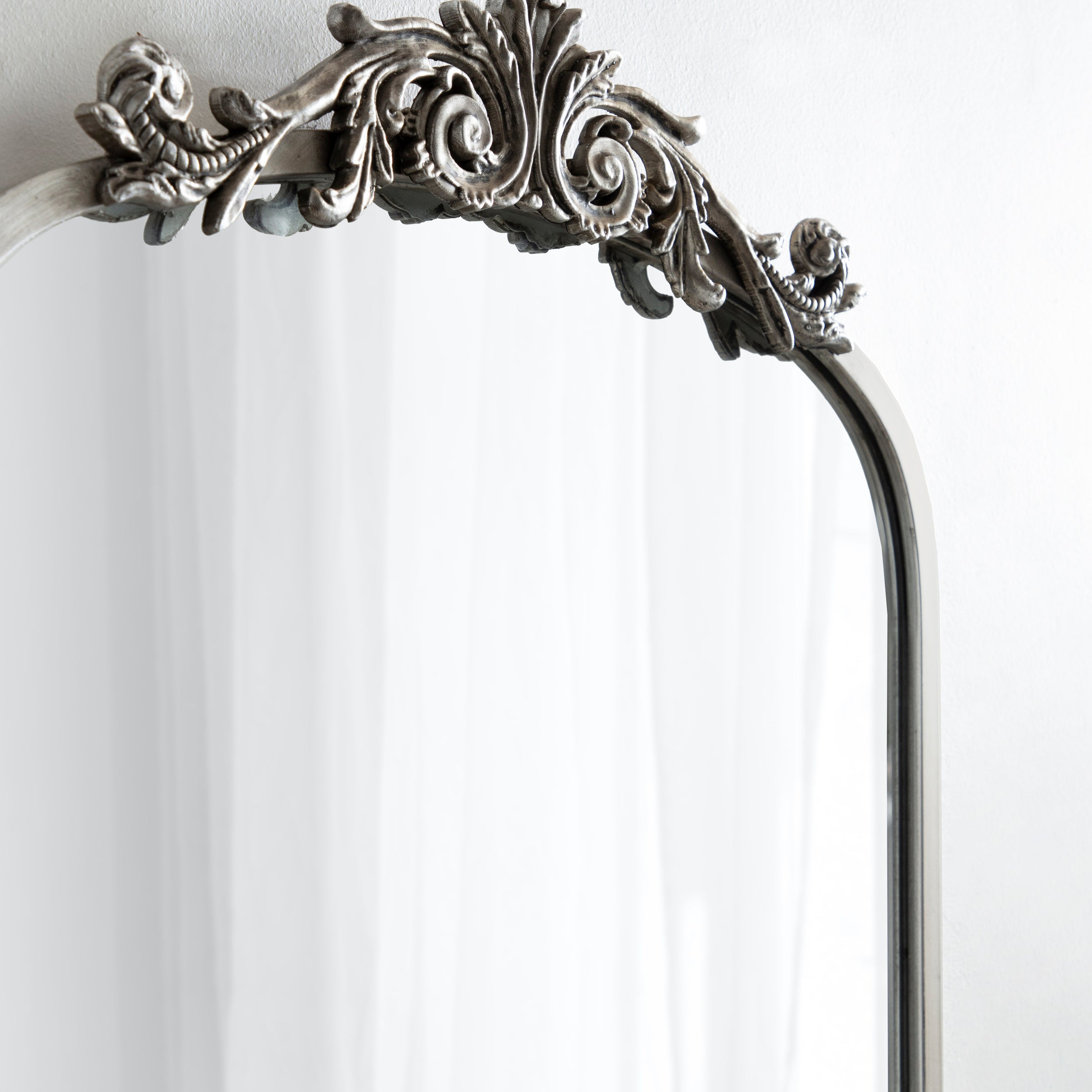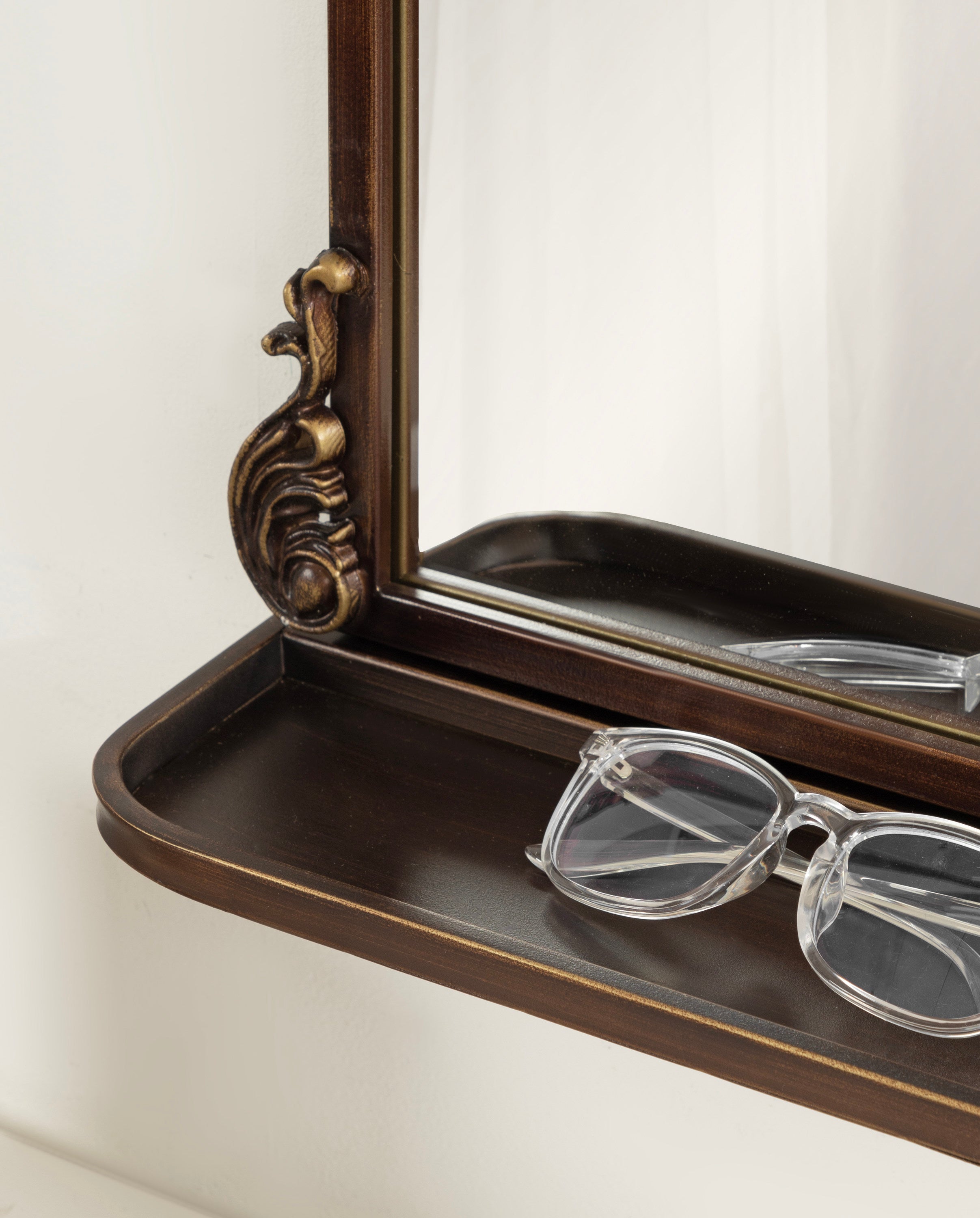 The Arendahl wall mirror brings a brilliant and decadent accent to any traditional home design. This wall mirror features a baroque-inspired design, with a resin garland crown cascading down a wide arched iron frame. The stunning antique finish brings it together as a vintage piece to display anywhere in your home. This version of the Arendahl features a functional shelf to place some small decor accents or necessary household items. Use the fabulous Arendahl wall mirror to bring dimension to your smaller spaces, opening up the area, and illuminating the darker corners. This framed mirror is also easy to hang, with metal keyhole wall hangers discreetly and securely attached to the back. Assembling this arch mirror is simple with a one-step assembly process to attach the shelf to the mirror.