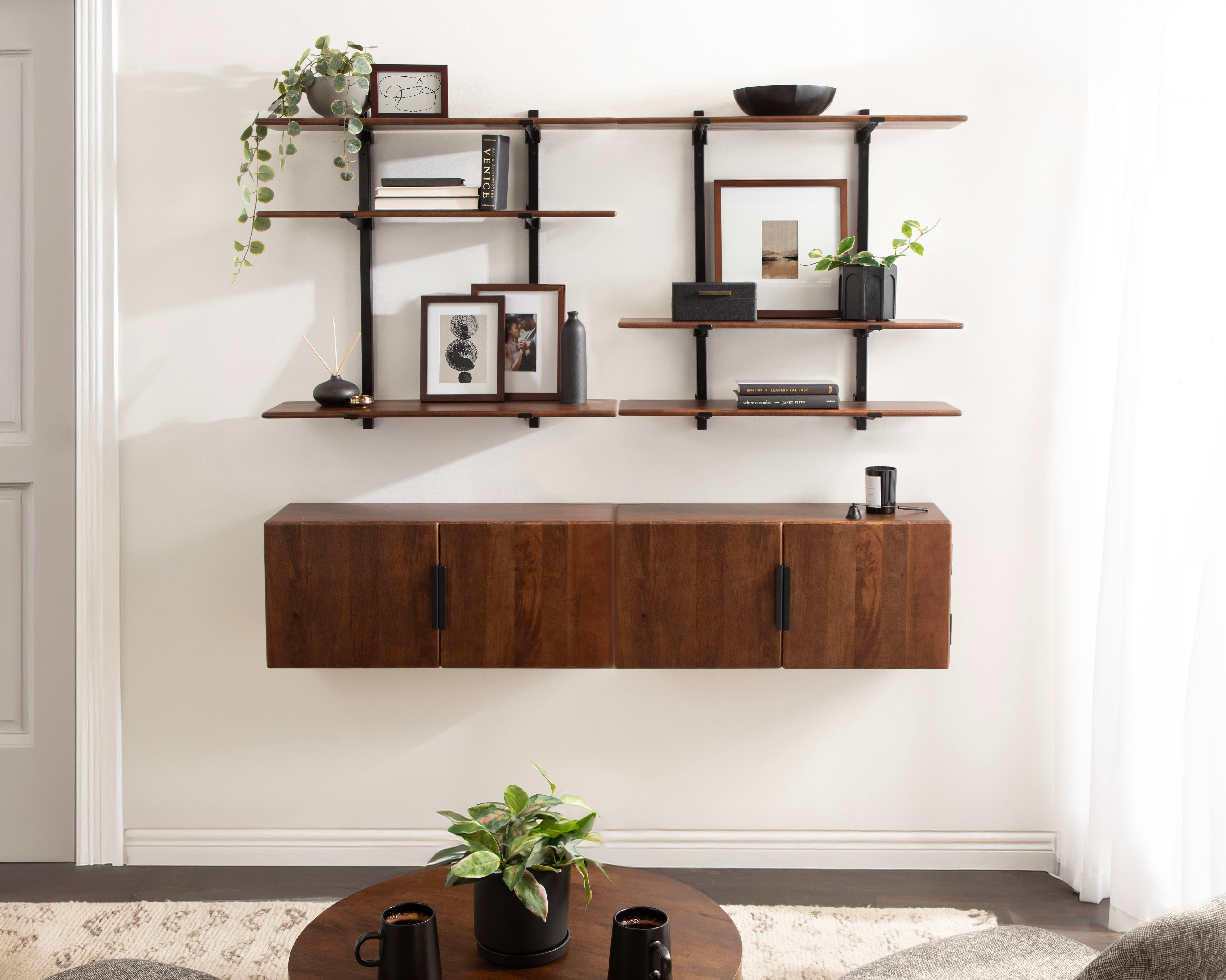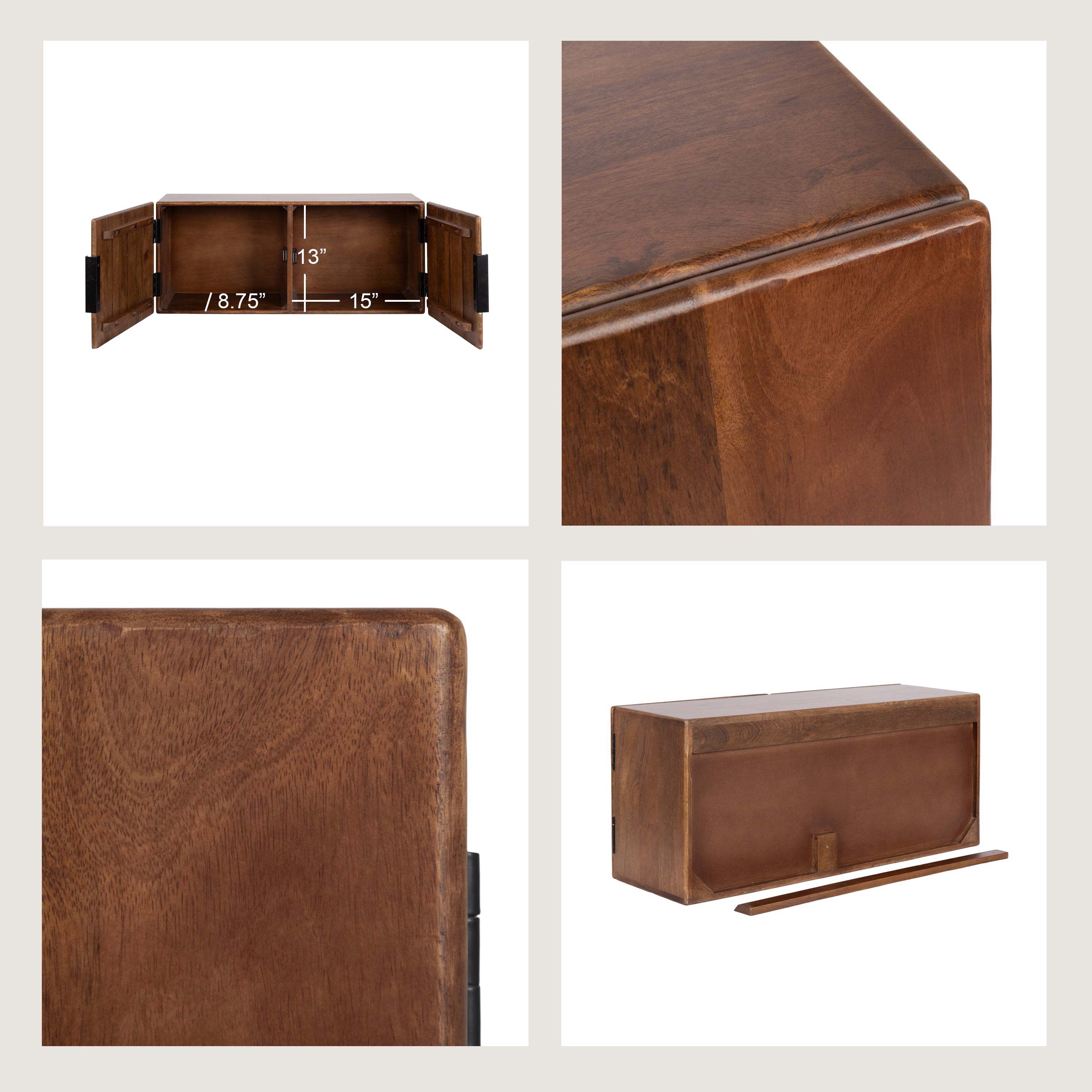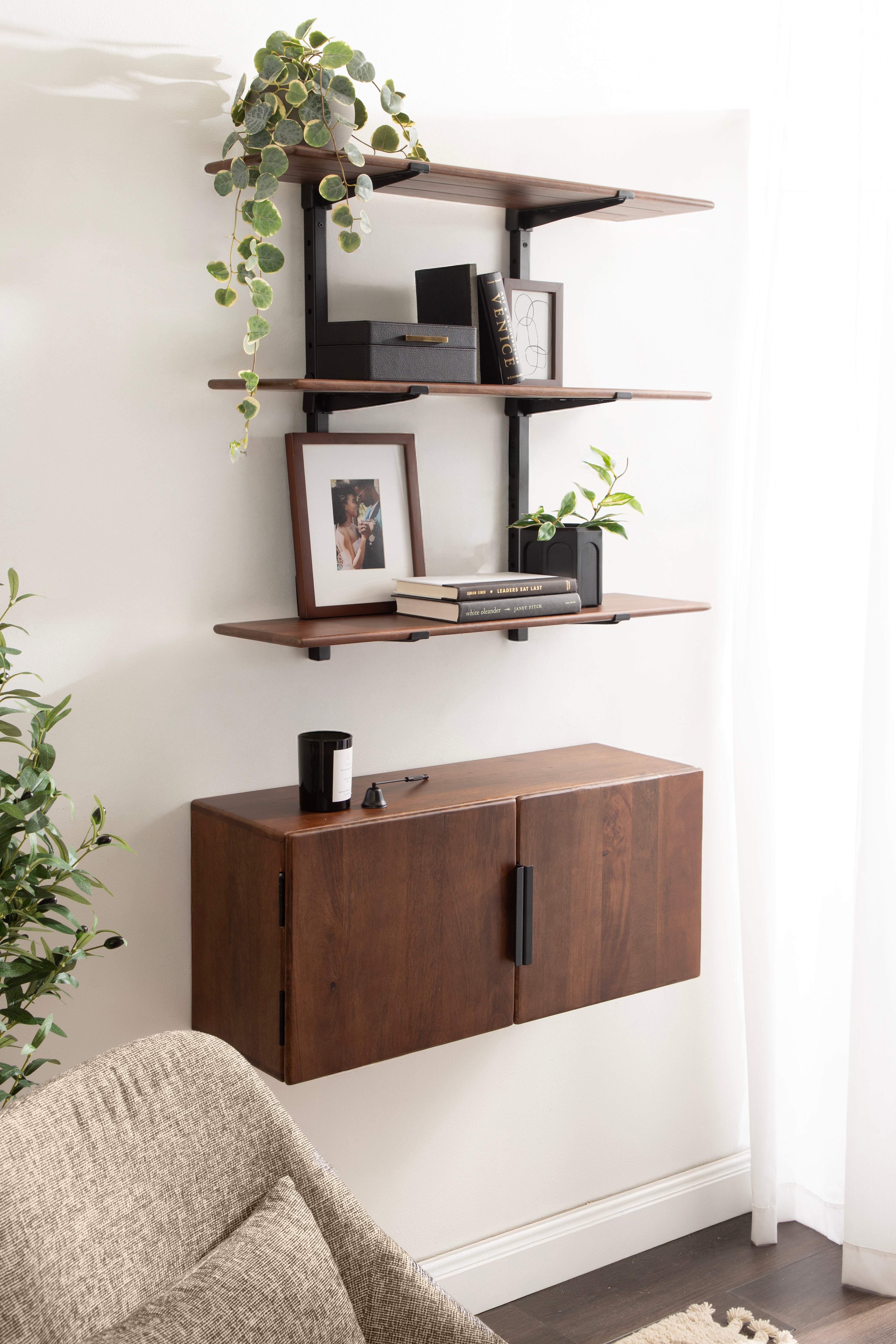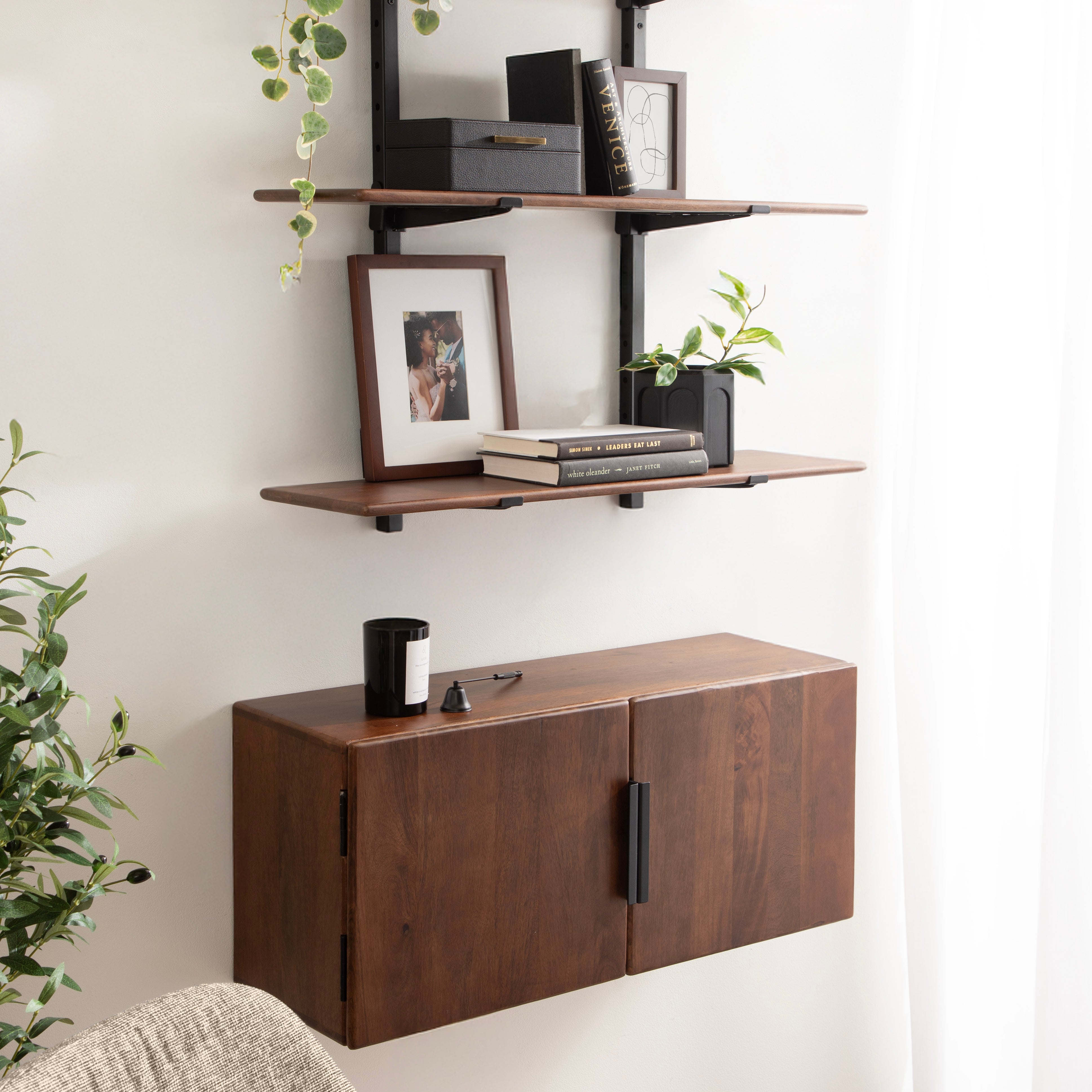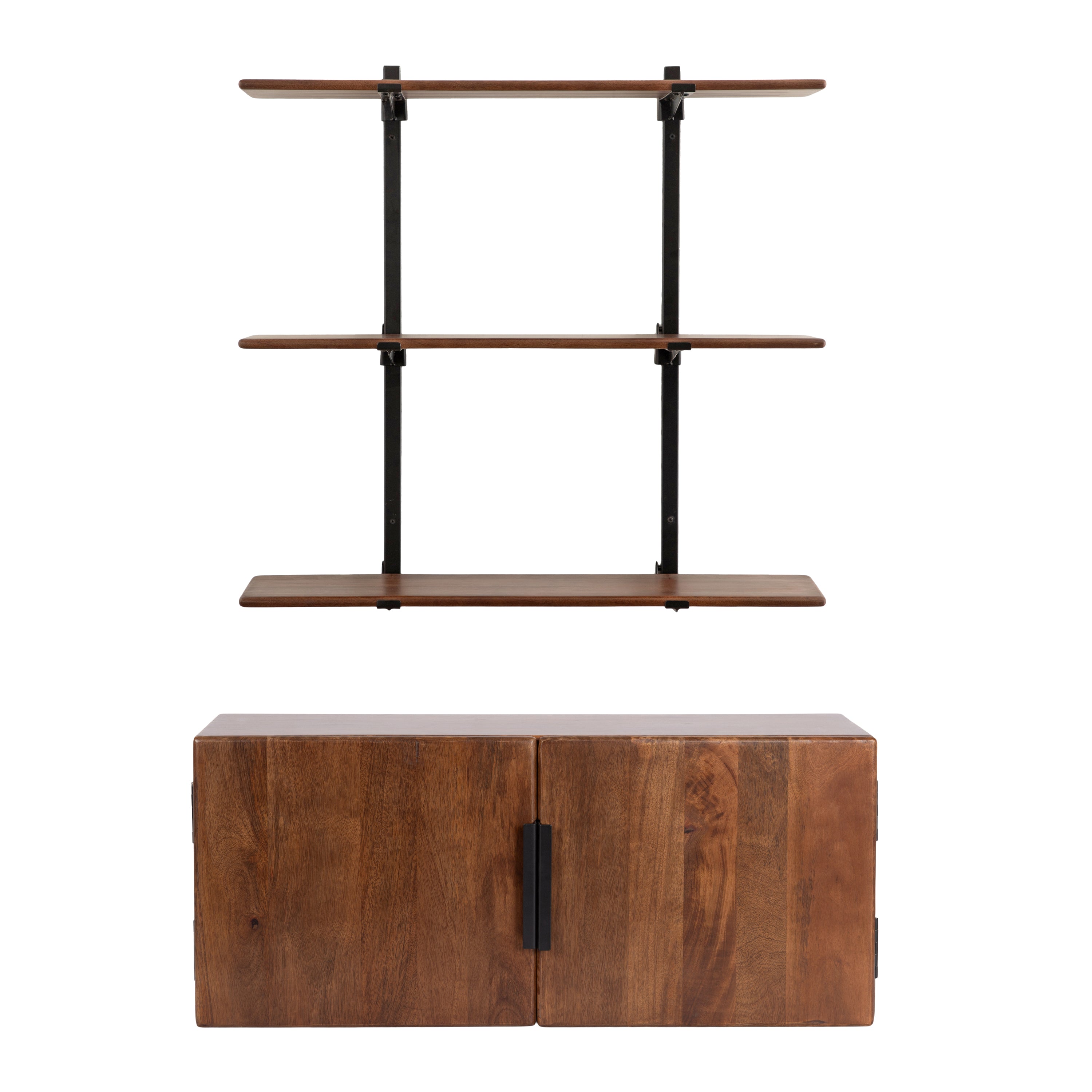 Store books, bathroom supplies, and more in a modern-inspired wall cabinet and shelf set from Kate and Laurel. Both the Atwood cabinet and shelf are crafted from solid mango wood and sturdy wooden material with a delightful finish. Hide away important items with the cabinet doors that are both convenient and stylish. Then, use the open shelving to display those decorative accents or liquor bottles behind your bar area. It features three tiers of adjustable wooden shelves within a metal frame design, creating a jaw-dropping display and storage solution. The cabinet's design boasts a smooth bullnosed curvature to introduce more refinement to your space. The wall-mounted cabinet hangs on your wall in a matter of seconds thanks to the wood cleat hanger and pre-drilled hole that securely mount the cabinet to the wall. The wall shelves have convenient pre-drilled holes for easy hanging as well.