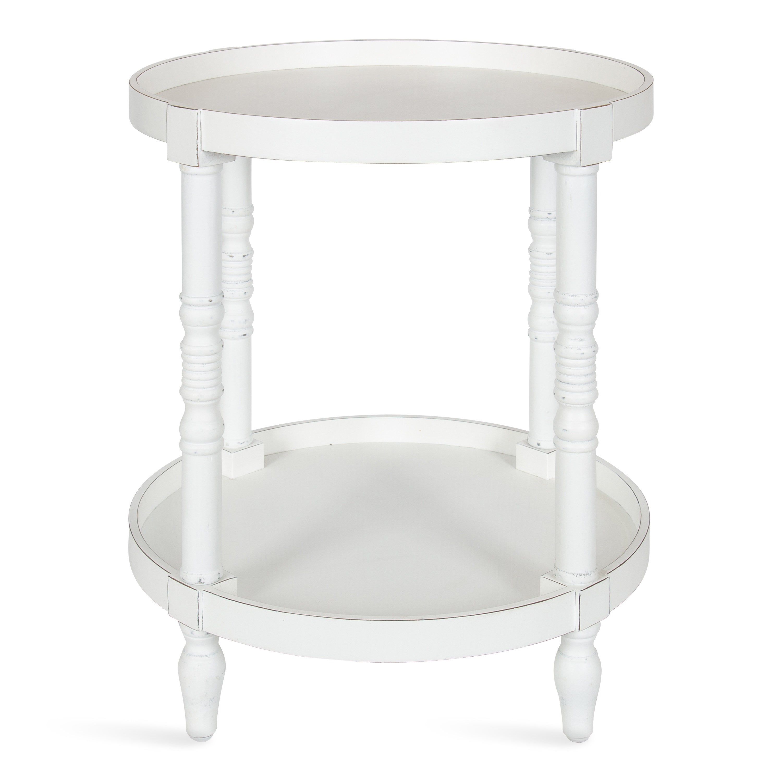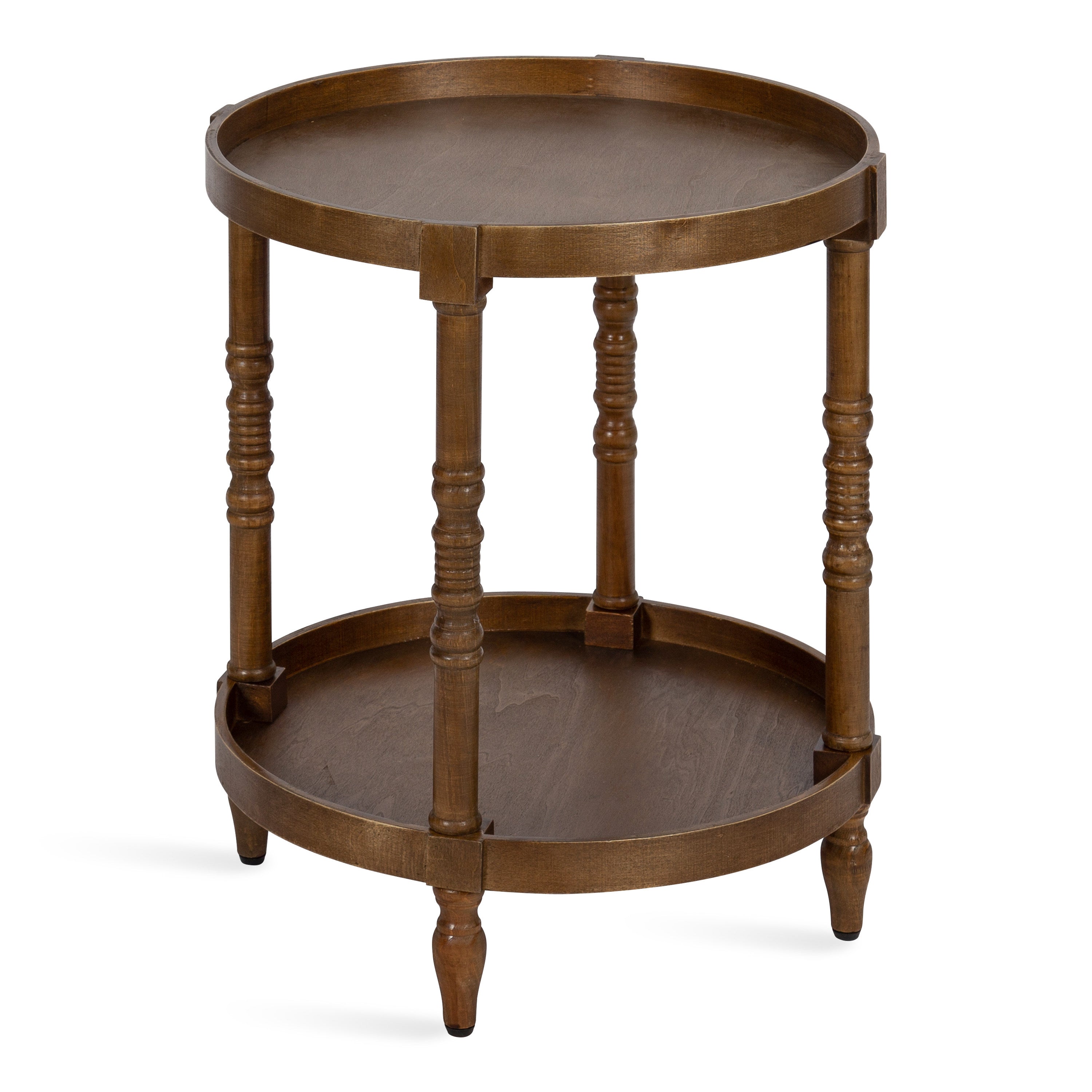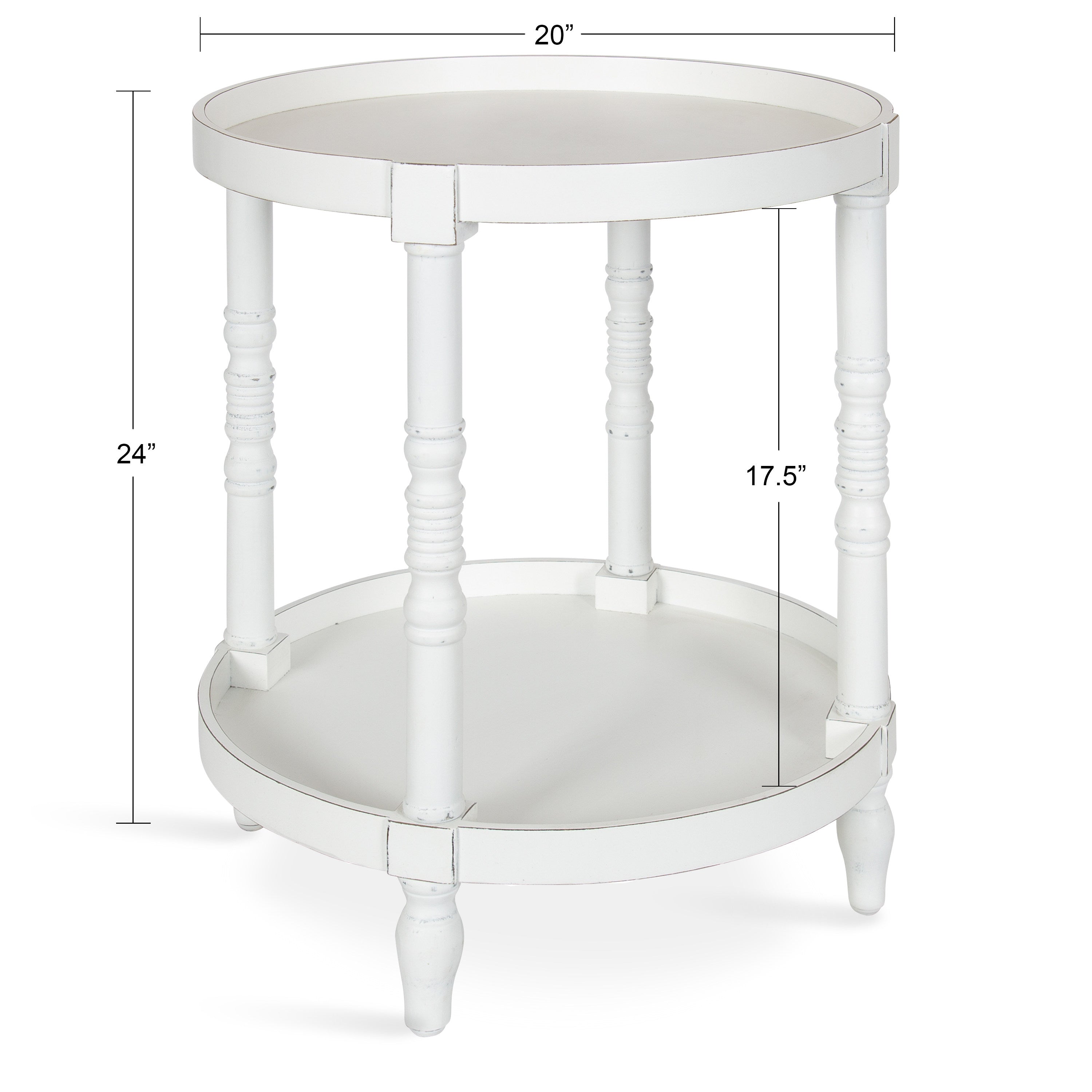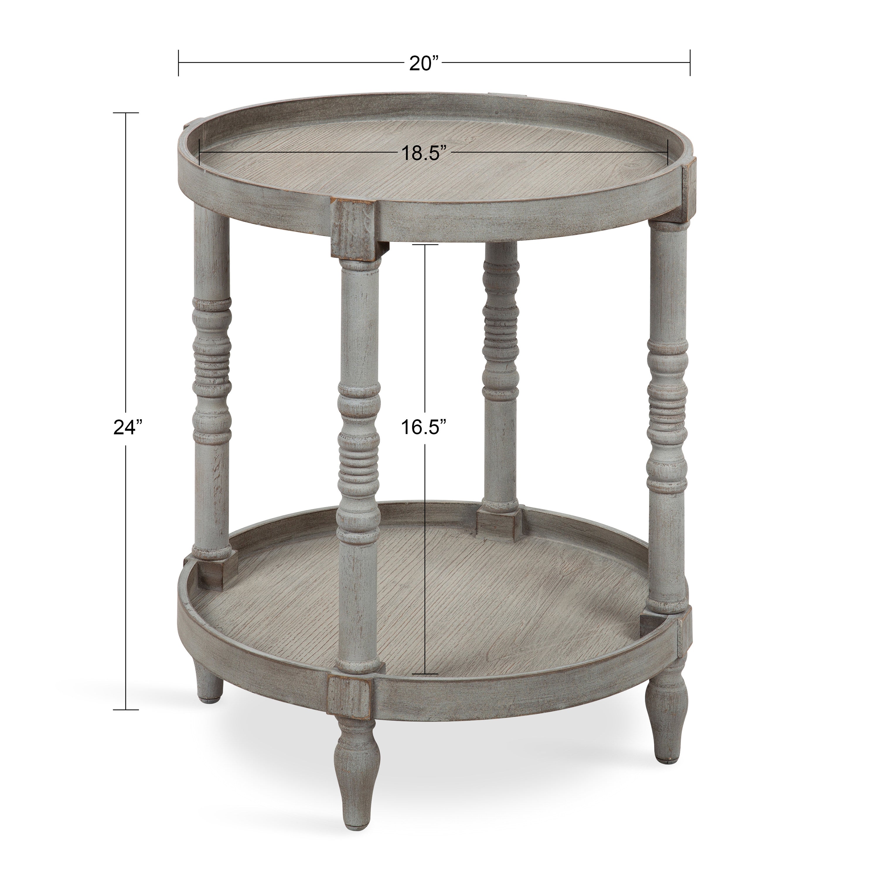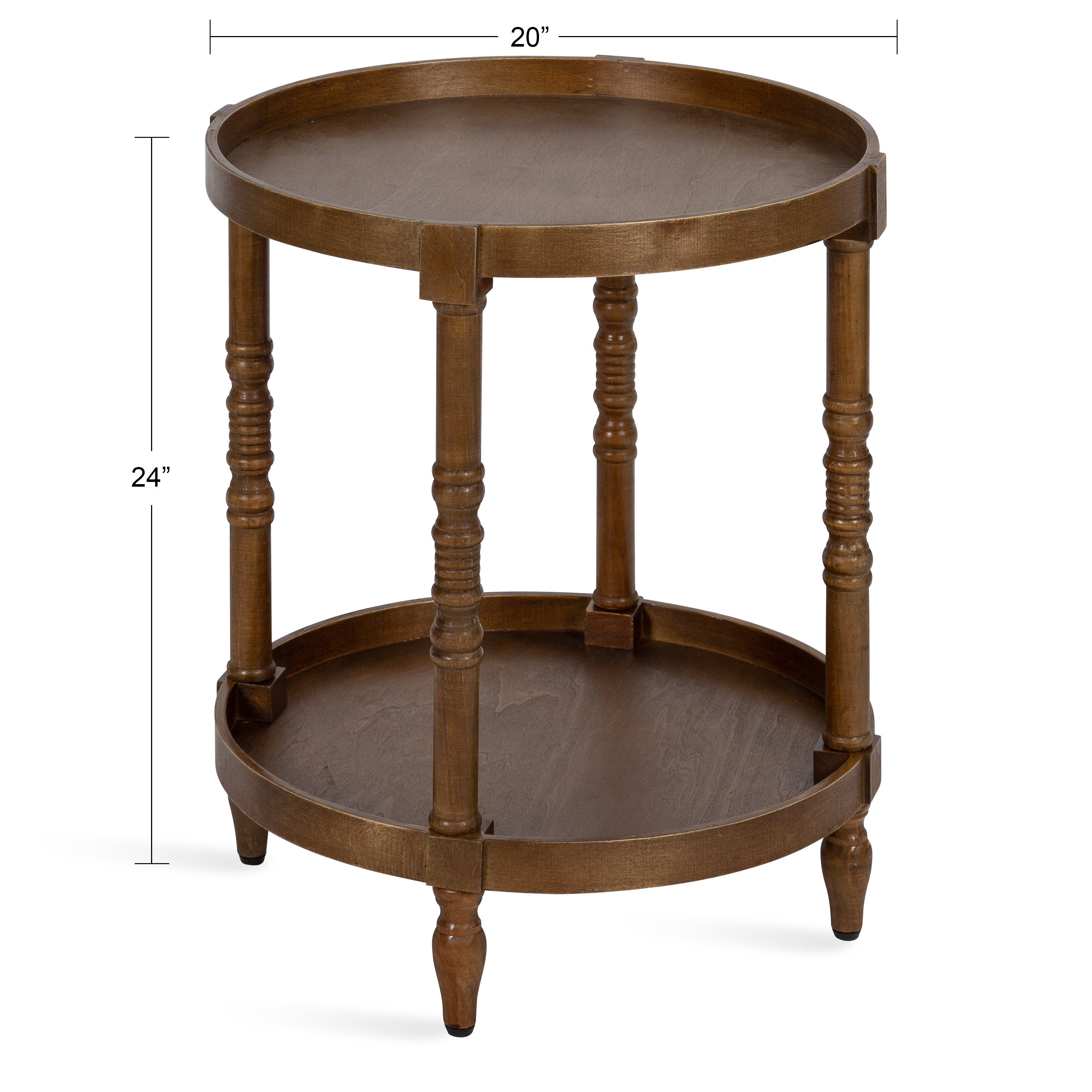 The Bellport side table brings a nostalgic look to your living space. As a lovely vintage statement, this Bellport has a classic finish and colonial turned legs, giving it the look of antiquities without the worry of secondhand shopping. Use the two 20-inch diameter tiers for storage and display of small plants, magazines, media remotes, books, bathroom necessities, and more. Its sophisticated, vintage-inspired design and practical functionality make it a must for any interior designer.