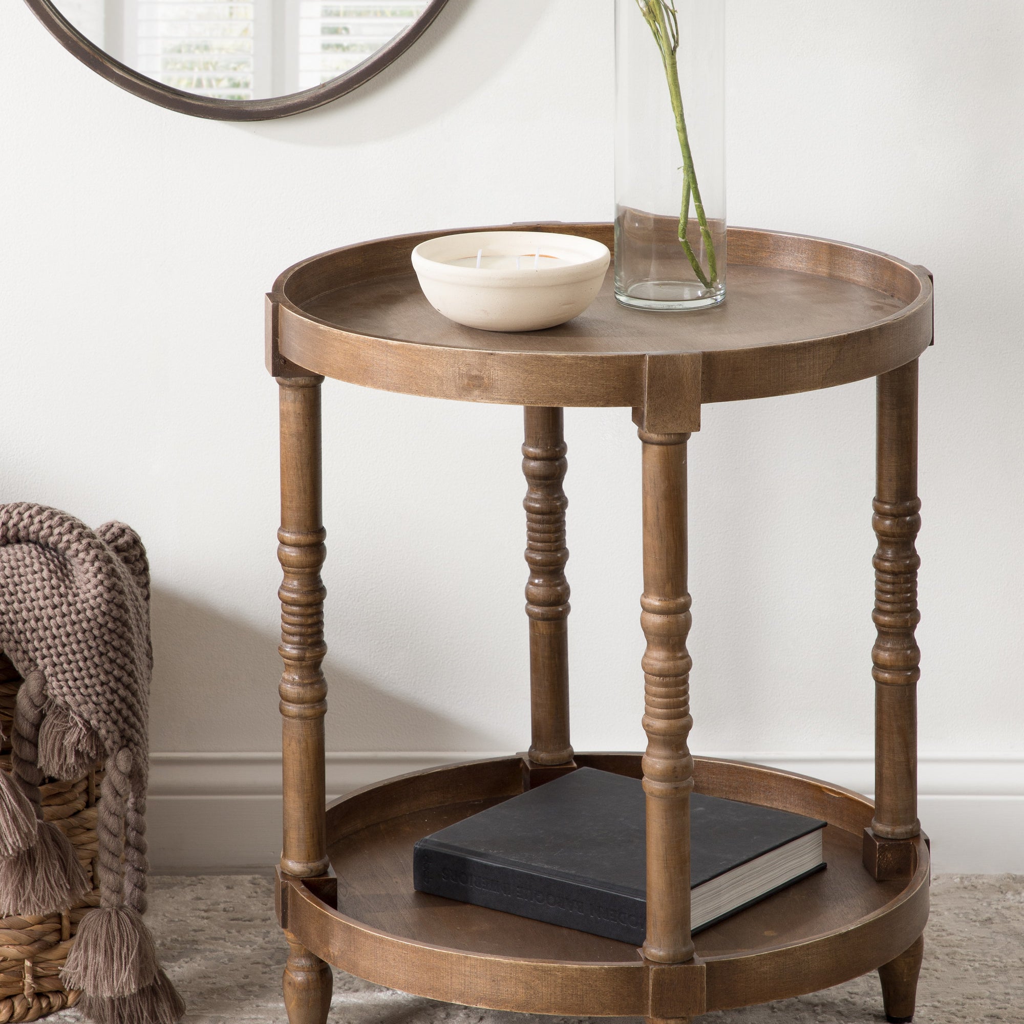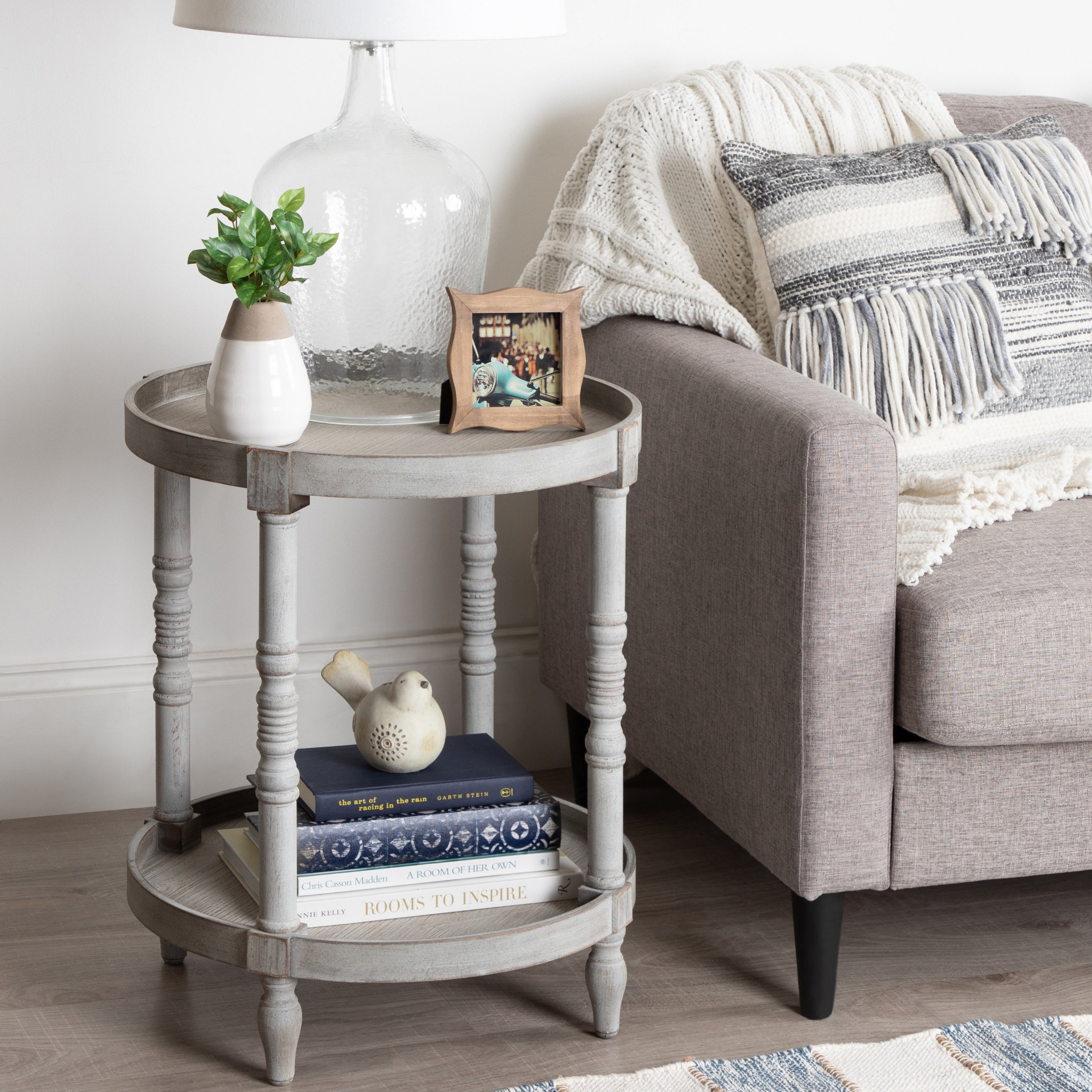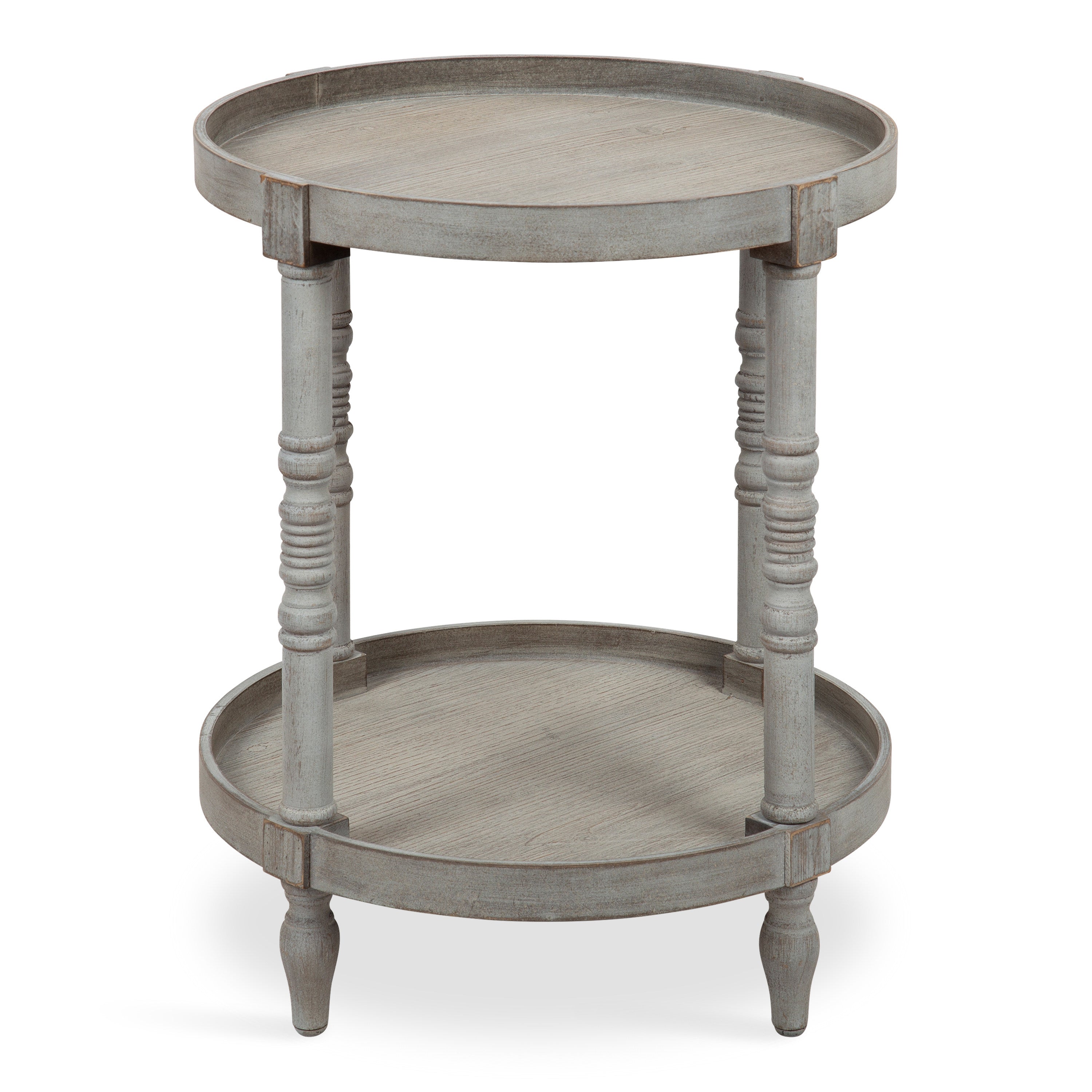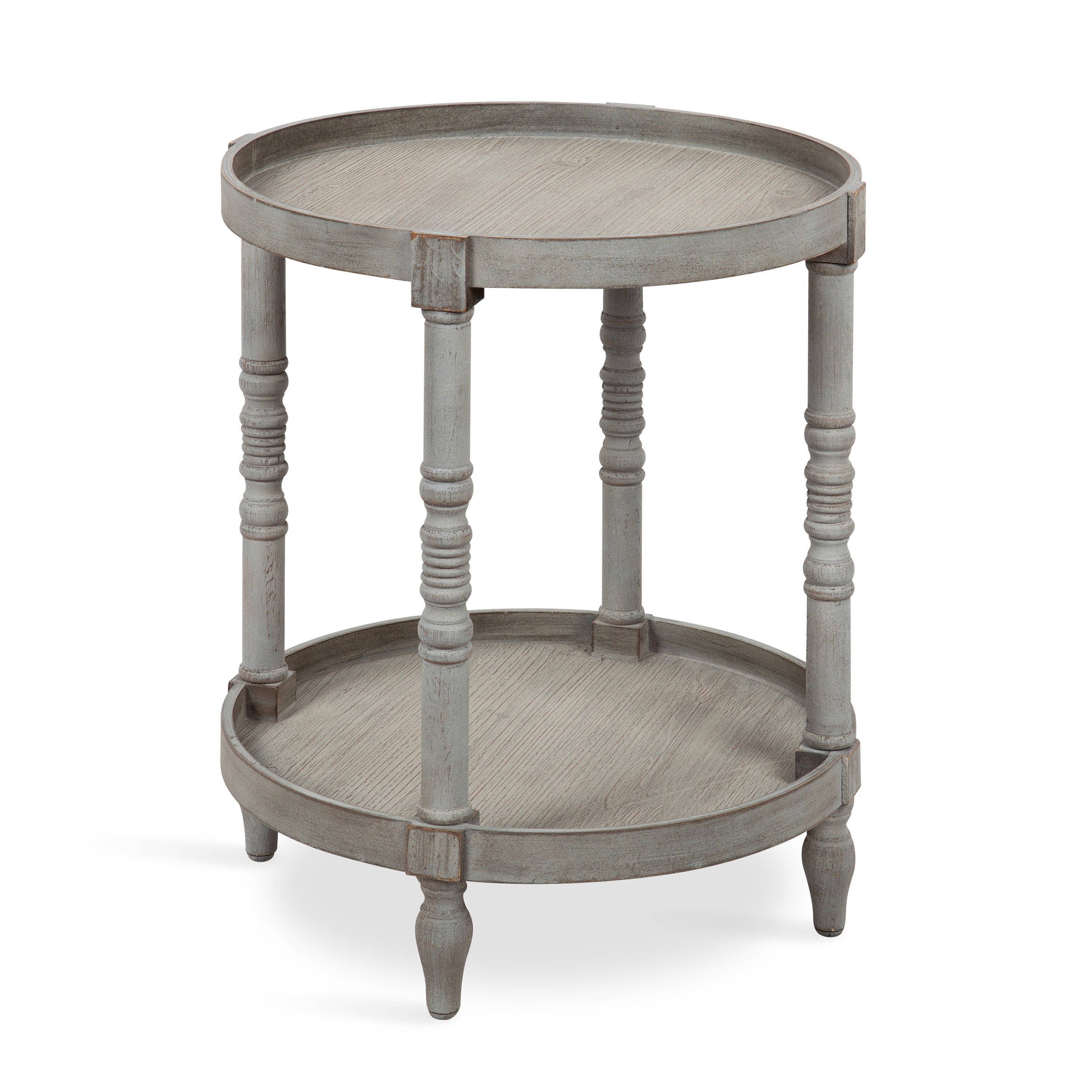 The Bellport side table brings a nostalgic look to your living space. As a lovely vintage statement, this Bellport has a classic finish and colonial turned legs, giving it the look of antiquities without the worry of secondhand shopping. Use the two 20-inch diameter tiers for storage and display of small plants, magazines, media remotes, books, bathroom necessities, and more. Its sophisticated, vintage-inspired design and practical functionality make it a must for any interior designer.