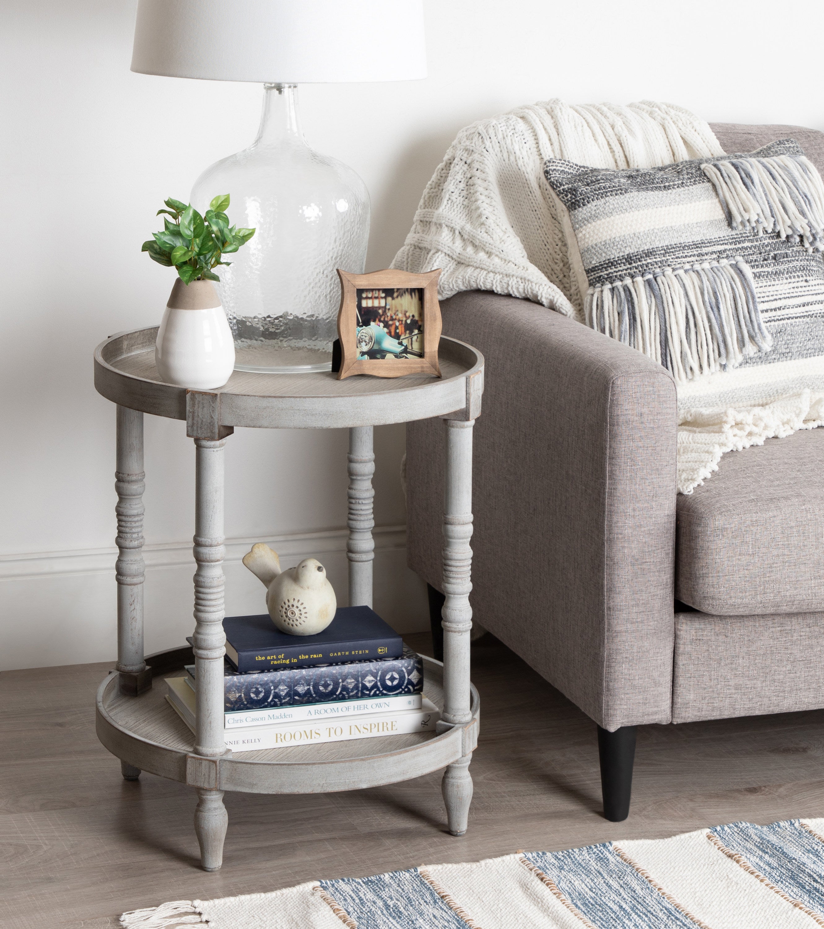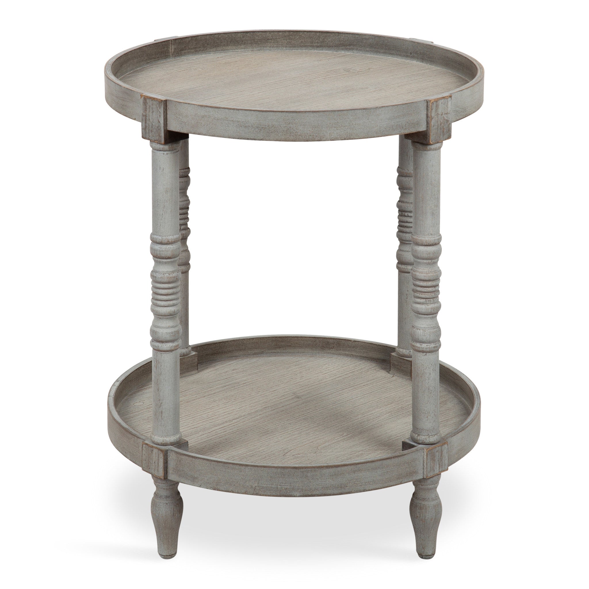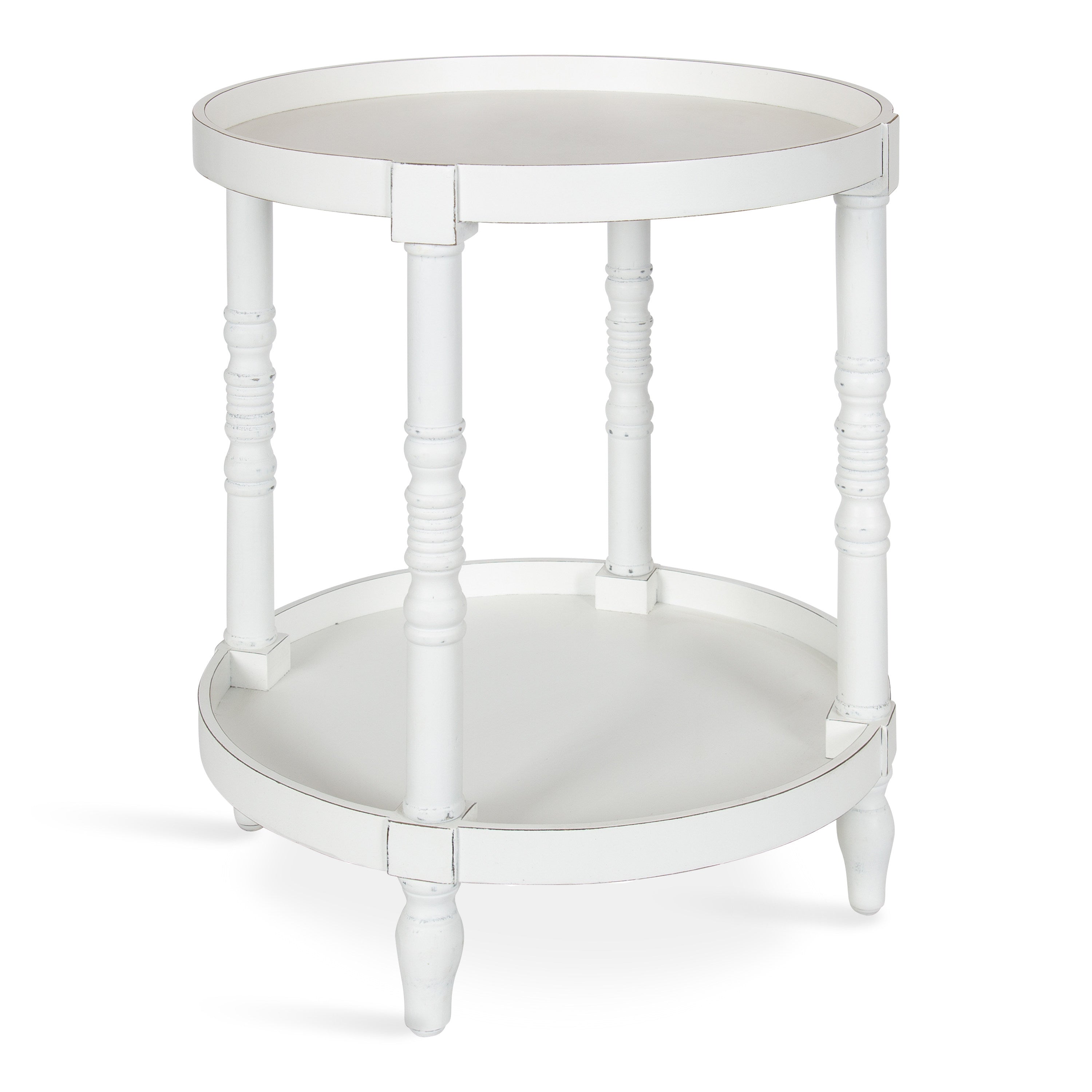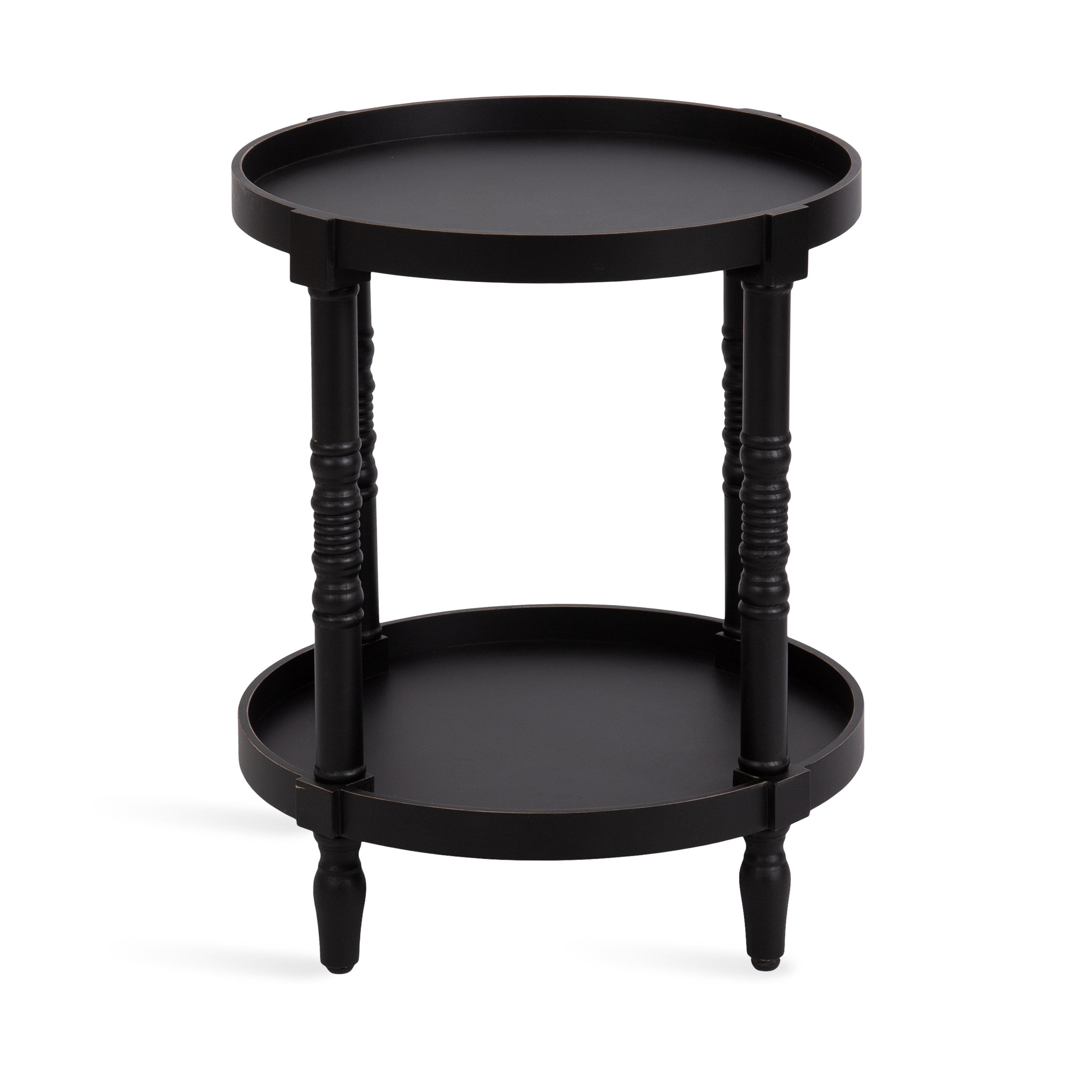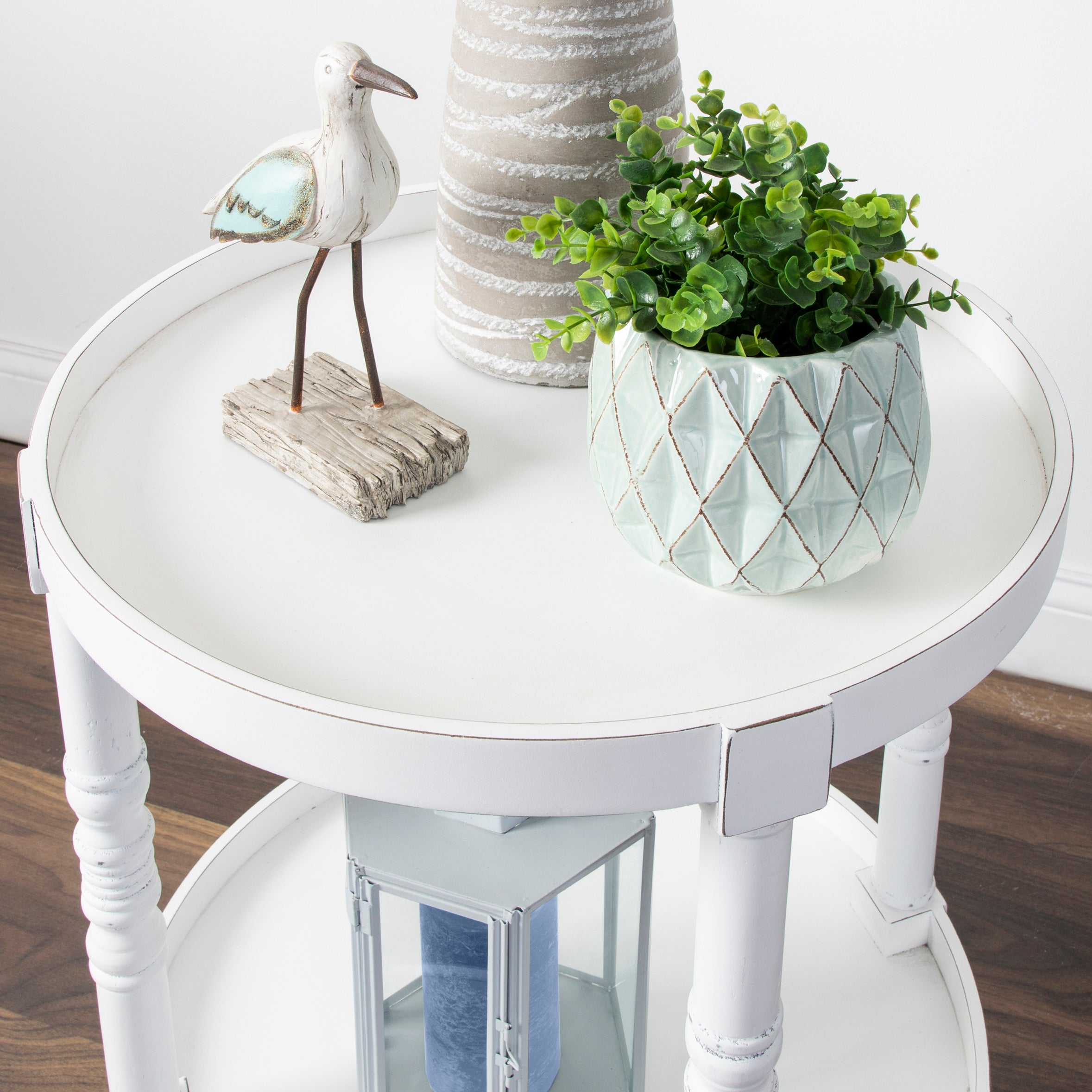 The Bellport side table brings a nostalgic look to your living space. As a lovely vintage statement, this Bellport has a classic finish and colonial turned legs, giving it the look of antiquities without the worry of secondhand shopping. Use the two 20-inch diameter tiers for storage and display of small plants, magazines, media remotes, books, bathroom necessities, and more. Its sophisticated, vintage-inspired design and practical functionality make it a must for any interior designer.