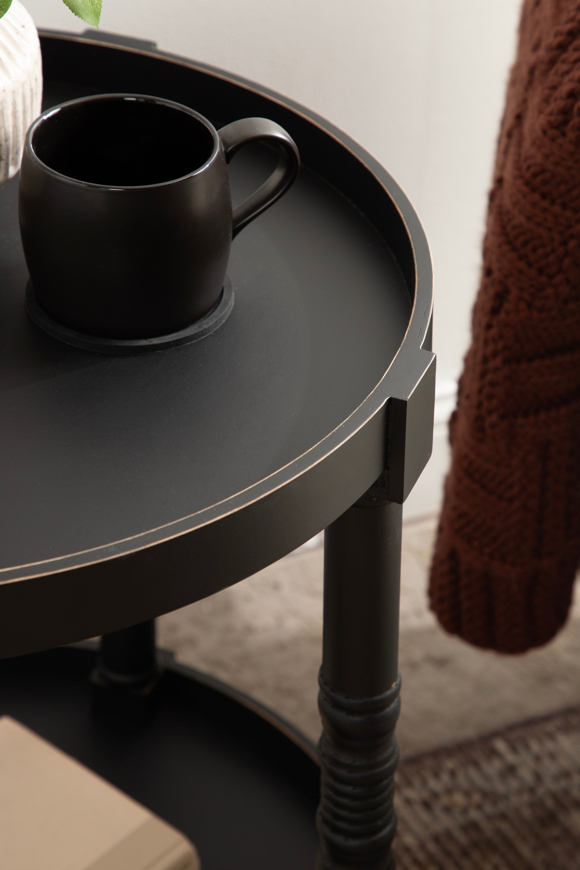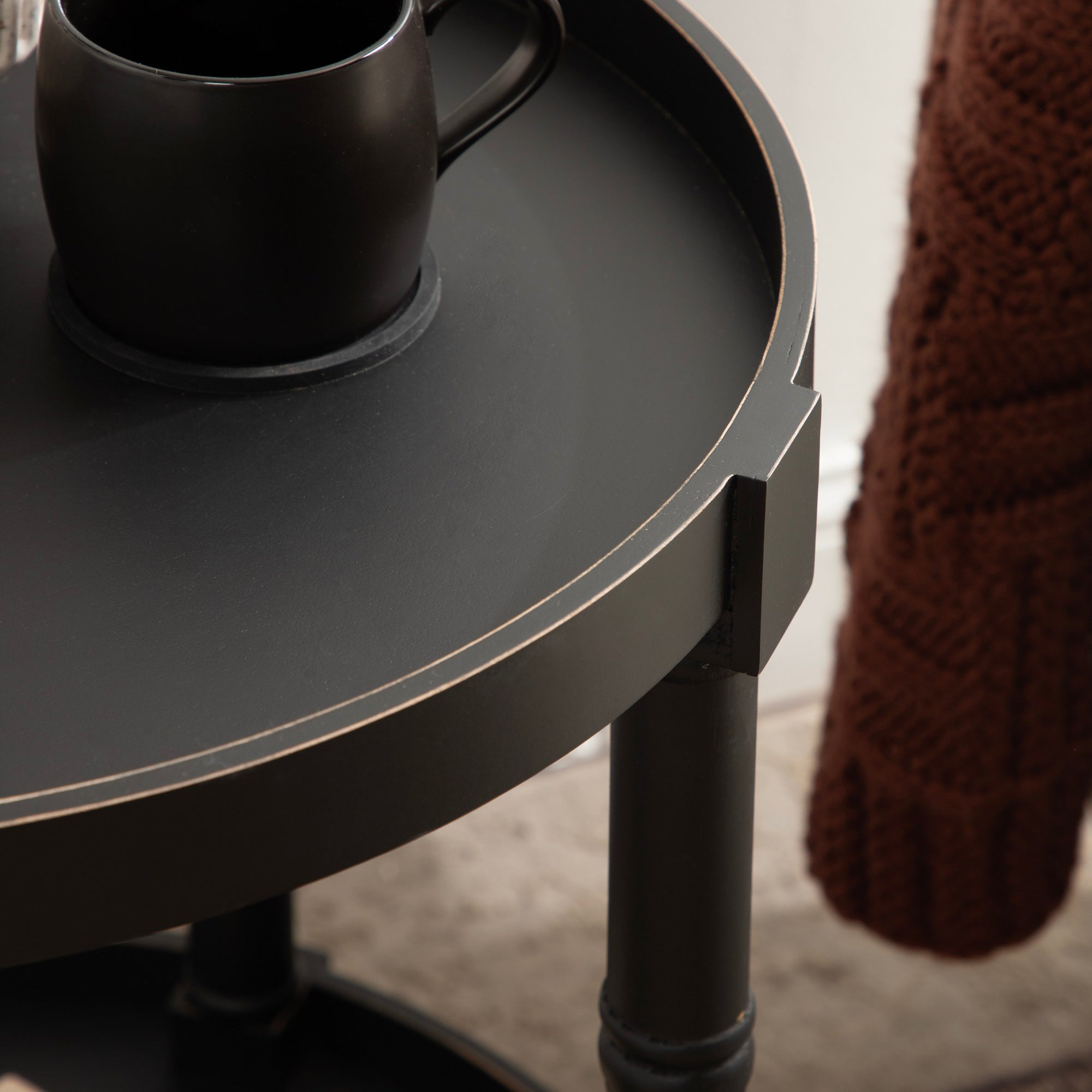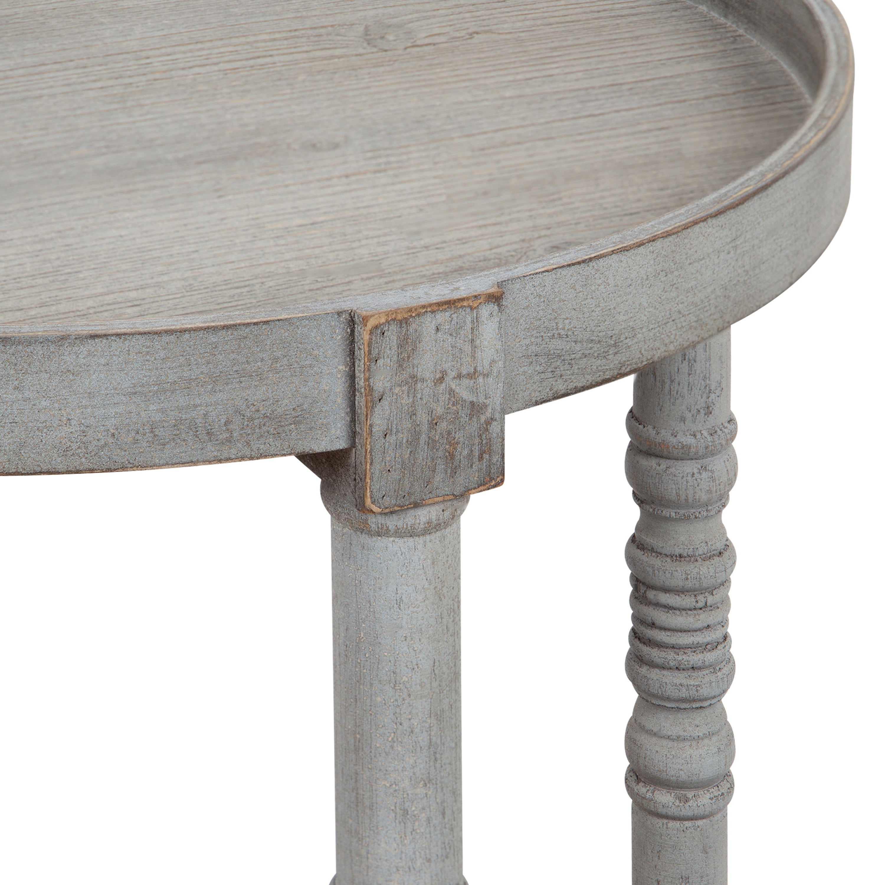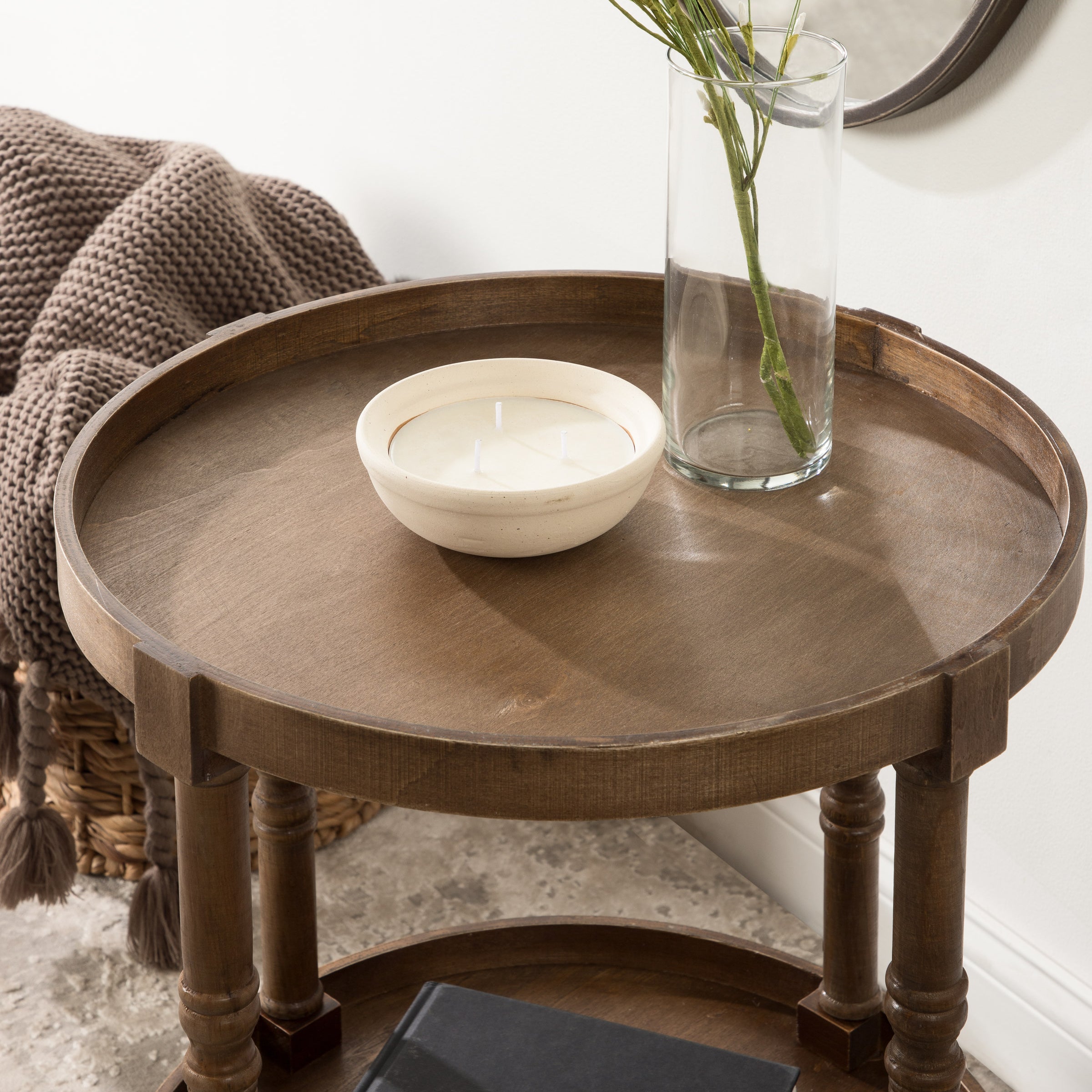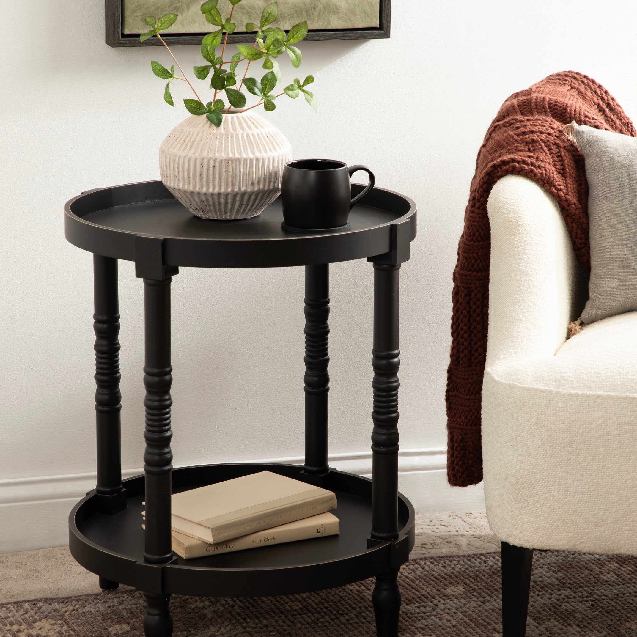 The Bellport side table brings a nostalgic look to your living space. As a lovely vintage statement, this Bellport has a classic finish and colonial turned legs, giving it the look of antiquities without the worry of secondhand shopping. Use the two 20-inch diameter tiers for storage and display of small plants, magazines, media remotes, books, bathroom necessities, and more. Its sophisticated, vintage-inspired design and practical functionality make it a must for any interior designer.