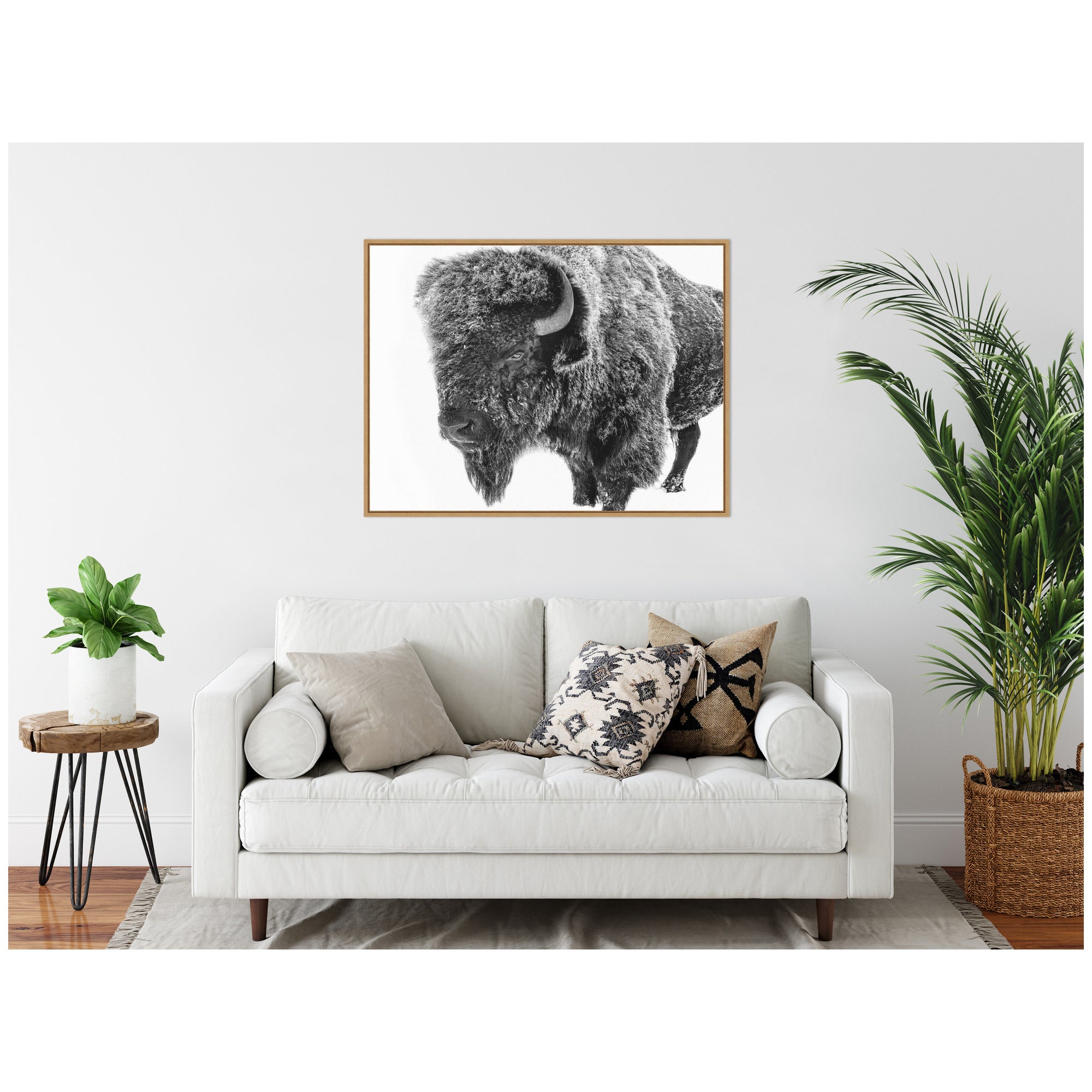 • Gallery Quality Art: Measuring 42 x 32 inches, this is beautifully presented in Sylvie Natural frame - a modern, float frame with natural woodgrain coloring and dramatic depth.. Expressive Wall Art Story:The image depicts a majestic bison standing prominently against a snowy background. Its thick fur is frosted with snow, emphasizing the harsh winter conditions. The black-and-white photography accentuates the textures and intricate details of the bison's rugged appearance.