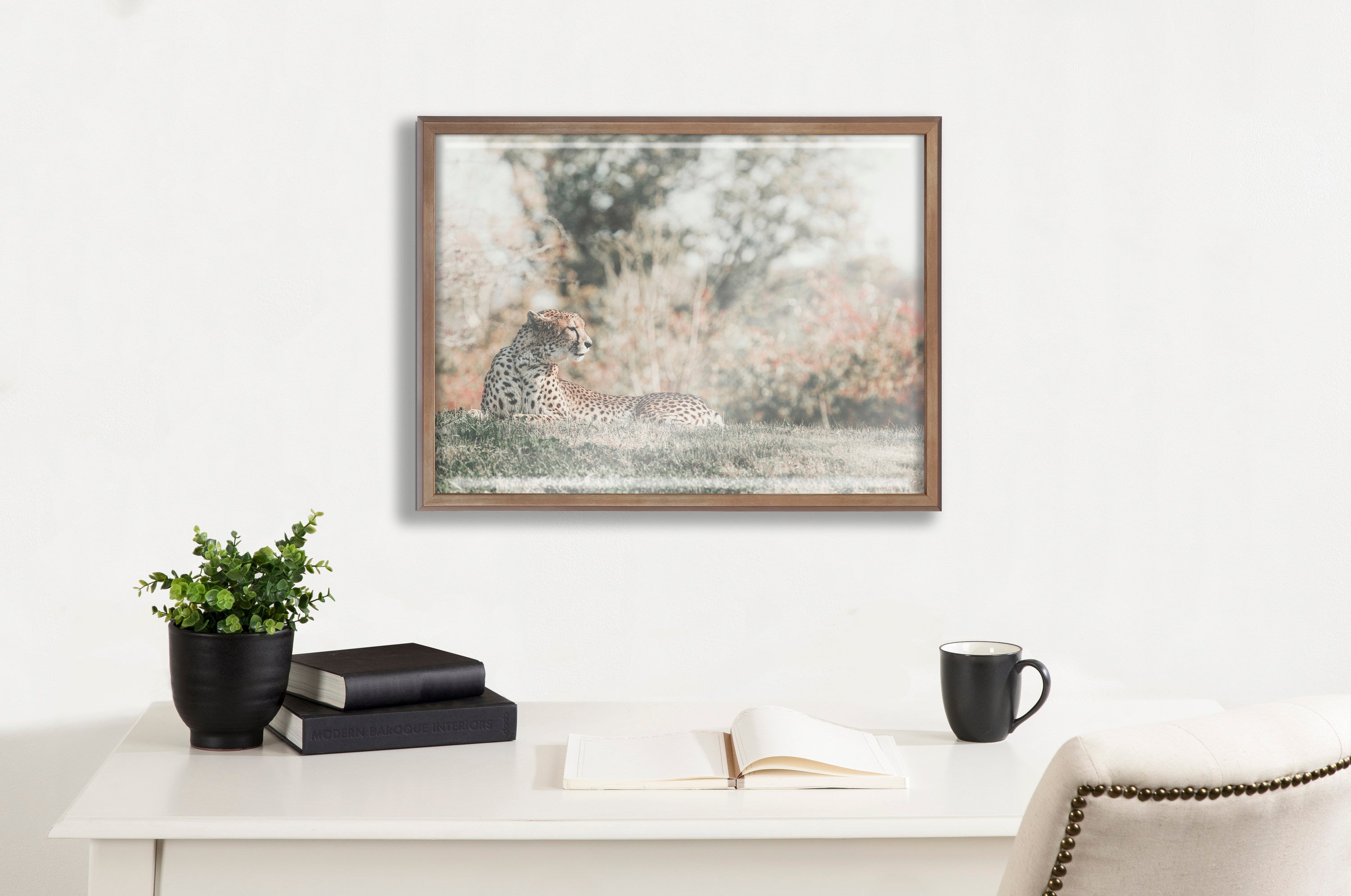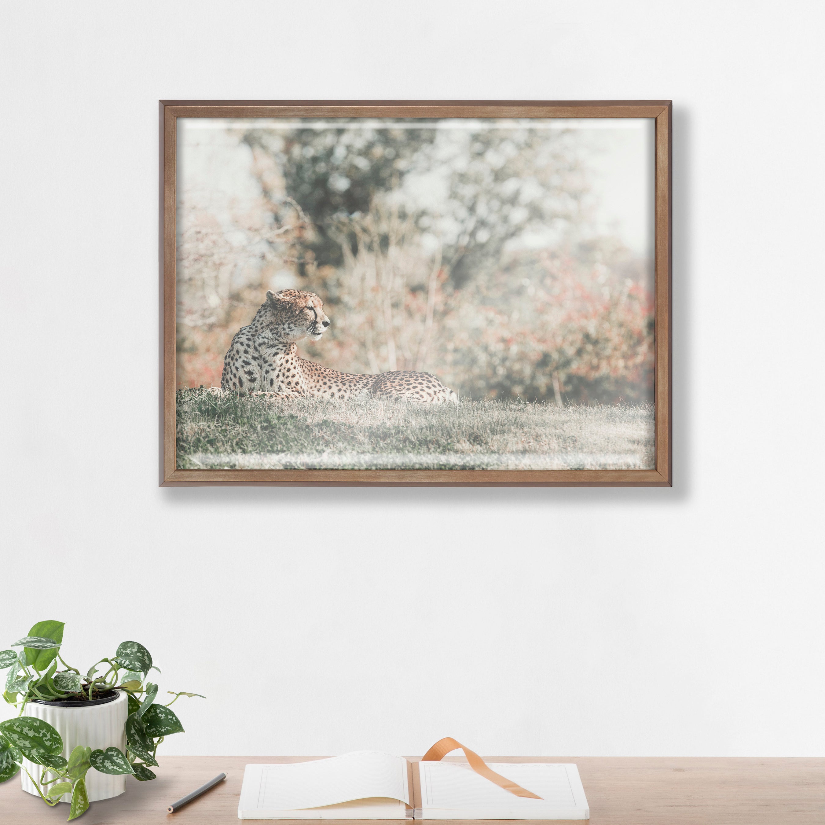 This beautiful cheetah's calm demeanor brings peace to your home and showcases your passion for all of nature's creatures. Printed and framed in the USA in Waunakee, Wisconsin, this framed glass art will be a pleasure to look at every day in your living room, bedroom, office, or any room in the home. This art print also makes an excellent gift for birthdays, holidays, or house-warming parties. Printed on glass and framed with a lightweight polystyrene frame, this wall art has two hangers already attached to the back for easy wall display.