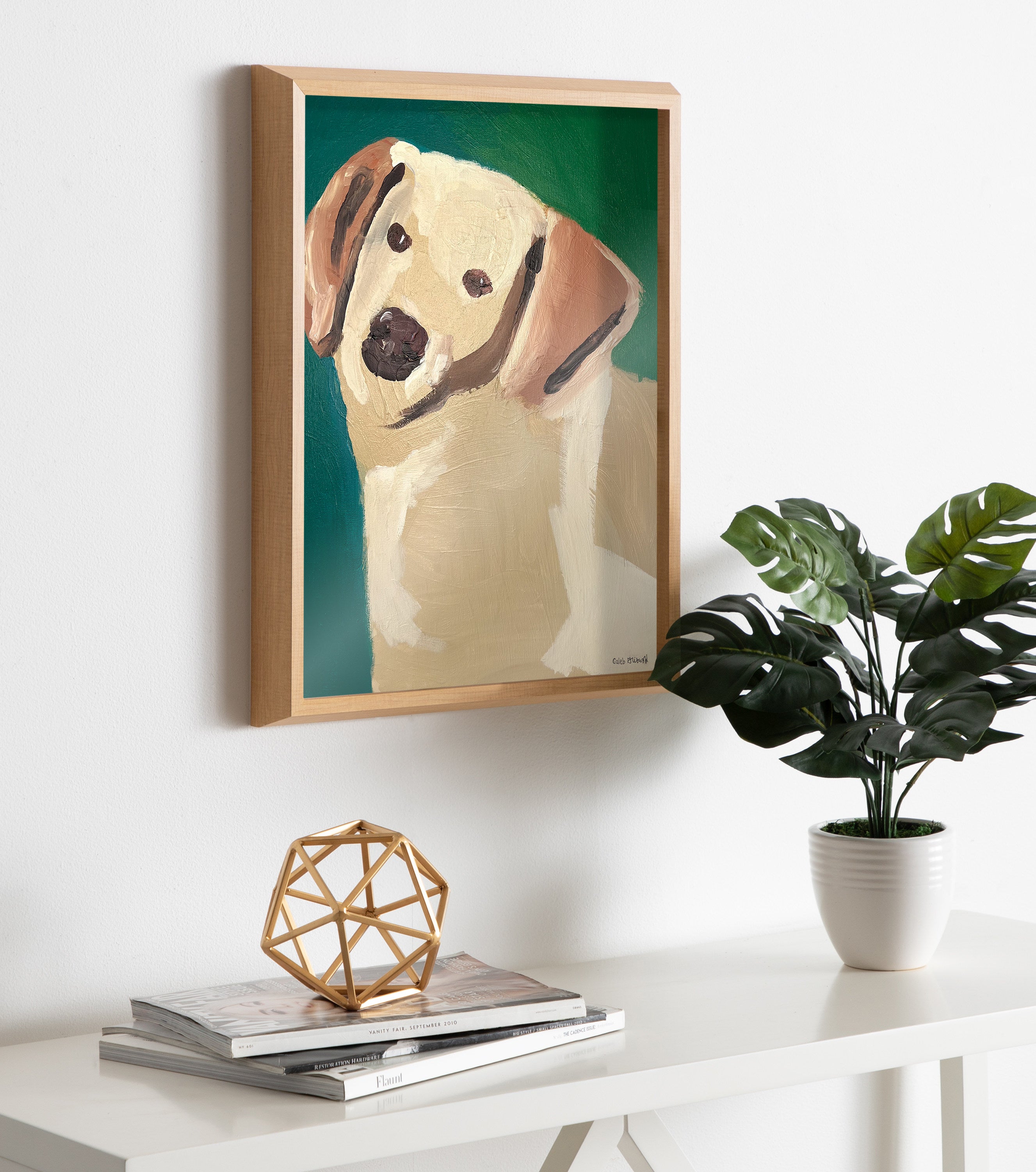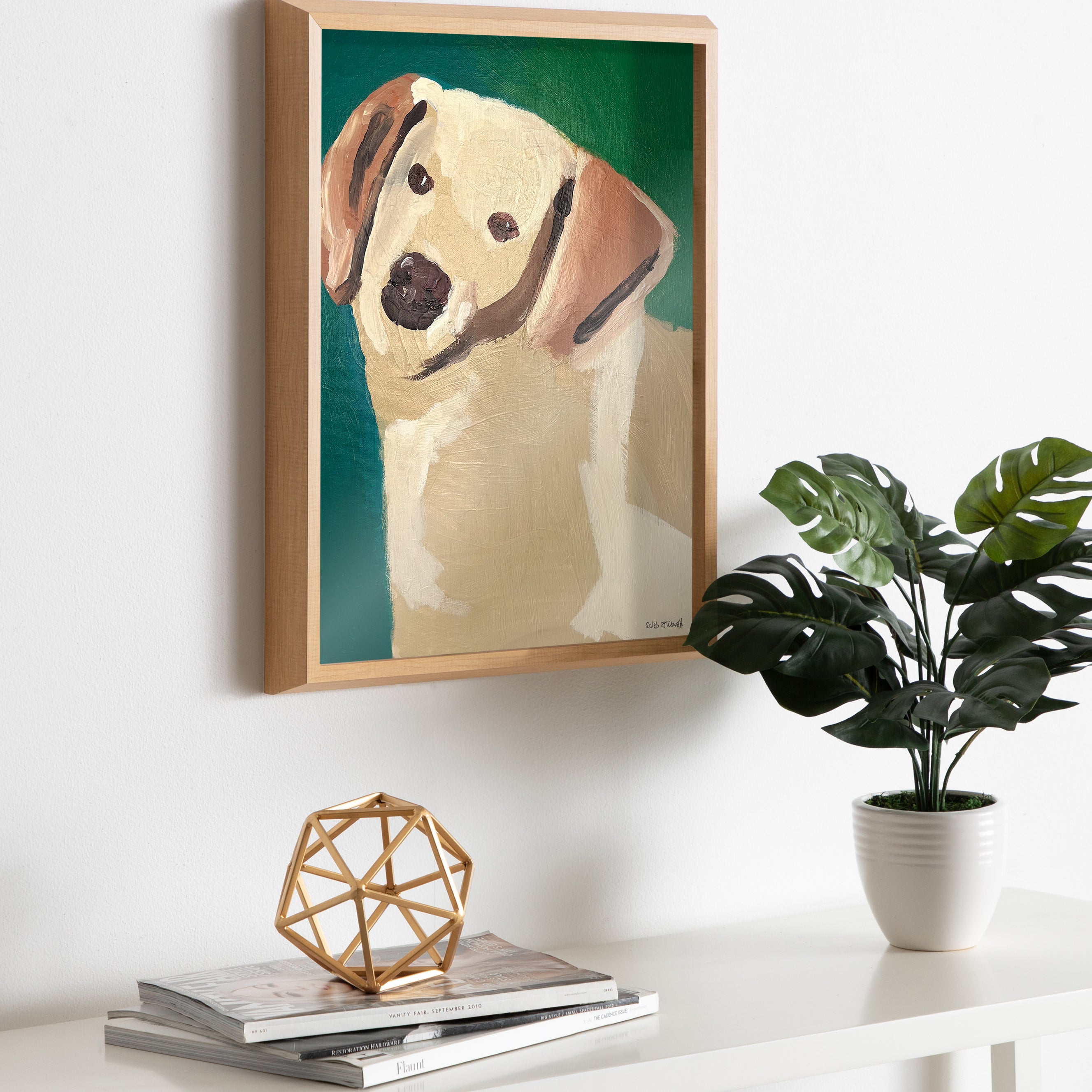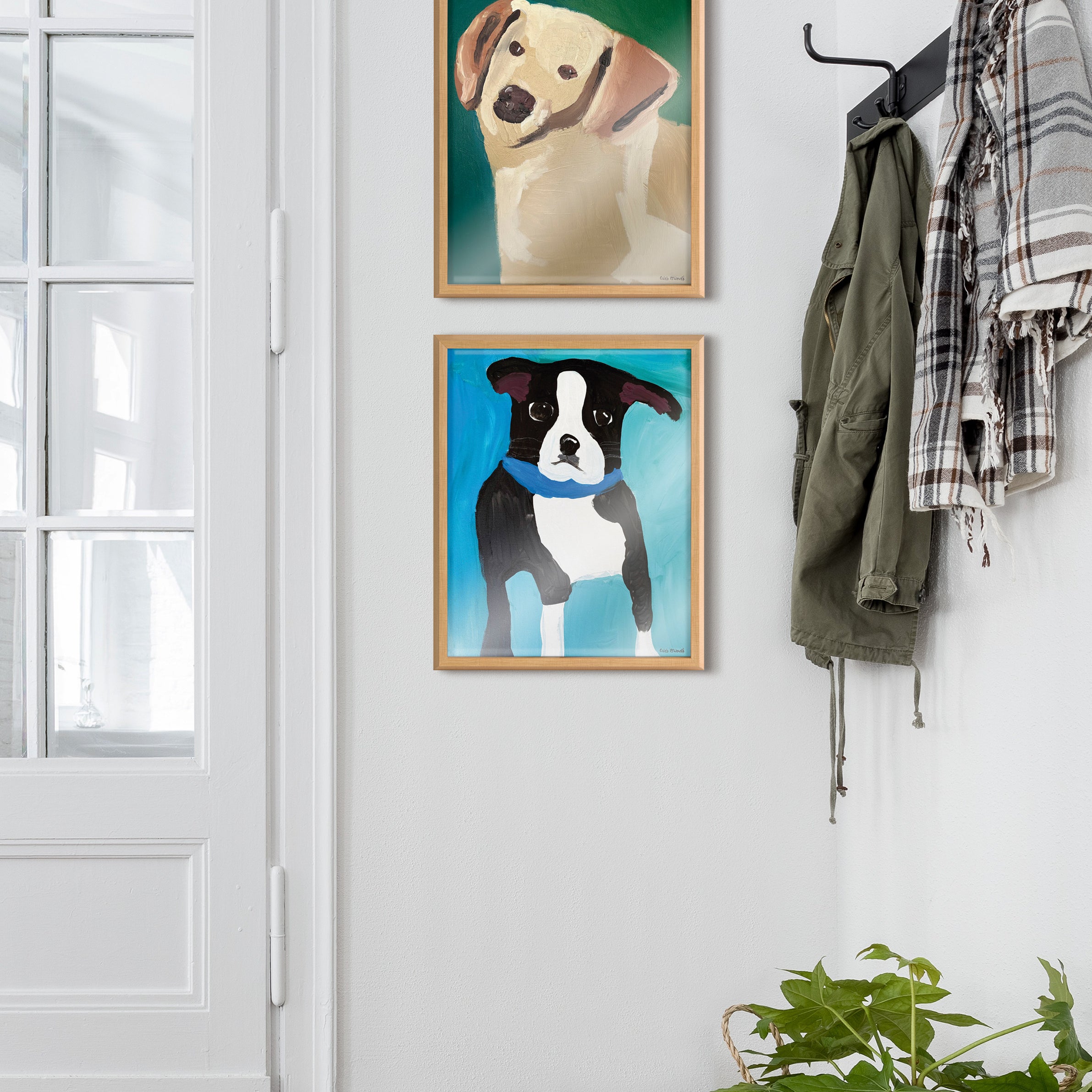 This colorful dog art brings whimsy and fun to your walls with its vibrant and silly design! Printed and framed in the USA in Waunakee, Wisconsin, this framed glass art will be a pleasure to look at every day in your living room, bedroom, office, or any room in the home. This art print also makes an excellent gift for birthdays, holidays, or house-warming parties. Printed on glass and framed with a lightweight polystyrene frame, this wall art is easy to display on the wall.