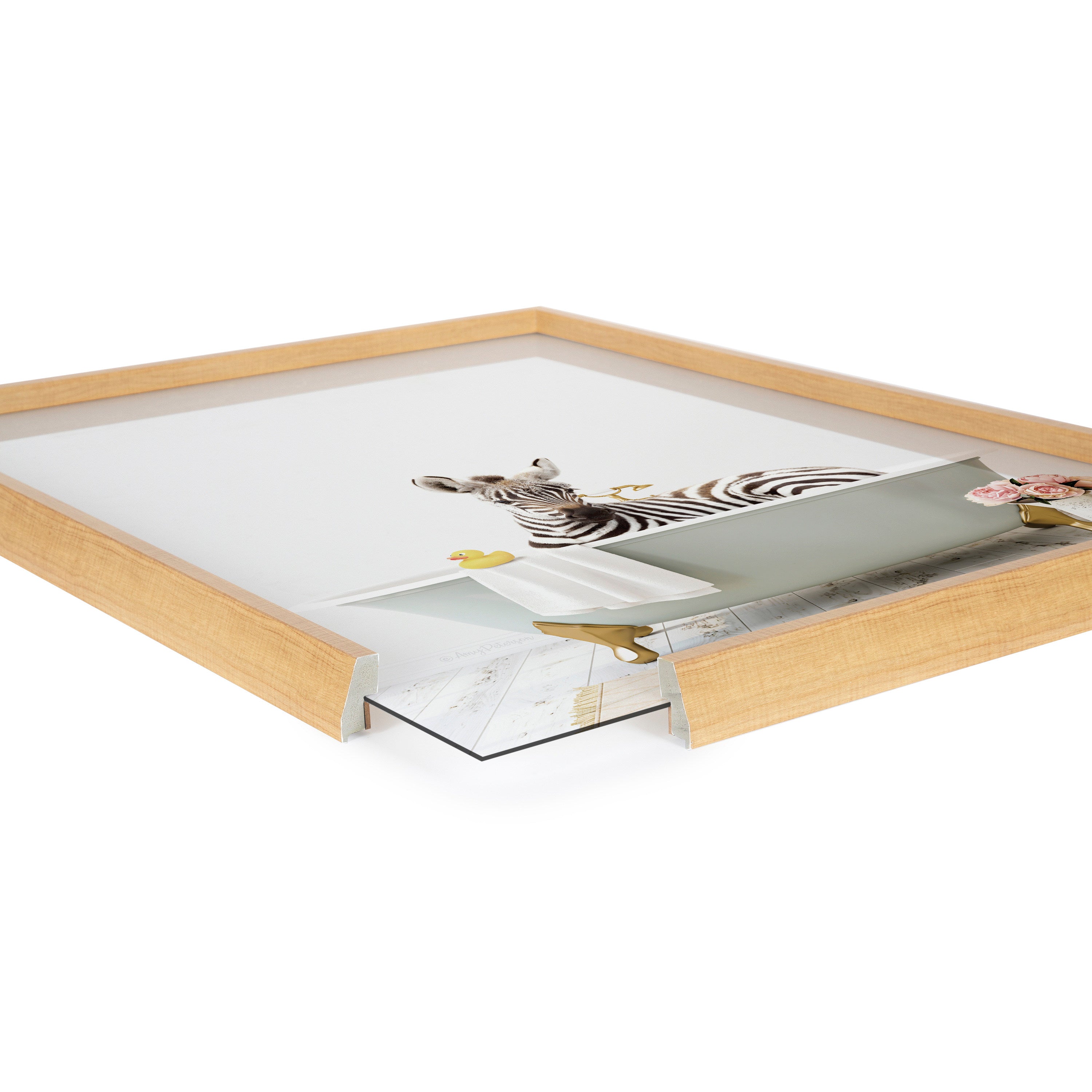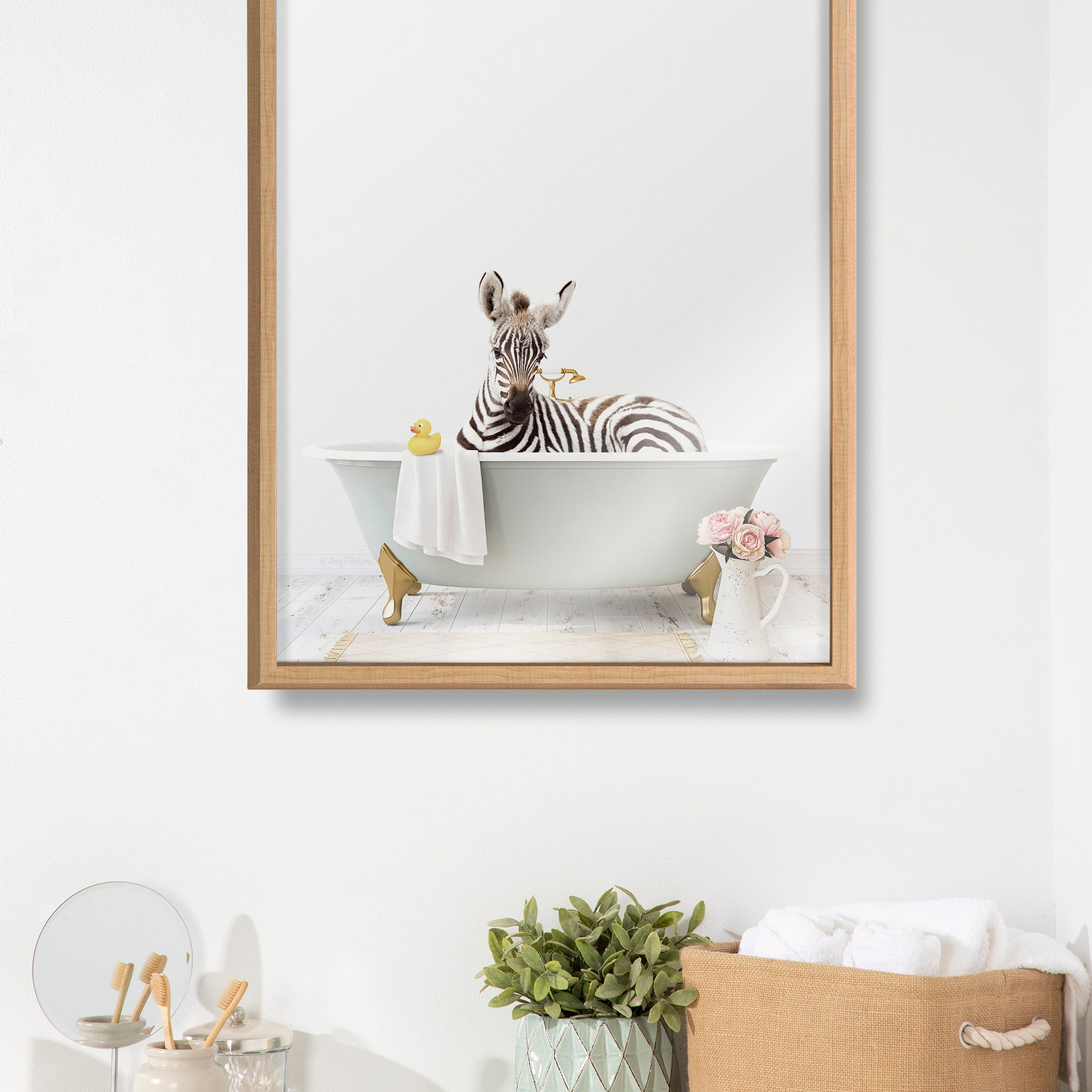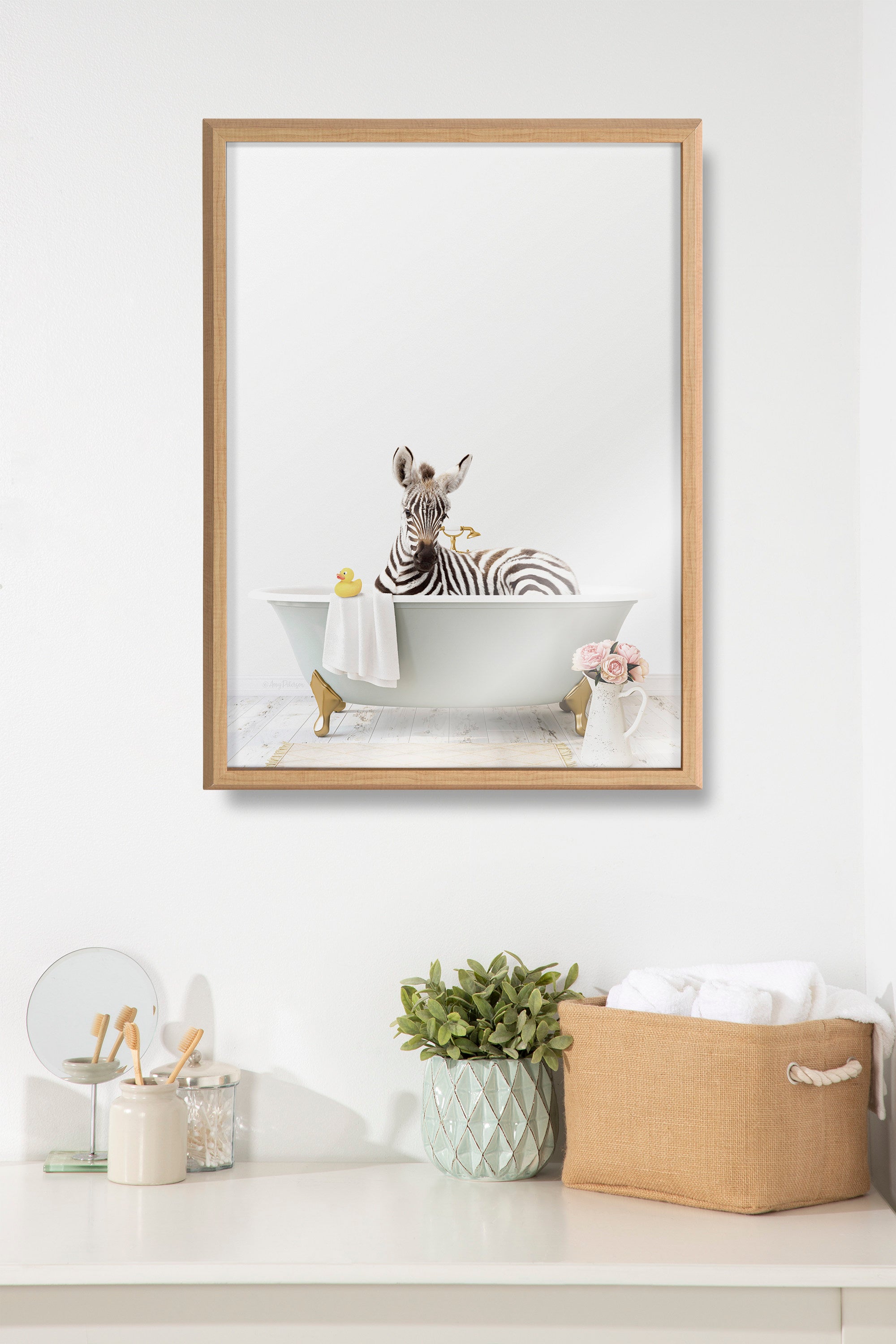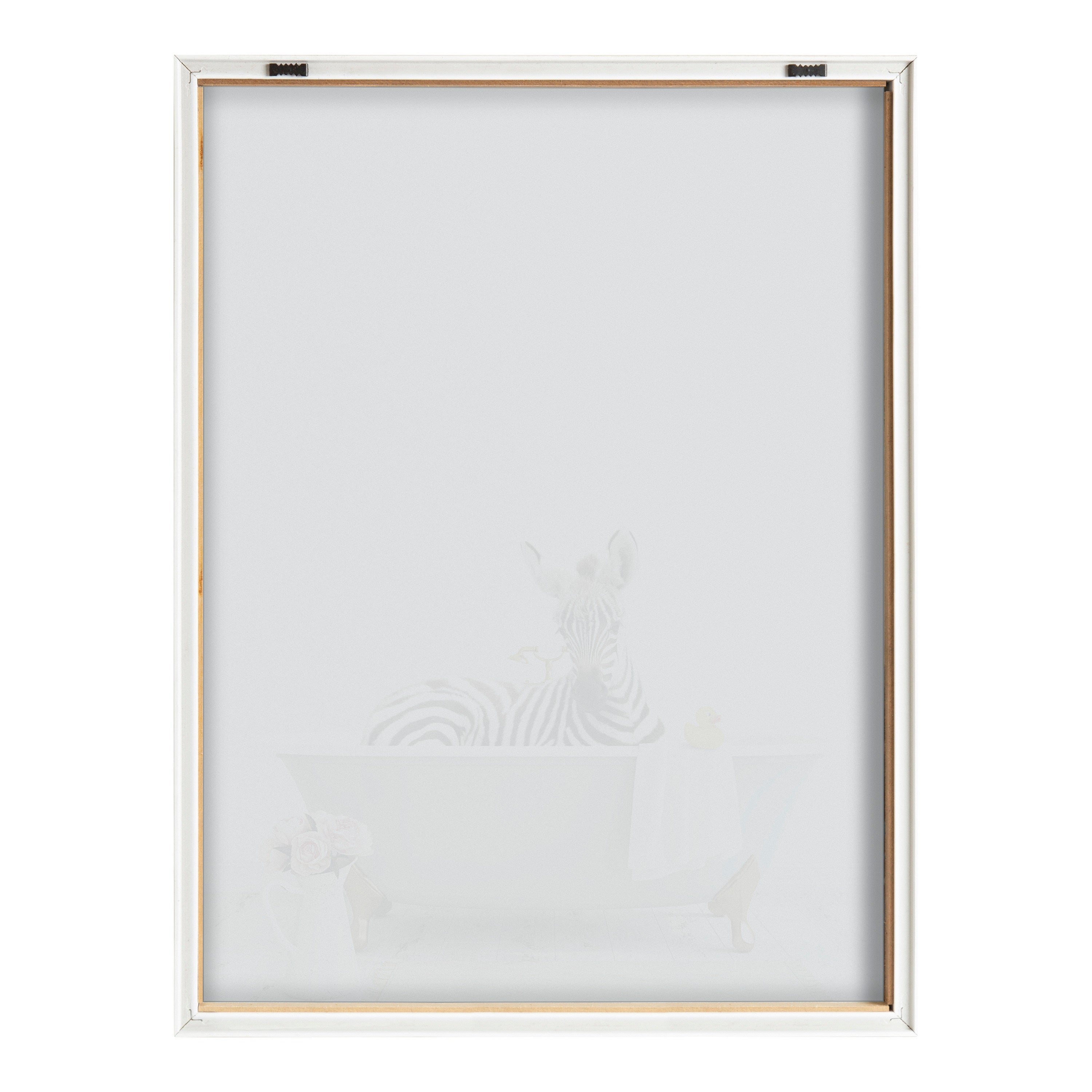 This cute little zebra art print is a fantastic way to add joy and fun to your bath time routine. Printed and framed in the USA in Waunakee, Wisconsin, this framed glass art will be a pleasure to look at every day in your living room, bedroom, office, or any room in the home. This art print also makes an excellent gift for birthdays, holidays, or house-warming parties. Printed on glass framed with a lightweight polystyrene frame, this wall art has two hangers already attached to the back for easy wall display.