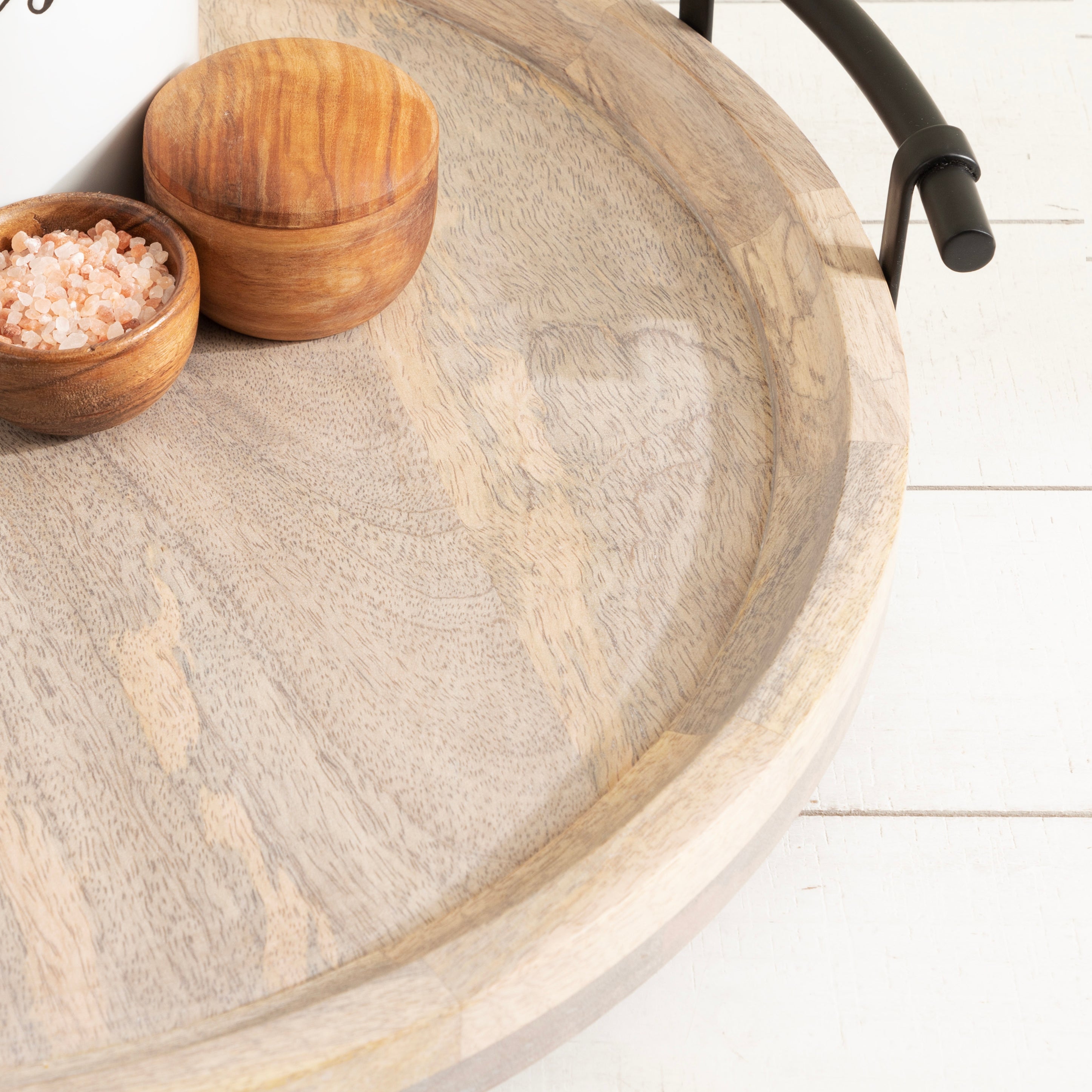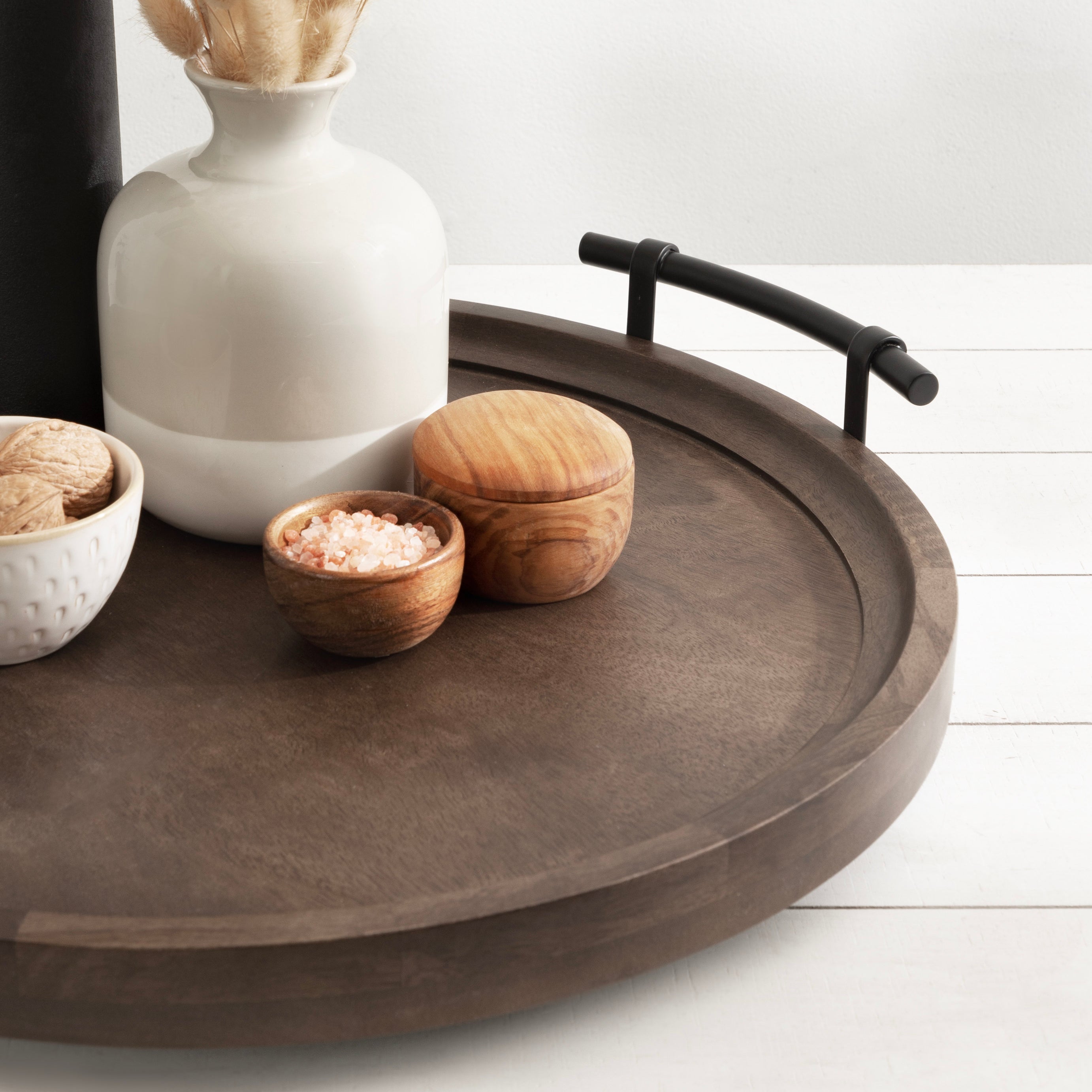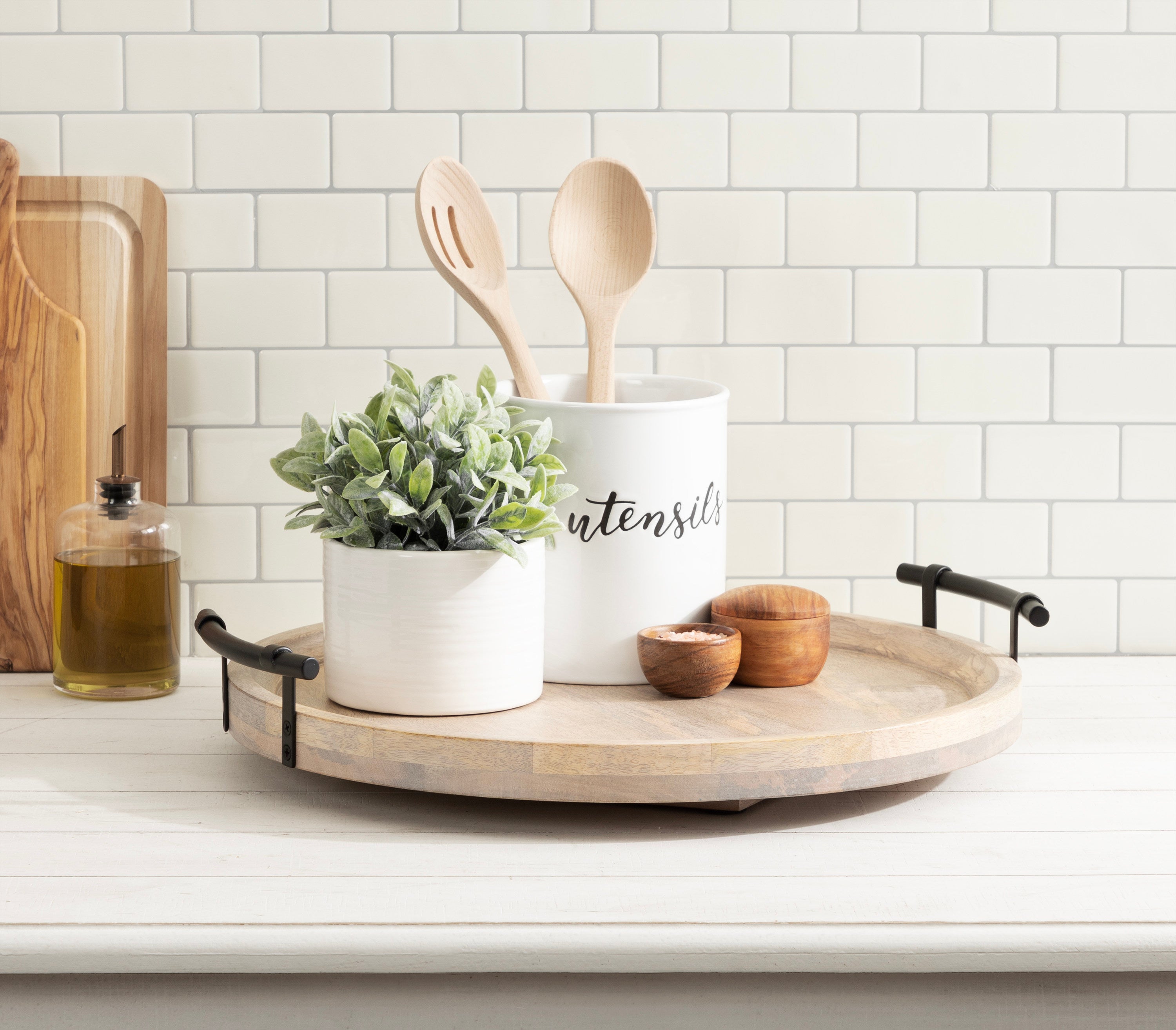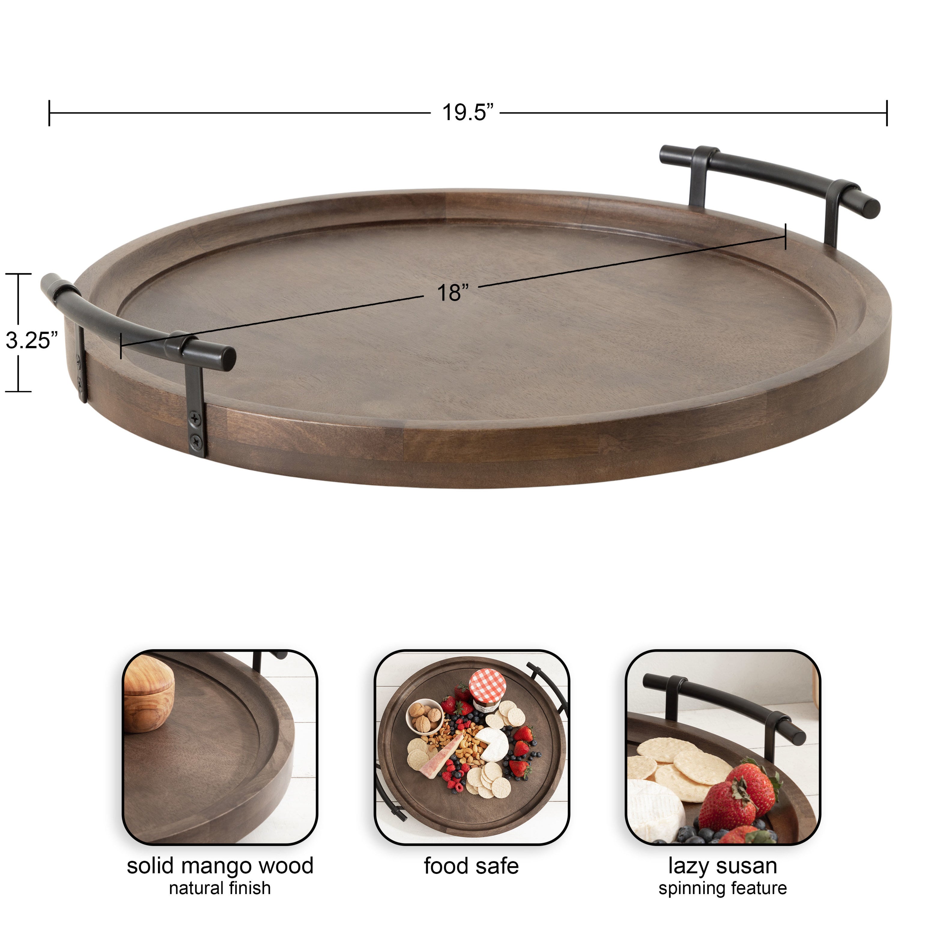 This circular lazy Susan tray is a highly versatile accent that is great as a food-safe dining table serving tray or as a decor piece on your kitchen countertops. Say goodbye to the hassle of rummaging through cluttered cabinets; simply give the tray a gentle spin, and everything you need is right at your fingertips. The metal handles and smooth rotation ensure effortless movement, while the sturdy base keeps your items secure, preventing any accidental spills. This circular under-sink organizer is not just limited to the kitchen; it's perfect for bathroom cabinets, office desks, or even as a centerpiece on your dining table.