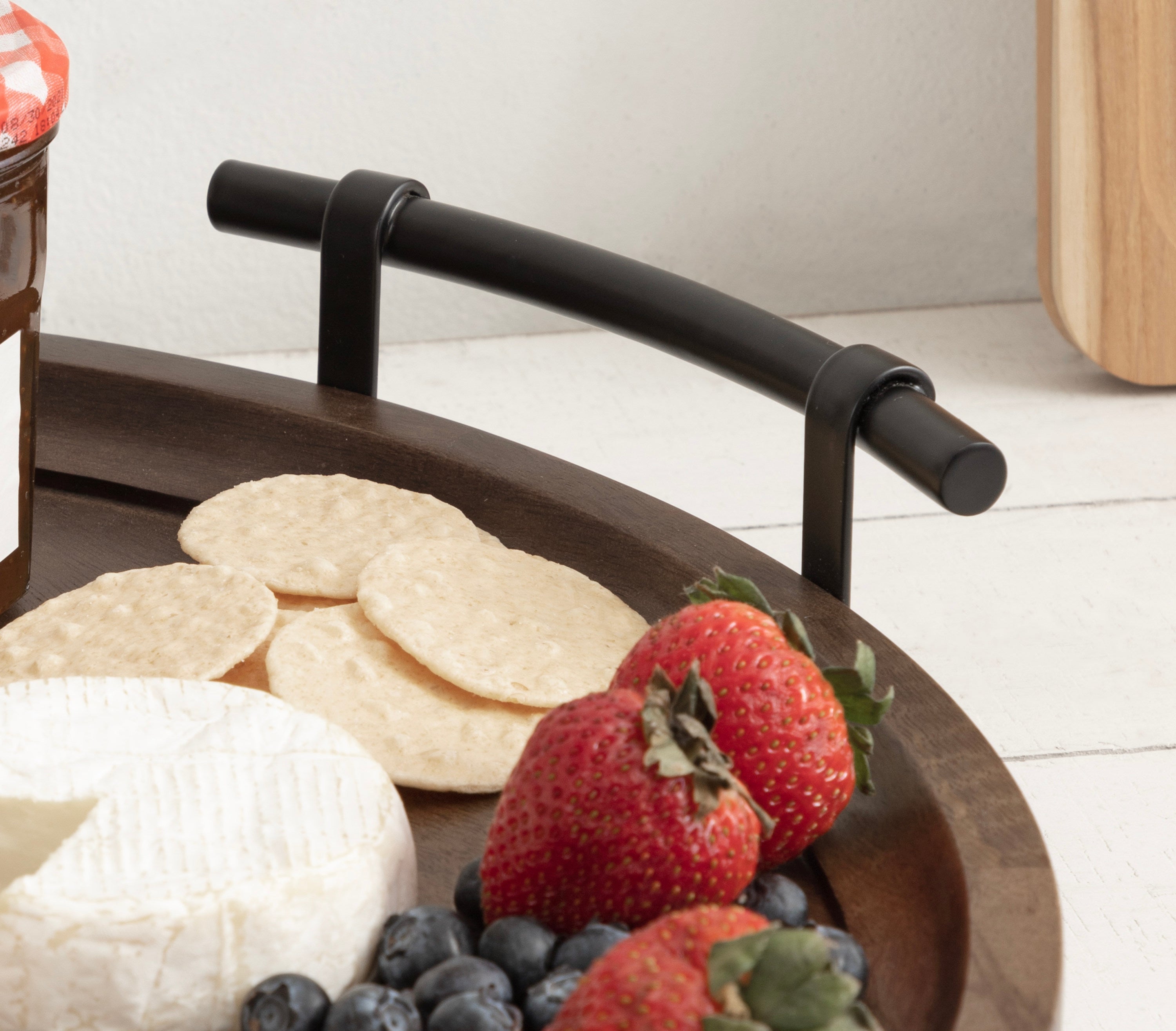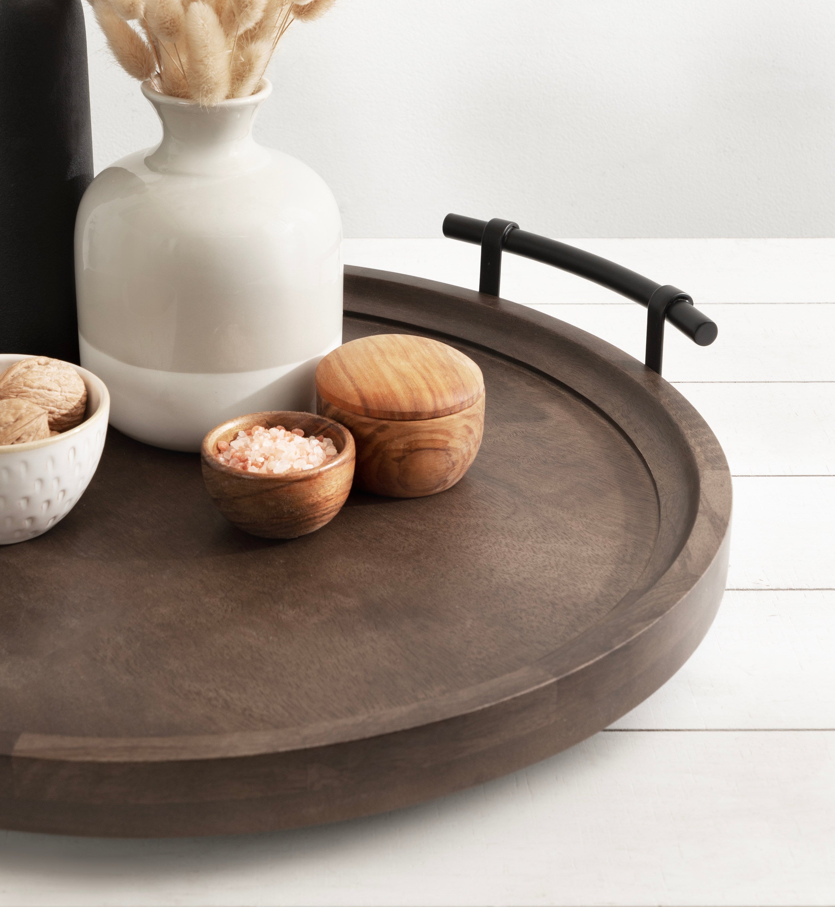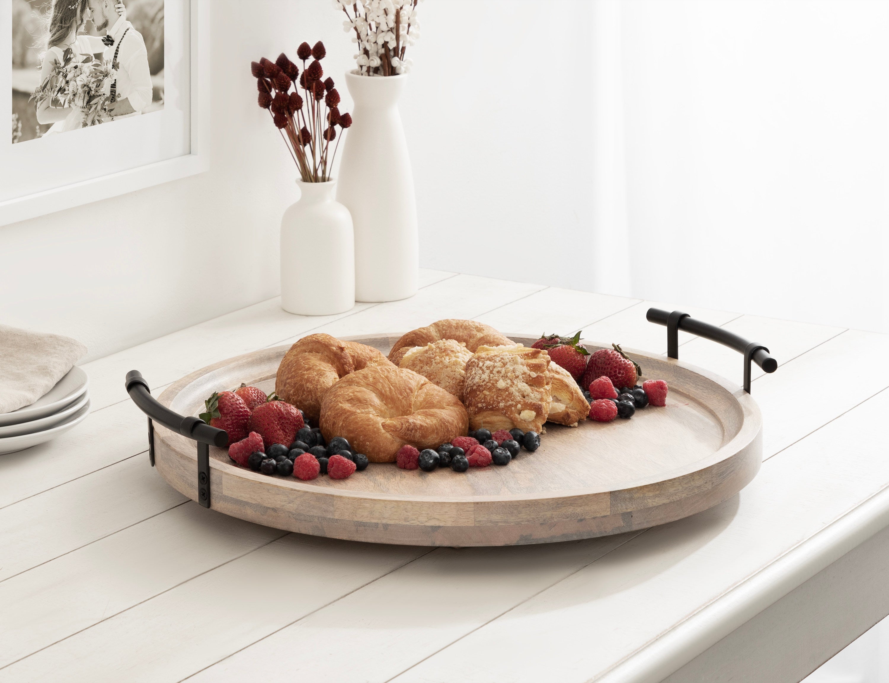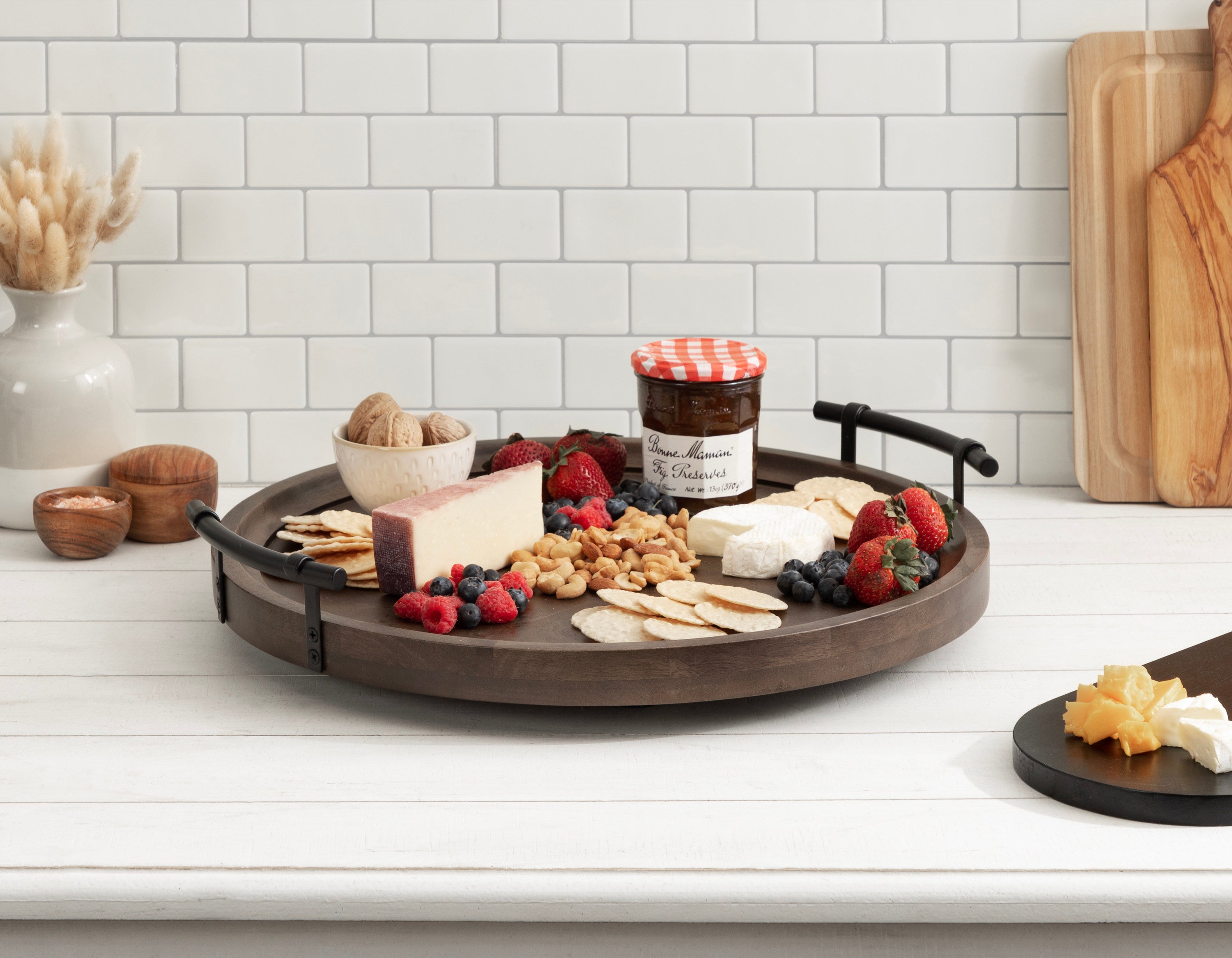 This circular lazy Susan tray is a highly versatile accent that is great as a food-safe dining table serving tray or as a decor piece on your kitchen countertops. Say goodbye to the hassle of rummaging through cluttered cabinets; simply give the tray a gentle spin, and everything you need is right at your fingertips. The metal handles and smooth rotation ensure effortless movement, while the sturdy base keeps your items secure, preventing any accidental spills. This circular under-sink organizer is not just limited to the kitchen; it's perfect for bathroom cabinets, office desks, or even as a centerpiece on your dining table.
