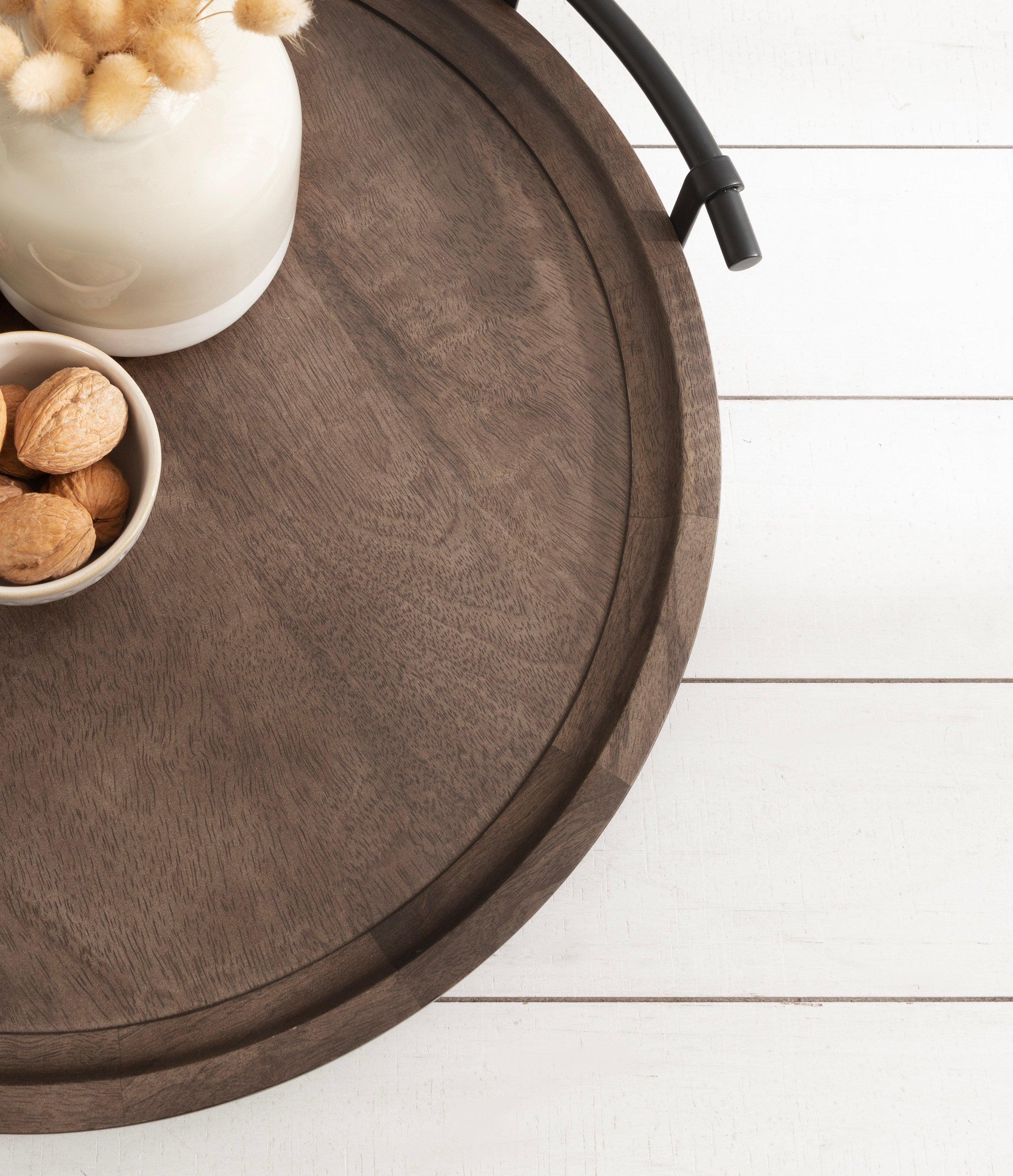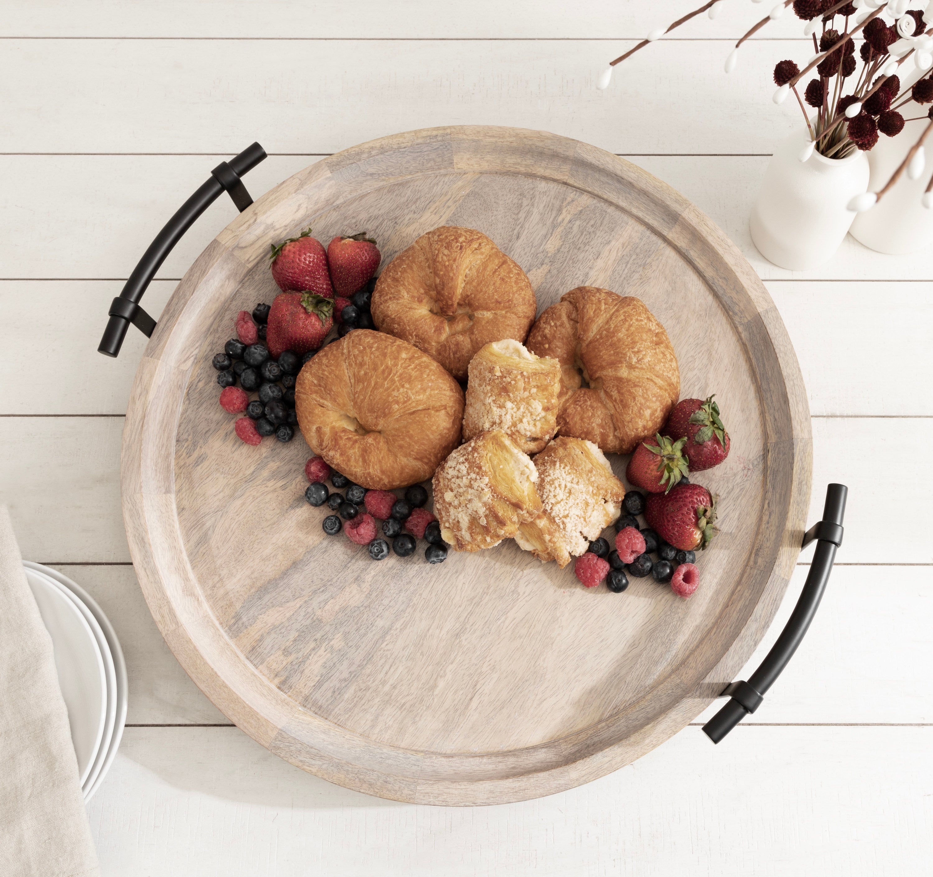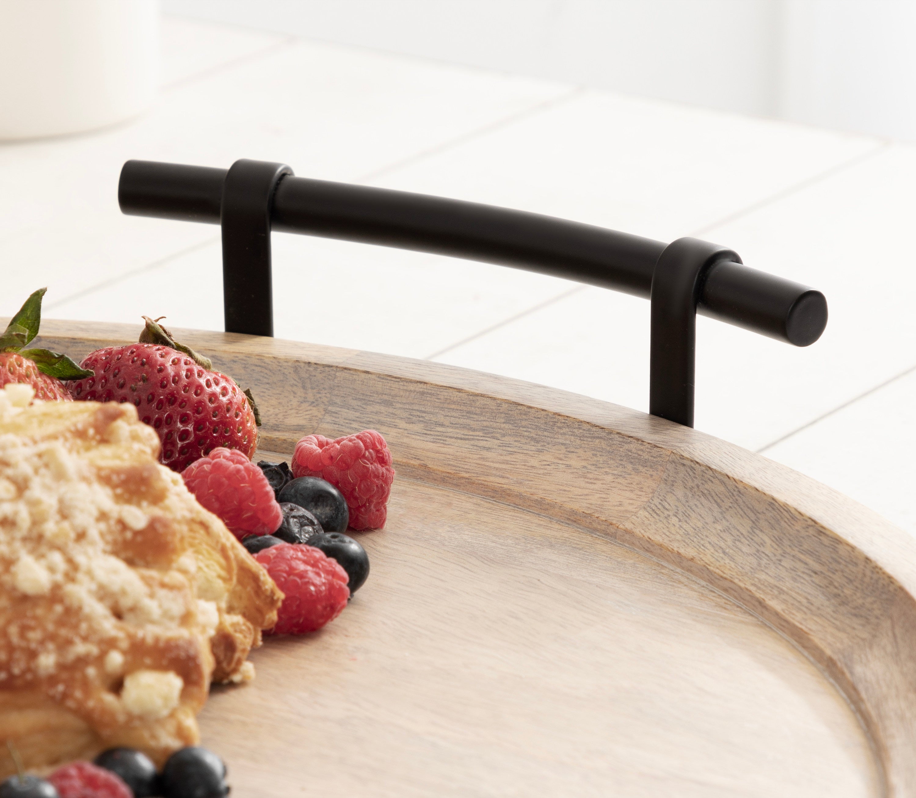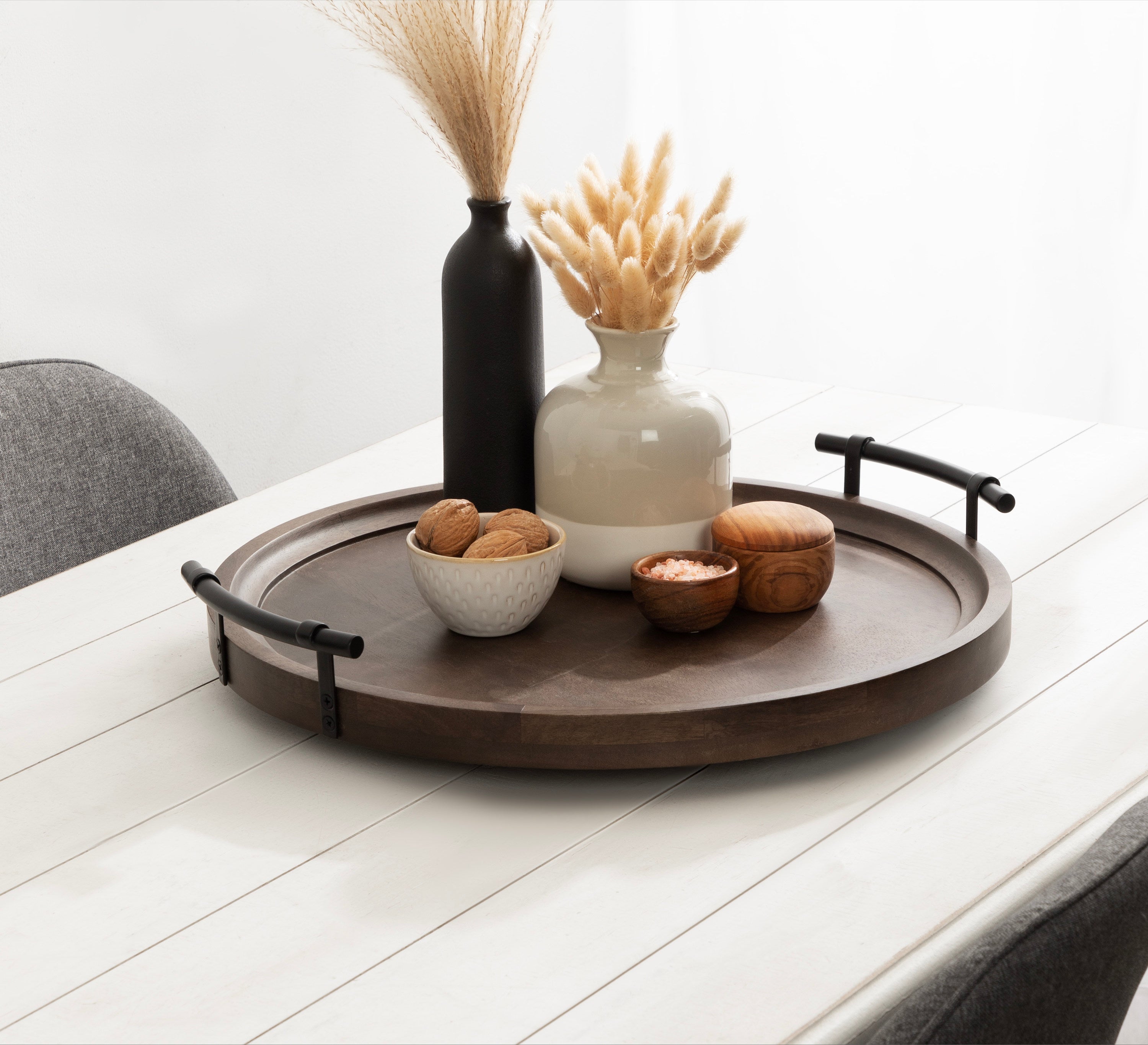 This circular lazy Susan tray is a highly versatile accent that is great as a food-safe dining table serving tray or as a decor piece on your kitchen countertops. Say goodbye to the hassle of rummaging through cluttered cabinets; simply give the tray a gentle spin, and everything you need is right at your fingertips. The metal handles and smooth rotation ensure effortless movement, while the sturdy base keeps your items secure, preventing any accidental spills. This circular under-sink organizer is not just limited to the kitchen; it's perfect for bathroom cabinets, office desks, or even as a centerpiece on your dining table.