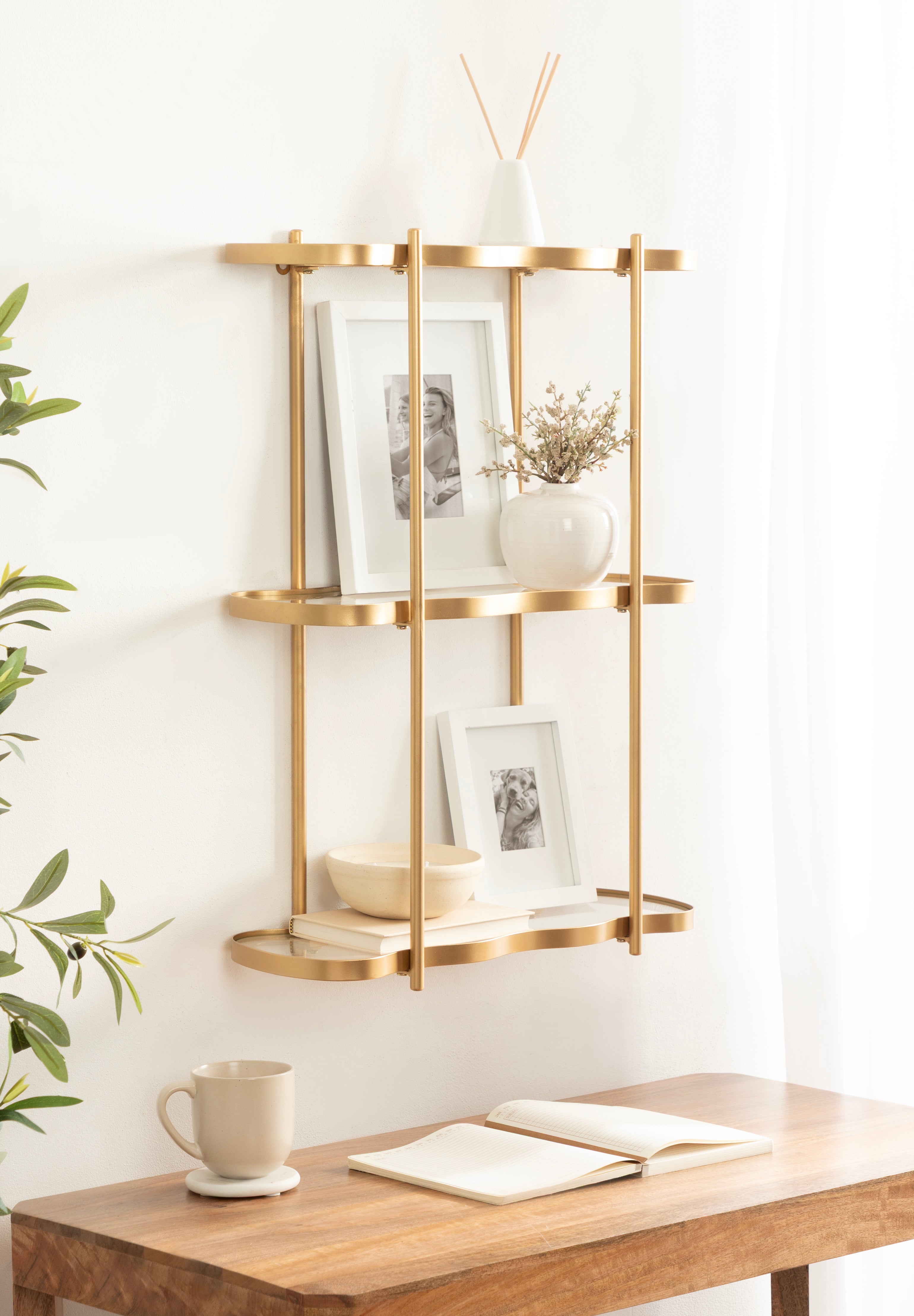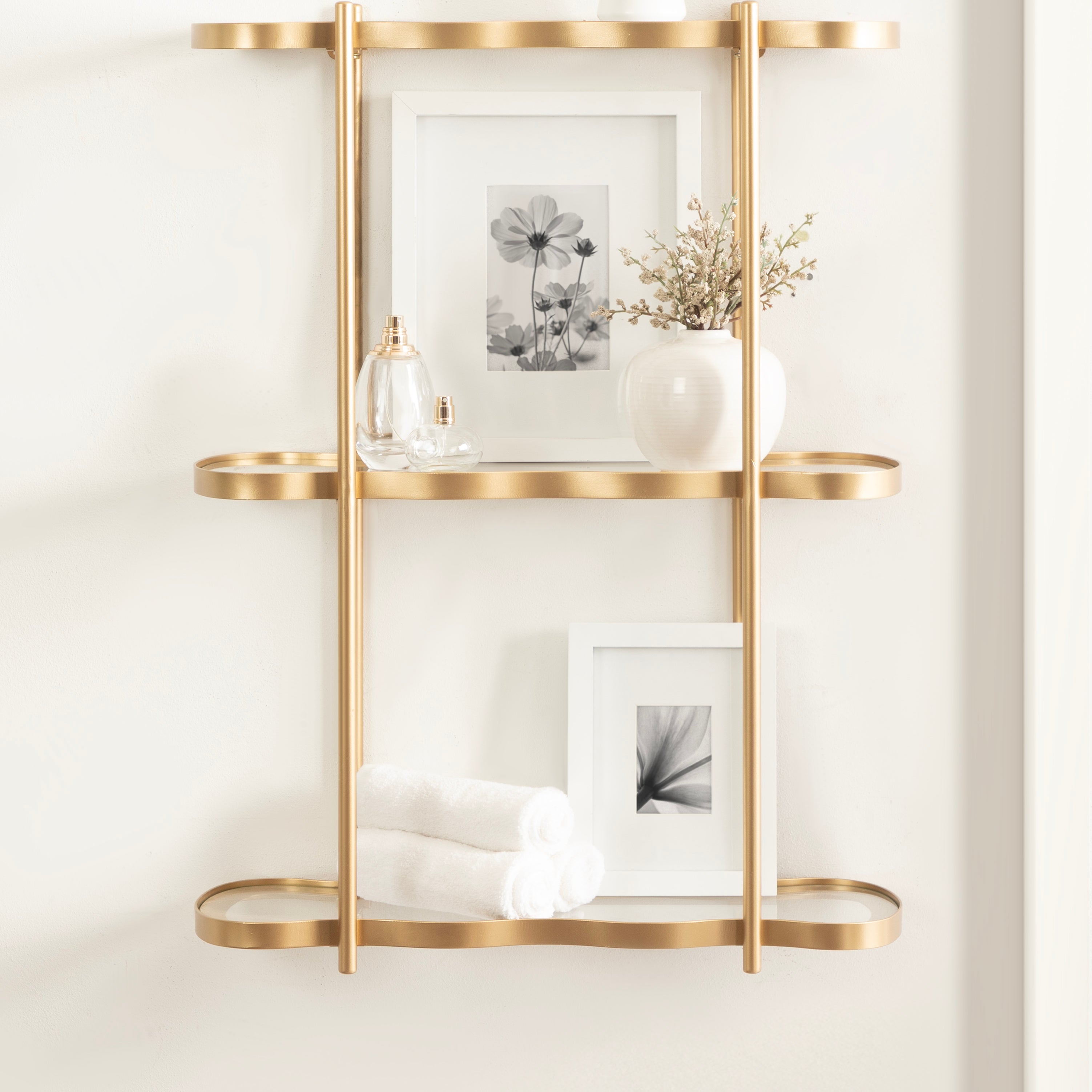 A wall shelf isn't just for storage! Now your space-saving storage can be a dazzling and show-stopping wall display. That's what makes the Curventi shelf an incredible addition to your modern wall decor. It features three tiers of modern and resilient glass shelves within a decorative wavy metal frame, creating a jaw-dropping display and storage solution for all your favorite keepsakes and household necessities. Each shelf has plenty of storage or display room for keepsakes, photos, bathroom necessities, plants, and other household necessities. After its simple two-step assembly process, you can hang this beautiful metal wall shelf in only a matter of seconds with the attached metal keyhole hangers.