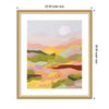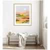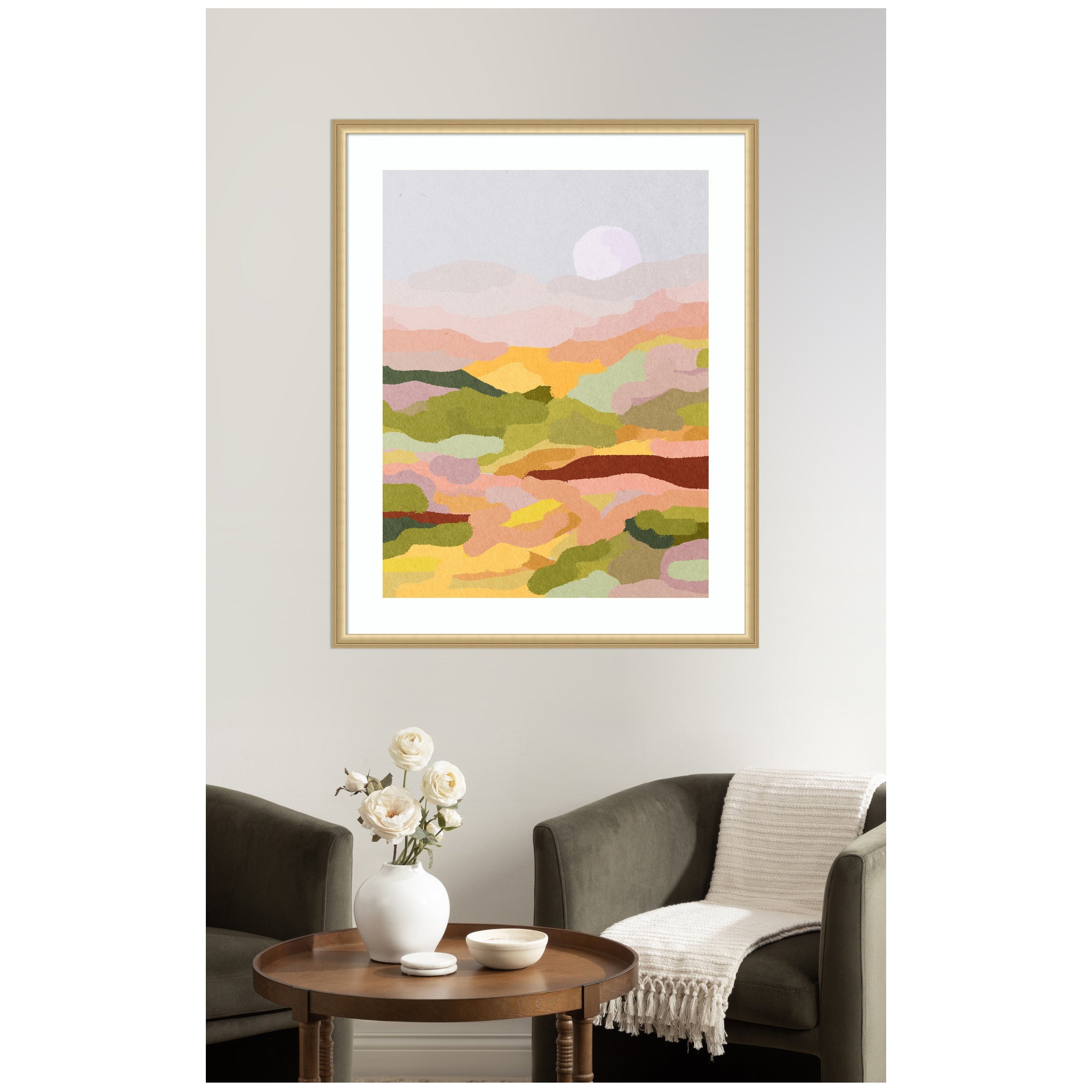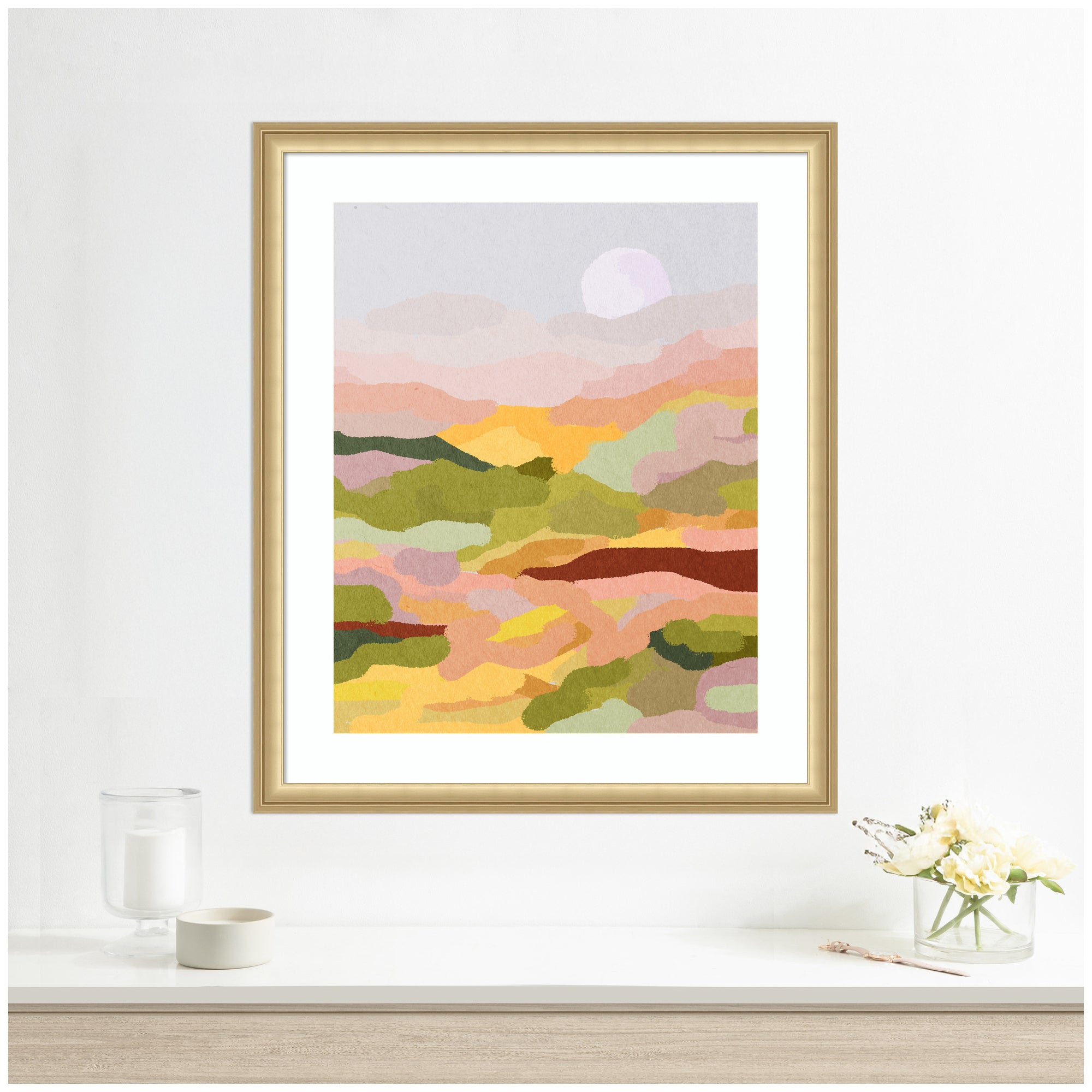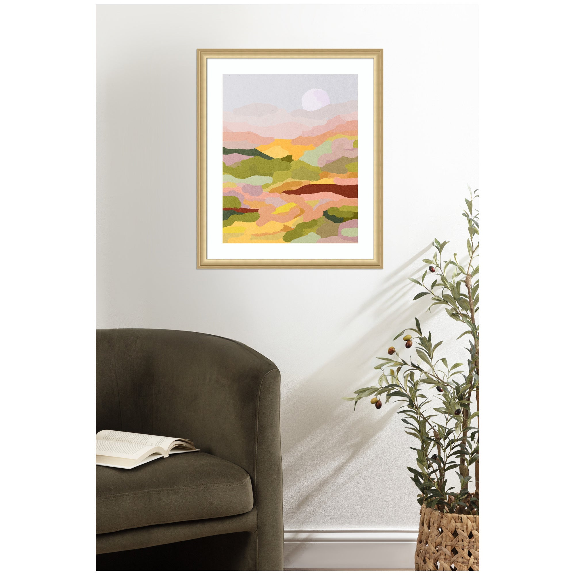 Elevate your space through thoughtfully curated style with this stunning piece designed by independent artist July Art Prints and beautifully framed by hand in Madison, WI. The image is giclee printed using fade-resistant inks, ensuring every detail comes to life in rich, lasting color. Set in designer moulding, its a Coastal accent crafted to make a statement. Visual Story: The artwork depicts an abstract landscape with flowing shapes and soft colors reminiscent of a sunset. Pastel hues of pink, orange, and green create a soothing, serene atmosphere. The composition suggests a panoramic view of rolling hills under a calming sky.