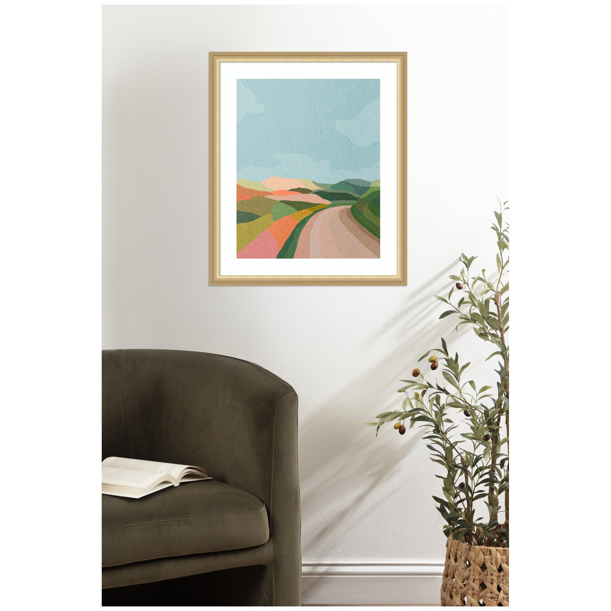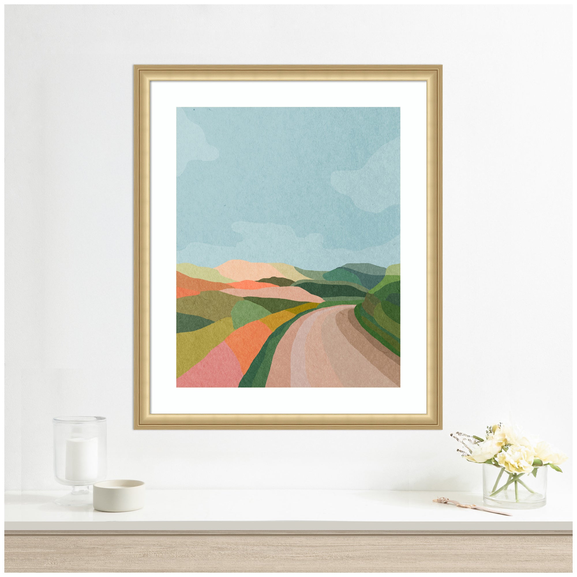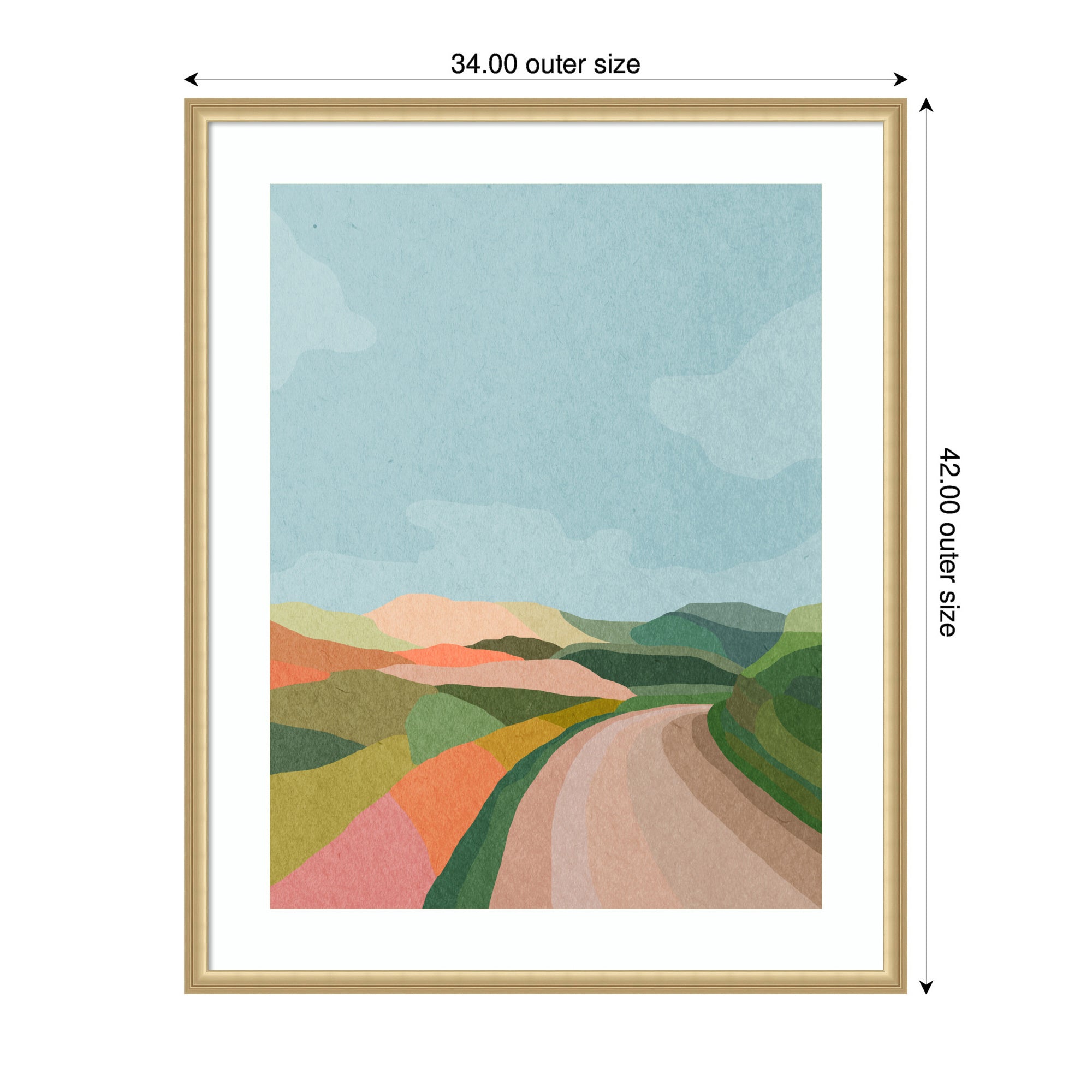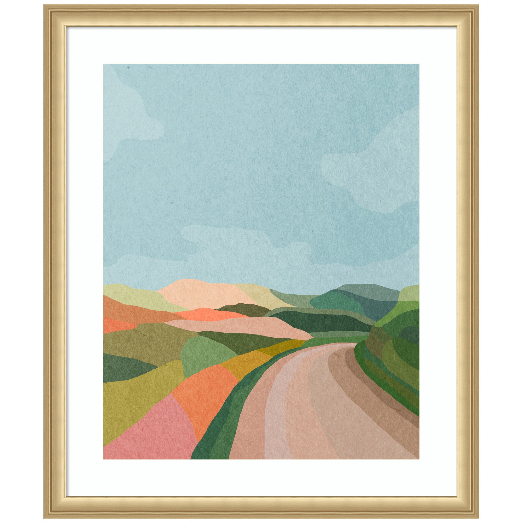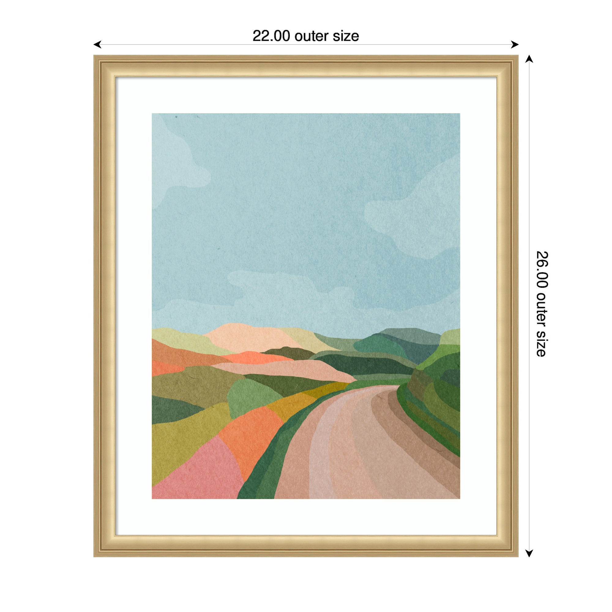 - Authentic Artist Collaboration: 'Beautiful Landscape with Road' is an officially licensed work by independent artist July Art Prints, thoughtfully presented in our Florence Gold molding. The finished piece measures 22 x 26, offering a sophisticated statement for your space. Visual Story: The artwork depicts an abstract landscape with rolling hills and a winding path. The hills are painted in soft, pastel colors, creating a serene and harmonious scene. The sky is a clear blue, complementing the earthy tones of the landscape. July Art Prints's Artist Profile: Interior-designer-turned-digital-artist "July" creates cute, story-book animal scenes inspired by her love of travel and the natural world.