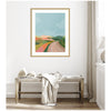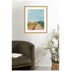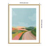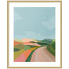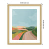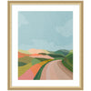 Elevate your space through thoughtfully curated style with this stunning piece designed by independent artist July Art Prints and beautifully framed by hand in Madison, WI. The image is giclee printed using fade-resistant inks, ensuring every detail comes to life in rich, lasting color. Set in designer moulding, its a Mid Century Modern accent crafted to make a statement. Visual Story: The artwork depicts an abstract landscape with rolling hills and a winding path. The hills are painted in soft, pastel colors, creating a serene and harmonious scene. The sky is a clear blue, complementing the earthy tones of the landscape.