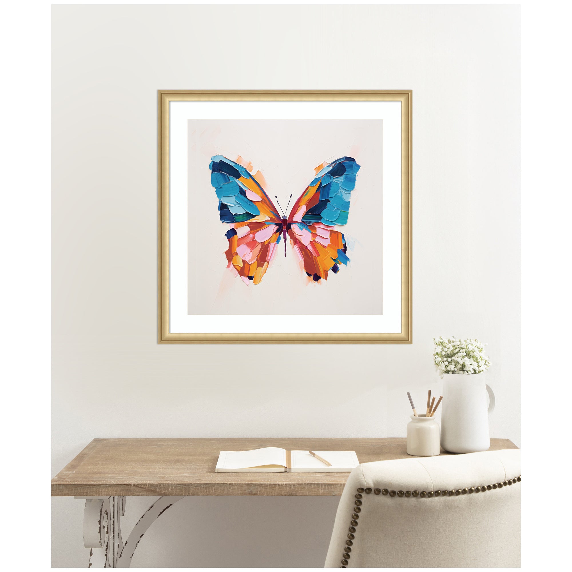 Elevate your space through thoughtfully curated style with this stunning piece designed by independent artist The Creative Bunch Studio and beautifully framed by hand in Madison, WI. The image is giclee printed using fade-resistant inks, ensuring every detail comes to life in rich, lasting color. Set in designer moulding, its a Bohemian Boho accent crafted to make a statement. Visual Story: The artwork depicts a butterfly with vibrant and bold colors using thick, textured brushstrokes. The wings are composed of an array of hues, including blues, oranges, and pinks, creating a dynamic and lively visual effect. The abstract style emphasizes the beauty and complexity of nature.