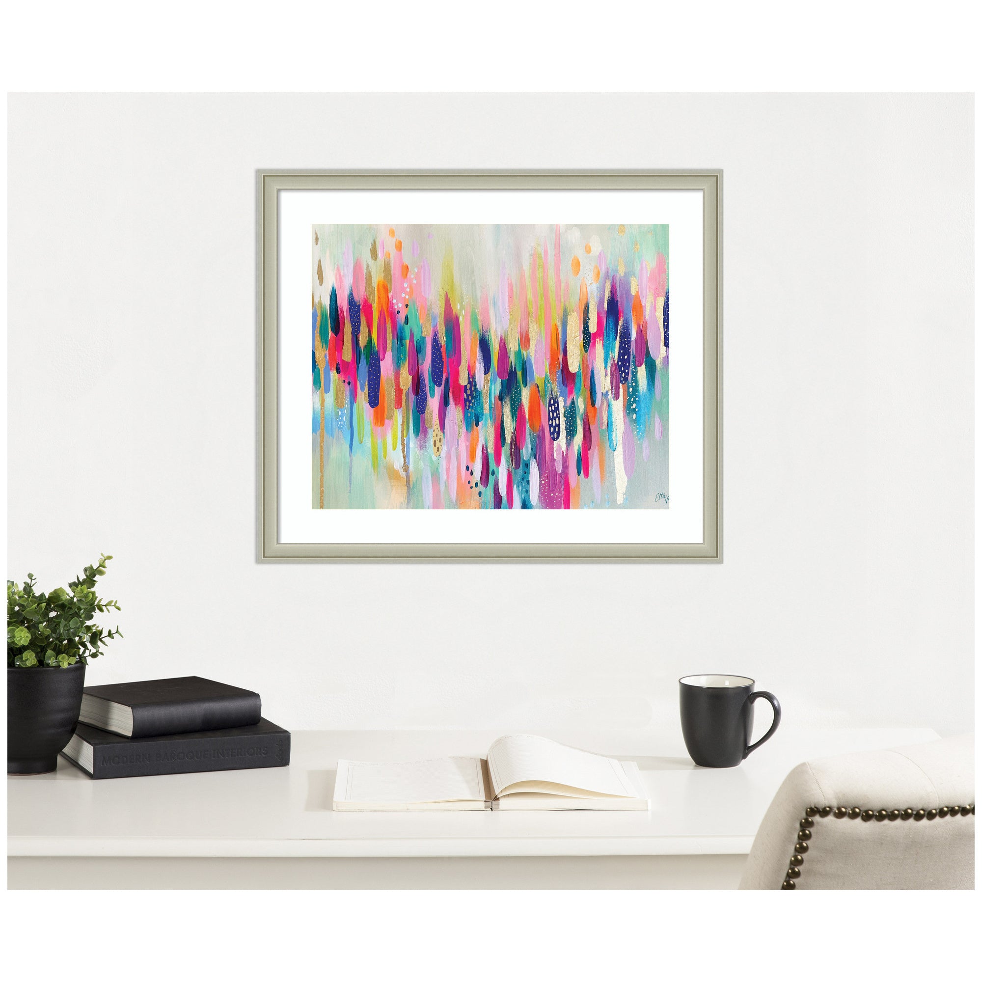 Elevate your space through thoughtfully curated style with this stunning piece designed by independent artist Ettavee and beautifully framed by hand in Madison, WI. The image is giclee printed using fade-resistant inks, ensuring every detail comes to life in rich, lasting color. Set in designer moulding, its a Modern Contemporary accent crafted to make a statement. Visual Story: The artwork features a vibrant array of colorful brushstrokes cascading down the canvas. It exudes an energetic and playful feel with dynamic compositions. The spectrum of colors creates a lively, abstract visual experience.