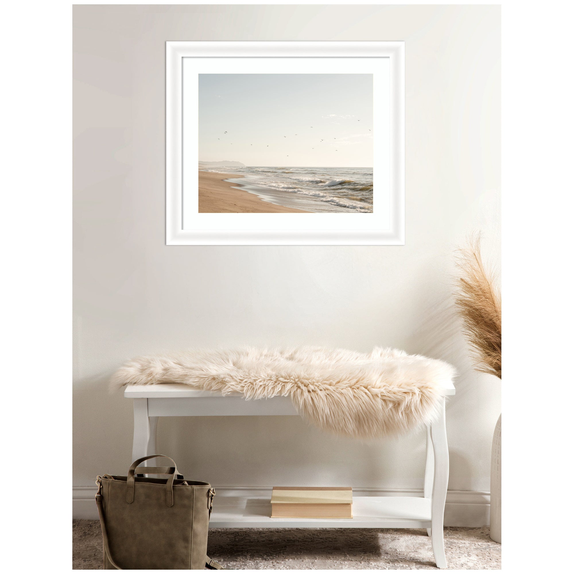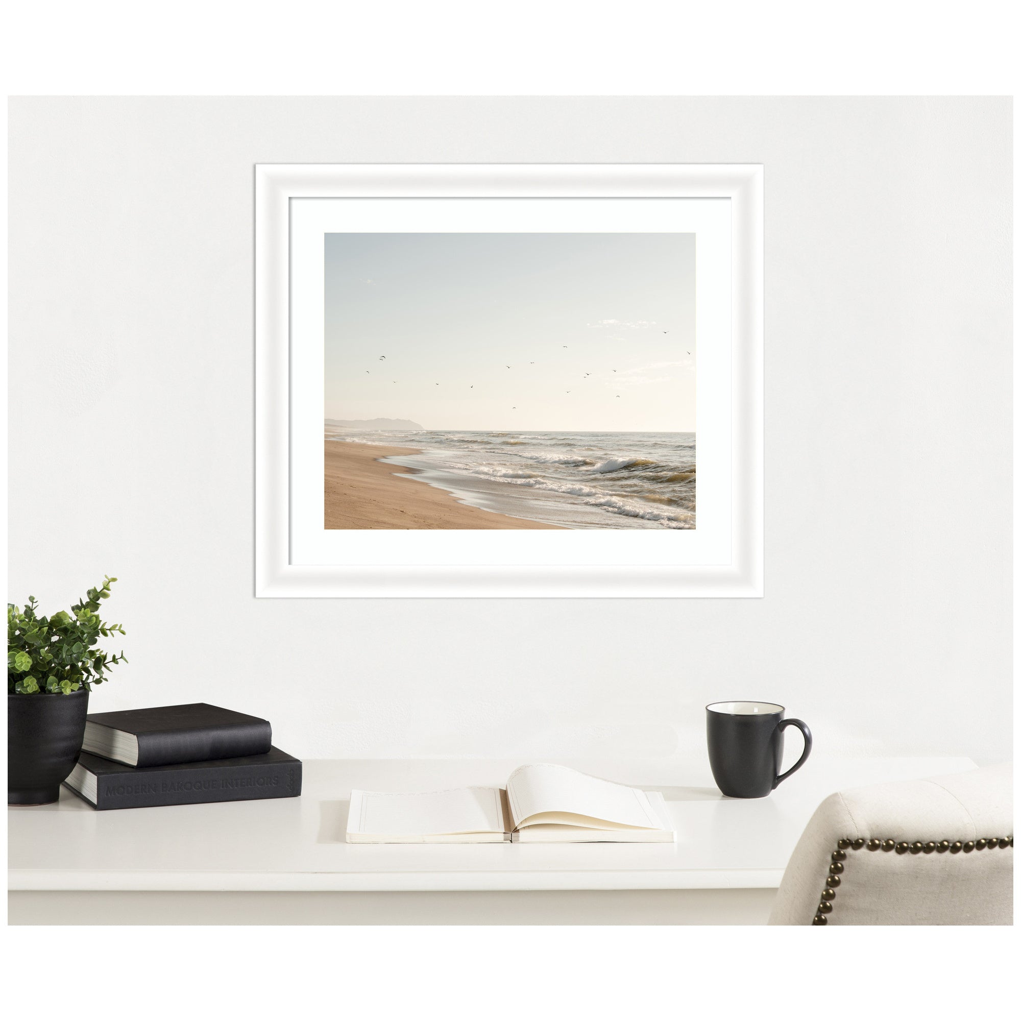 Elevate your space through thoughtfully curated style with this stunning piece designed by independent artist Crystal Lynn Collins and beautifully framed by hand in Madison, WI. The image is giclee printed using fade-resistant inks, ensuring every detail comes to life in rich, lasting color. Set in designer moulding, its a Coastal accent crafted to make a statement. Visual Story: The image depicts a tranquil beach scene with gentle waves lapping against the sand. A flock of birds is seen flying across a clear, expansive sky. The overall atmosphere is calm and serene, capturing the essence of a peaceful coastal landscape.