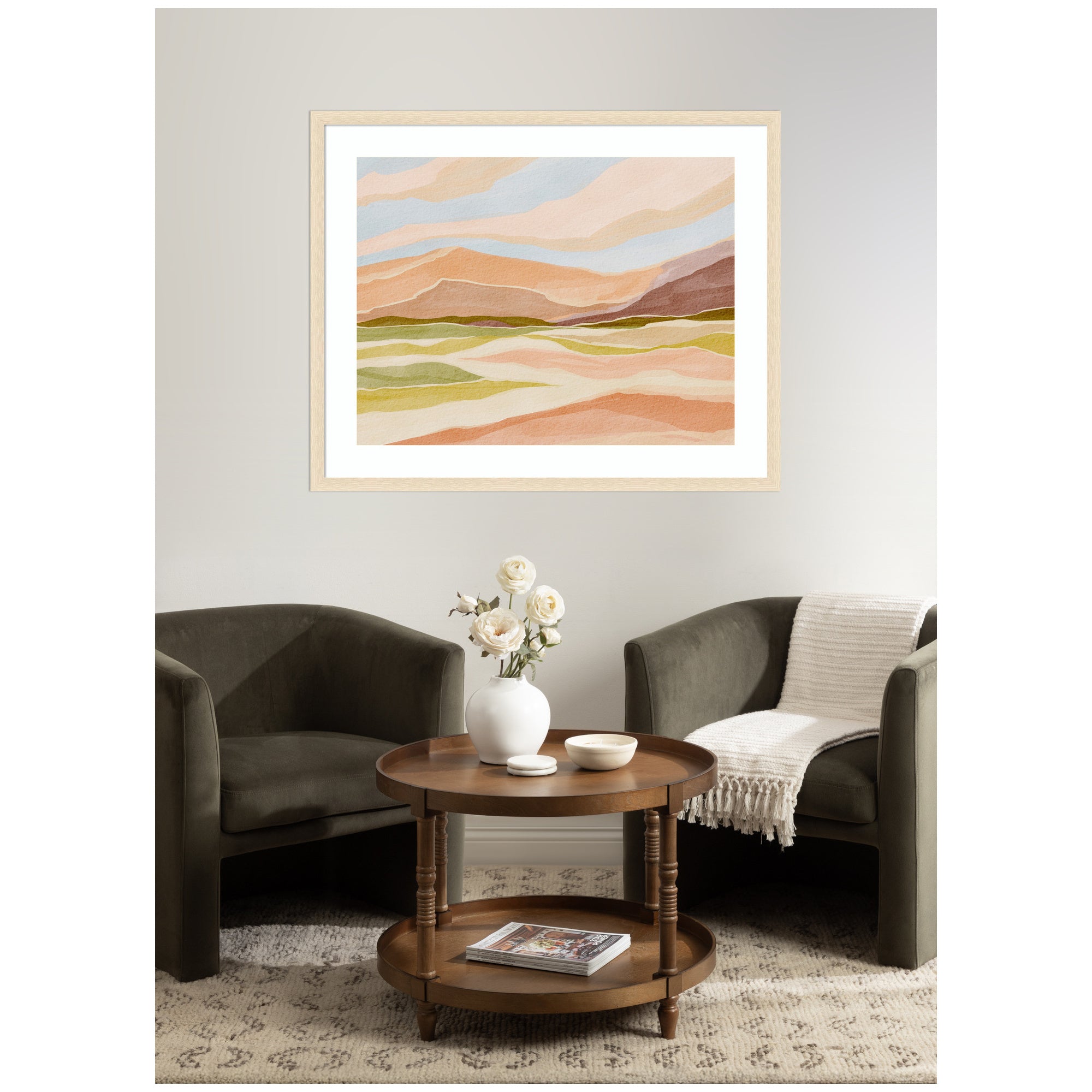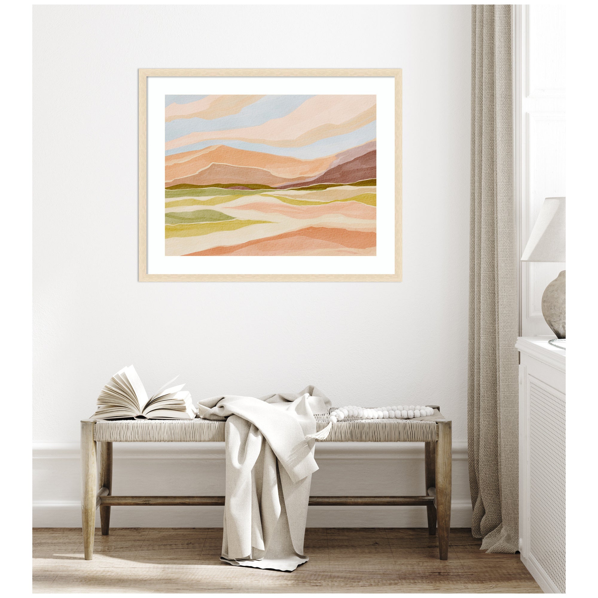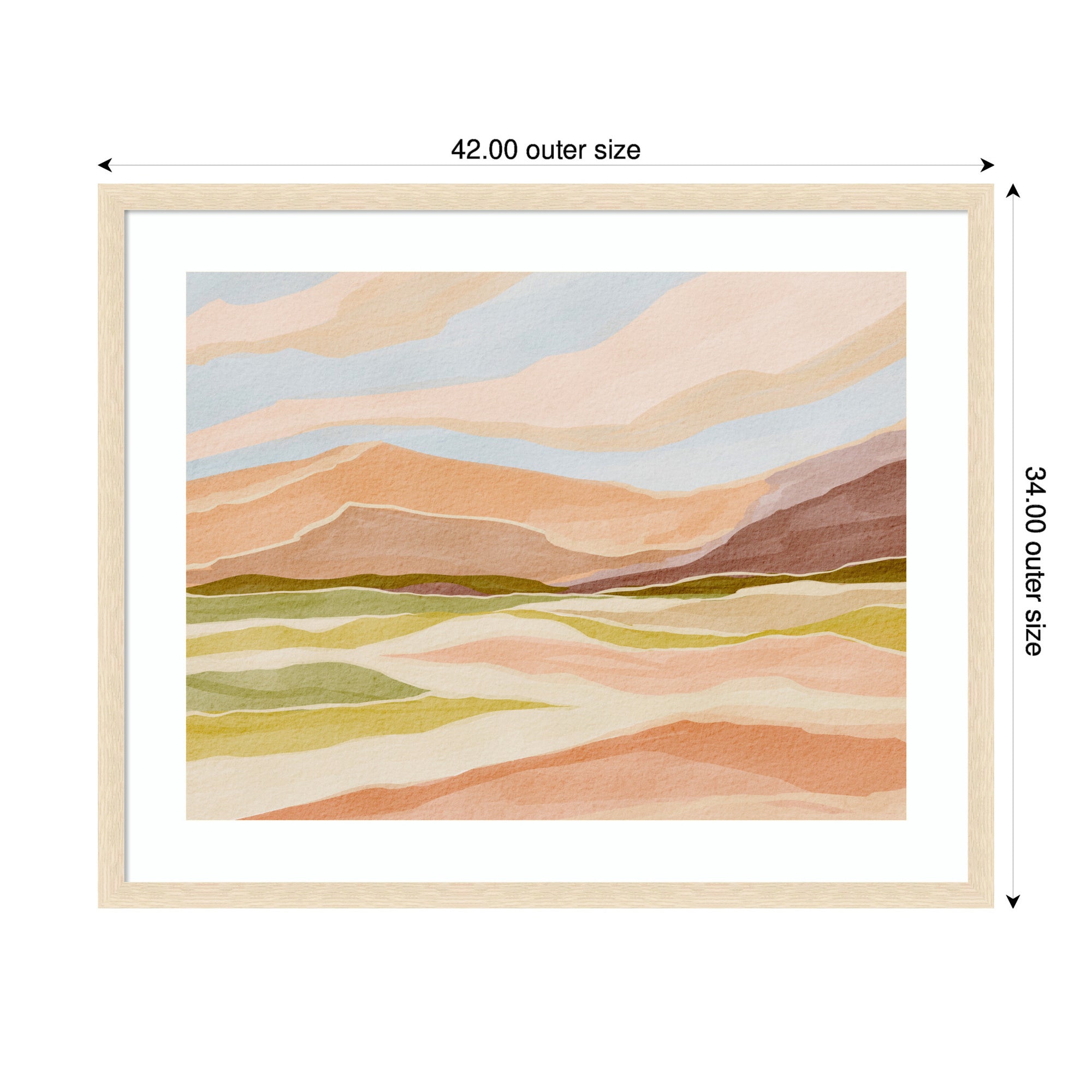 Elevate your space through thoughtfully curated style with this stunning piece designed by independent artist Nikita Jariwala and beautifully framed by hand in Madison, WI. The image is giclee printed using fade-resistant inks, ensuring every detail comes to life in rich, lasting color. Set in designer moulding, its a Modern Contemporary accent crafted to make a statement. Visual Story: This artwork depicts an abstract landscape of a desert scene with soft, flowing lines and pastel colors. The composition features mountains and hills that blend seamlessly into the horizon. The style evokes a serene and tranquil atmosphere.