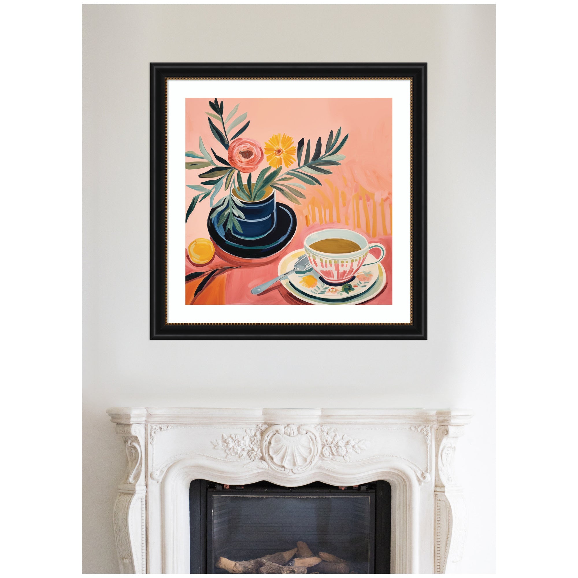 Elevate your space through thoughtfully curated style with this stunning piece designed by independent artist The Creative Bunch Studio and beautifully framed by hand in Madison, WI. The image is giclee printed using fade-resistant inks, ensuring every detail comes to life in rich, lasting color. Set in designer moulding, its a Modern Contemporary accent crafted to make a statement. Visual Story: This artwork features a vibrant still-life composition with a blue vase holding pink and yellow flowers against a pink backdrop. Next to the vase, there is a stylized teacup filled with tea, accompanied by a saucer and spoon. The bold colors and expressive brushstrokes create a modern and lively atmosphere.