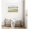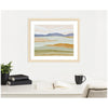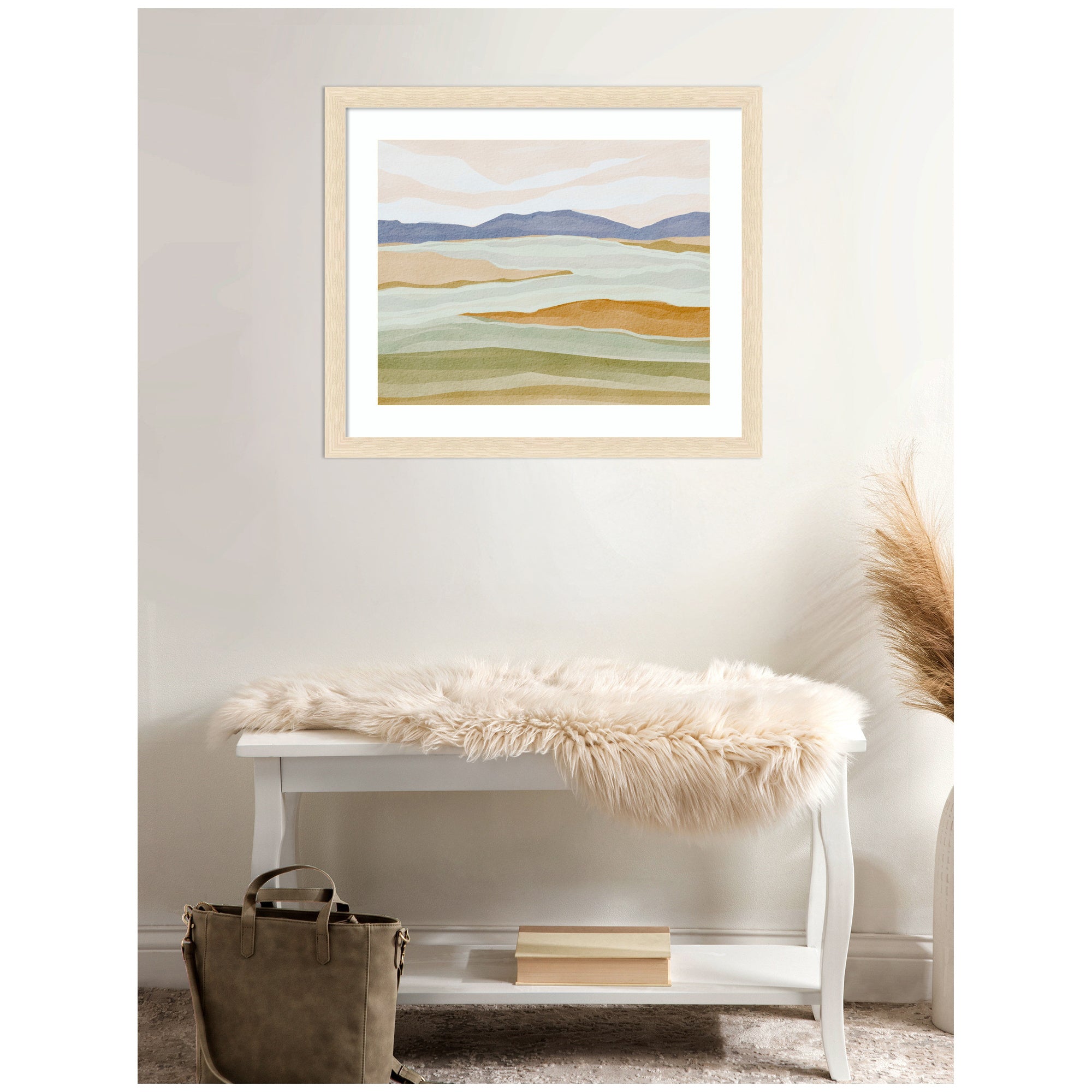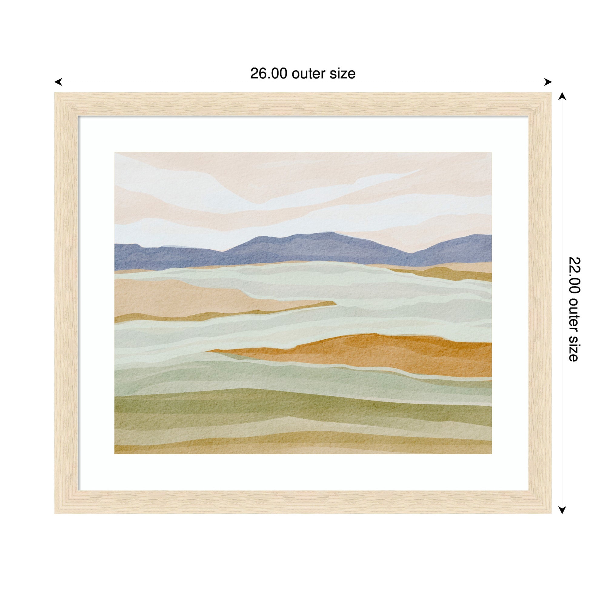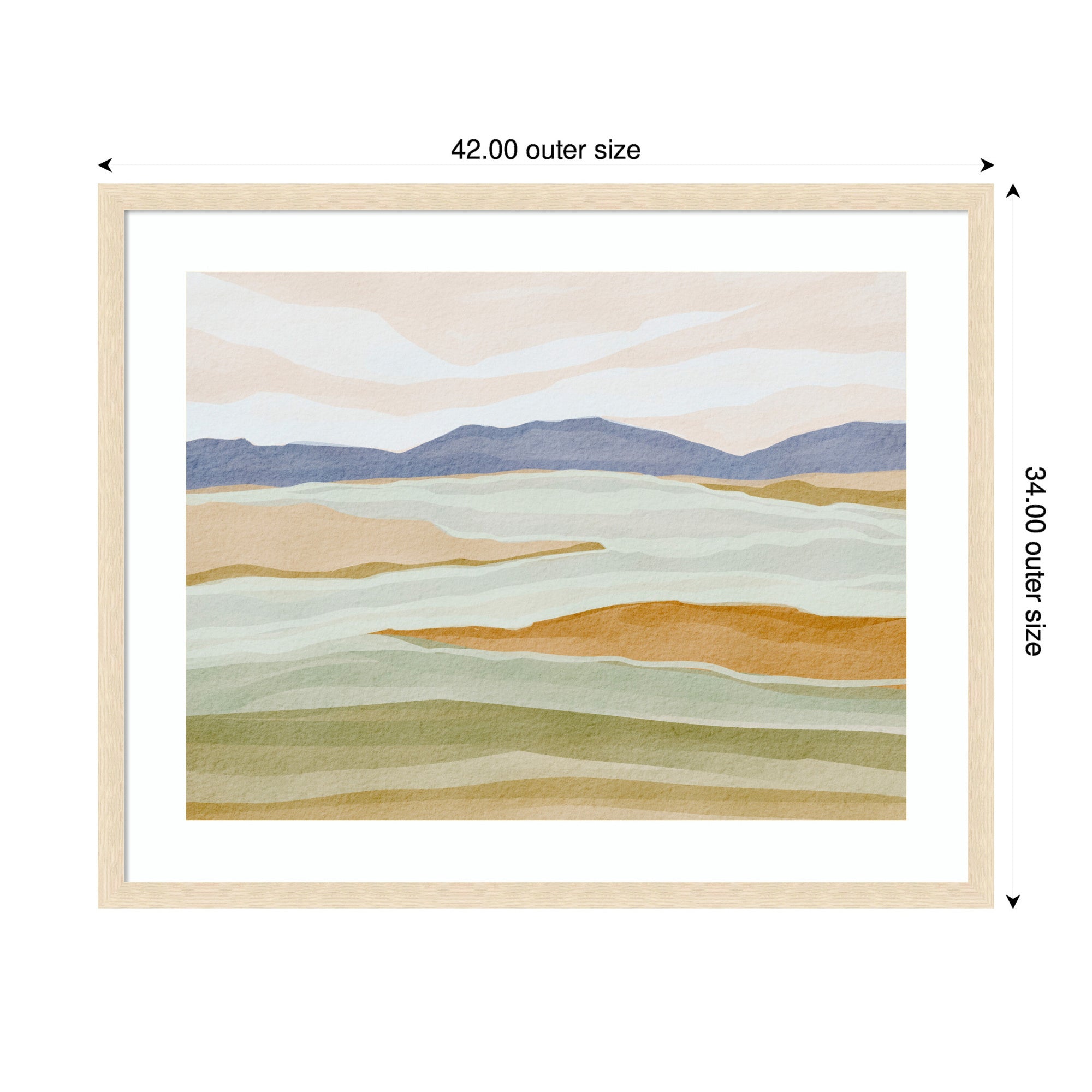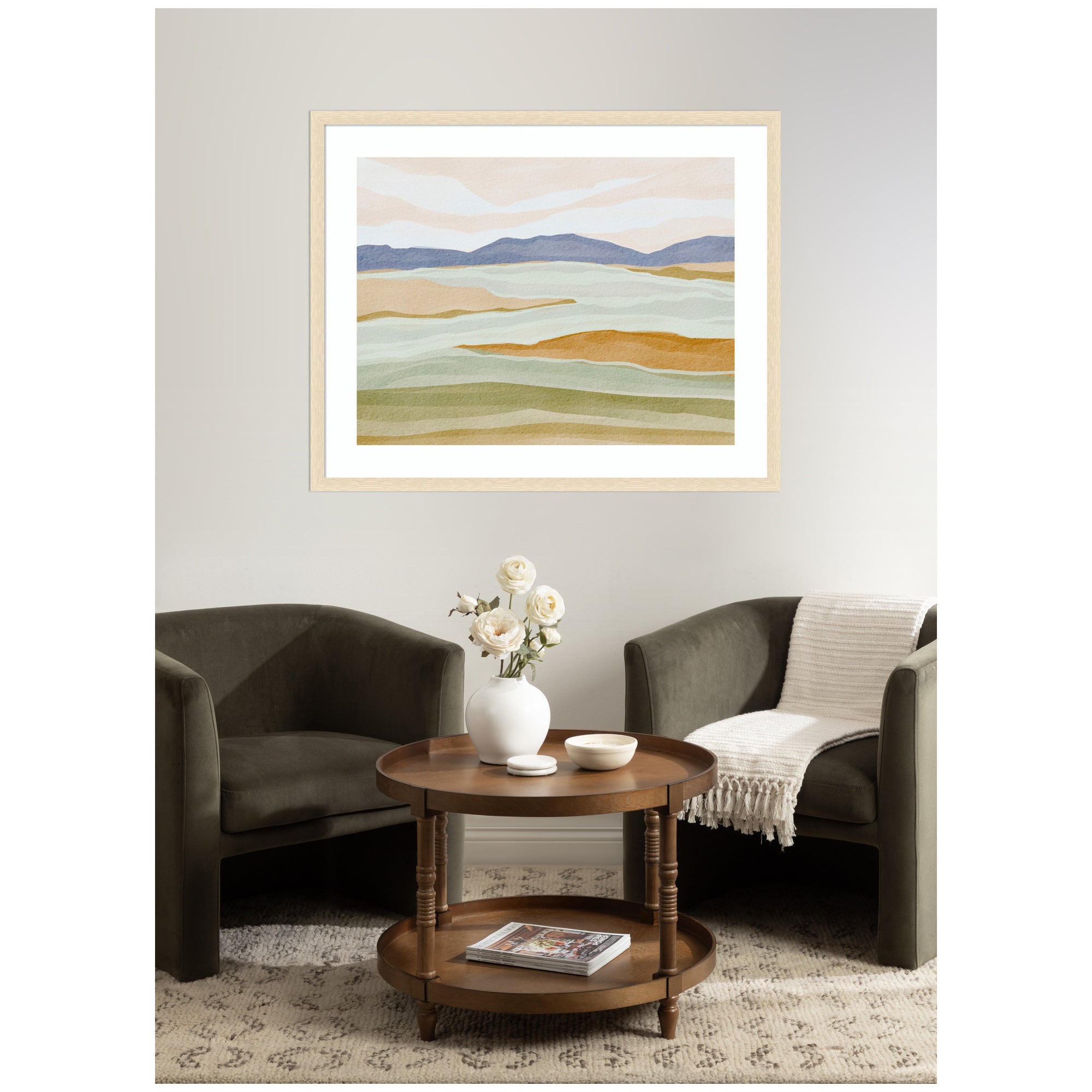 Elevate your space through thoughtfully curated style with this stunning piece designed by independent artist Nikita Jariwala and beautifully framed by hand in Madison, WI. The image is giclee printed using fade-resistant inks, ensuring every detail comes to life in rich, lasting color. Set in designer moulding, its a Modern Contemporary accent crafted to make a statement. Visual Story: The artwork depicts a serene abstract landscape with layered hues of pastel greens, blues, and earth tones. The mountains in the background provide a sense of depth and tranquility. The watercolor technique gives a soft, flowing feel to the composition.