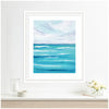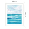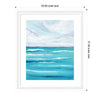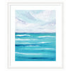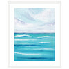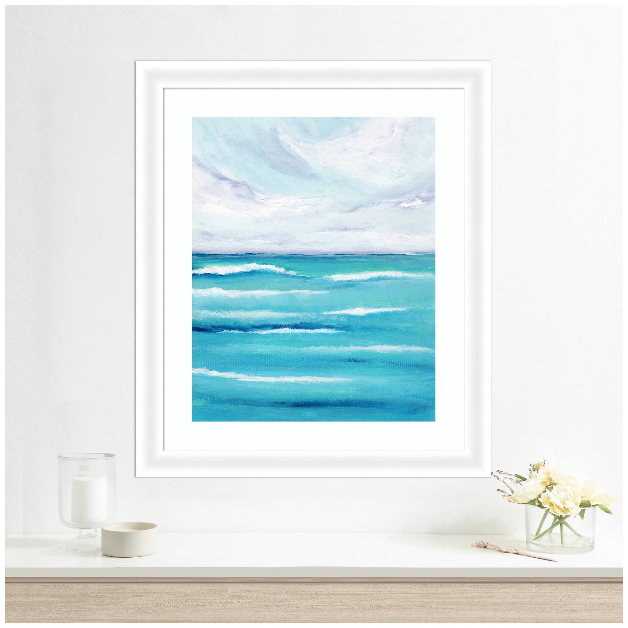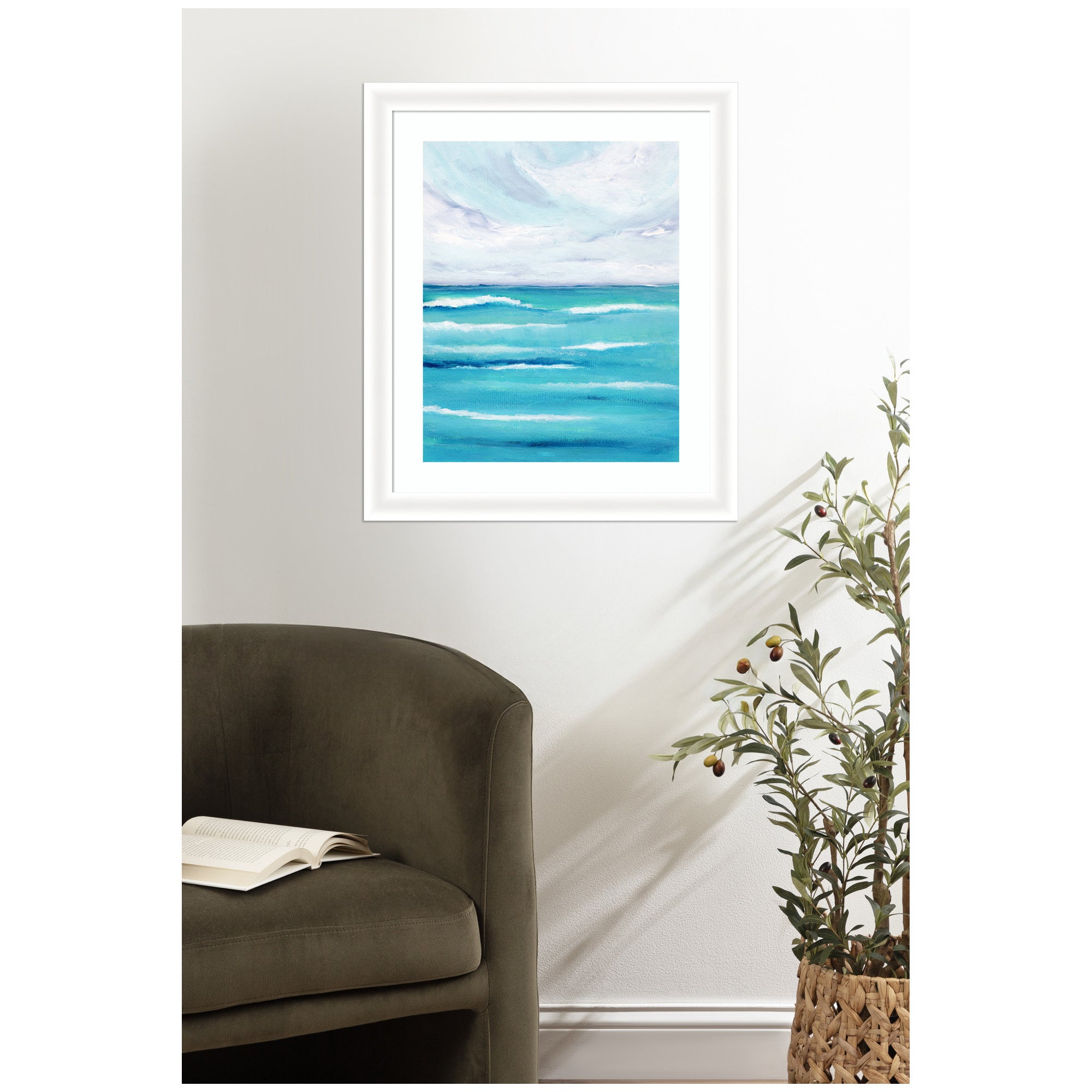 Elevate your space through thoughtfully curated style with this stunning piece designed by independent artist Nikita Jariwala and beautifully framed by hand in Madison, WI. The image is giclee printed using fade-resistant inks, ensuring every detail comes to life in rich, lasting color. Set in designer moulding, its a Coastal accent crafted to make a statement. Visual Story: This artwork depicts a serene ocean view, with gentle waves rolling beneath a vast, cloud-filled sky. The sea is painted in various shades of turquoise and blue, creating a calming atmosphere. The horizon line merges subtly with the soft, sweeping clouds above.