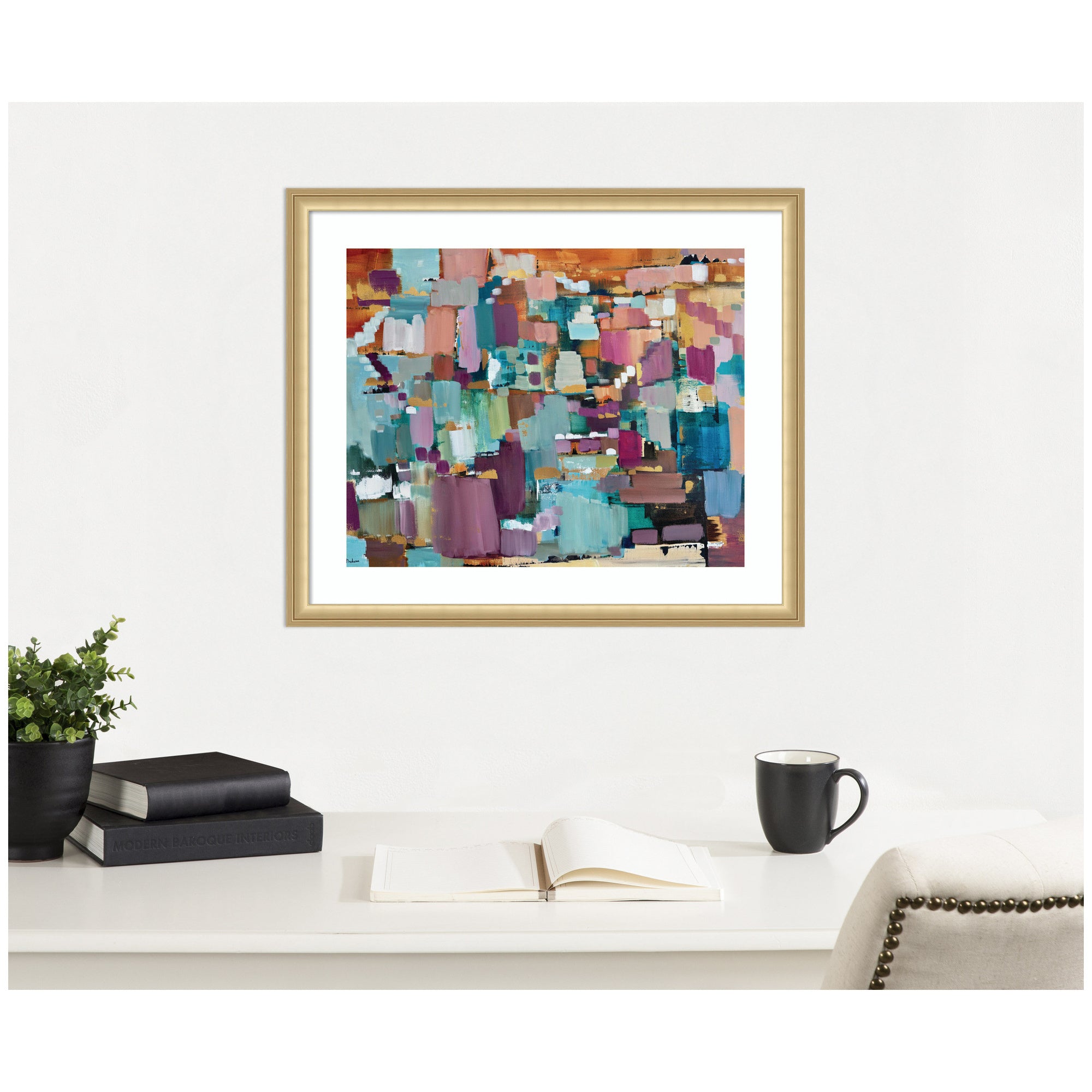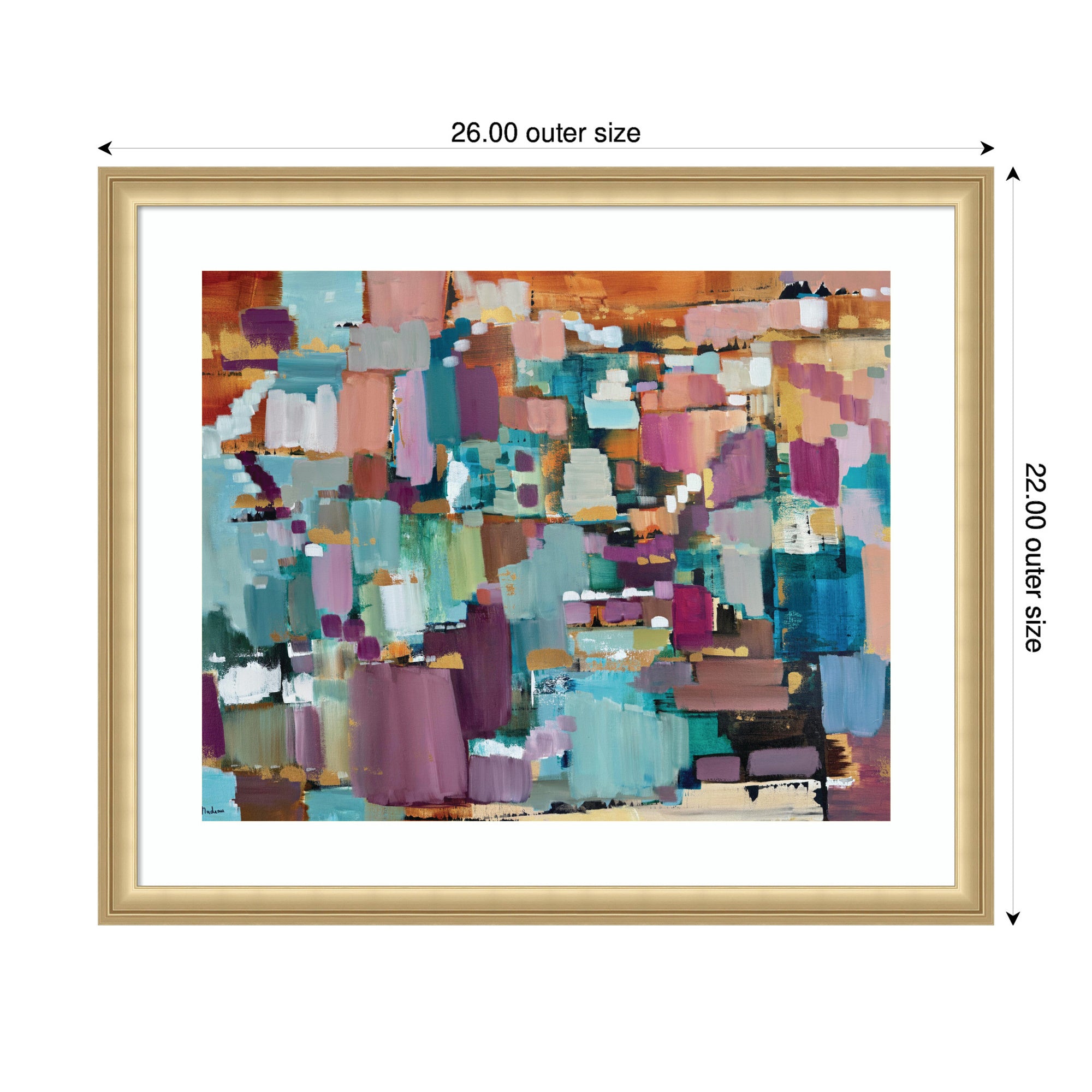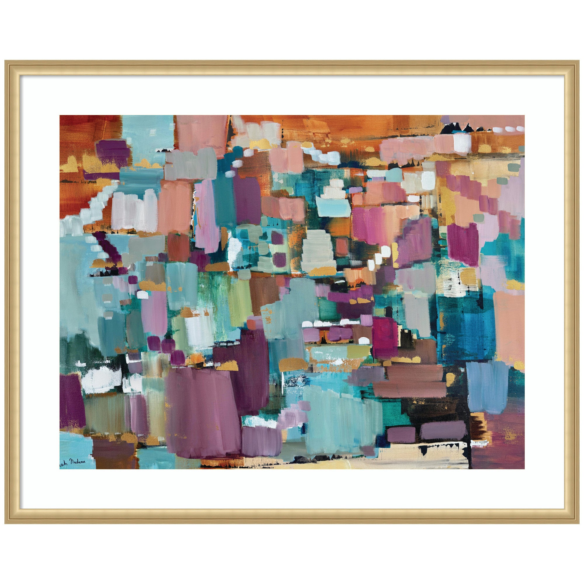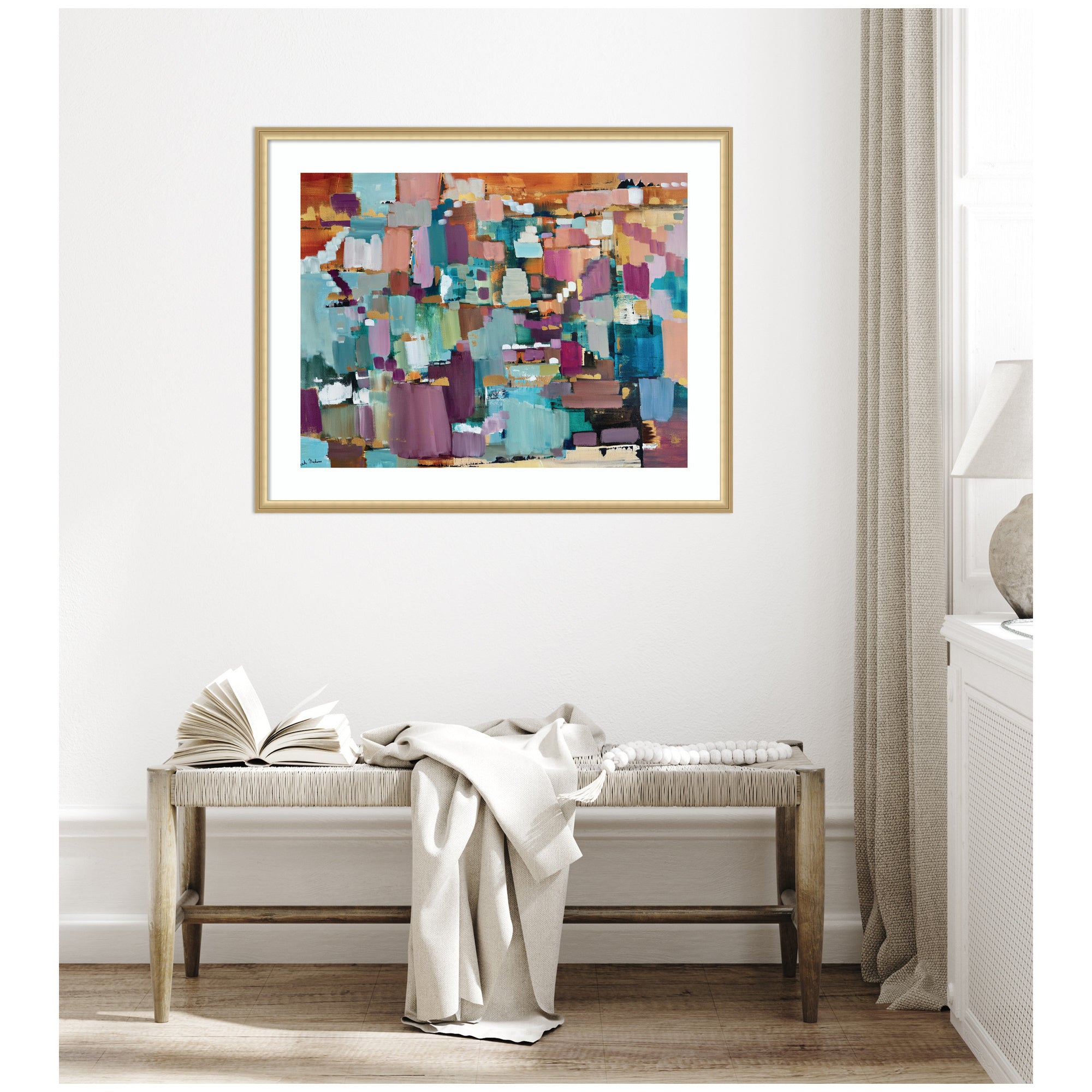 Elevate your space through thoughtfully curated style with this stunning piece designed by independent artist Leah Nadeau and beautifully framed by hand in Madison, WI. The image is giclee printed using fade-resistant inks, ensuring every detail comes to life in rich, lasting color. Set in designer moulding, its a Modern Contemporary accent crafted to make a statement. Visual Story: This artwork features a vibrant and colorful abstract painting with geometric shapes. The composition includes a variety of hues such as turquoise, pink, purple, and orange, creating a dynamic and textured look. The piece exudes a modern and contemporary feel with its expressive and layered elements on canvas.
