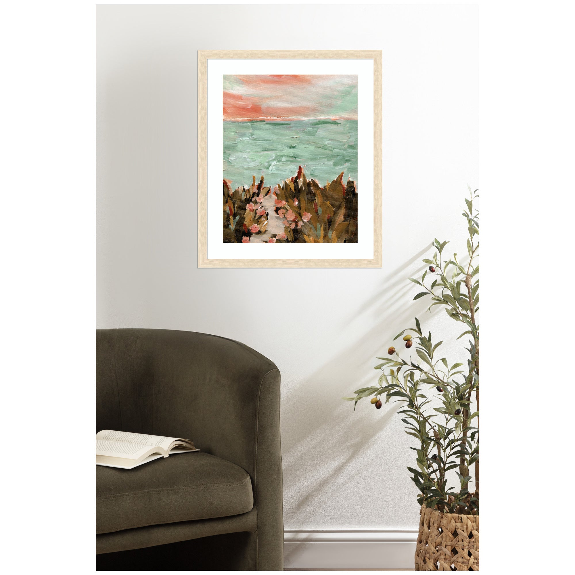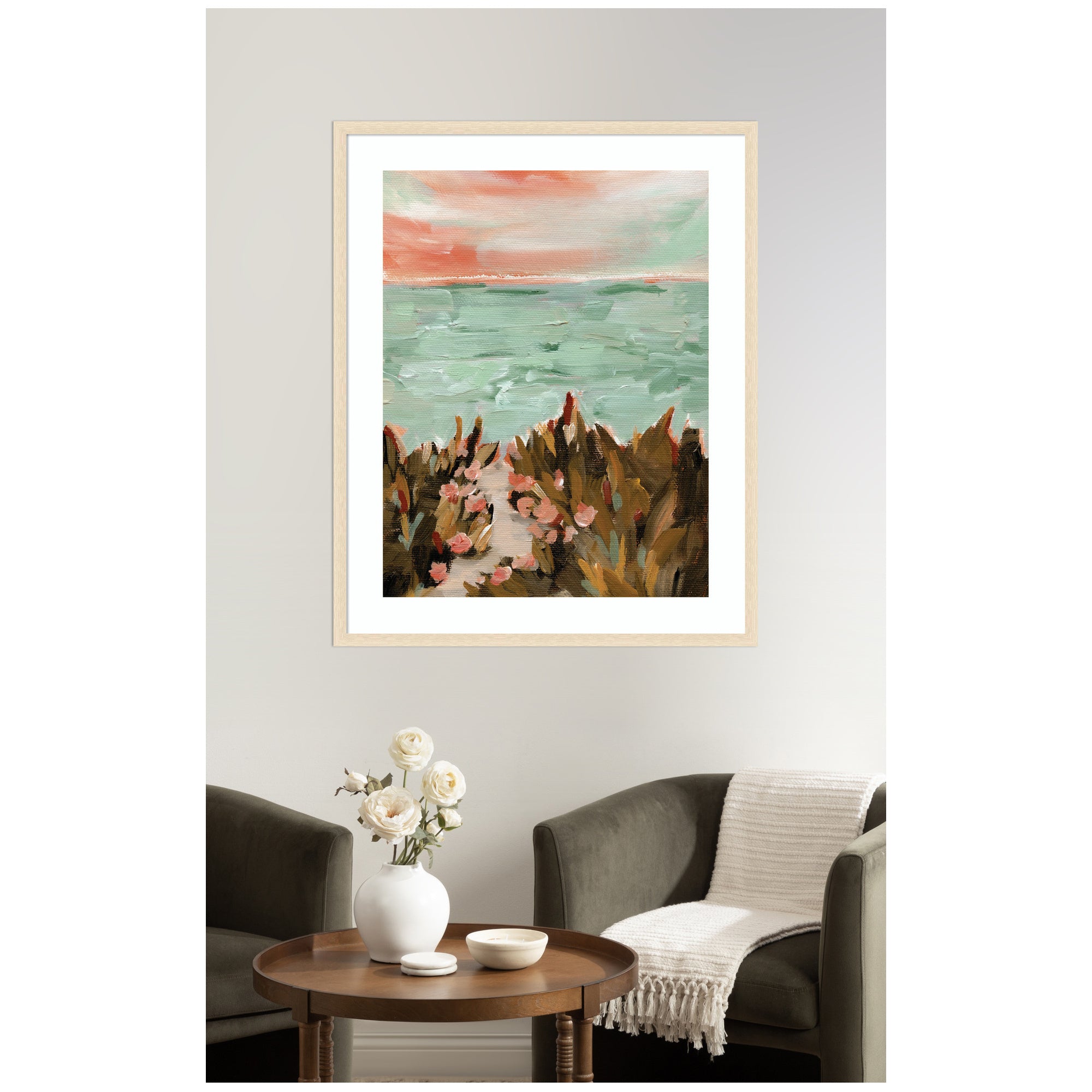 Elevate your space through thoughtfully curated style with this stunning piece designed by independent artist Annie Quigley and beautifully framed by hand in Madison, WI. The image is giclee printed using fade-resistant inks, ensuring every detail comes to life in rich, lasting color. Set in designer moulding, its a Coastal accent crafted to make a statement. Visual Story: This artwork showcases a serene seaside view at sunset. The horizon features a calming, soft pastel gradient sky above a tranquil ocean. In the foreground, a sandy path is flanked by lush green vegetation and delicate pink flowers, leading towards the tranquil seascape.