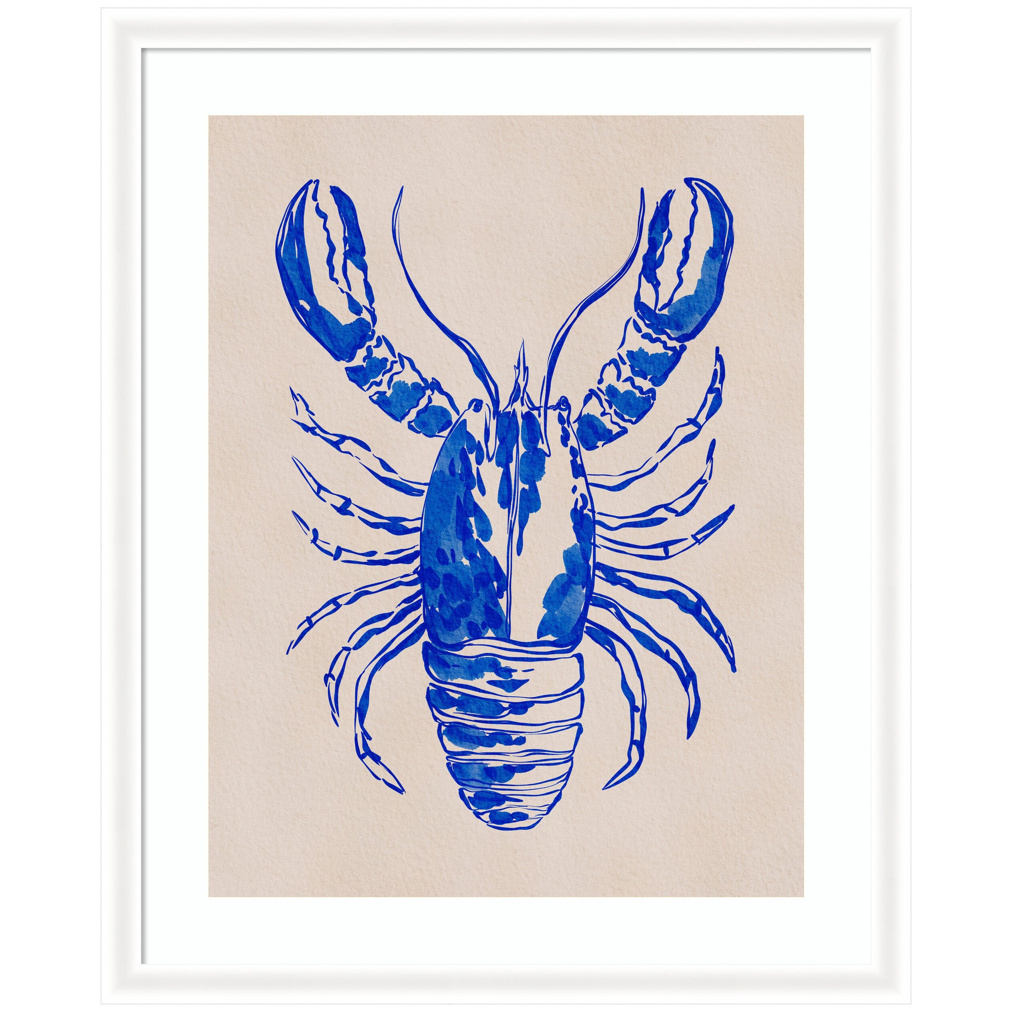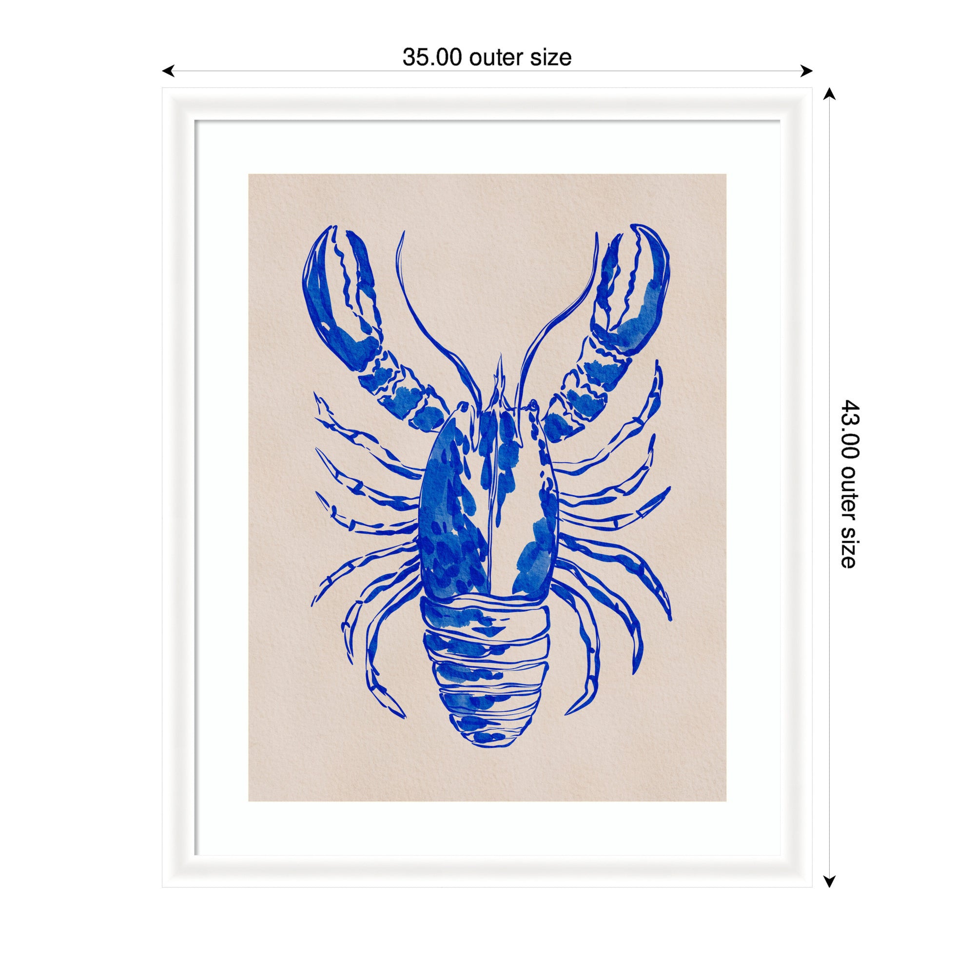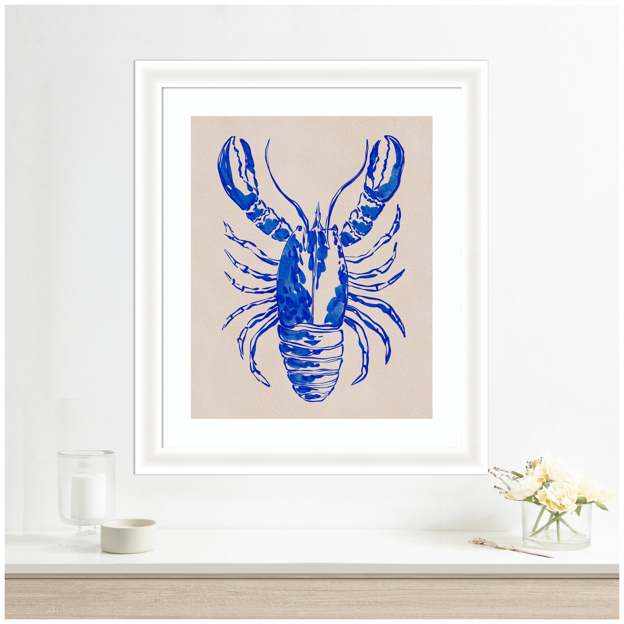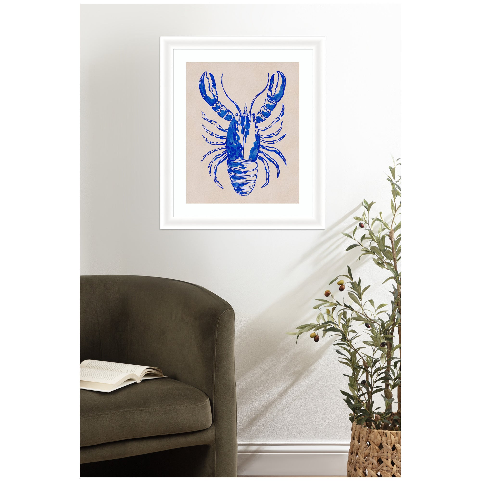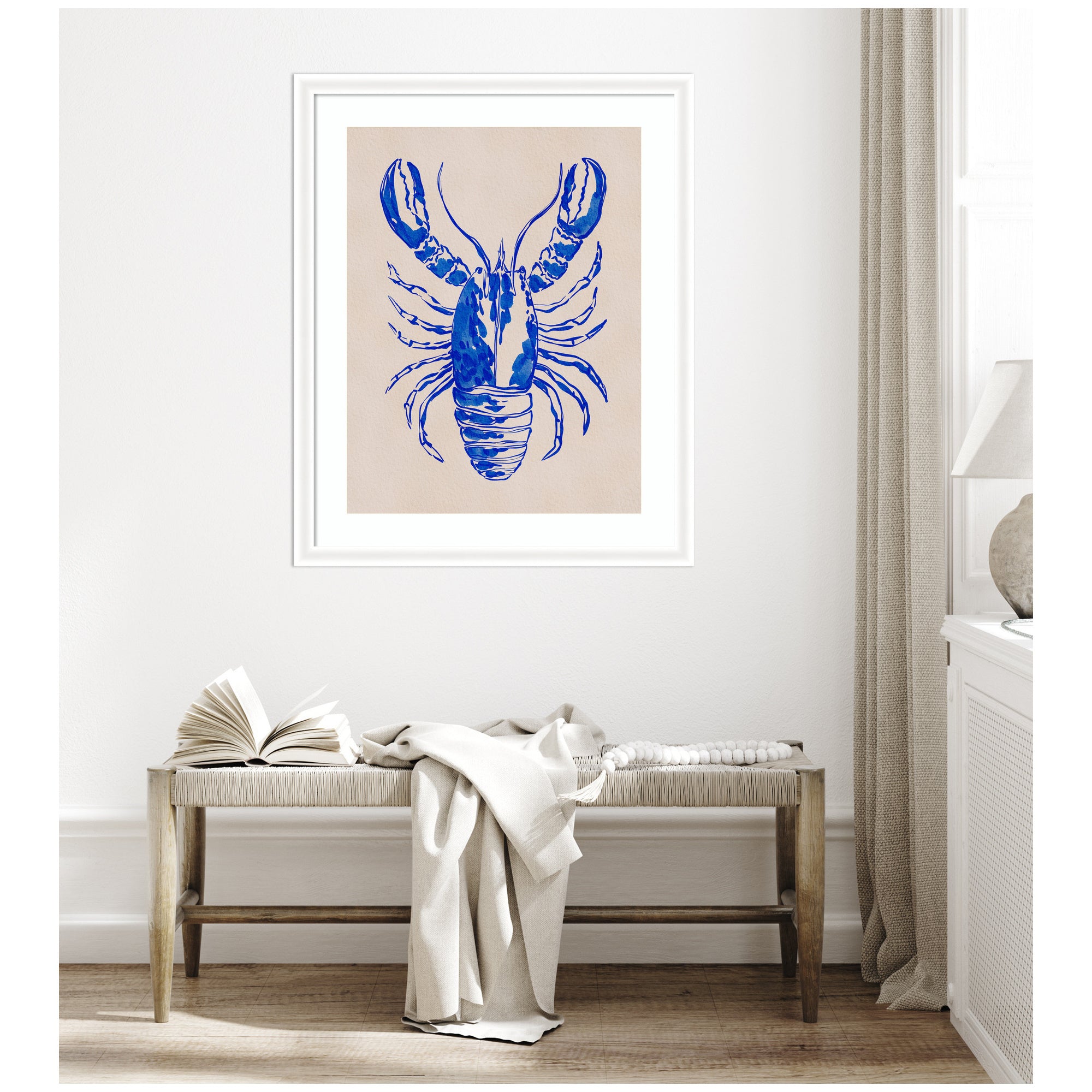 Elevate your space through thoughtfully curated style with this stunning piece designed by independent artist Nikita Jariwala and beautifully framed by hand in Madison, WI. The image is giclee printed using fade-resistant inks, ensuring every detail comes to life in rich, lasting color. Set in designer moulding, its a Coastal accent crafted to make a statement. Visual Story: This artwork features a striking blue lobster illustrated in a silhouette style, set against a neutral background. The use of watercolor adds a textured and fluid appearance to the lobster's form. The piece combines elements of minimalism and marine life, creating a visually appealing and stylish design.
