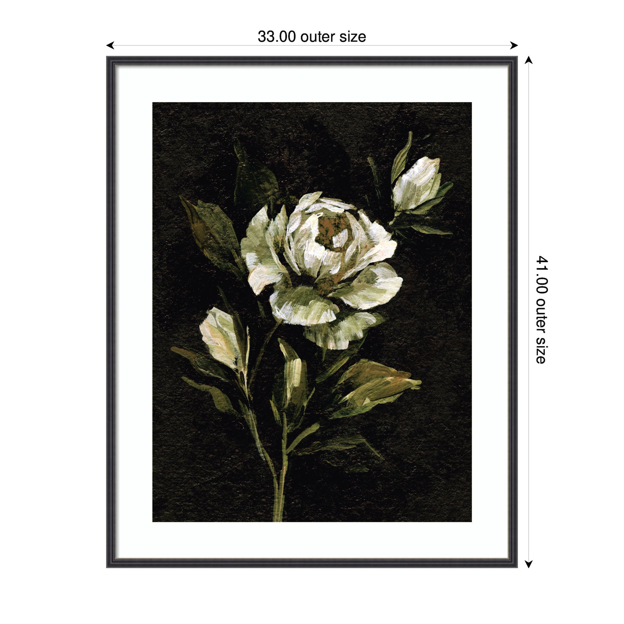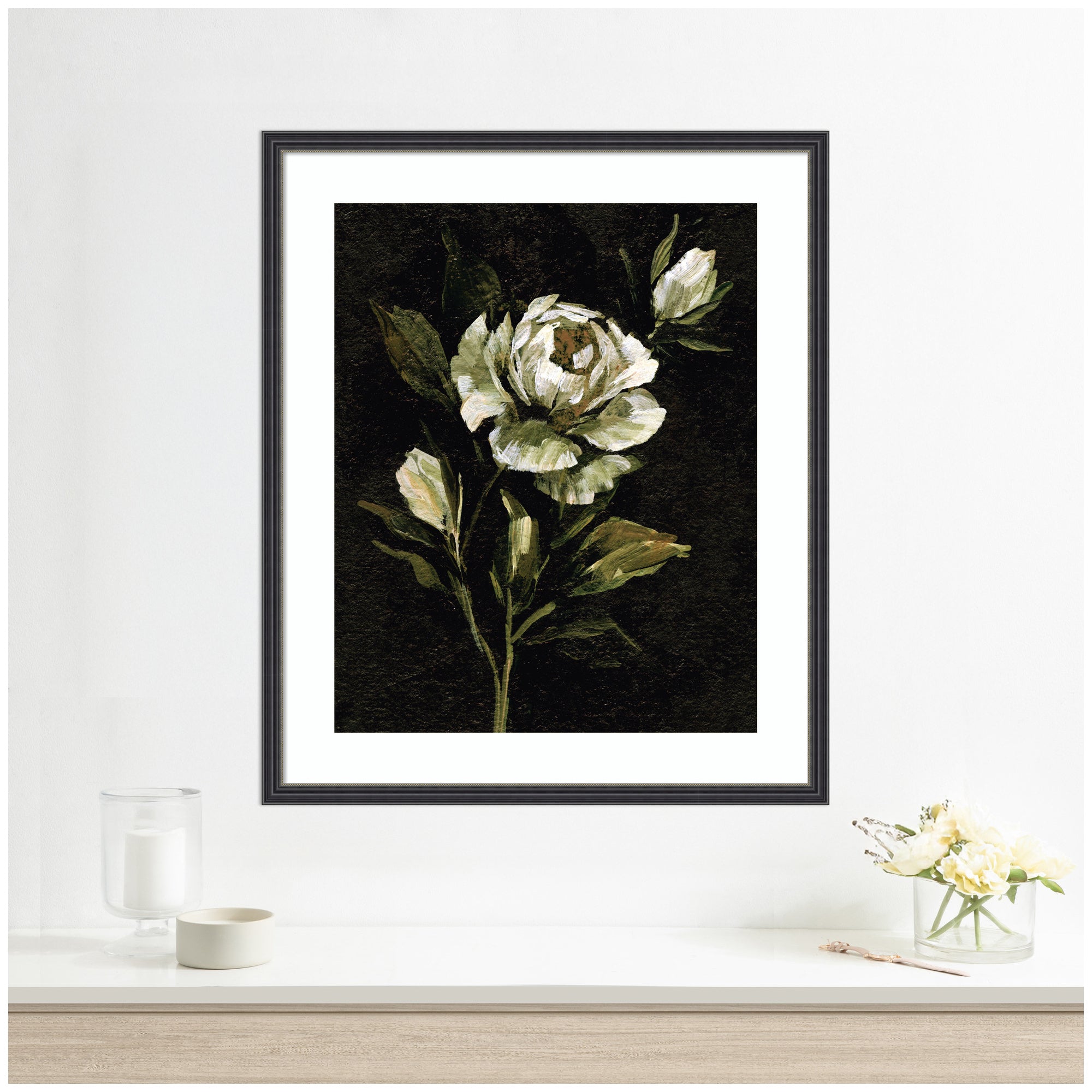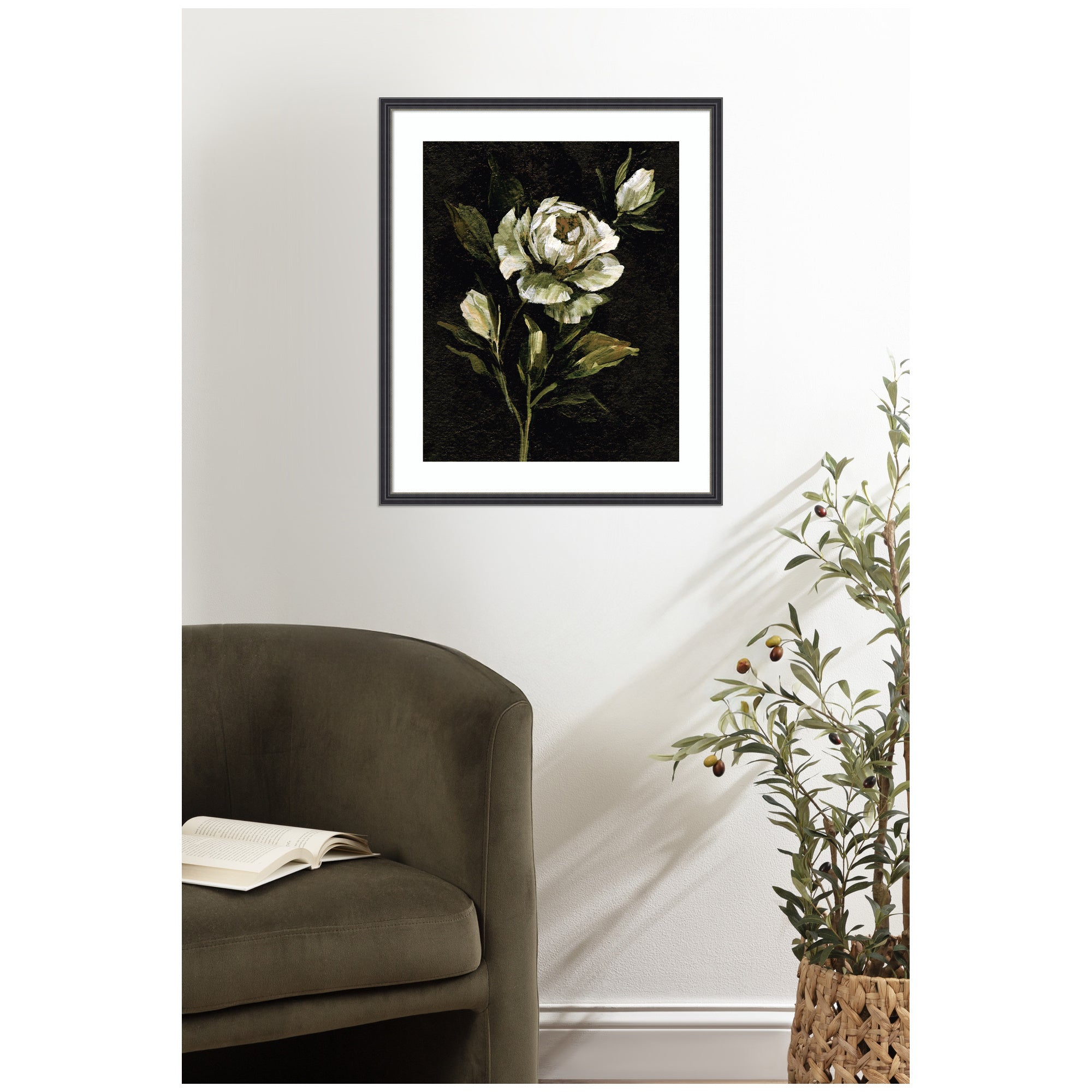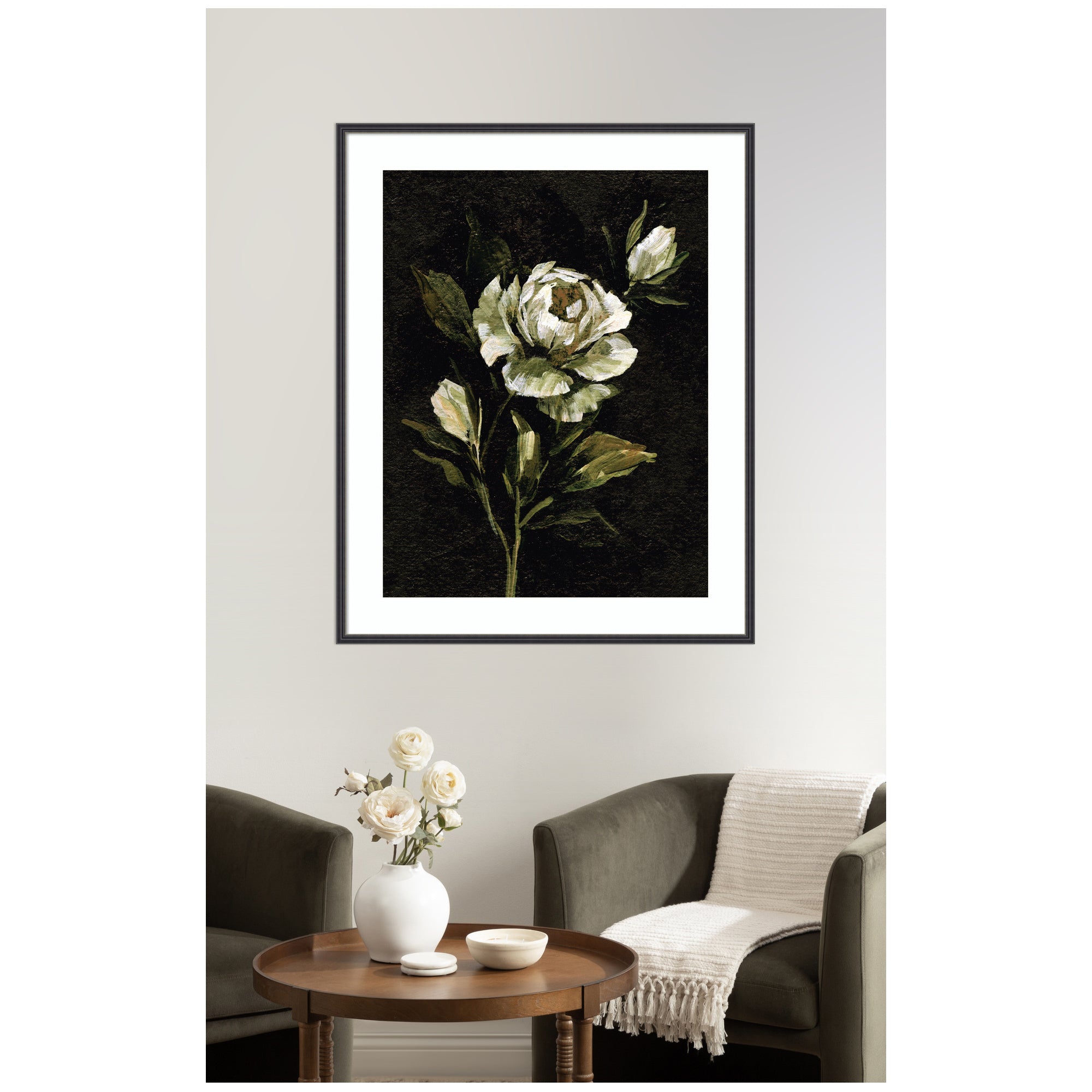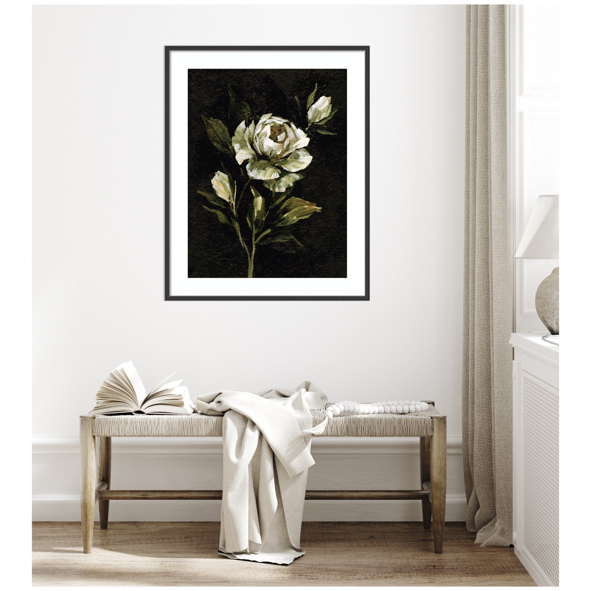 - Authentic Artist Collaboration: 'Moody Floral 2' is an officially licensed work by independent artist Annie Quigley, thoughtfully presented in our Stylish Black Narrow molding. The finished piece measures 21 x 25, offering a sophisticated statement for your space. Visual Story: The image depicts a delicate flower with light, textured petals against a dark background. The contrasting colors emphasize the elegance and intricate details of the botanical subject. Leaves in various shades of green surround the bloom, adding depth to the artwork. Annie Quigley's Artist Profile: Pennsylvania fine artist celebrated for vintage-inspired florals rendered in bold, joyful color across stationery, textiles and wall art.