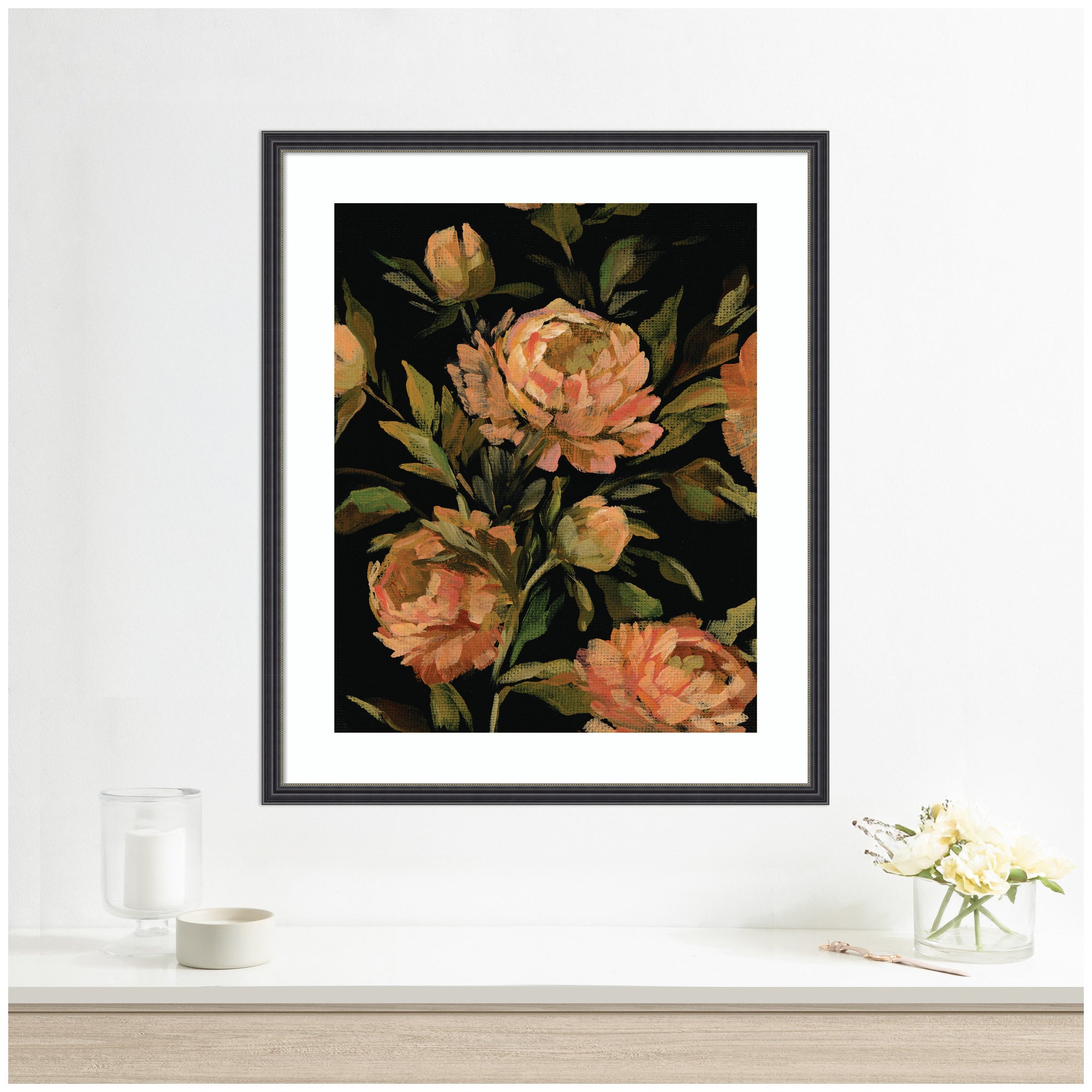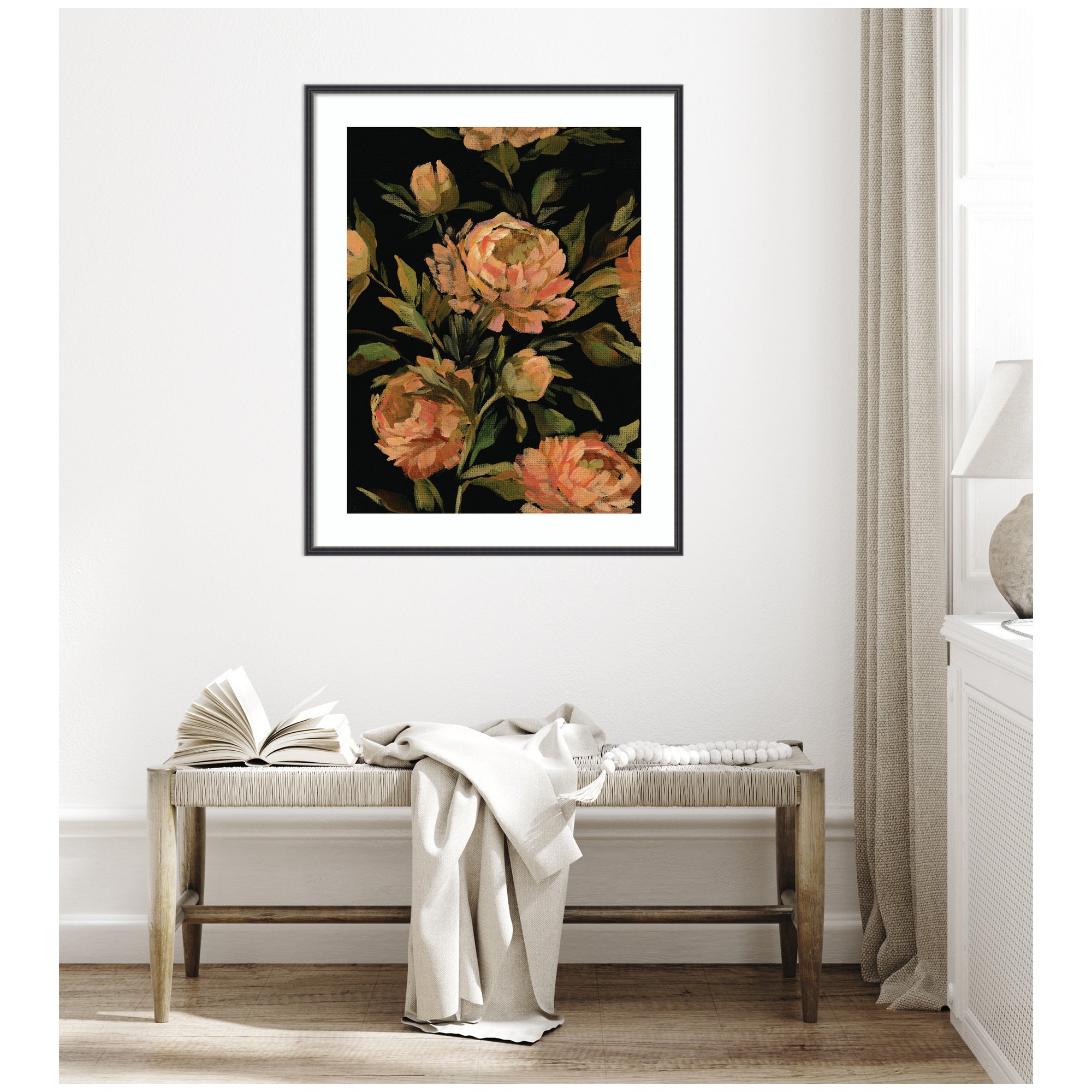 Elevate your space through thoughtfully curated style with this stunning piece designed by independent artist Annie Quigley and beautifully framed by hand in Madison, WI. The image is giclee printed using fade-resistant inks, ensuring every detail comes to life in rich, lasting color. Set in designer moulding, its a Vintage accent crafted to make a statement. Visual Story: The artwork features a collection of beautifully painted peonies with rich, warm tones against a dark background. The brushstrokes add a textured depth to the flowers, highlighting their delicate petals and lush green leaves. This elegant composition offers a vintage charm, making it a captivating piece for any space.