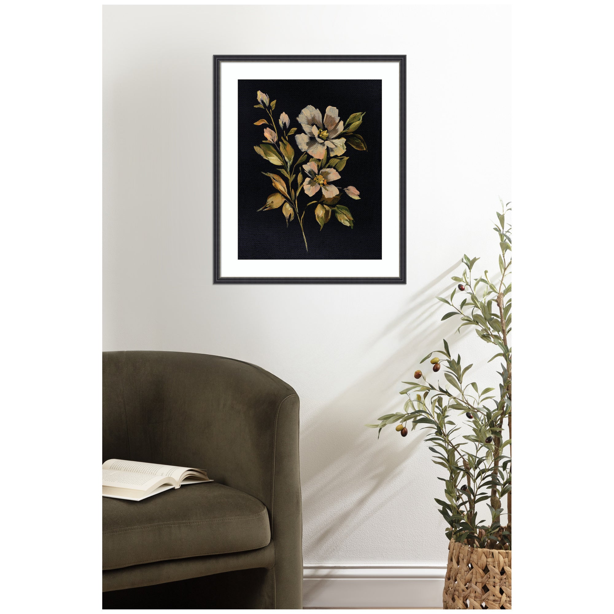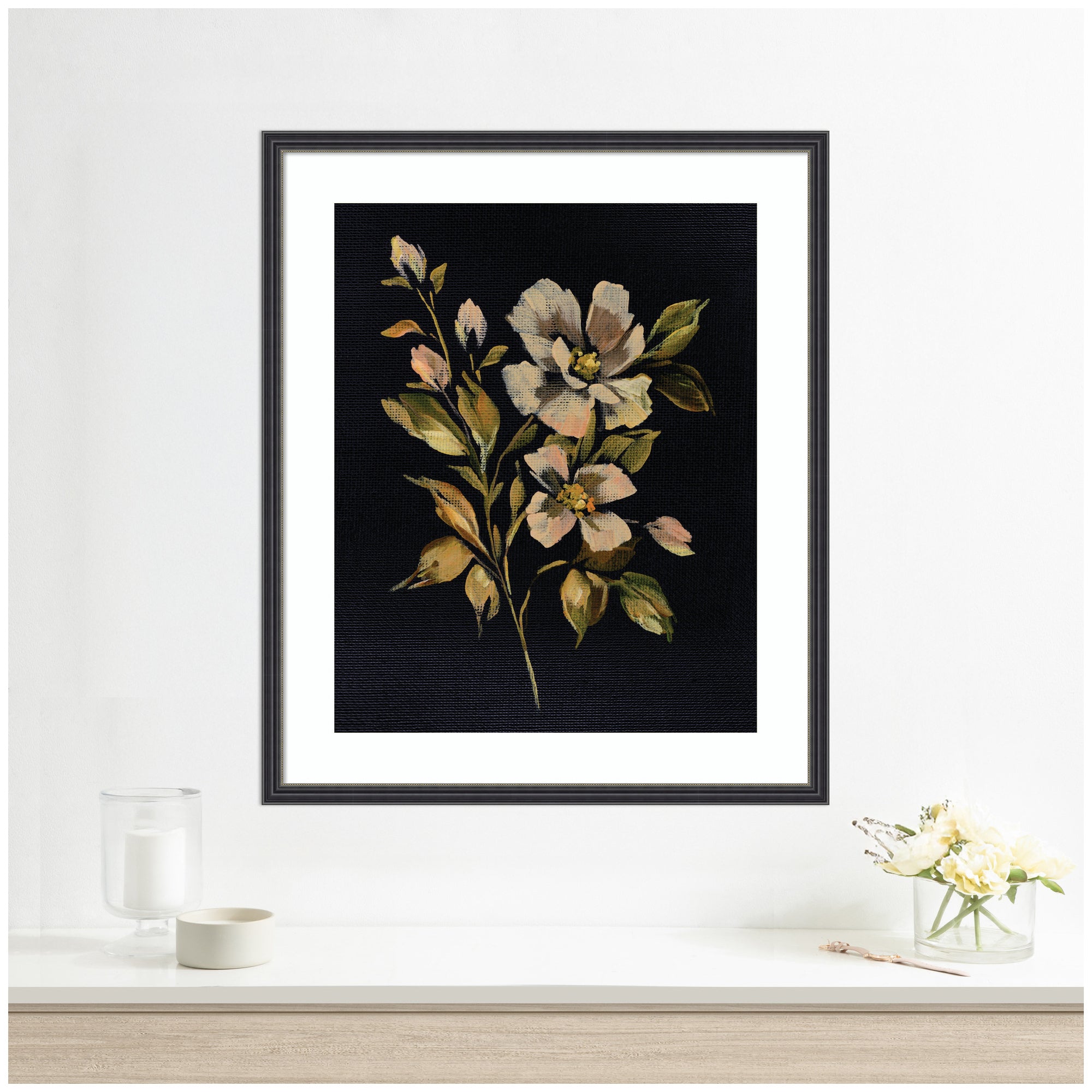 Elevate your space through thoughtfully curated style with this stunning piece designed by independent artist Annie Quigley and beautifully framed by hand in Madison, WI. The image is giclee printed using fade-resistant inks, ensuring every detail comes to life in rich, lasting color. Set in designer moulding, its a Vintage accent crafted to make a statement. Visual Story: This artwork features a delicate arrangement of flowers with soft, muted colors set against a dark background. The intricate details and natural hues give it a vintage and elegant feel. The composition captures the beauty and simplicity of blooming flowers in a timeless style.