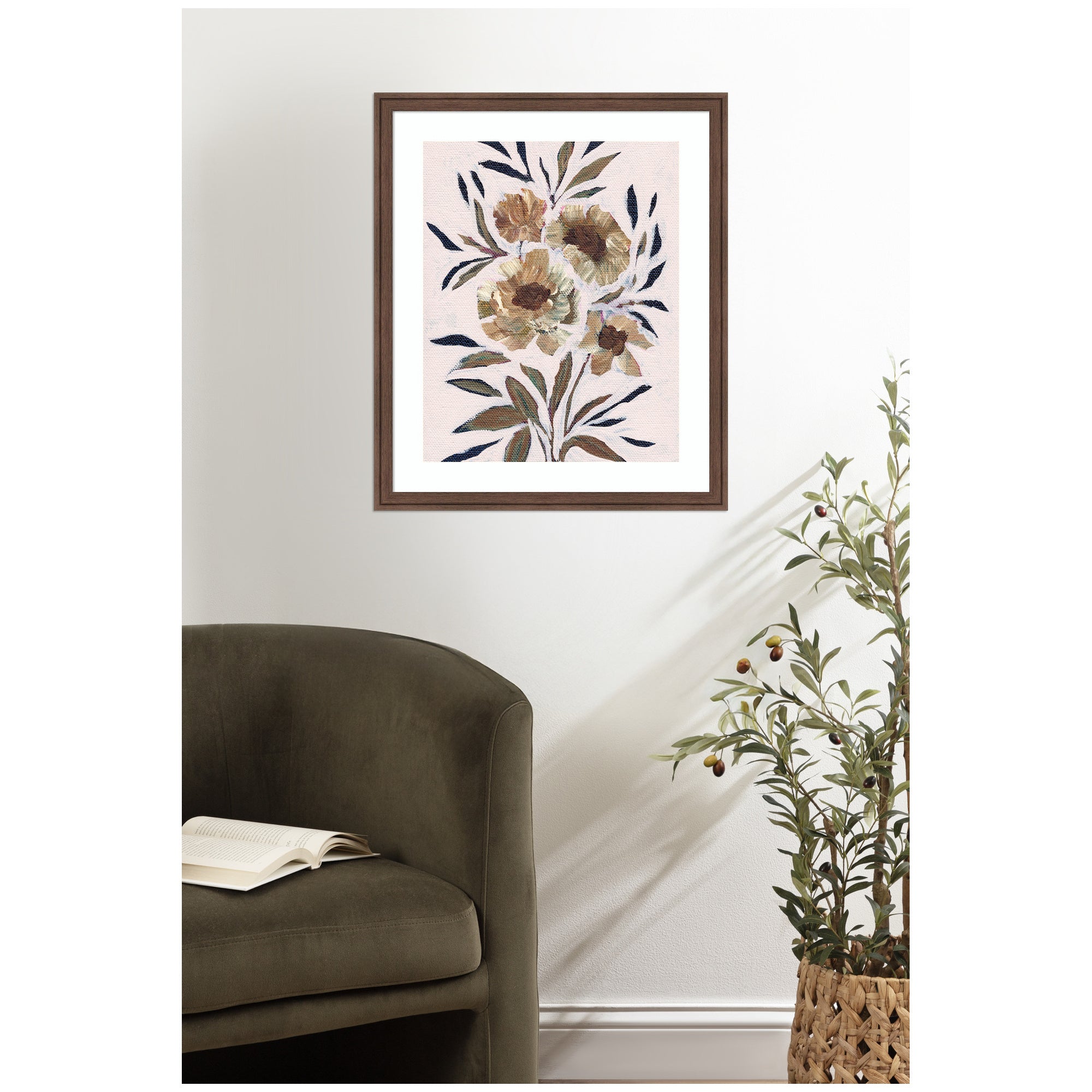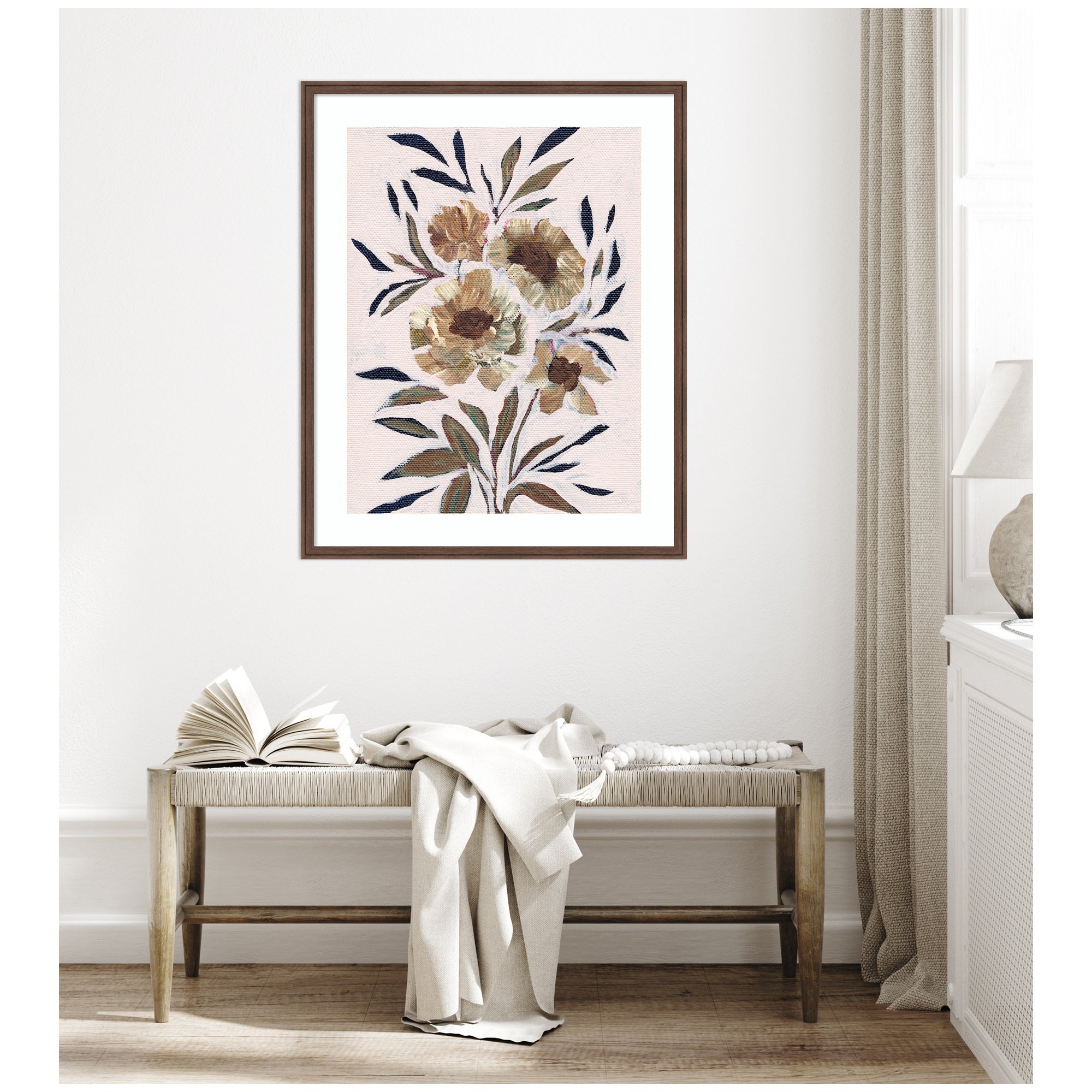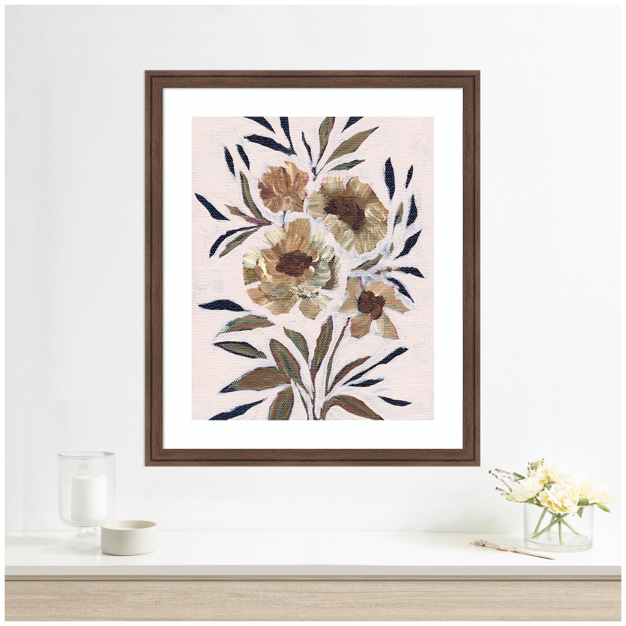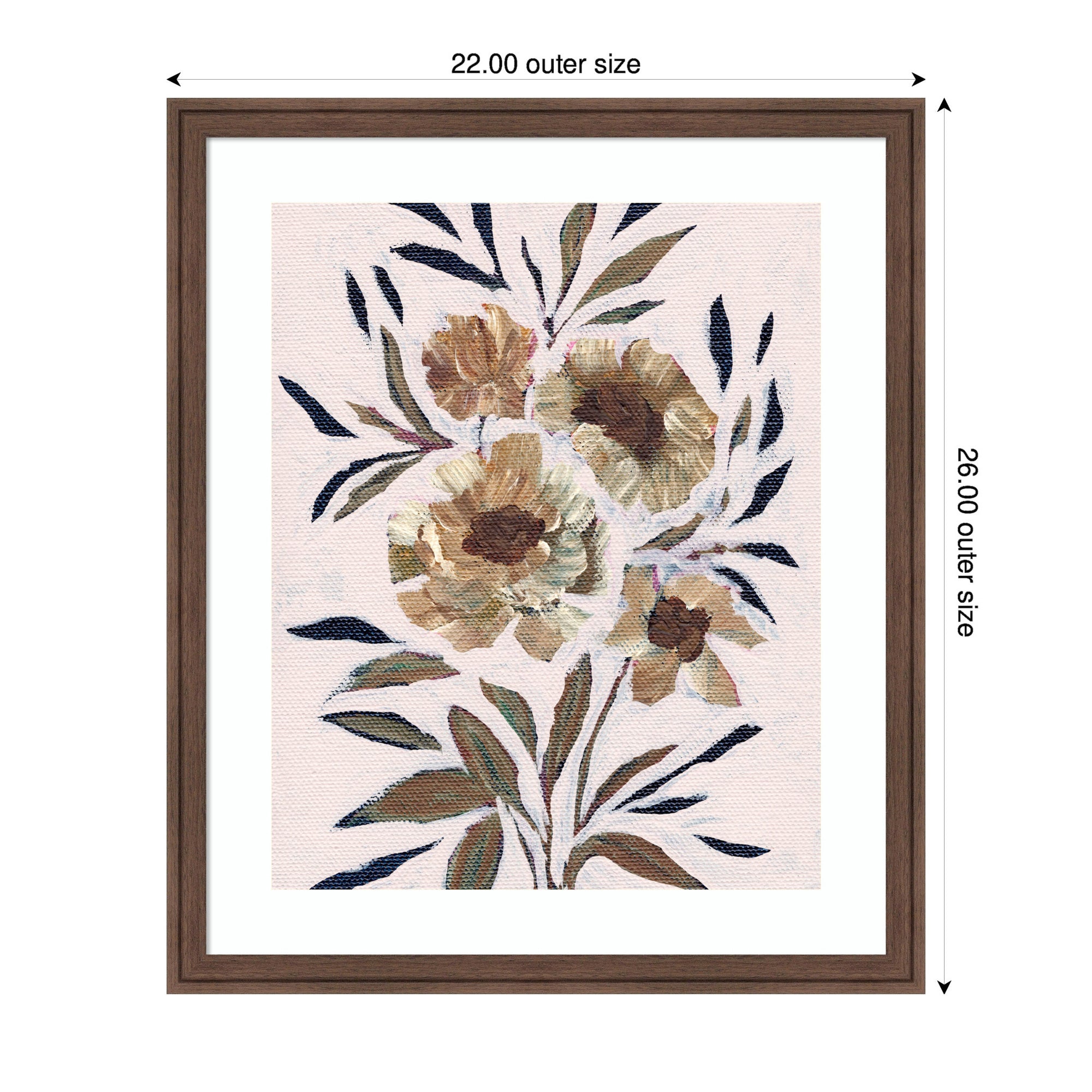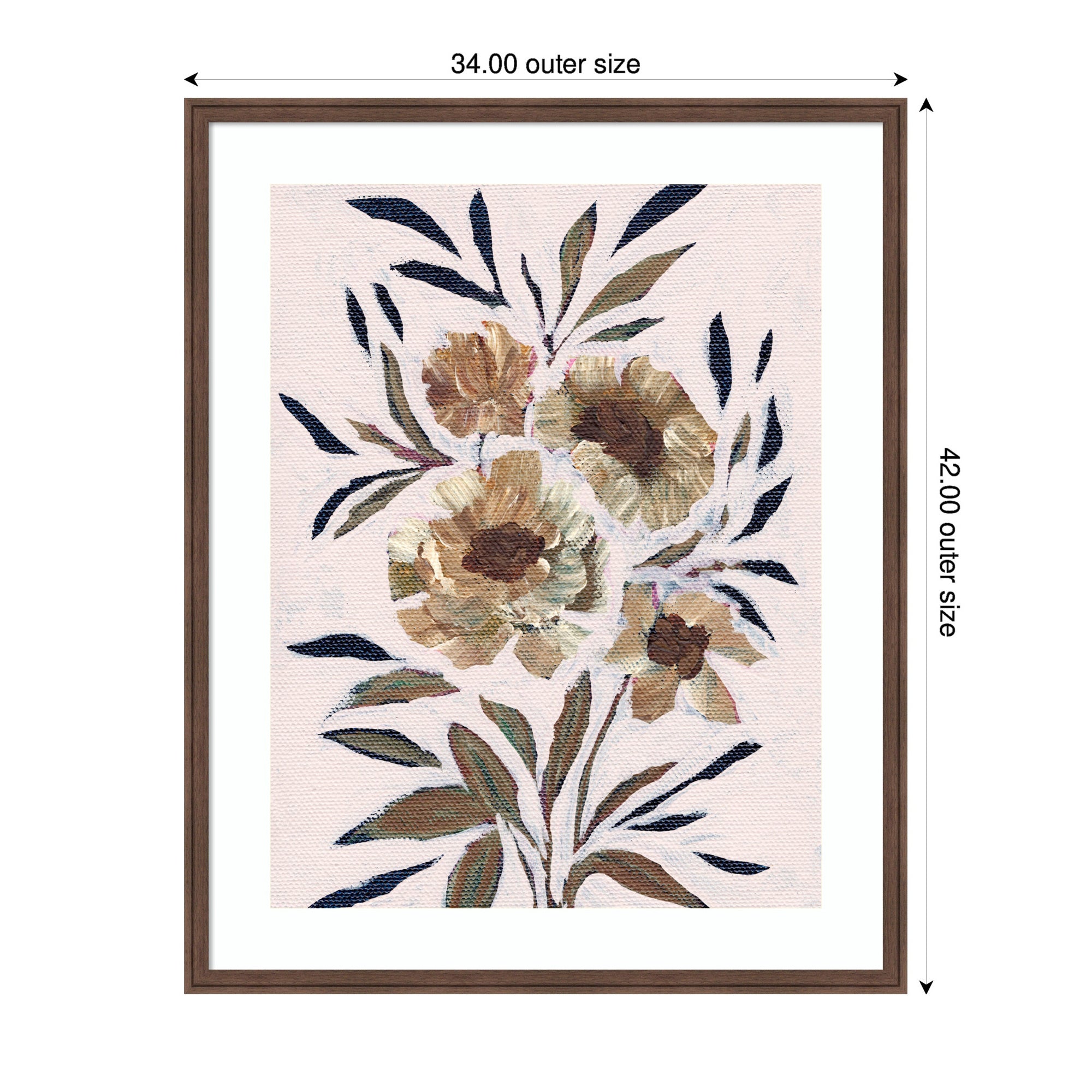 Elevate your space through thoughtfully curated style with this stunning piece designed by independent artist Nikita Jariwala and beautifully framed by hand in Madison, WI. The image is giclee printed using fade-resistant inks, ensuring every detail comes to life in rich, lasting color. Set in designer moulding, its a Rustic Farmhouse accent crafted to make a statement. Visual Story: This artwork features a cluster of abstract flowers with large petals and accompanying leaves. The color palette is composed of earthy tones, giving the painting a rustic and elegant feel. The brushstrokes add a textured and dynamic quality to the canvas.