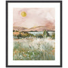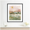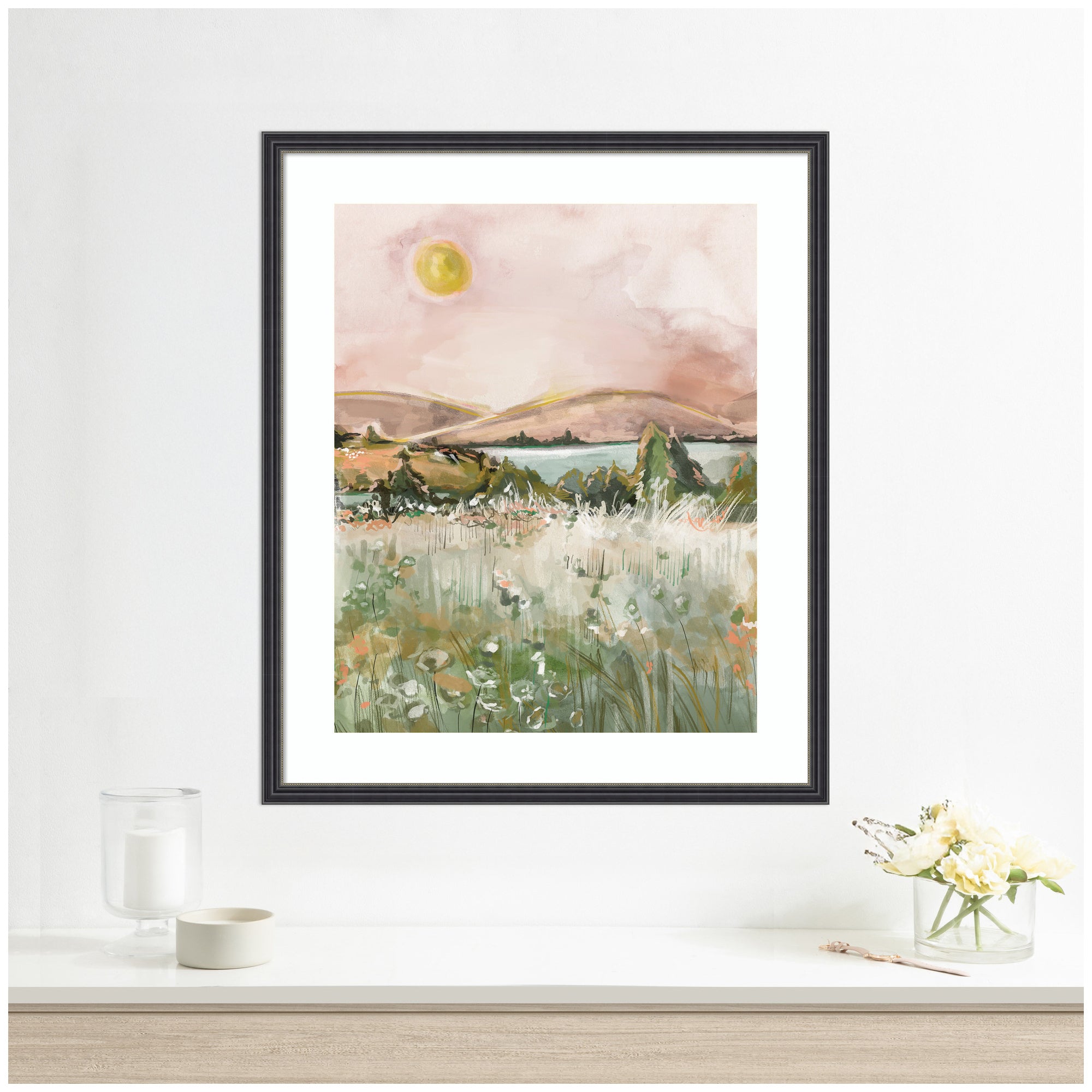 Elevate your space through thoughtfully curated style with this stunning piece designed by independent artist Annie Quigley and beautifully framed by hand in Madison, WI. The image is giclee printed using fade-resistant inks, ensuring every detail comes to life in rich, lasting color. Set in designer moulding, its a Rustic Farmhouse accent crafted to make a statement. Visual Story: The artwork depicts a serene landscape with rolling hills, a tranquil lake, and vibrant meadows filled with delicate flowers. The sun is low in the sky, casting a warm glow over the scene. The watercolor technique adds a soft and dreamy quality to the painting.