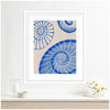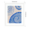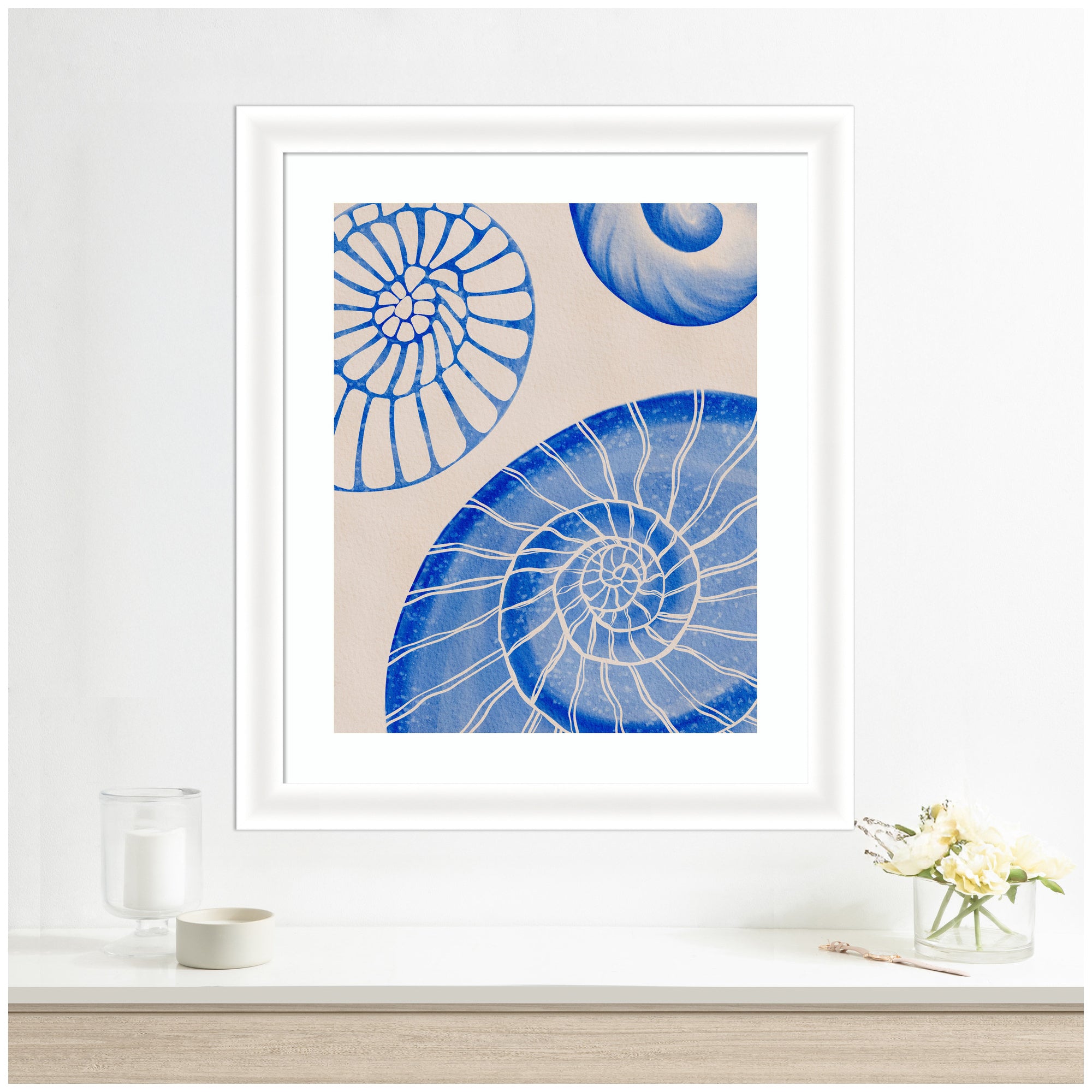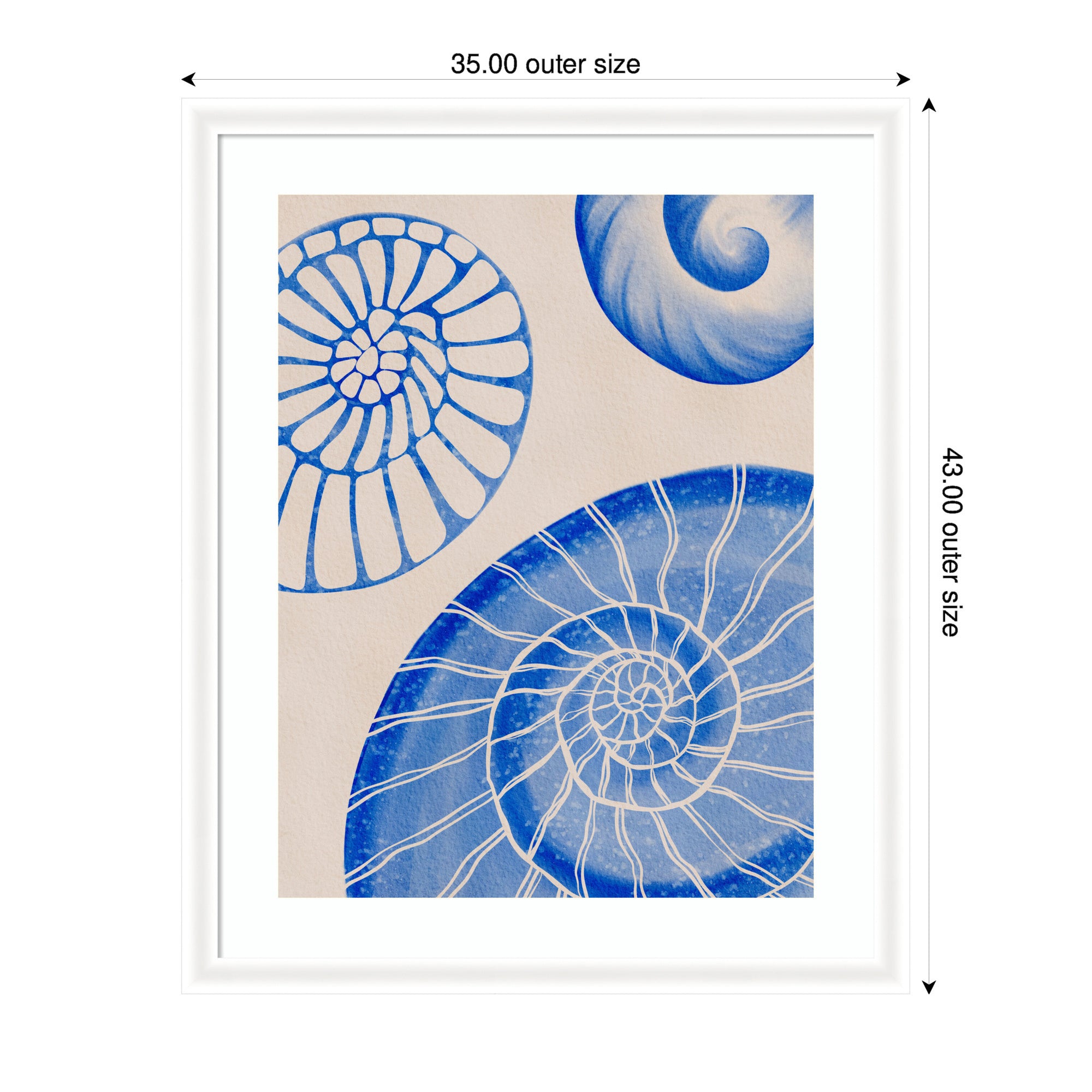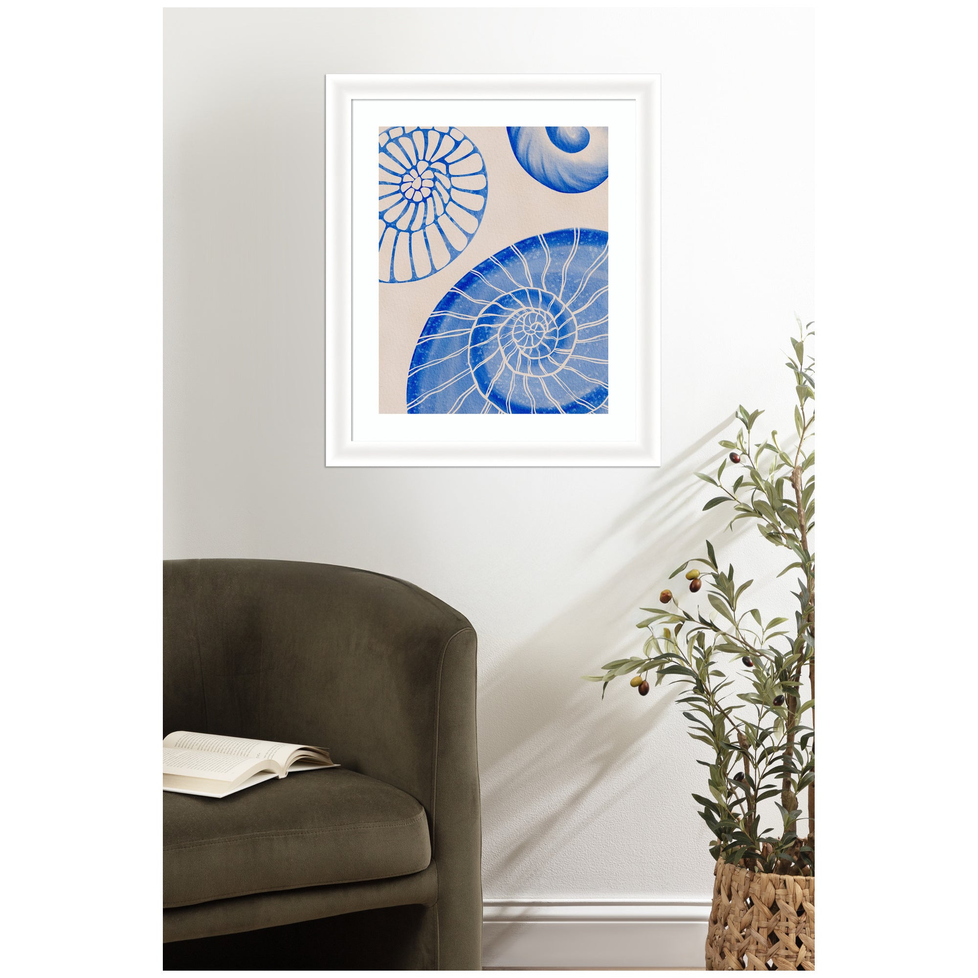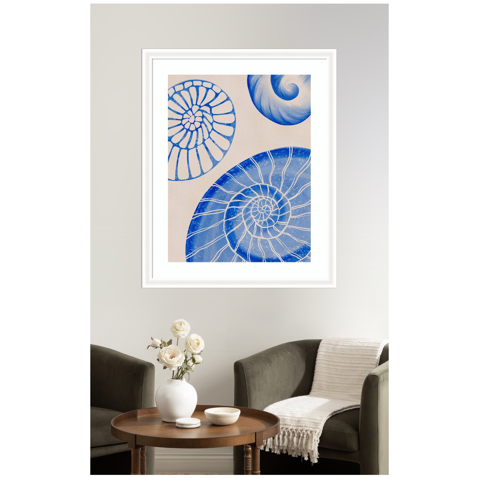 Elevate your space through thoughtfully curated style with this stunning piece designed by independent artist Nikita Jariwala and beautifully framed by hand in Madison, WI. The image is giclee printed using fade-resistant inks, ensuring every detail comes to life in rich, lasting color. Set in designer moulding, its a Coastal accent crafted to make a statement. Visual Story: This artwork features an abstract representation of nautilus shells with swirling, intricate designs. Rendered in shades of blue, the shells create a calming oceanic theme. The textured watercolor effect adds depth and elegance to the composition.