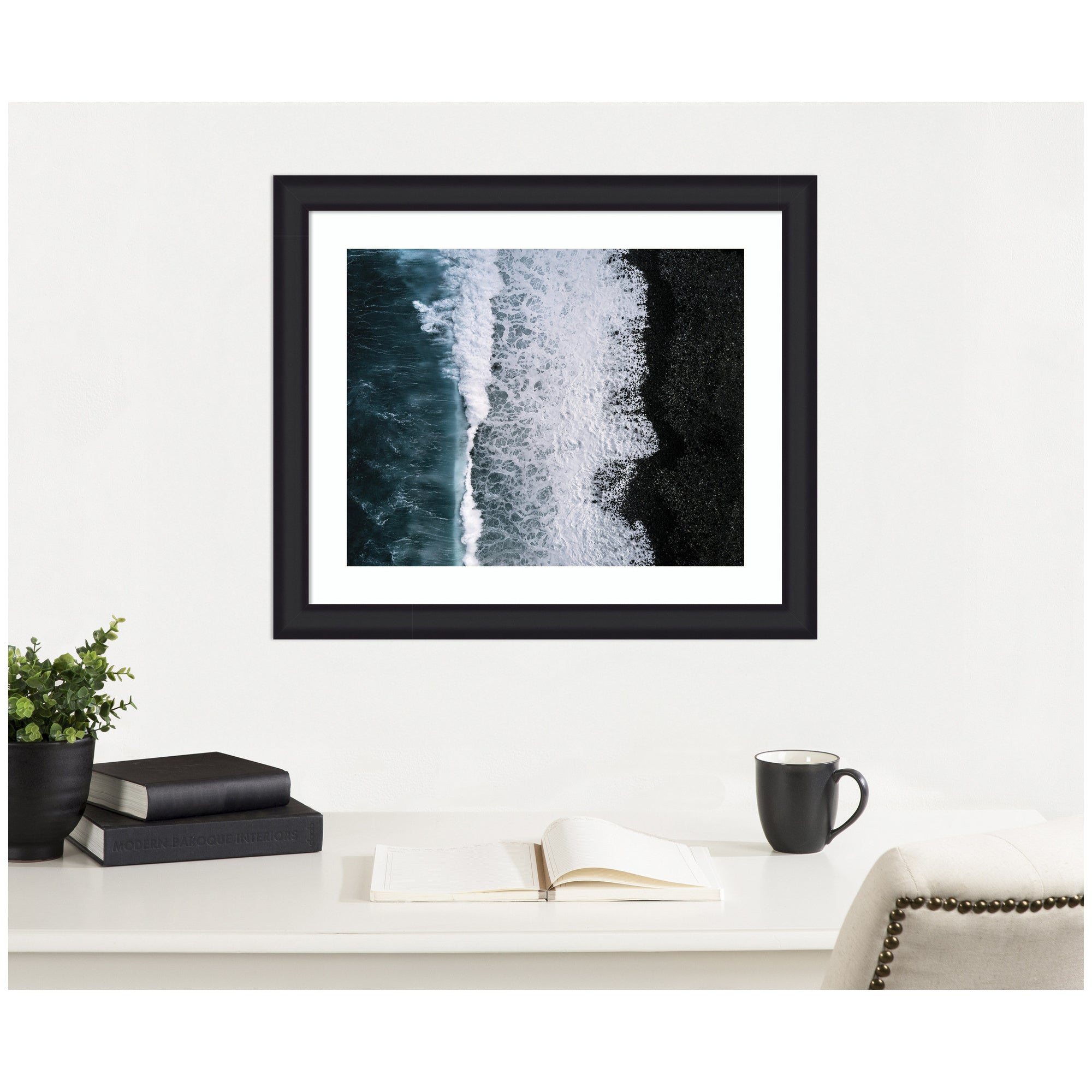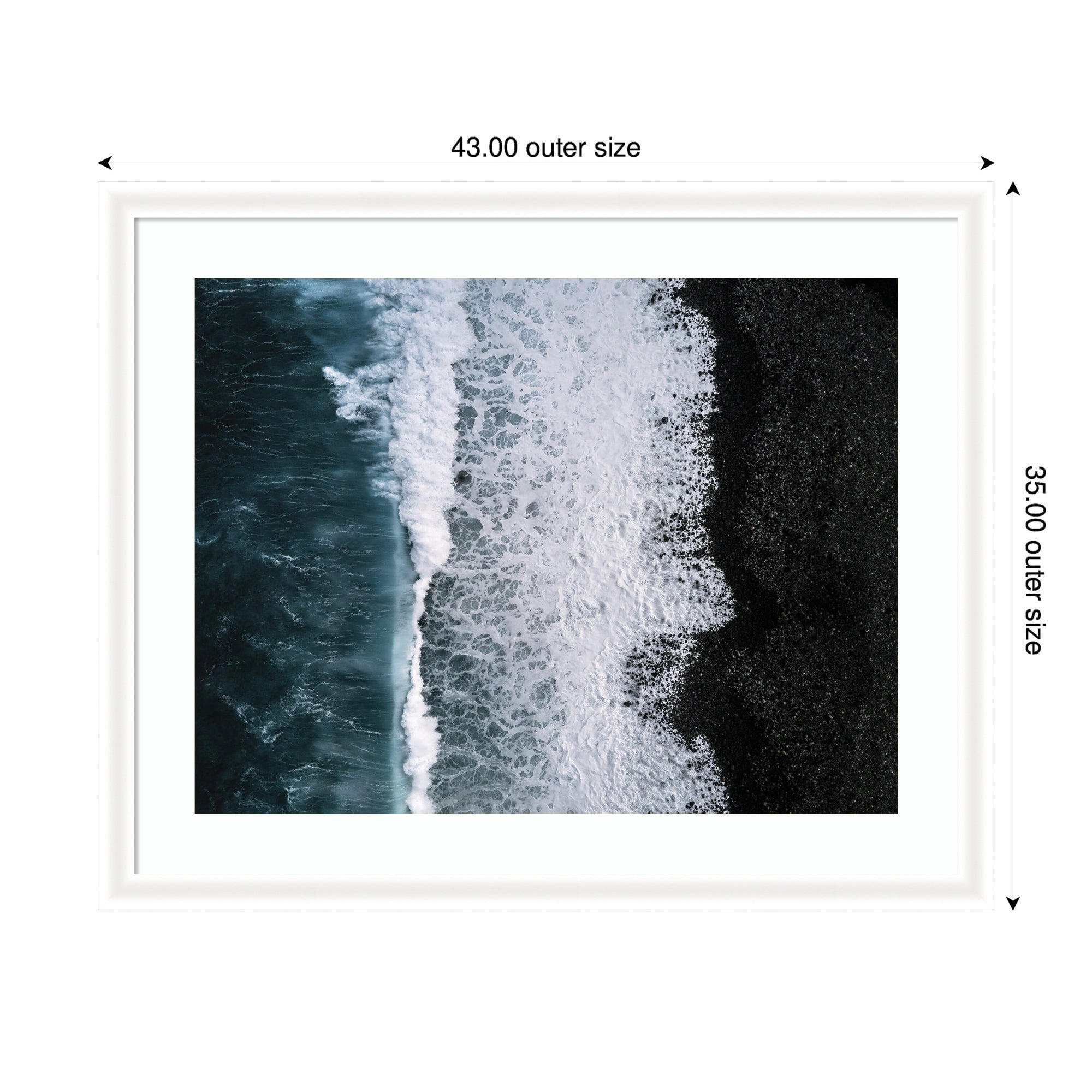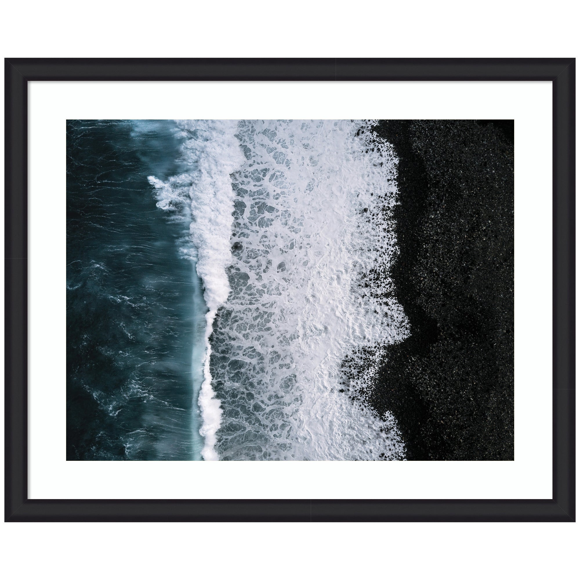 - Authentic Artist Collaboration: 'Ocean Waves on the Black Beach in Iceland' is an officially licensed work by independent artist Michael Schauer, thoughtfully presented in our Oliver White Narrow molding. The finished piece measures 27 x 23, offering a sophisticated statement for your space. Visual Story: This artwork features an aerial view of ocean waves crashing against a black pebble beach. The image captures the striking contrast between the deep blue water and the dark shoreline, with white foam creating intricate patterns. The composition highlights the natural textures and dynamic movement of the sea. Michael Schauer's Artist Profile: Munich-based fine-art photographer celebrated for minimal, moody landscapes built on strong leading lines.
