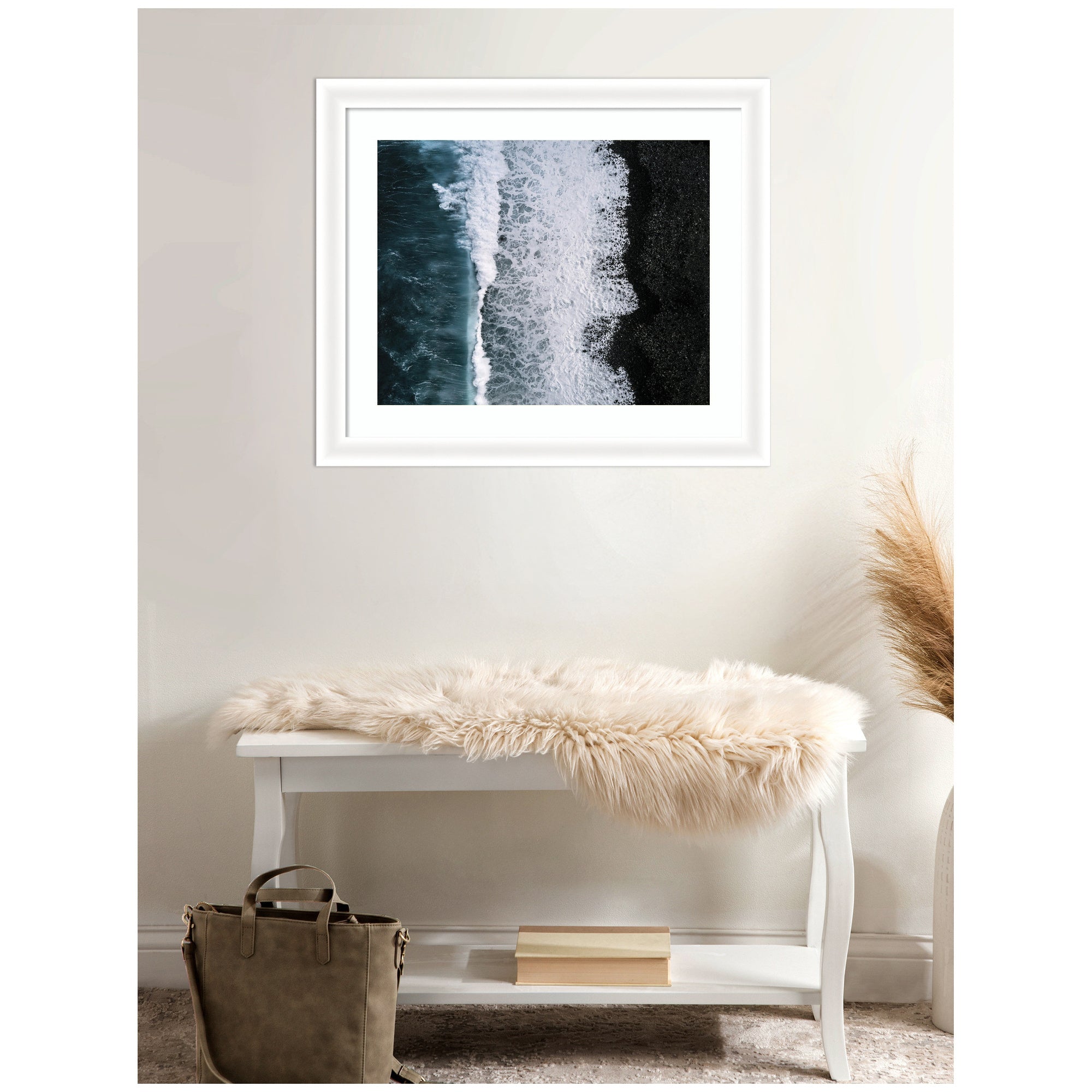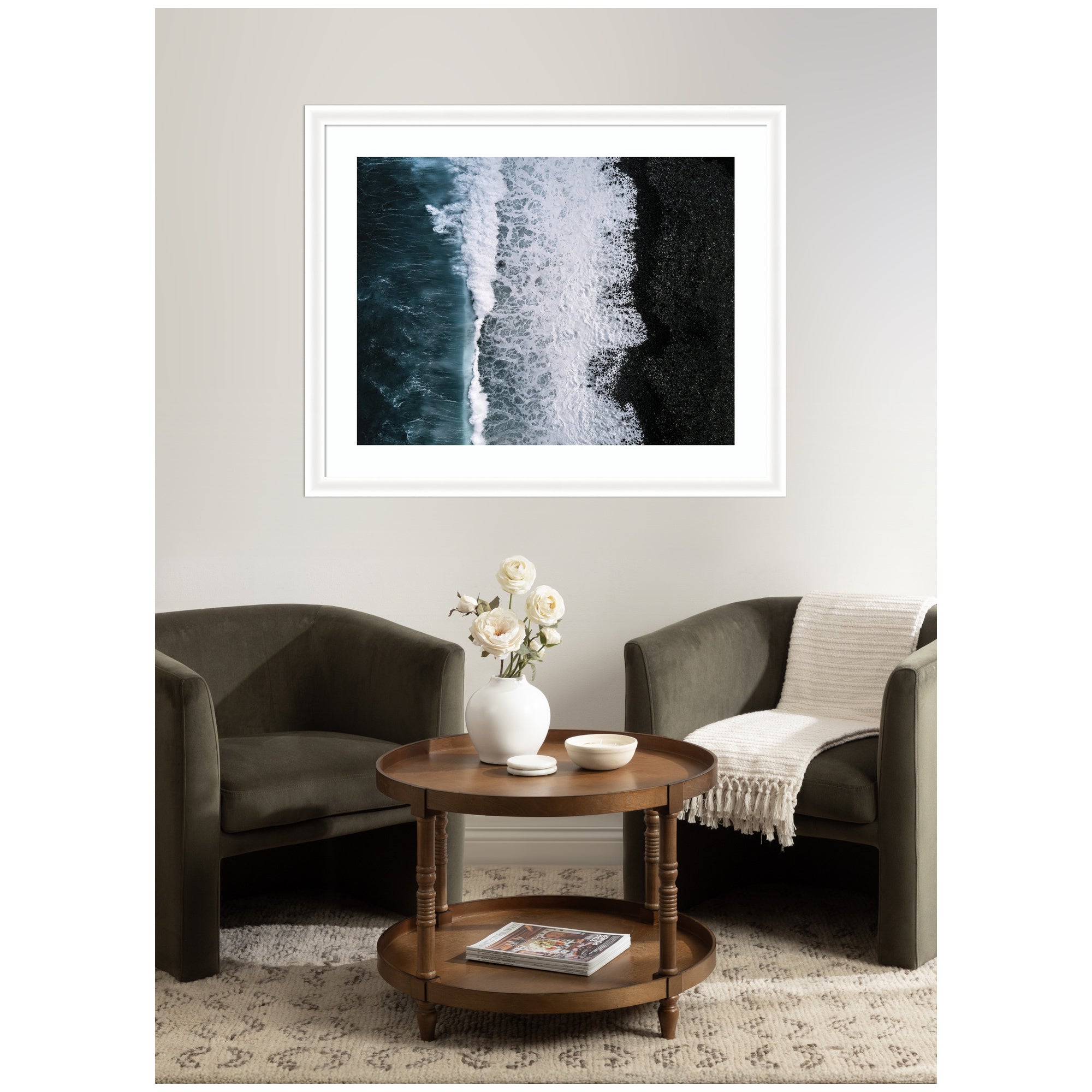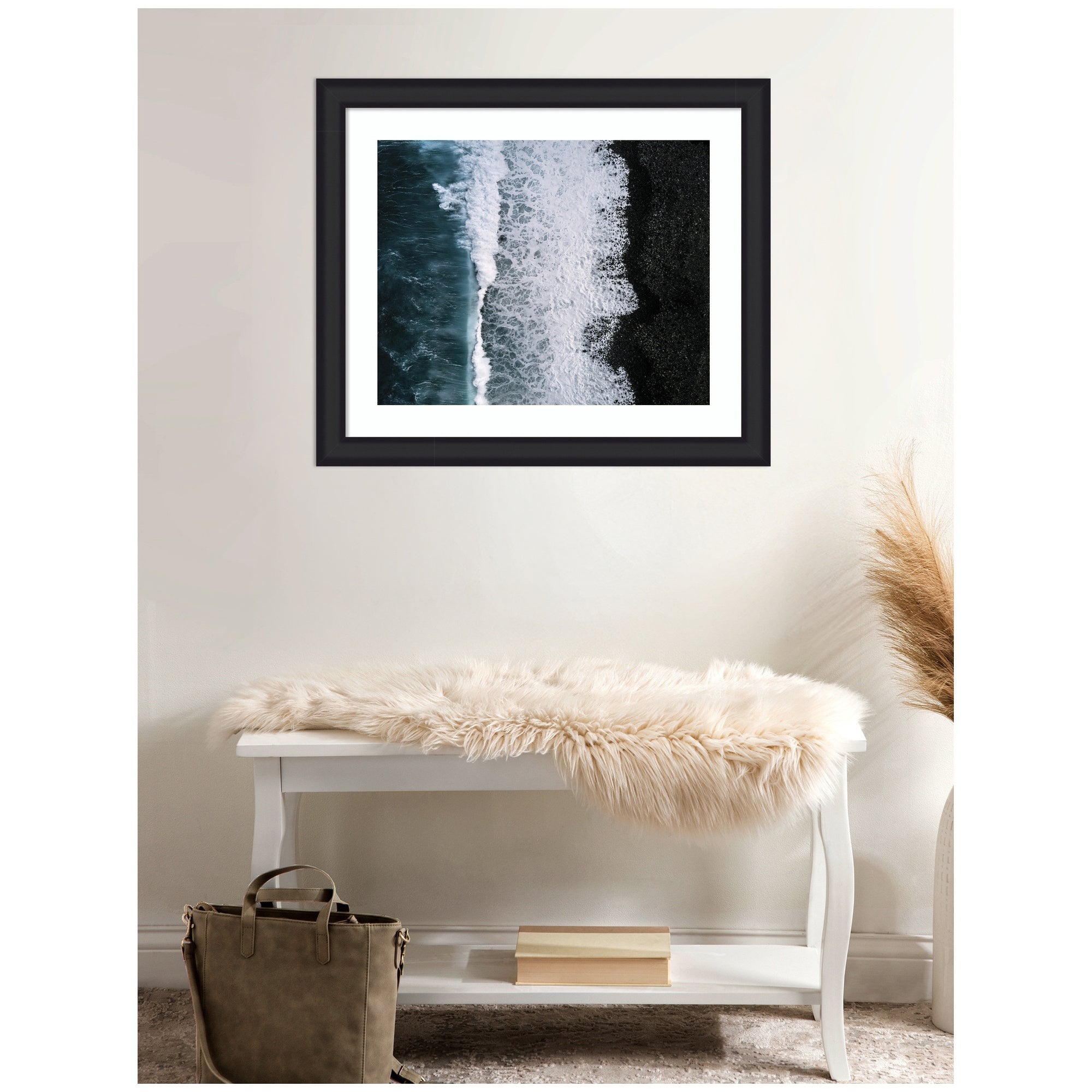 - Authentic Artist Collaboration: 'Ocean Waves on the Black Beach in Iceland' is an officially licensed work by independent artist Michael Schauer, thoughtfully presented in our Oliver White Narrow molding. The finished piece measures 27 x 23, offering a sophisticated statement for your space. Visual Story: This artwork features an aerial view of ocean waves crashing against a black pebble beach. The image captures the striking contrast between the deep blue water and the dark shoreline, with white foam creating intricate patterns. The composition highlights the natural textures and dynamic movement of the sea. Michael Schauer's Artist Profile: Munich-based fine-art photographer celebrated for minimal, moody landscapes built on strong leading lines.