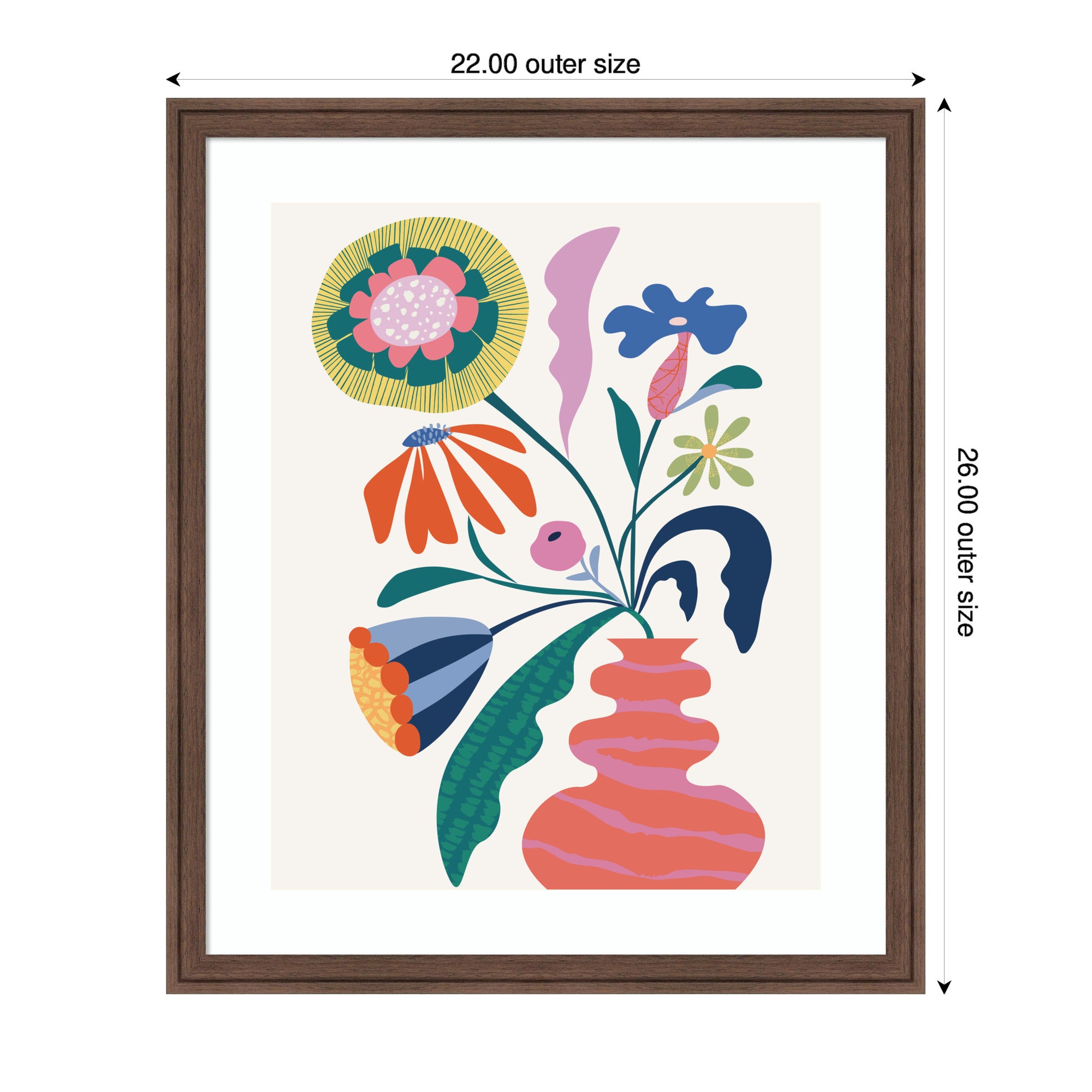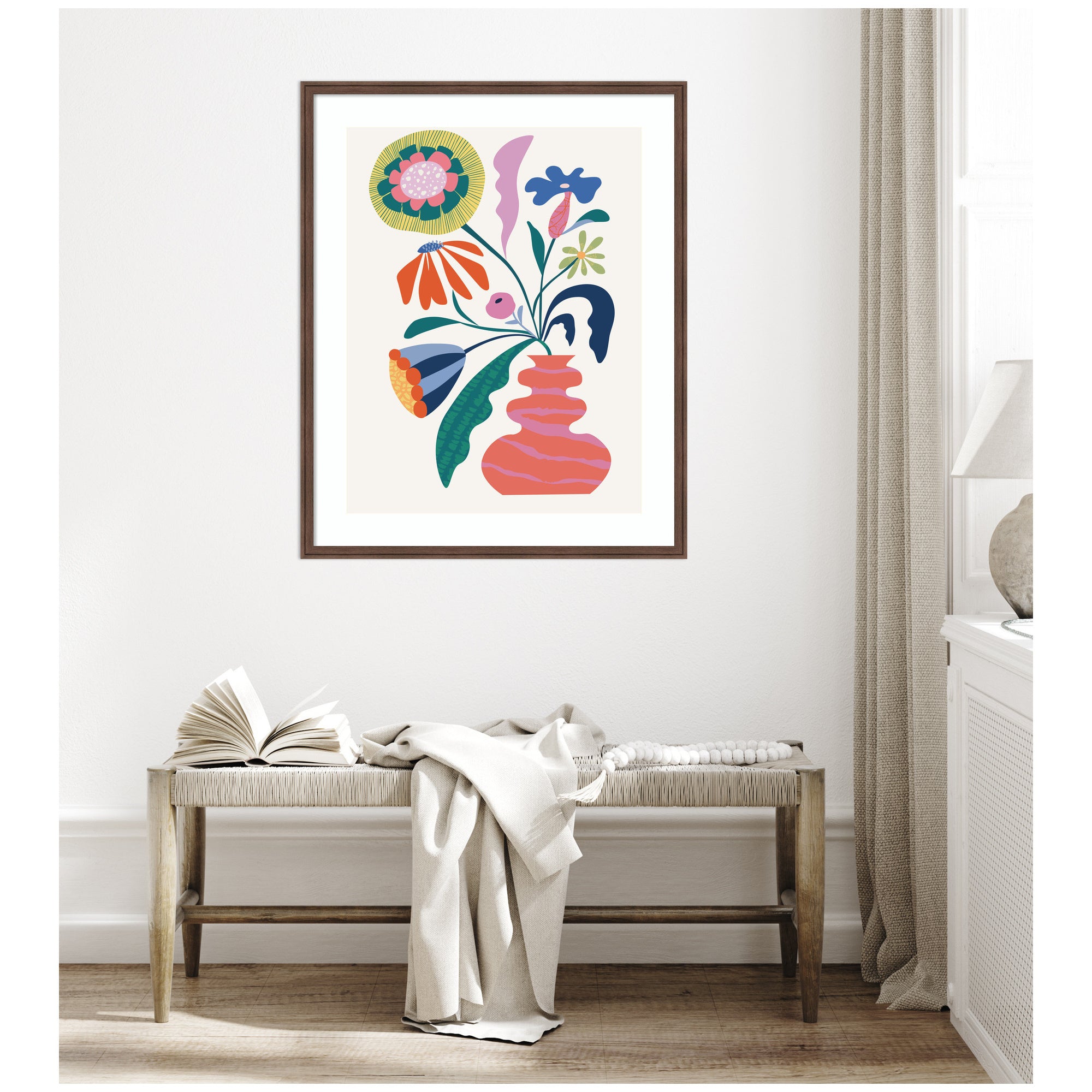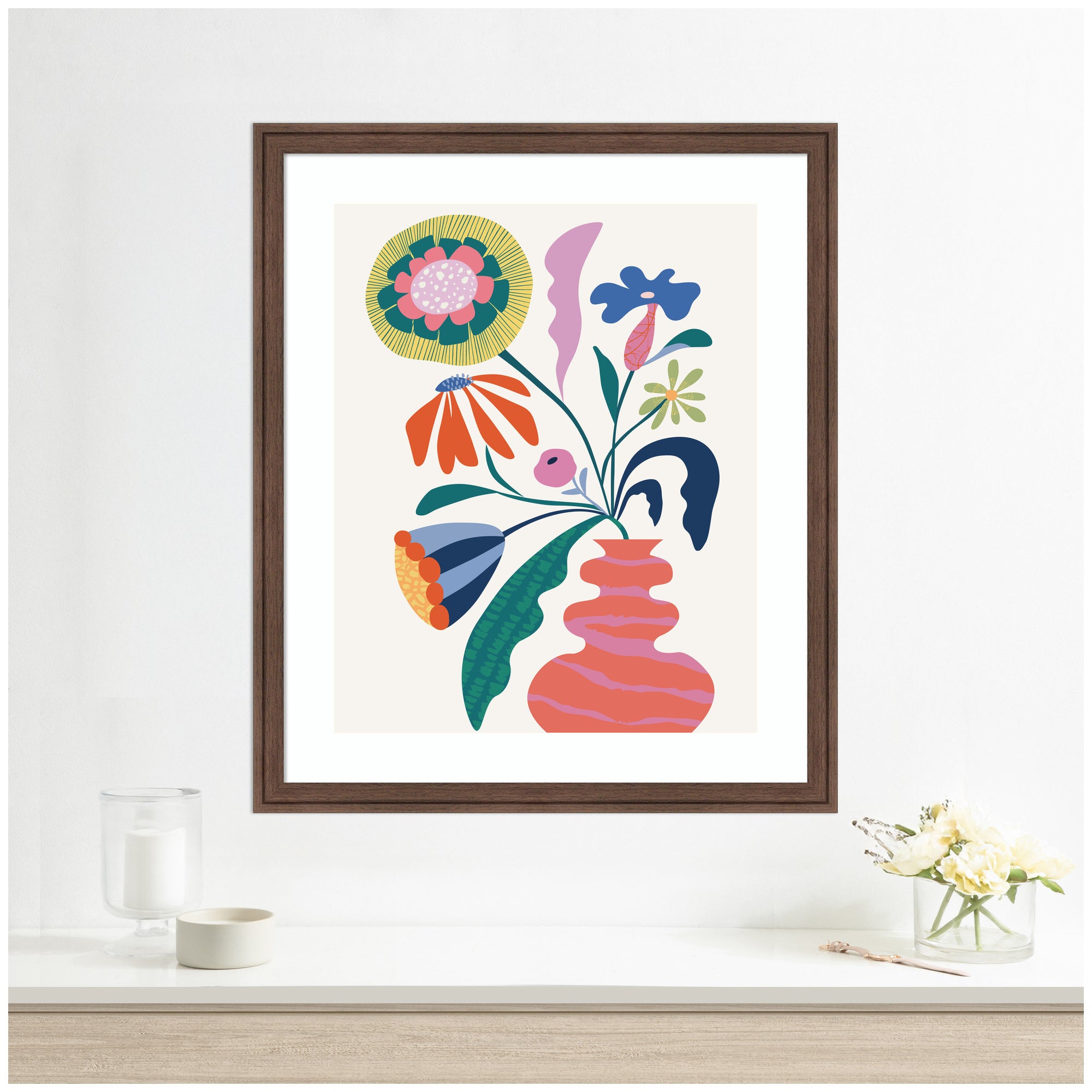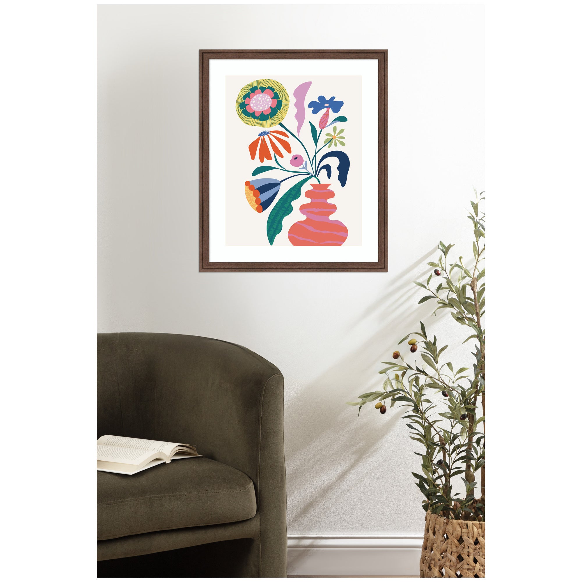 Elevate your space through thoughtfully curated style with this stunning piece designed by independent artist Rachel Lee and beautifully framed by hand in Madison, WI. The image is giclee printed using fade-resistant inks, ensuring every detail comes to life in rich, lasting color. Set in designer moulding, its a Whimsical accent crafted to make a statement. Visual Story: This artwork features a vibrant bouquet of abstract flowers in a stylized vase. The composition includes various colorful and whimsical flowers with exaggerated shapes and contrasting colors. The modern, decorative style lends an energetic and playful feel to the piece.