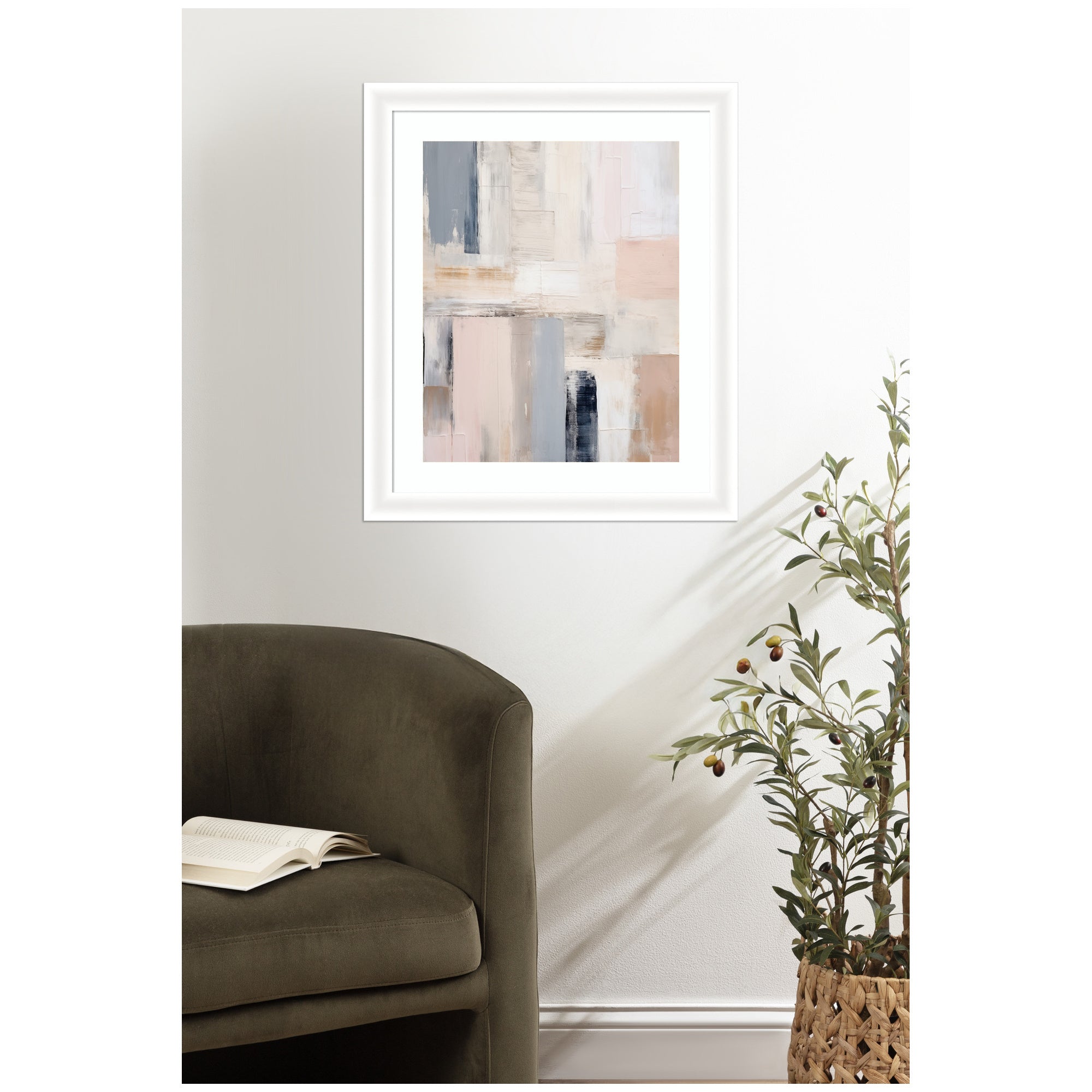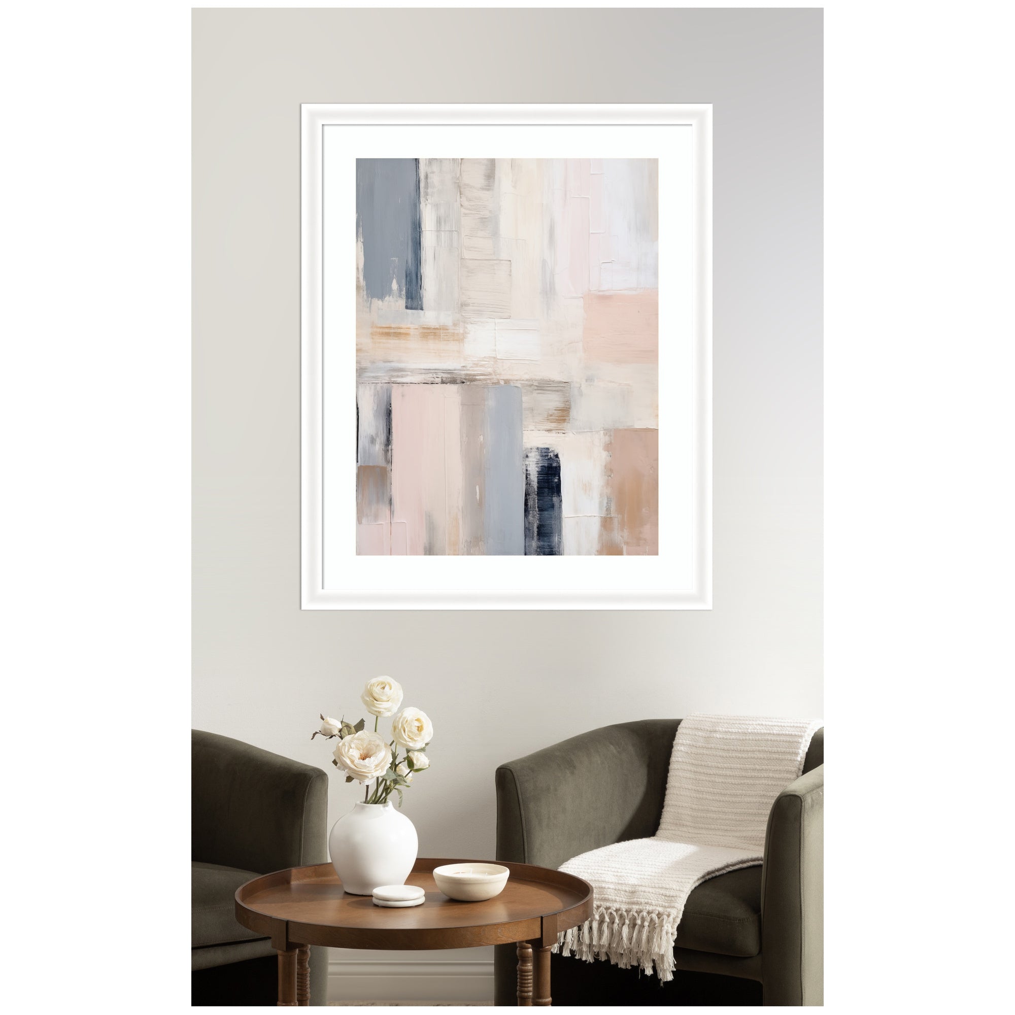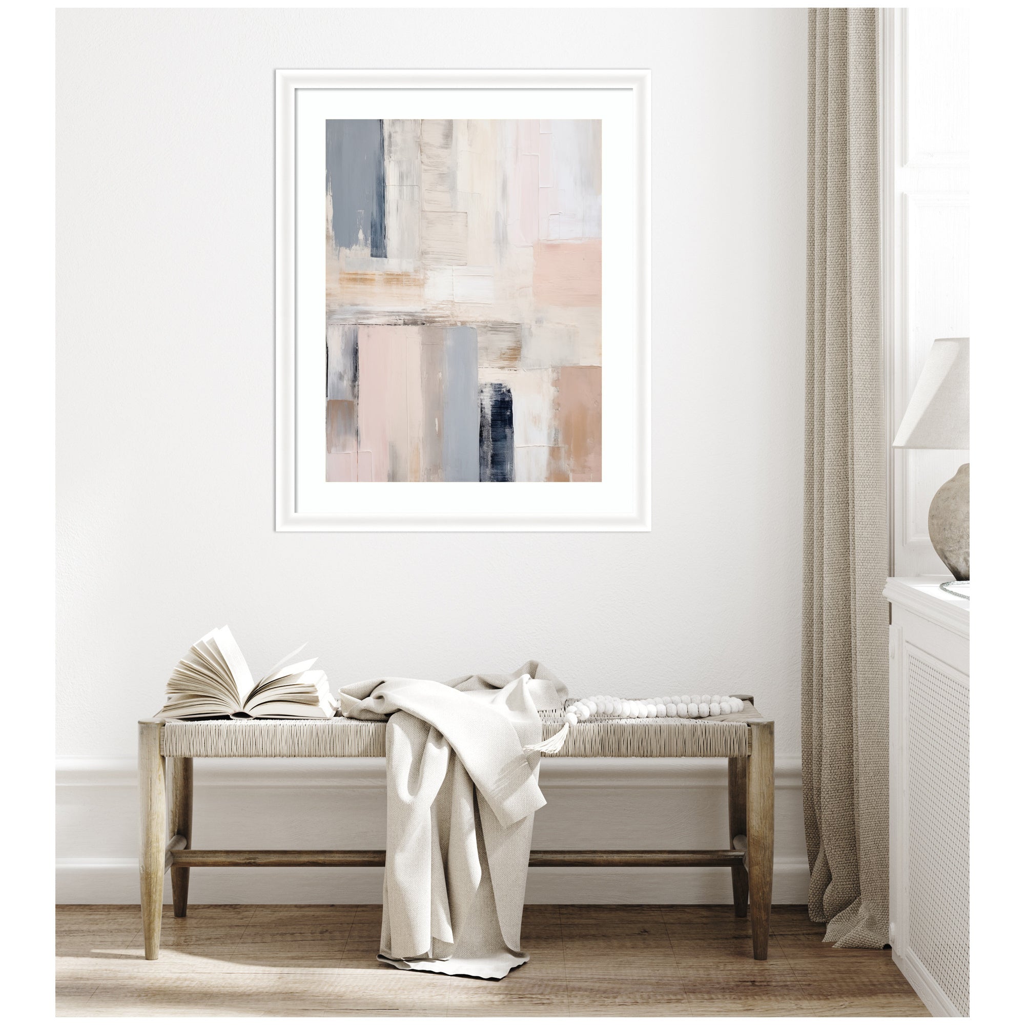 Elevate your space through thoughtfully curated style with this stunning piece designed by independent artist Amy Lighthall and beautifully framed by hand in Madison, WI. The image is giclee printed using fade-resistant inks, ensuring every detail comes to life in rich, lasting color. Set in designer moulding, its a Modern Contemporary accent crafted to make a statement. Visual Story: This artwork features an abstract arrangement of geometric shapes in a soothing palette of neutral and pastel colors, including shades of gray, beige, and light pink. The textured brushstrokes add depth and sophistication to the composition. The minimalist design exudes a modern and elegant aesthetic ideal for contemporary spaces.
