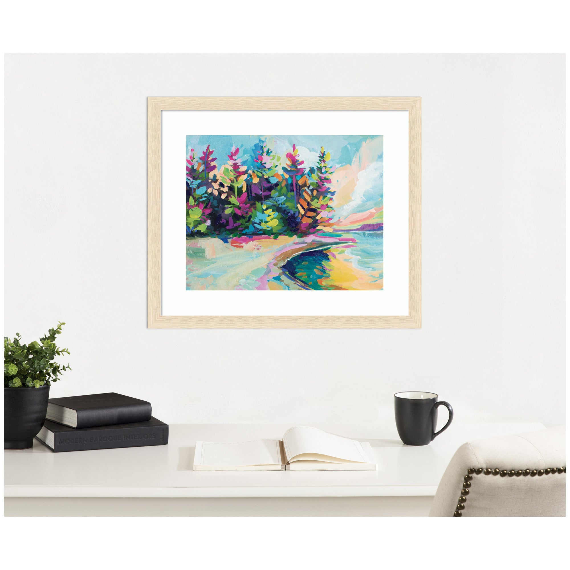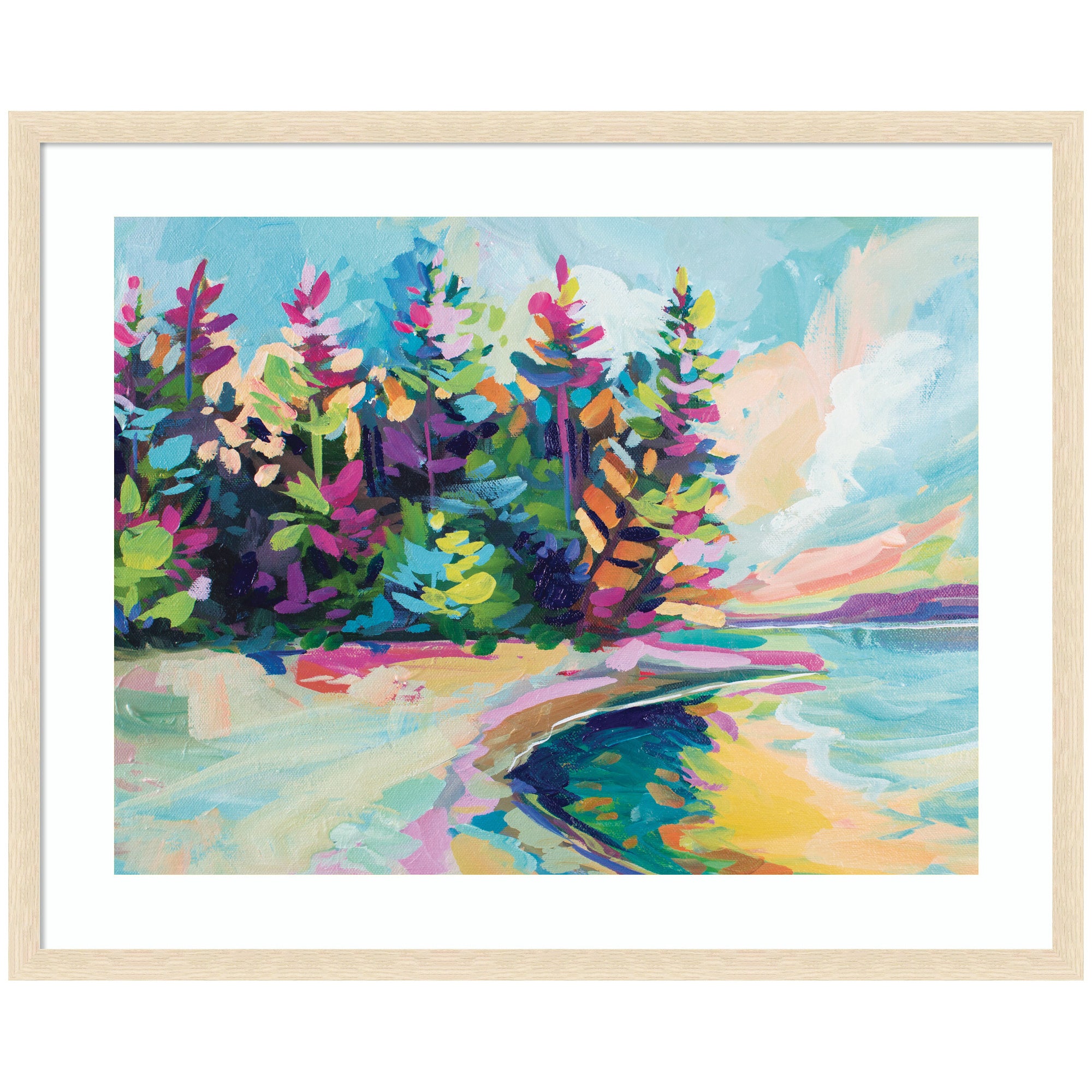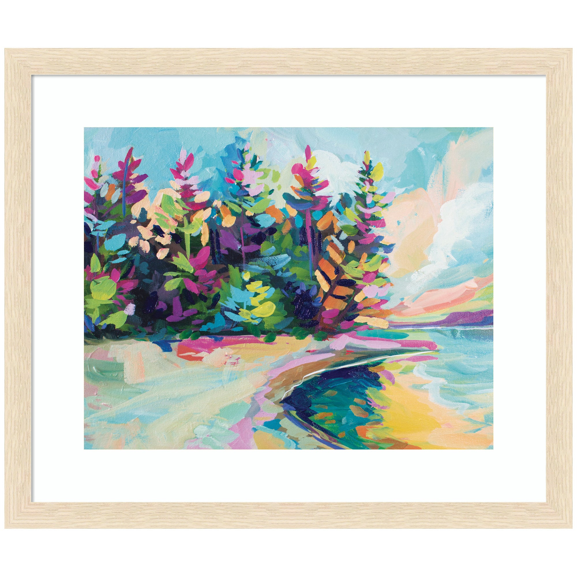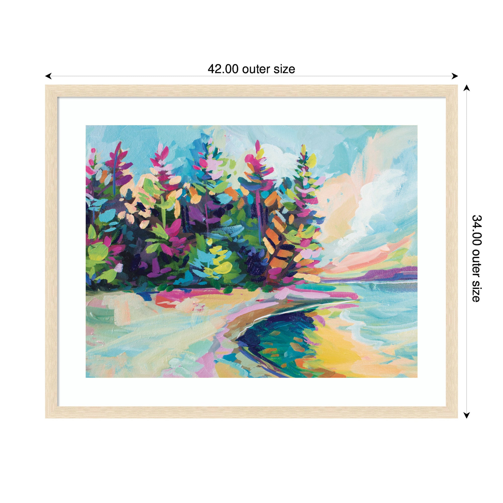 Elevate your space through thoughtfully curated style with this stunning piece designed by independent artist Rachel Christopoulous and beautifully framed by hand in Madison, WI. The image is giclee printed using fade-resistant inks, ensuring every detail comes to life in rich, lasting color. Set in designer moulding, its a Coastal accent crafted to make a statement. Visual Story: This artwork features a vibrant, abstract landscape with a kaleidoscope of colors. Tall trees with multicolored foliage line the edge of a bright shoreline. The scene captures a dynamic sky above a serene body of water.