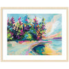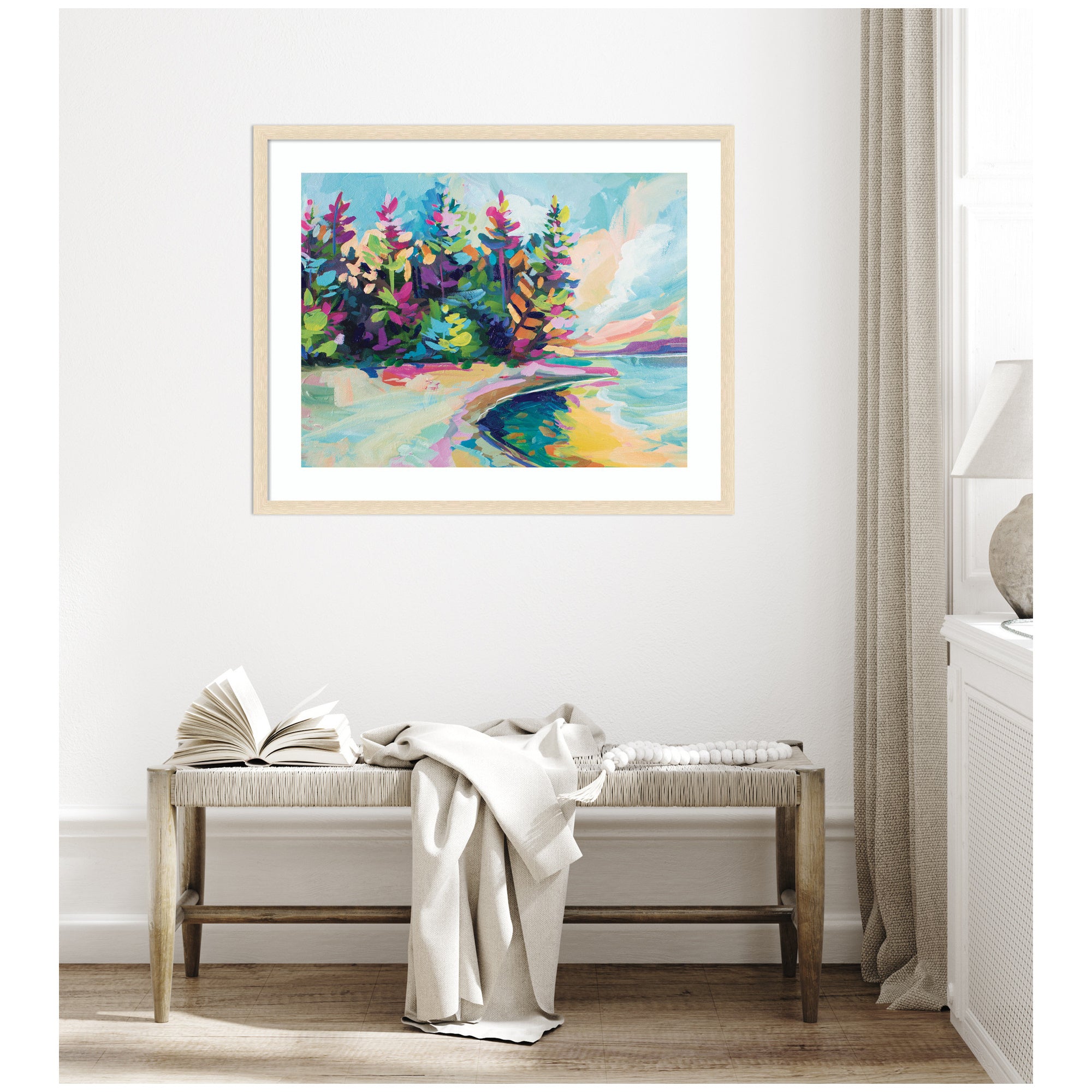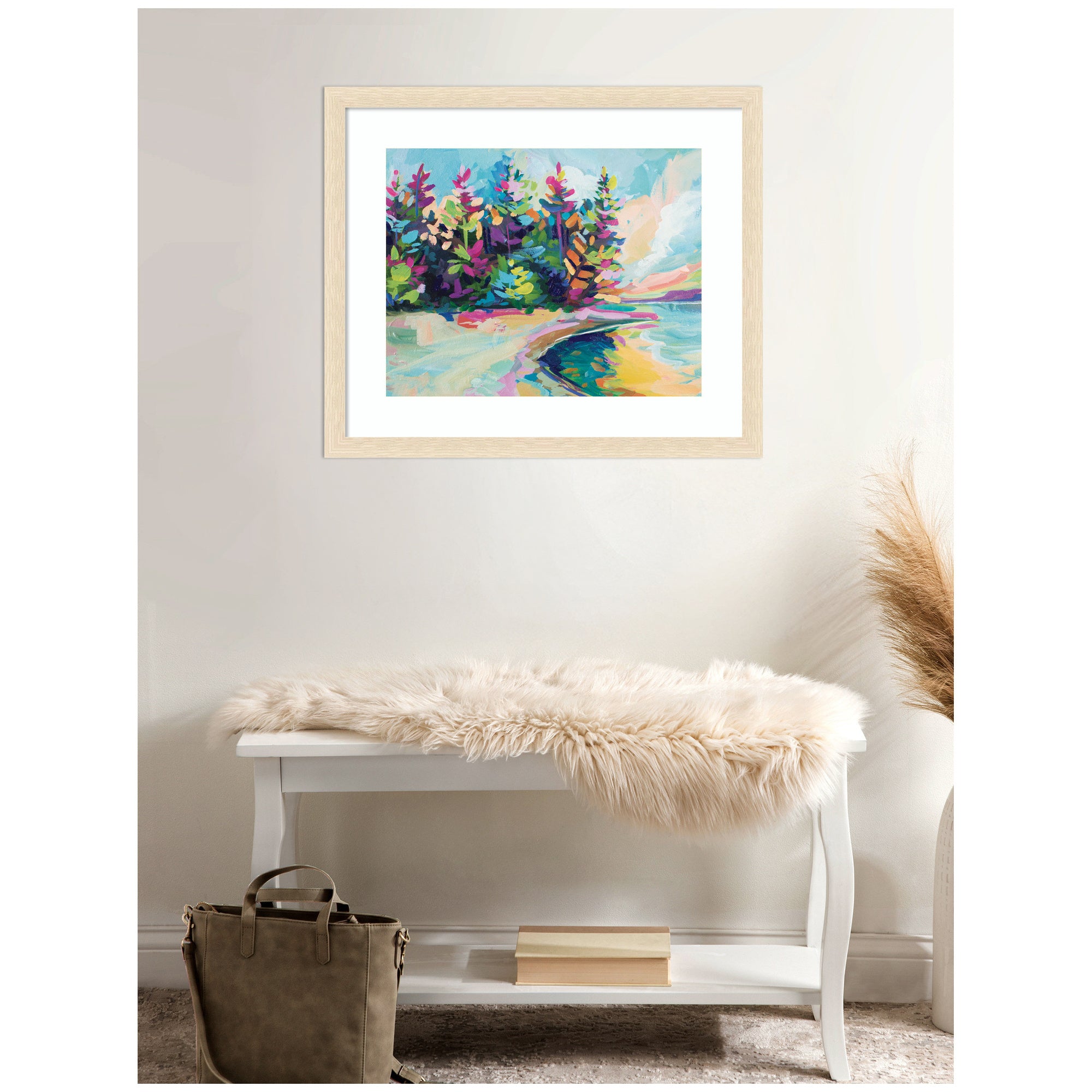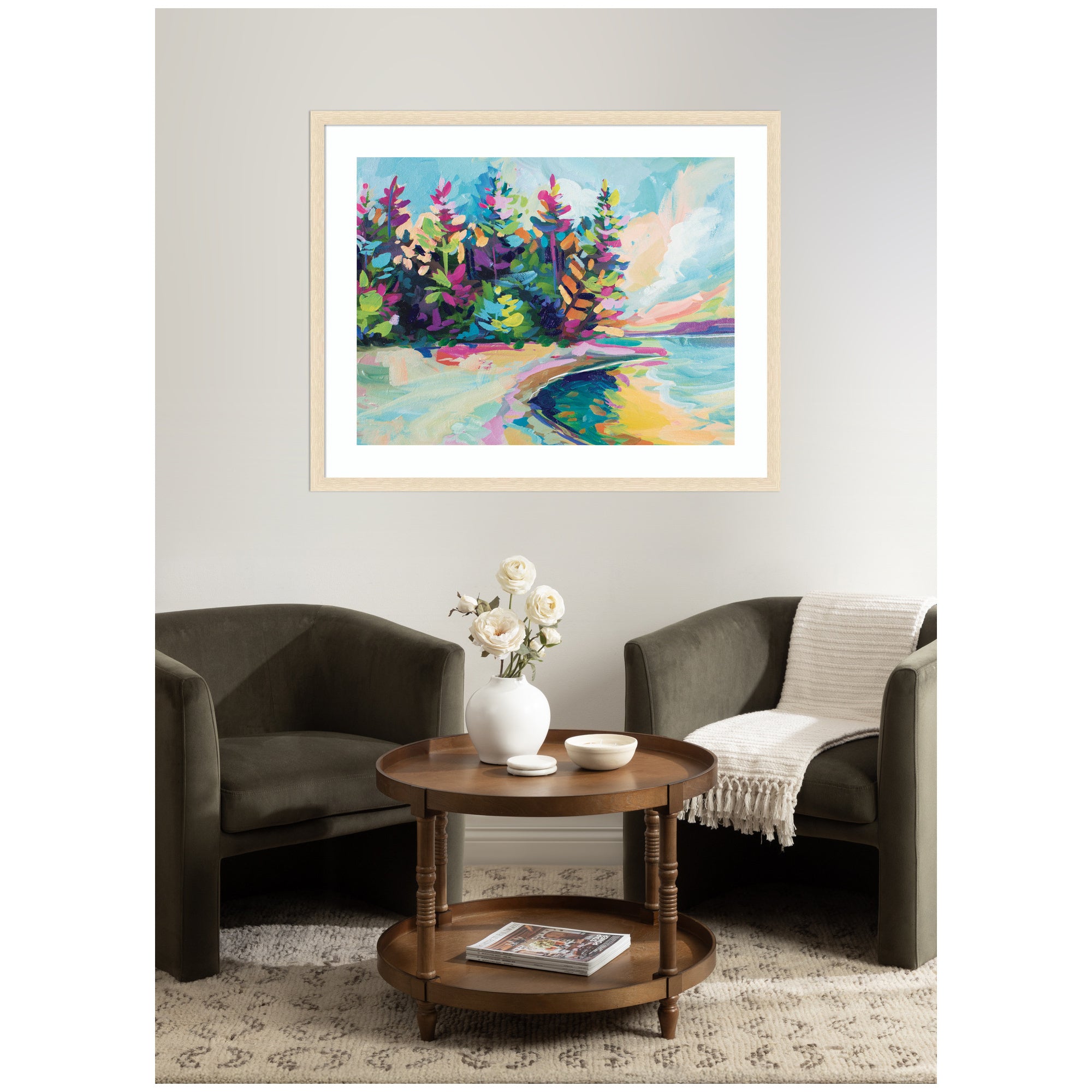 Elevate your space through thoughtfully curated style with this stunning piece designed by independent artist Rachel Christopoulous and beautifully framed by hand in Madison, WI. The image is giclee printed using fade-resistant inks, ensuring every detail comes to life in rich, lasting color. Set in designer moulding, its a Coastal accent crafted to make a statement. Visual Story: This artwork features a vibrant, abstract landscape with a kaleidoscope of colors. Tall trees with multicolored foliage line the edge of a bright shoreline. The scene captures a dynamic sky above a serene body of water.
