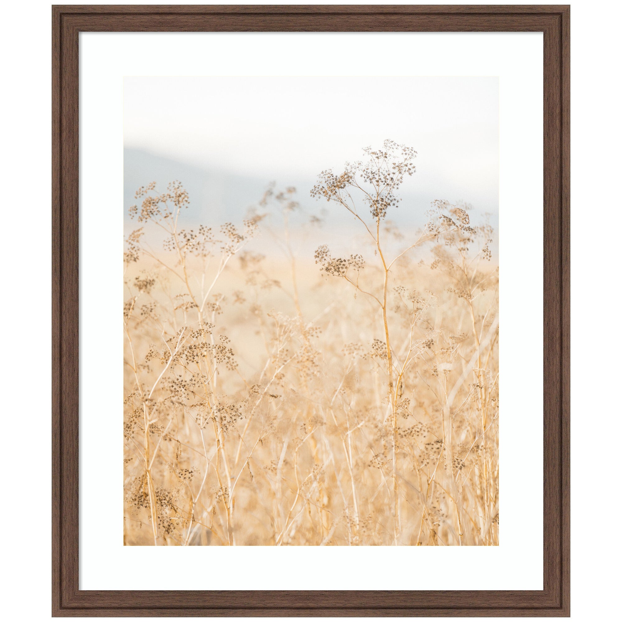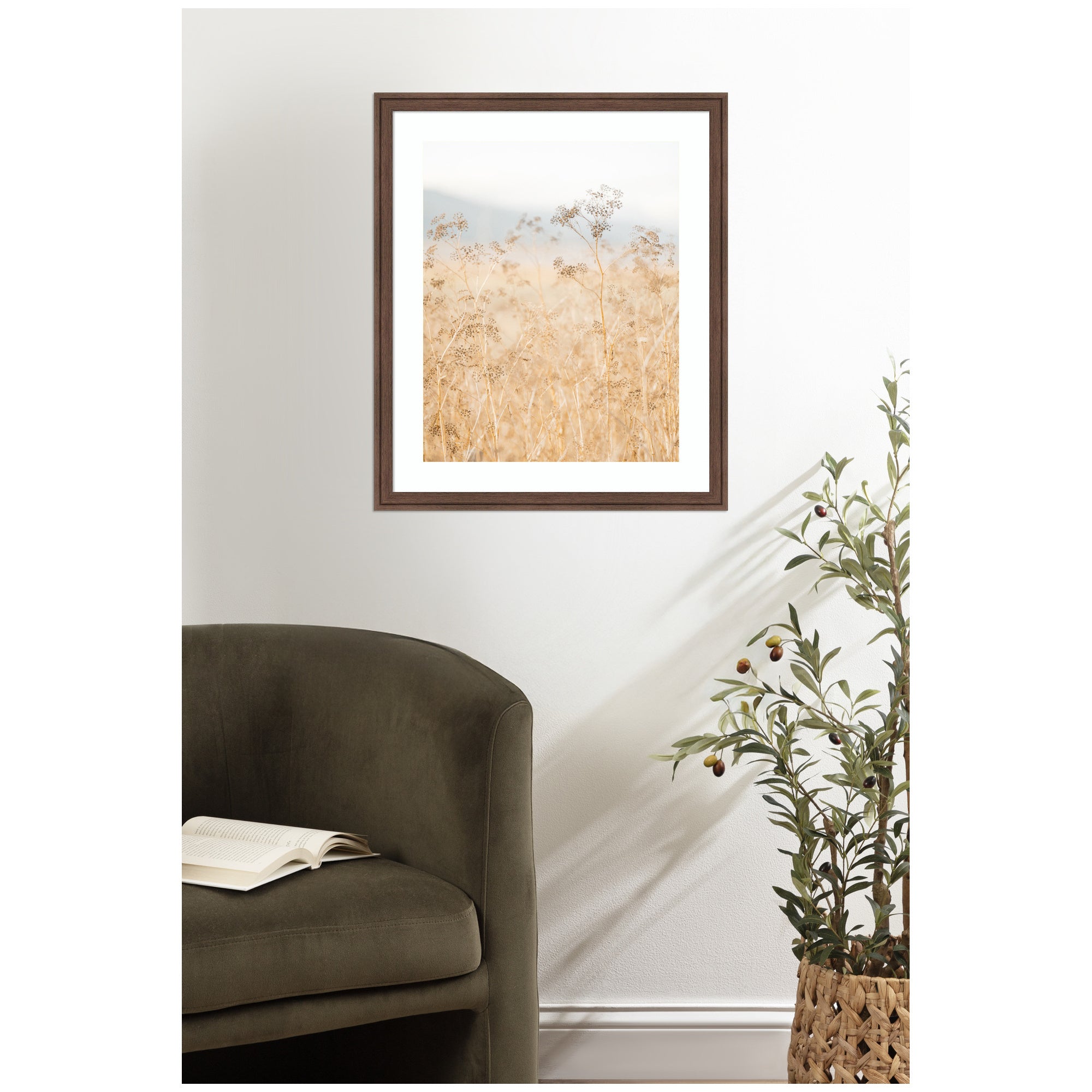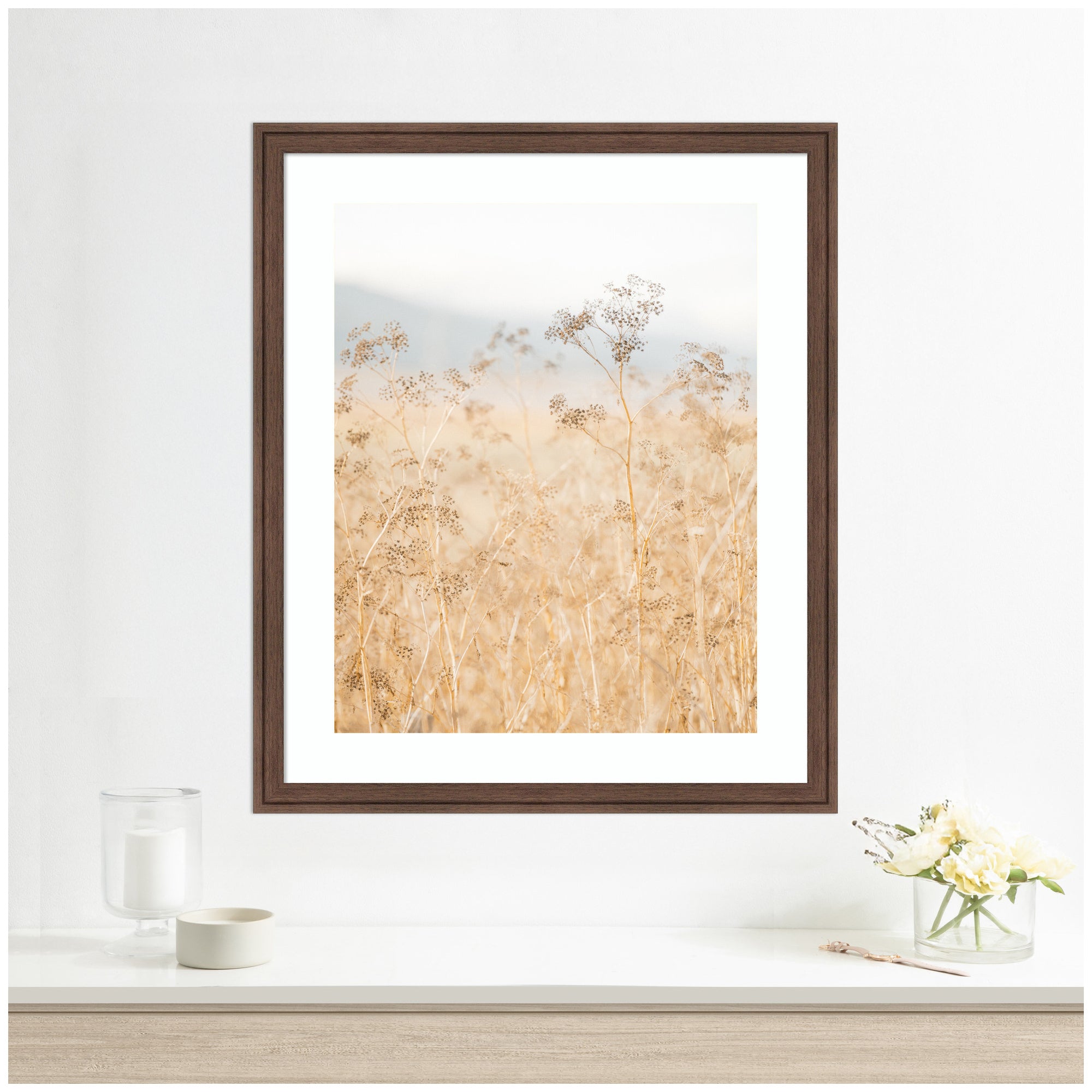 - Authentic Artist Collaboration: 'Wild Fennel' is an officially licensed work by independent artist Crystal Lynn Collins, thoughtfully presented in our Florence Medium Brown molding. The finished piece measures 22 x 26, offering a sophisticated statement for your space. Visual Story: The image captures a serene field of golden grasses swaying gently in the breeze. The delicate stalks and muted tones create a calming, ethereal atmosphere. The soft focus and natural light enhance the minimalistic beauty of the scene. Crystal Lynn Collins's Artist Profile: California farm girl turned photographer whose serene coastal and nature imagery invites viewers to "get quiet and observe."