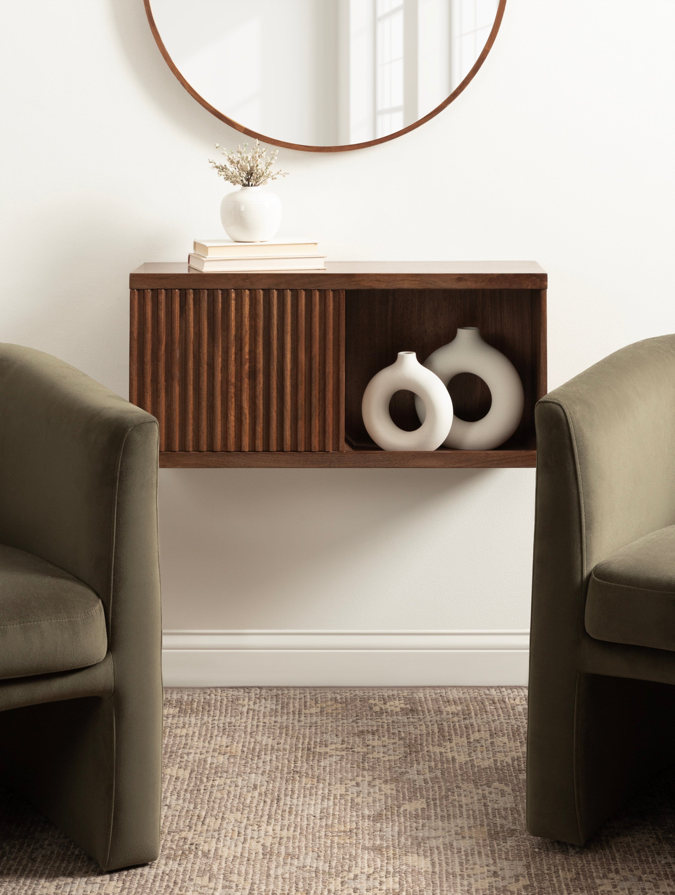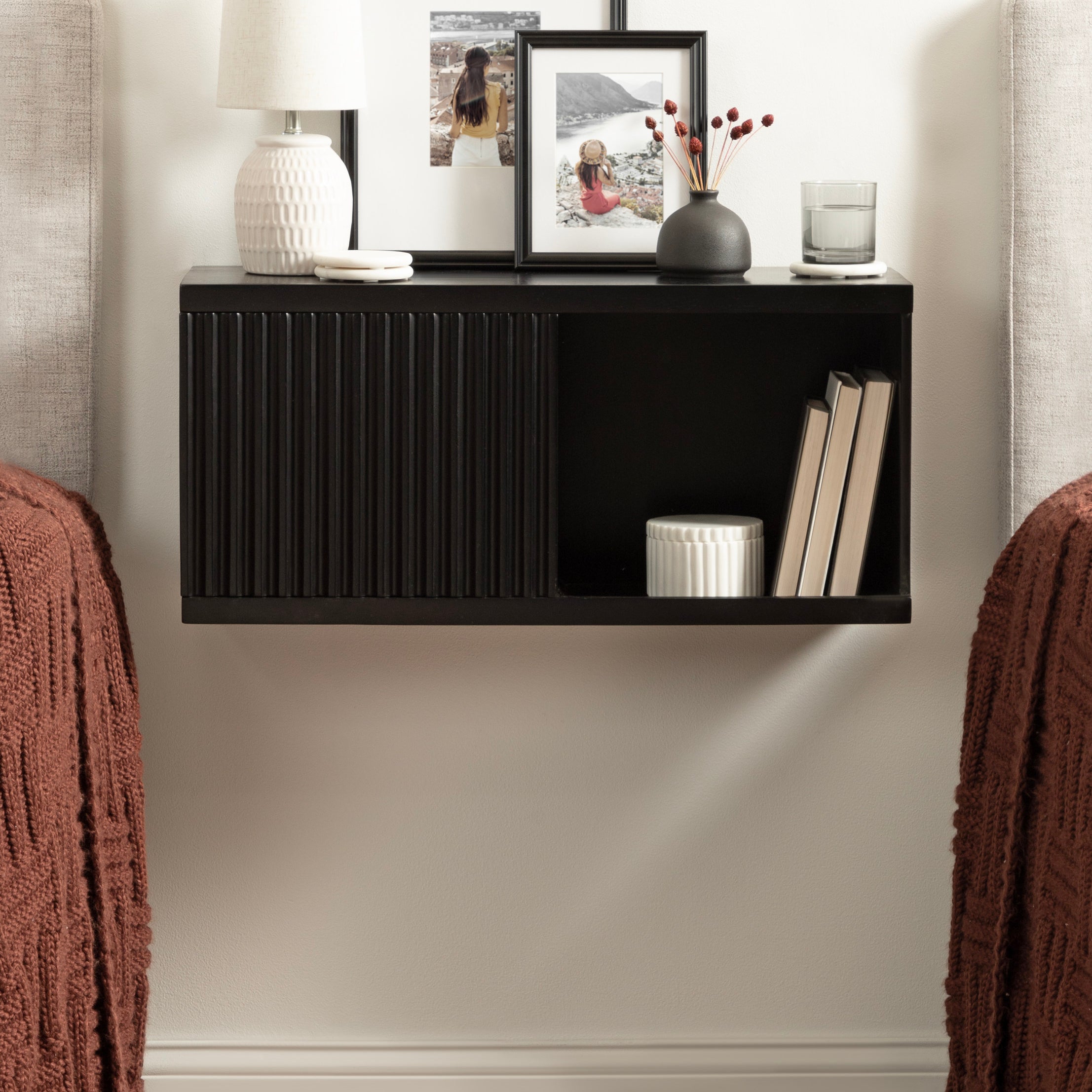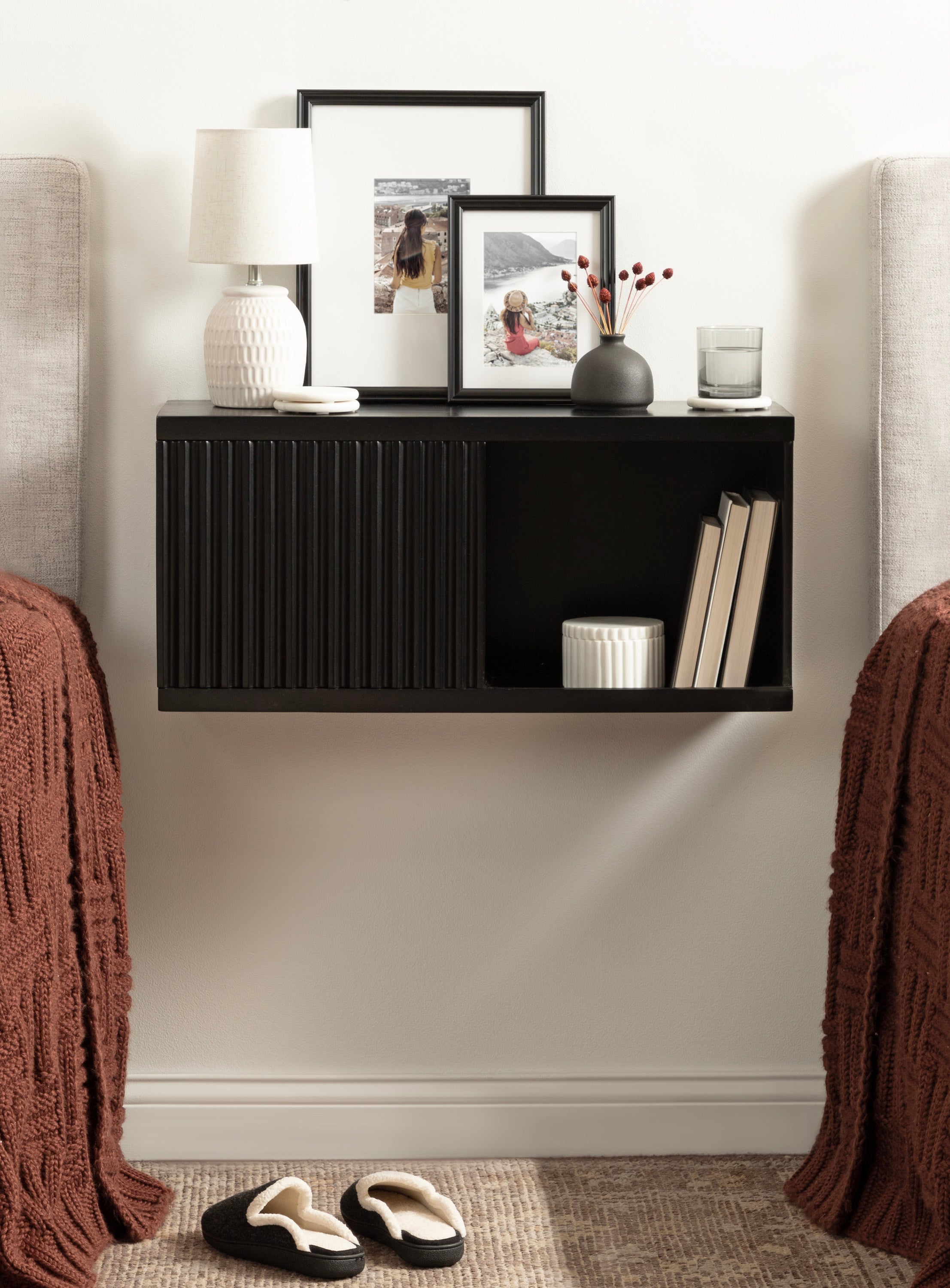 Store books, dishes, and more in a modern-inspired wall cabinet from Kate and Laurel. The Furrow cabinet has a mango wood composition, meaning unique wood grains from piece to piece. Hide away important items with its sliding door and its solid wood divider to keep the items separate. The face of the sliding door is ribbed to introduce more texture to your space. The Furrow cabinet is fantastic for housing your books, office supplies, and bathroom necessities, or you can use it as a functional space for small plates, mugs, and cups. Aside from a wall cabinet, you can also use this unit as a floating side table in your living room or a floating nightstand in your bedroom to take up less floor space. The Furrow wall cabinet hangs on your wall in a matter of seconds thanks to the wood cleat hanger that securely attaches to the back of the wooden frame.