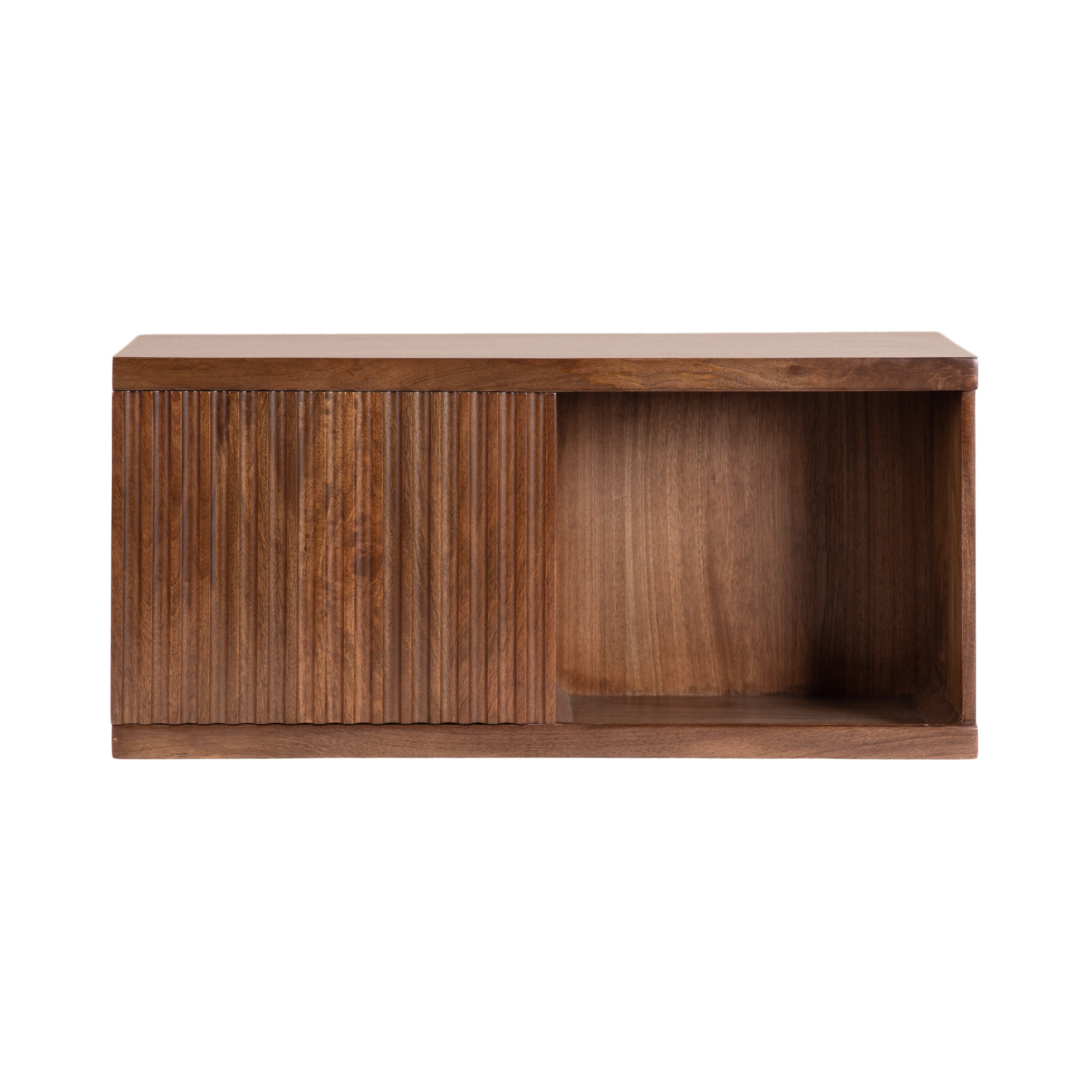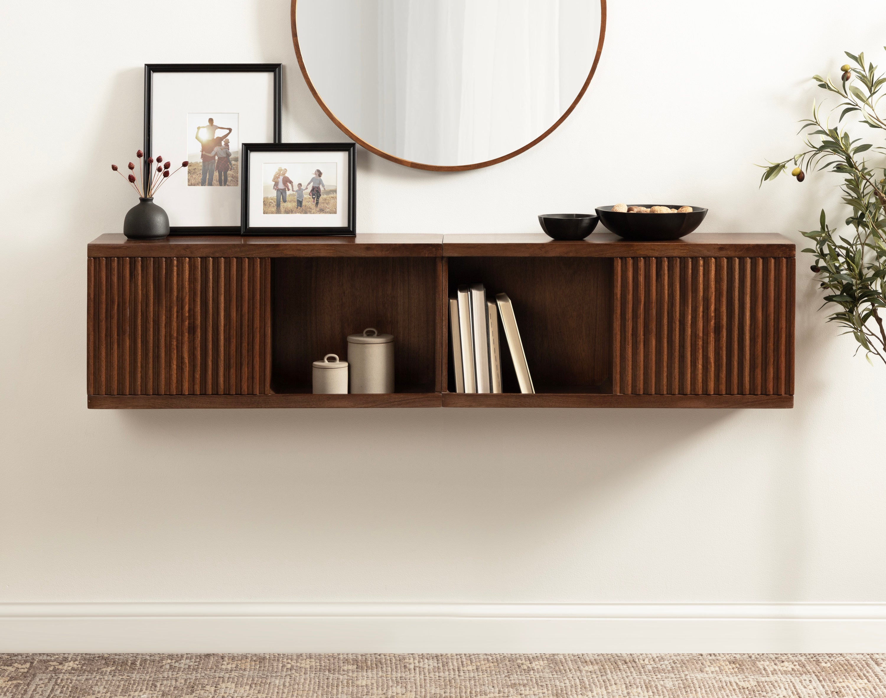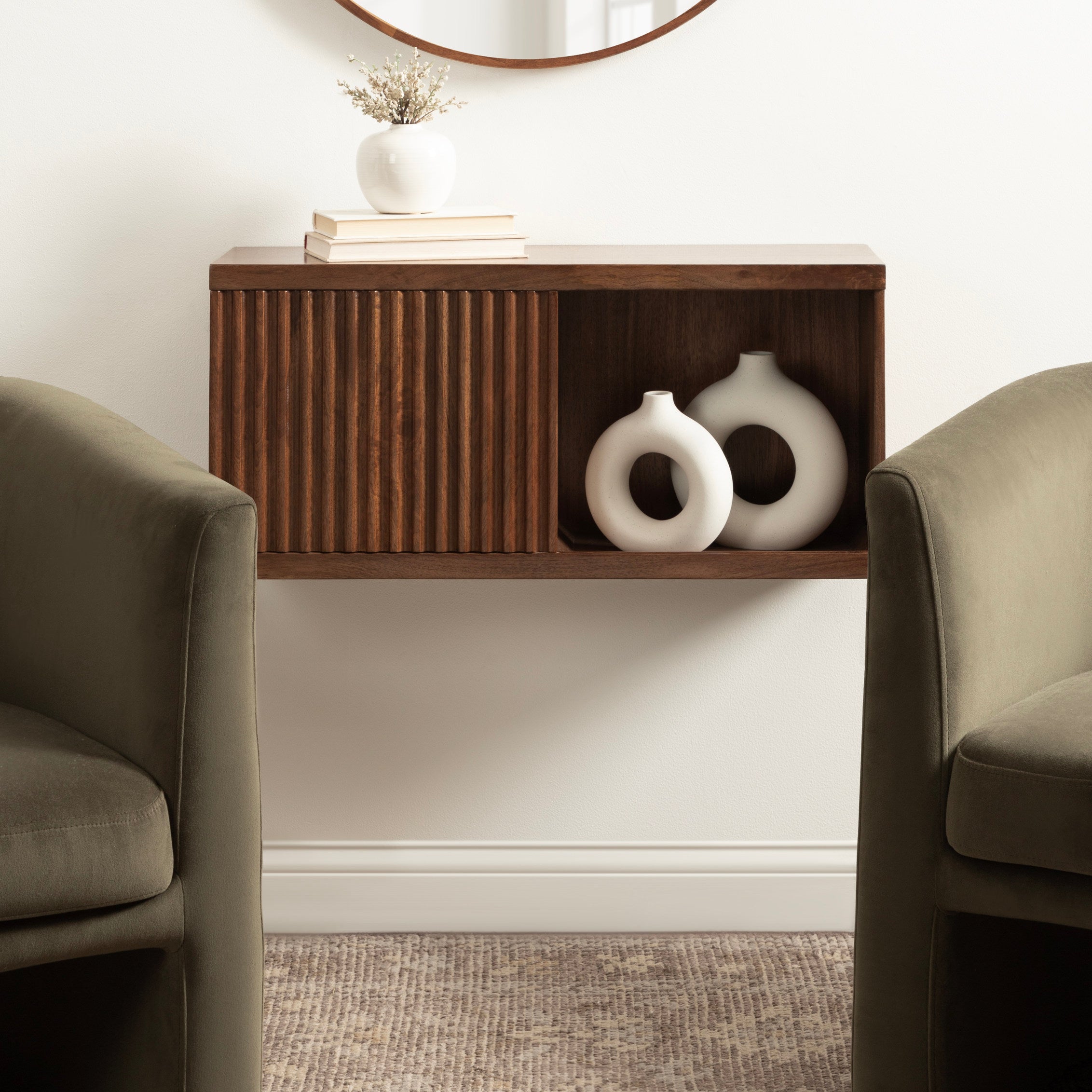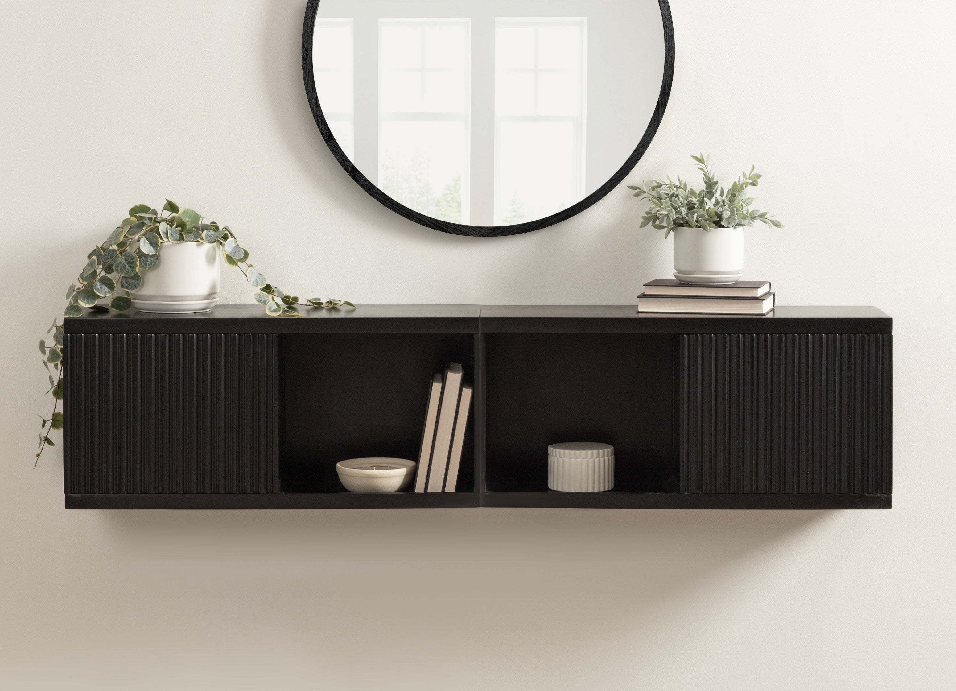 Store books, dishes, and more in a modern-inspired wall cabinet from Kate and Laurel. The Furrow cabinet has a mango wood composition, meaning unique wood grains from piece to piece. Hide away important items with its sliding door and its solid wood divider to keep the items separate. The face of the sliding door is ribbed to introduce more texture to your space. The Furrow cabinet is fantastic for housing your books, office supplies, and bathroom necessities, or you can use it as a functional space for small plates, mugs, and cups. Aside from a wall cabinet, you can also use this unit as a floating side table in your living room or a floating nightstand in your bedroom to take up less floor space. The Furrow wall cabinet hangs on your wall in a matter of seconds thanks to the wood cleat hanger that securely attaches to the back of the wooden frame.