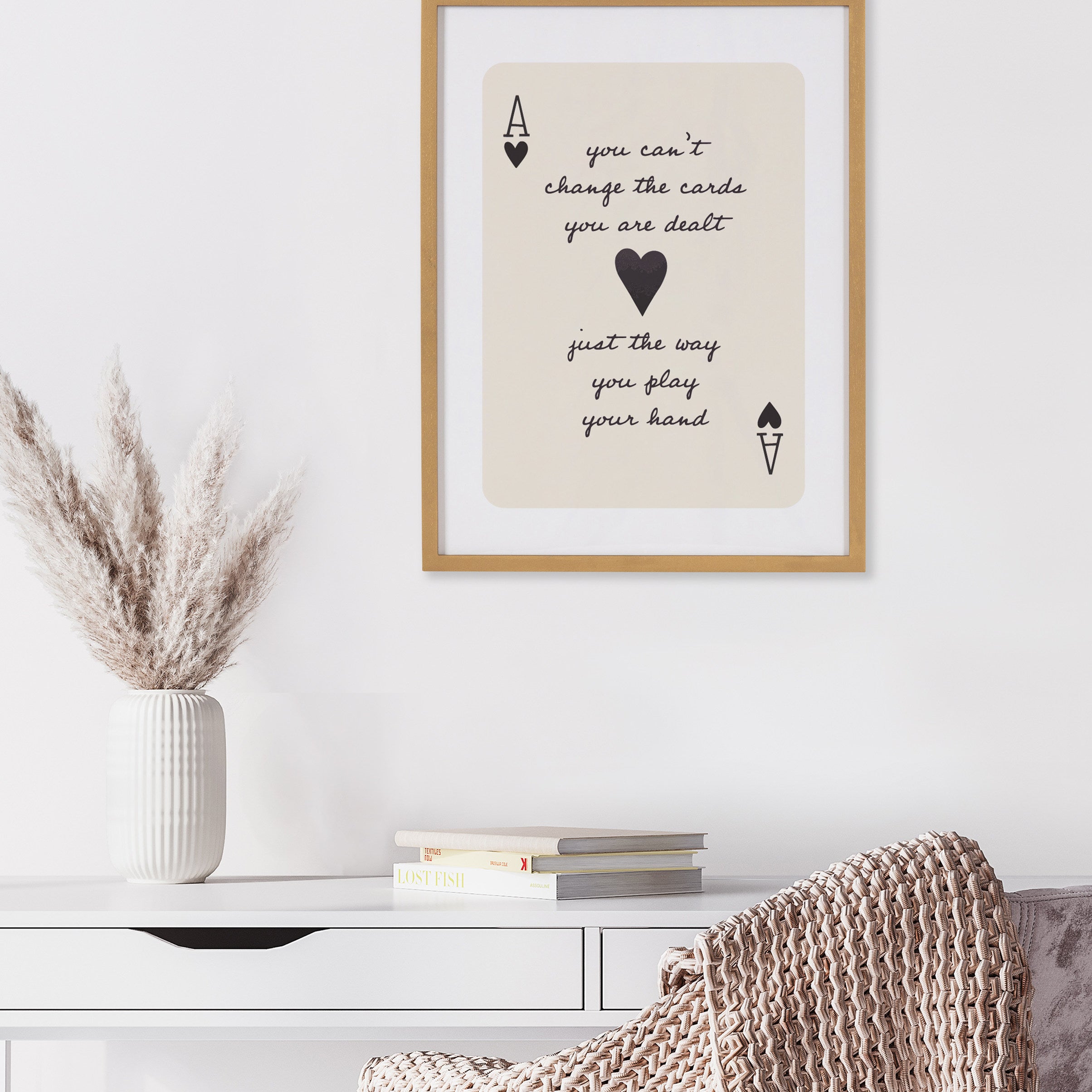 The Ace of Hearts artwork serves as a playful backdrop for an inspirational quote in this modern piece. Printed in the USA in Waunakee, Wisconsin, this modern framed wall art is sure to bring joy to your space. Our design team curates art that will fit perfectly in any room of your home. Printed on semi-gloss paper made of responsibly sourced wood fibers and framed with a simple solid wood gallery frame, this wall art is easy to display on the wall and will match any décor style. Showcase this curated art in your living room, bedroom, home office, kitchen, bathroom, nursery, or anywhere you want to bring a little beauty and charm to your walls. Specializing in home décor, we are continually bringing timeless works of art for the traditional decorator as well as trend-forward pieces for that eclectic art lover. Our high-quality framed wall art also makes excellent gifts for birthdays, holidays, or housewarming parties.
