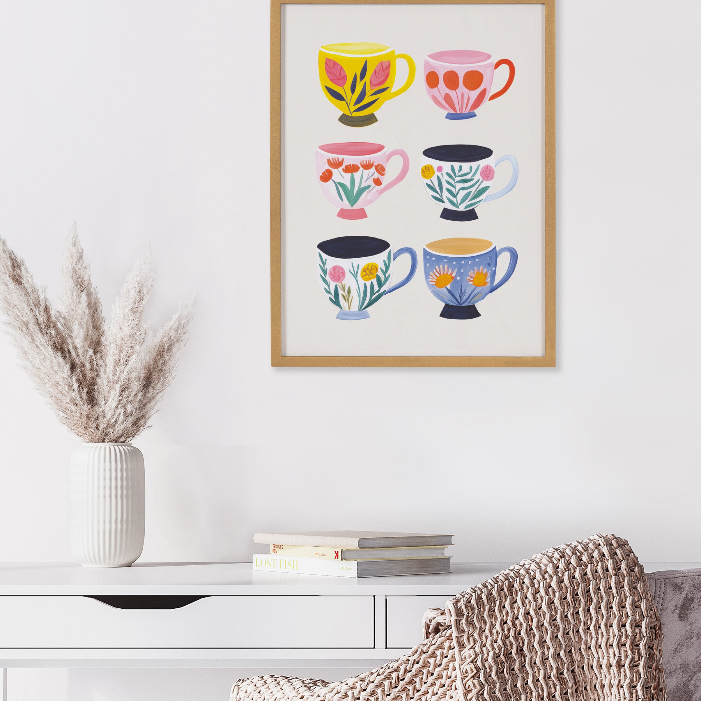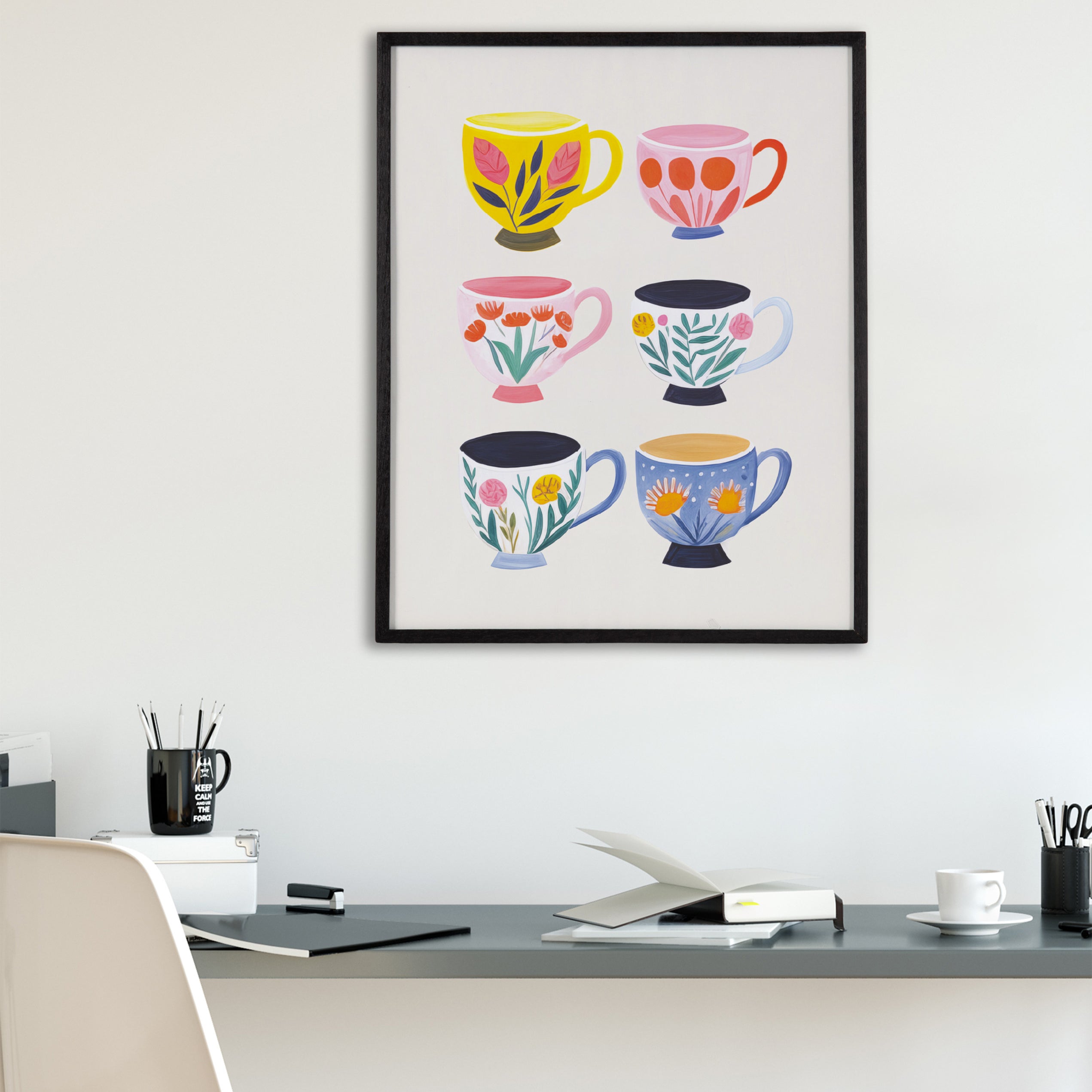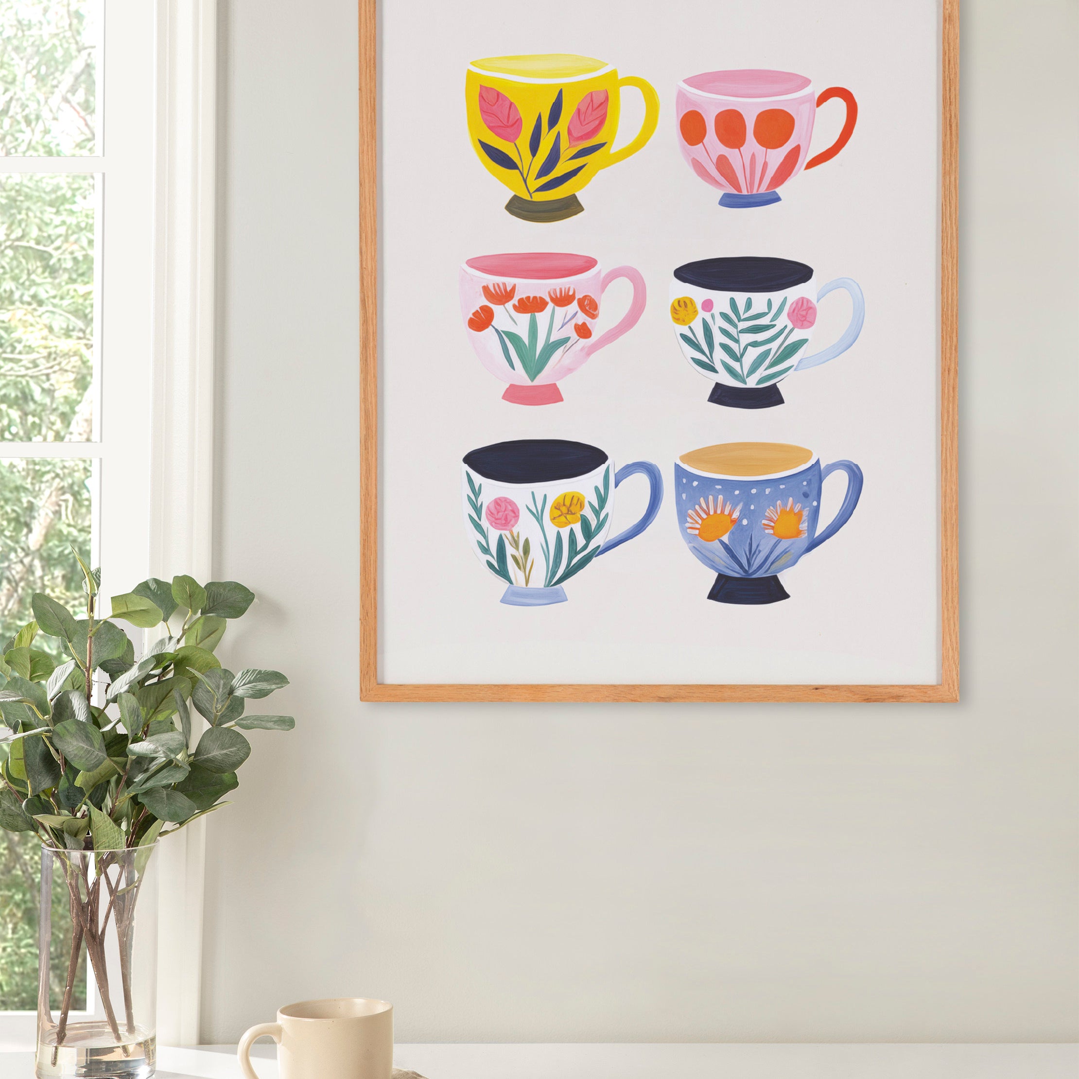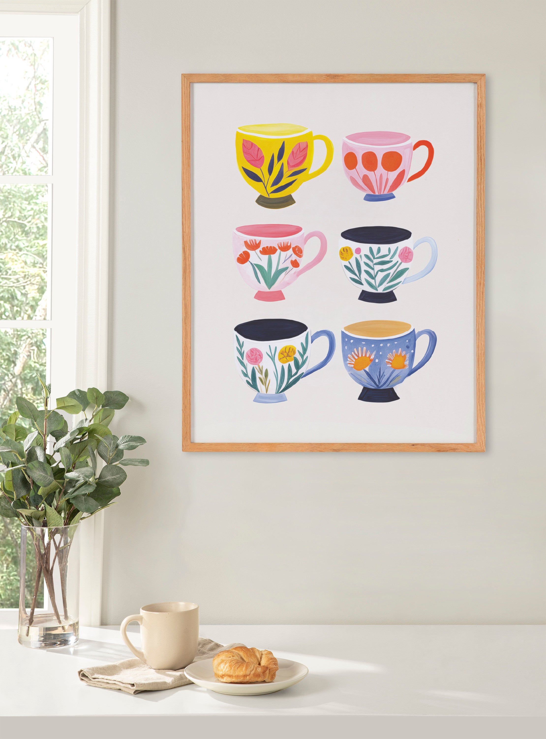 This cute artwork features botanical illustrations of coffee shop tea cups. Printed in the USA in Waunakee, Wisconsin, this modern framed wall art is sure to bring joy to your space. Our design team curates art that will fit perfectly in any room of your home. Printed on semi-gloss paper made of responsibly sourced wood fibers and framed with a simple solid wood gallery frame, this wall art is easy to display on the wall and will match any décor style. Showcase this curated art in your living room, bedroom, home office, kitchen, bathroom, nursery, or anywhere you want to bring a little beauty and charm to your walls. Specializing in home décor, we are continually bringing timeless works of art for the traditional decorator as well as trend-forward pieces for that eclectic art lover. Our high-quality framed wall art also makes excellent gifts for birthdays, holidays, or housewarming parties.