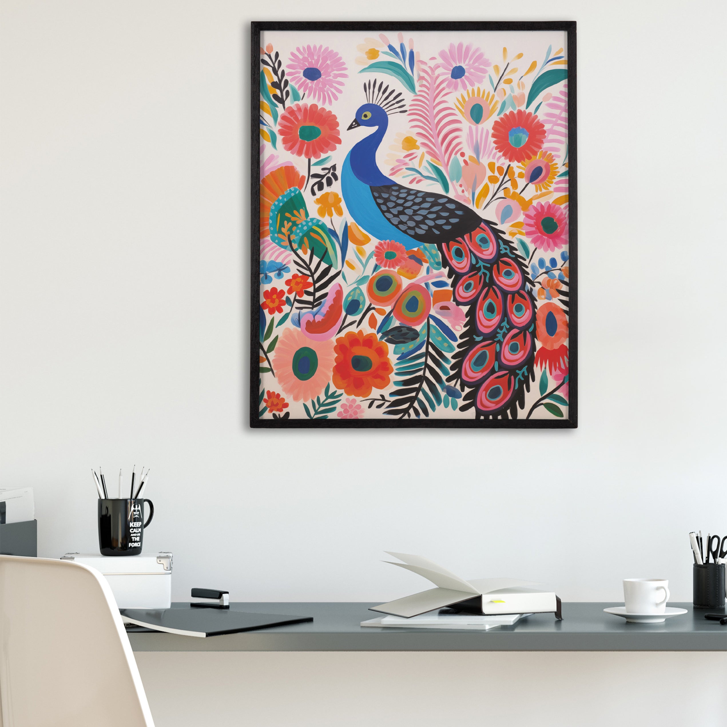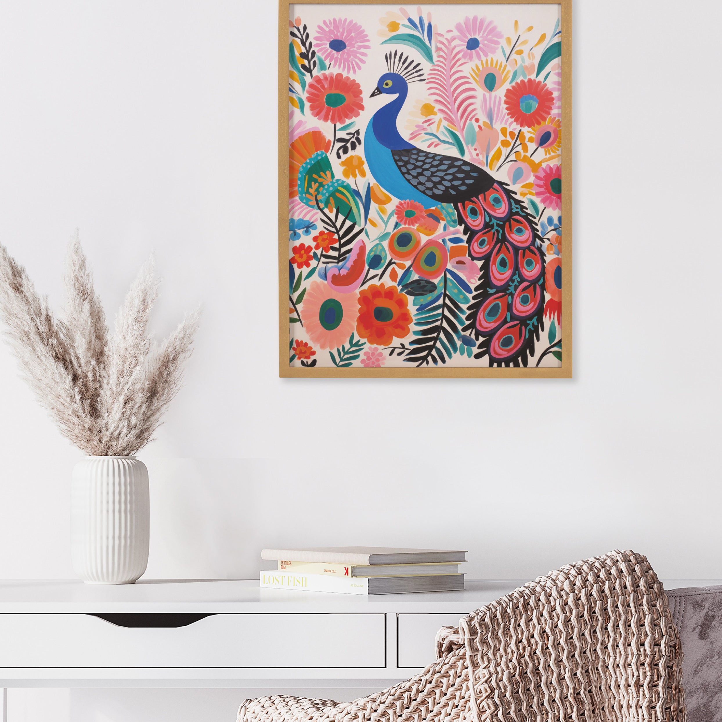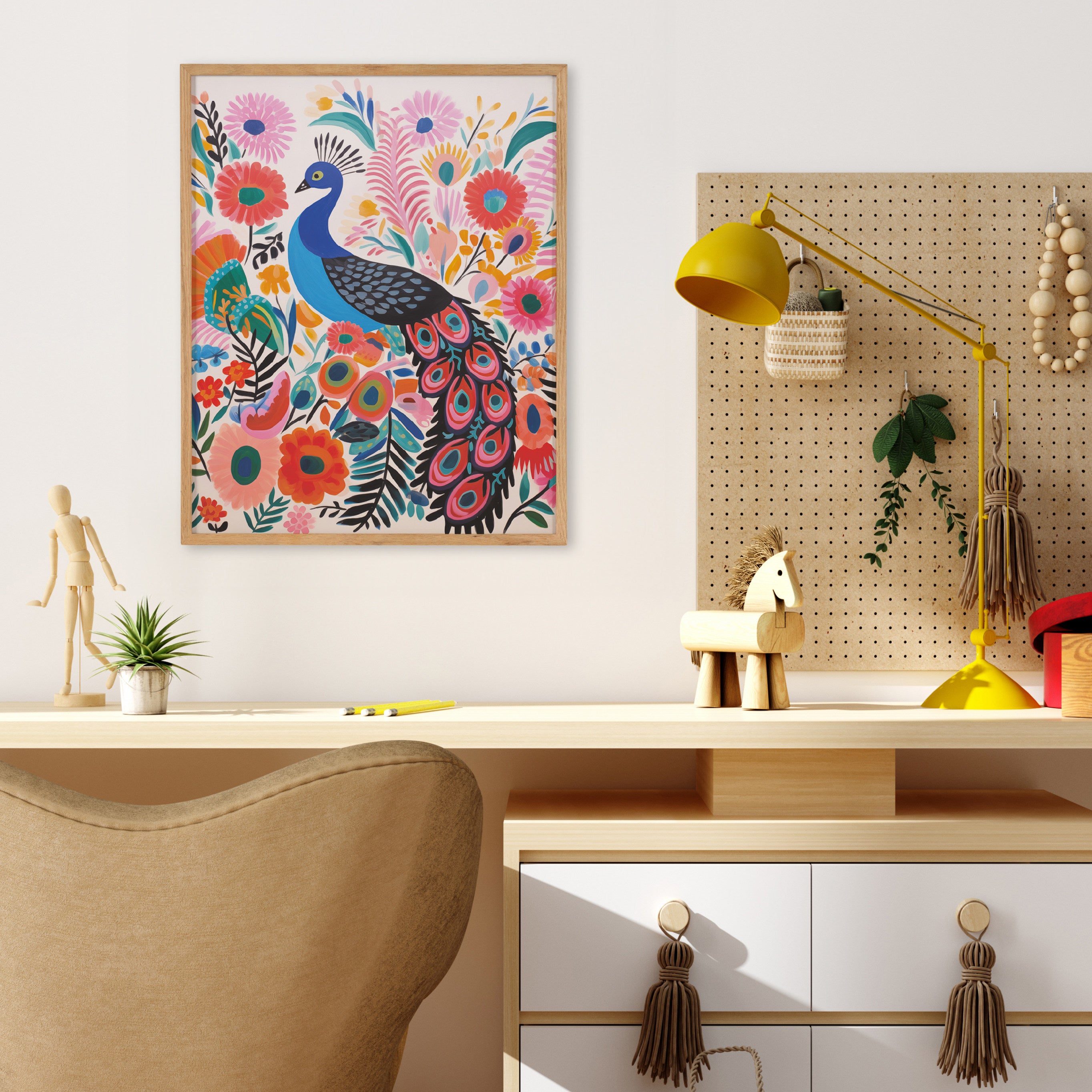 A bright and colorful peacock is the highlight of this modern boho artwork. Printed in the USA in Waunakee, Wisconsin, this modern framed wall art is sure to bring joy to your space. Our design team curates art that will fit perfectly in any room of your home. Printed on semi-gloss paper made of responsibly sourced wood fibers and framed with a simple solid wood gallery frame, this wall art is easy to display on the wall and will match any décor style. Showcase this curated art in your living room, bedroom, home office, kitchen, bathroom, nursery, or anywhere you want to bring a little beauty and charm to your walls. Specializing in home décor, we are continually bringing timeless works of art for the traditional decorator as well as trend-forward pieces for that eclectic art lover. Our high-quality framed wall art also makes excellent gifts for birthdays, holidays, or housewarming parties.