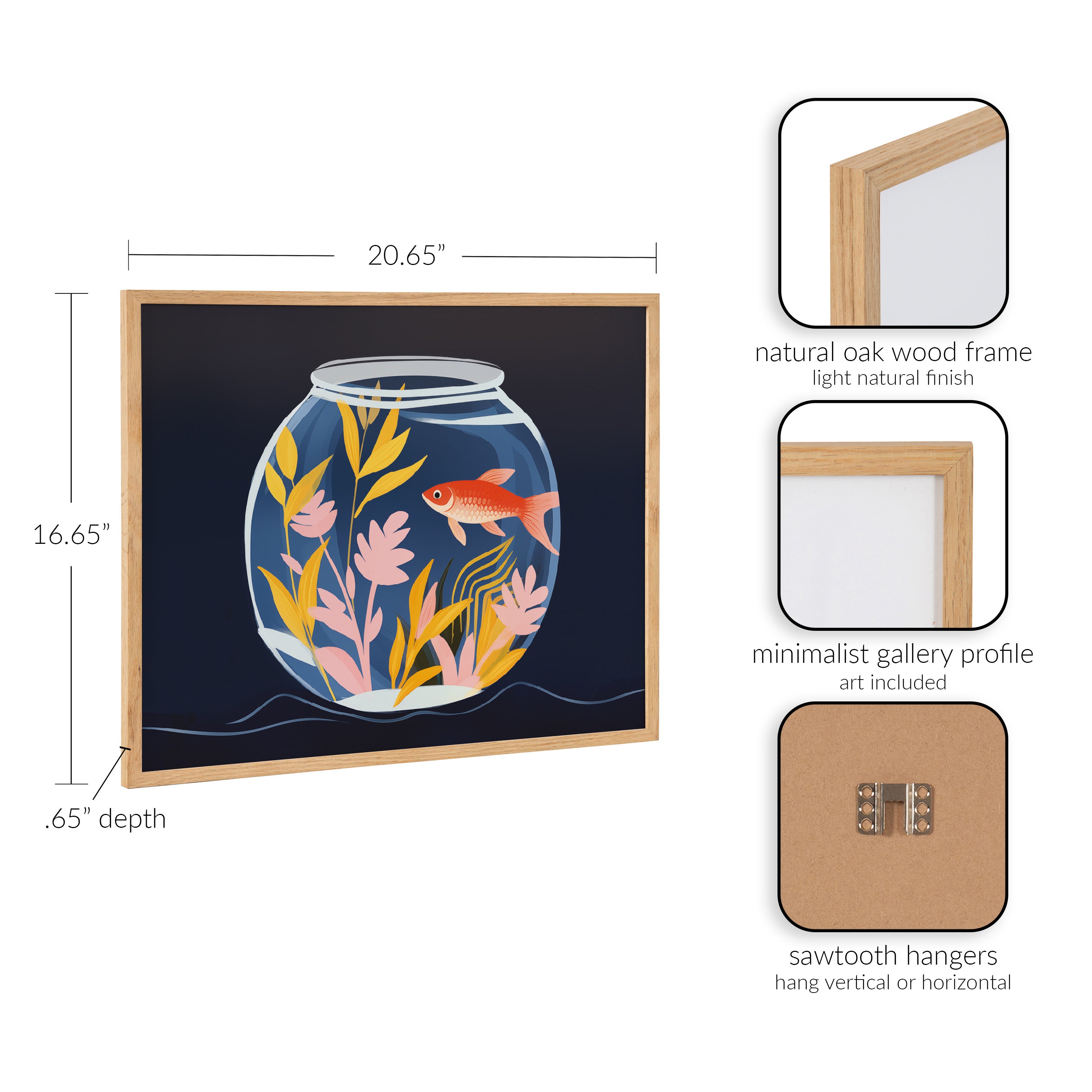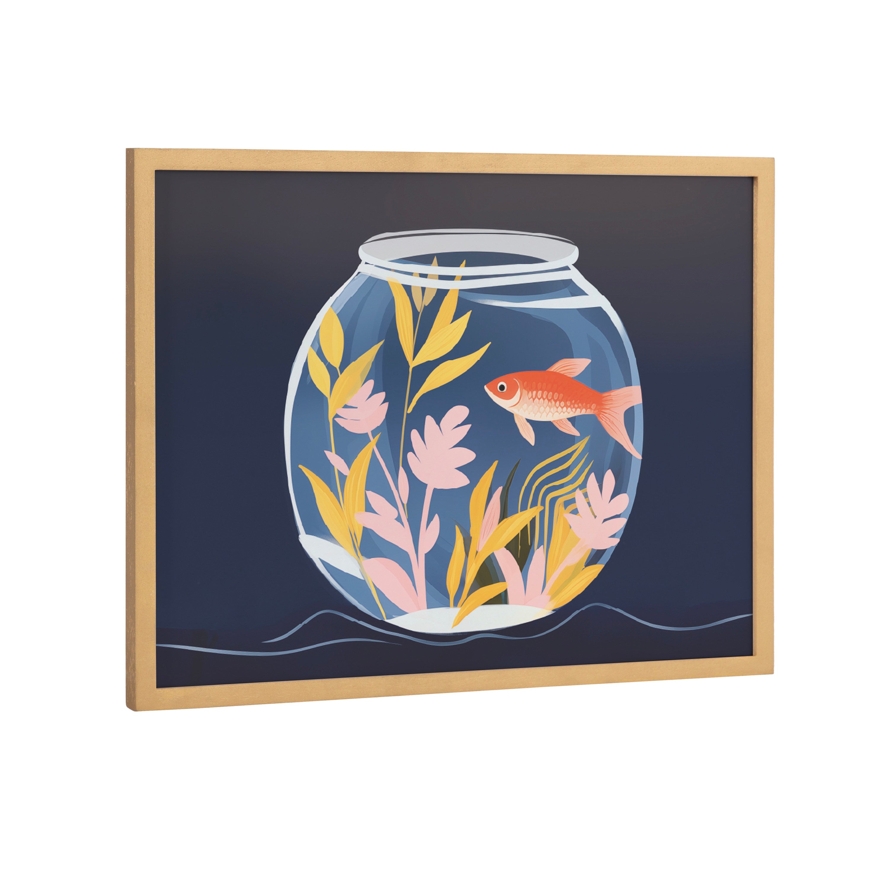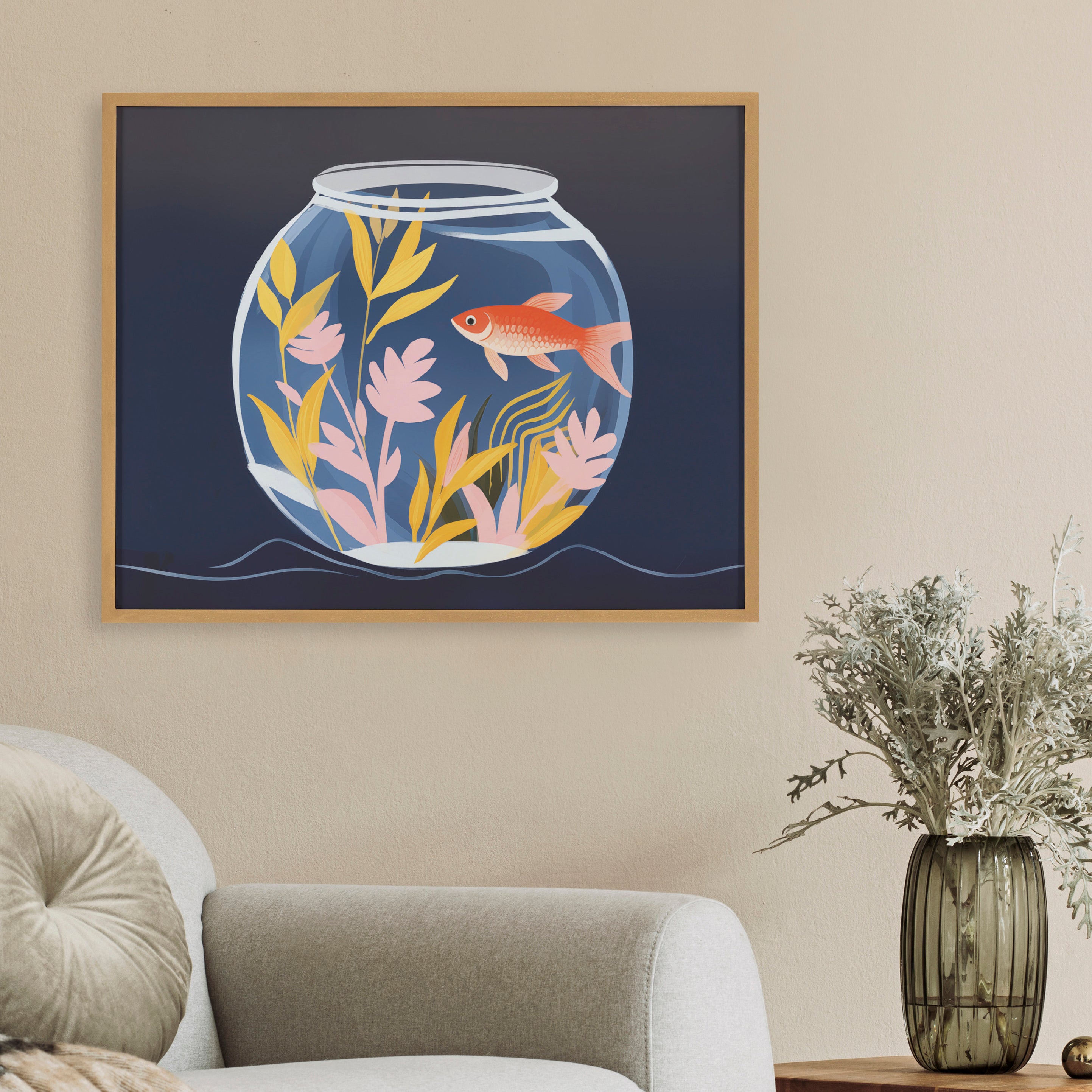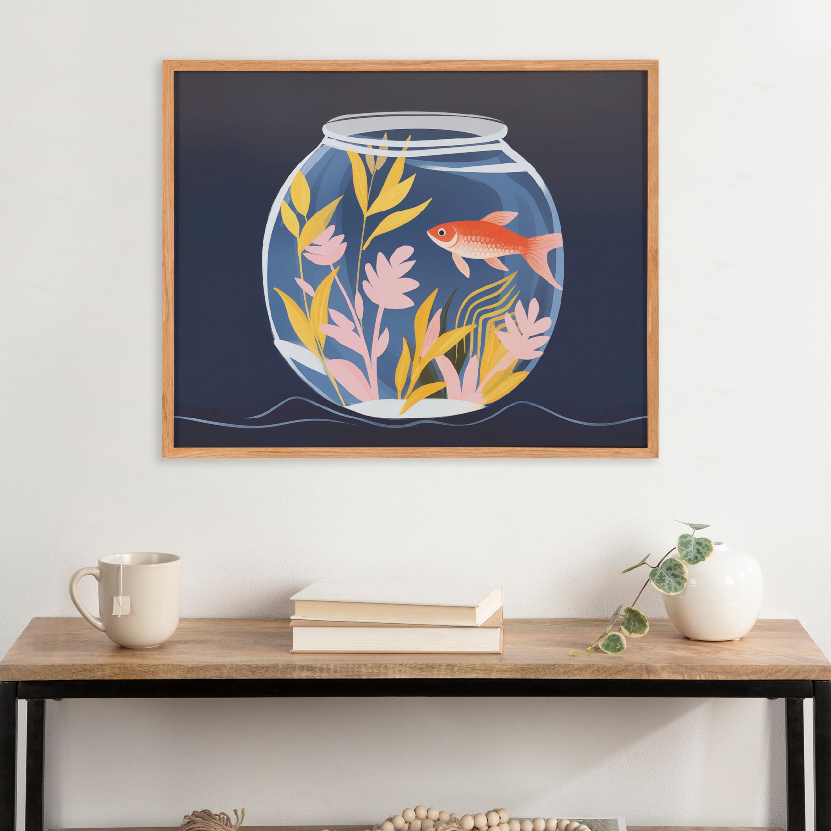 A playful and colorful illustration of a pet goldfish surrounded by vibrant botanicals in a fish tank. Printed in the USA in Waunakee, Wisconsin, this modern framed wall art is sure to bring joy to your space. Our design team curates art that will fit perfectly in any room of your home. Printed on semi-gloss paper made of responsibly sourced wood fibers and framed with a simple solid wood gallery frame, this wall art is easy to display on the wall and will match any décor style. Showcase this curated art in your living room, bedroom, home office, kitchen, bathroom, nursery, or anywhere you want to bring a little beauty and charm to your walls. Specializing in home décor, we are continually bringing timeless works of art for the traditional decorator as well as trend-forward pieces for that eclectic art lover. Our high-quality framed wall art also makes excellent gifts for birthdays, holidays, or housewarming parties.