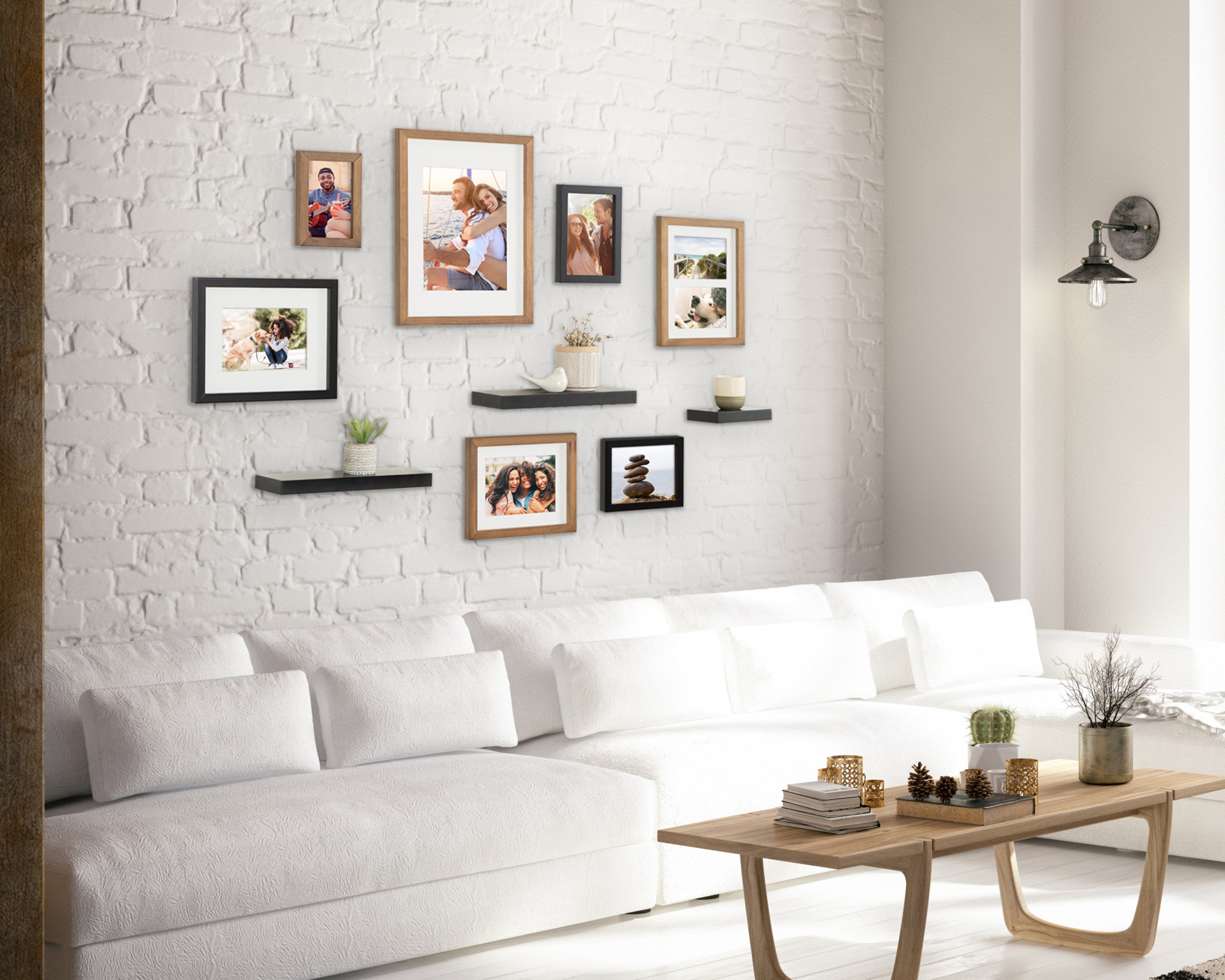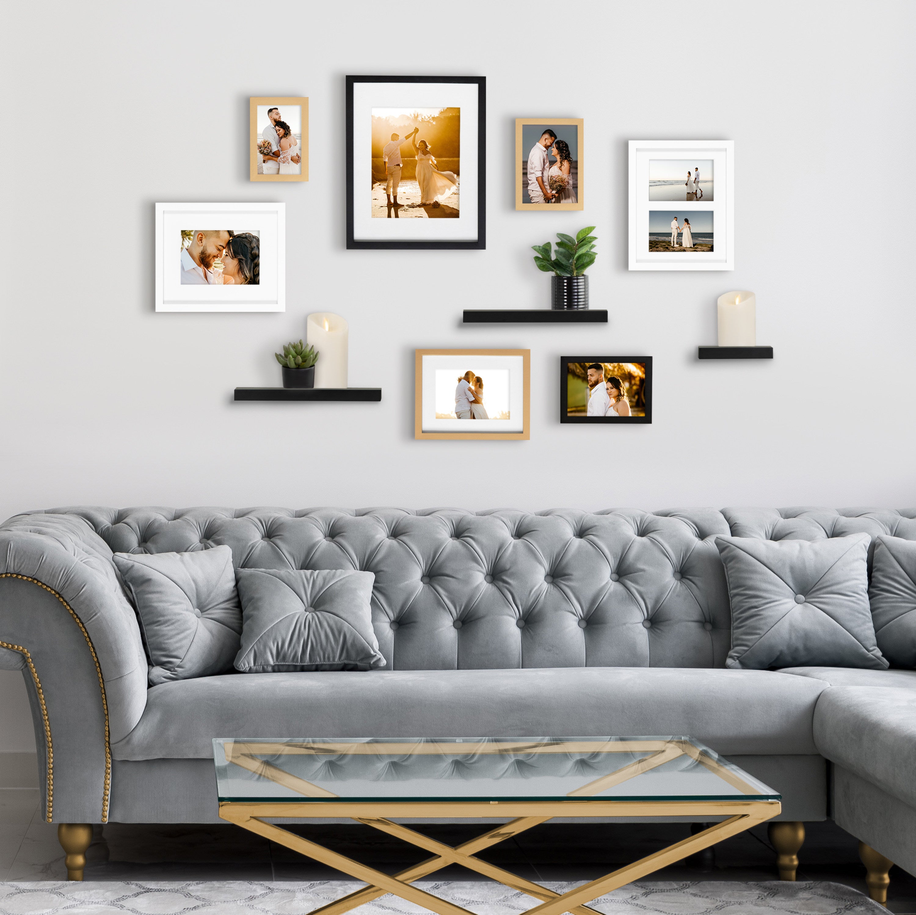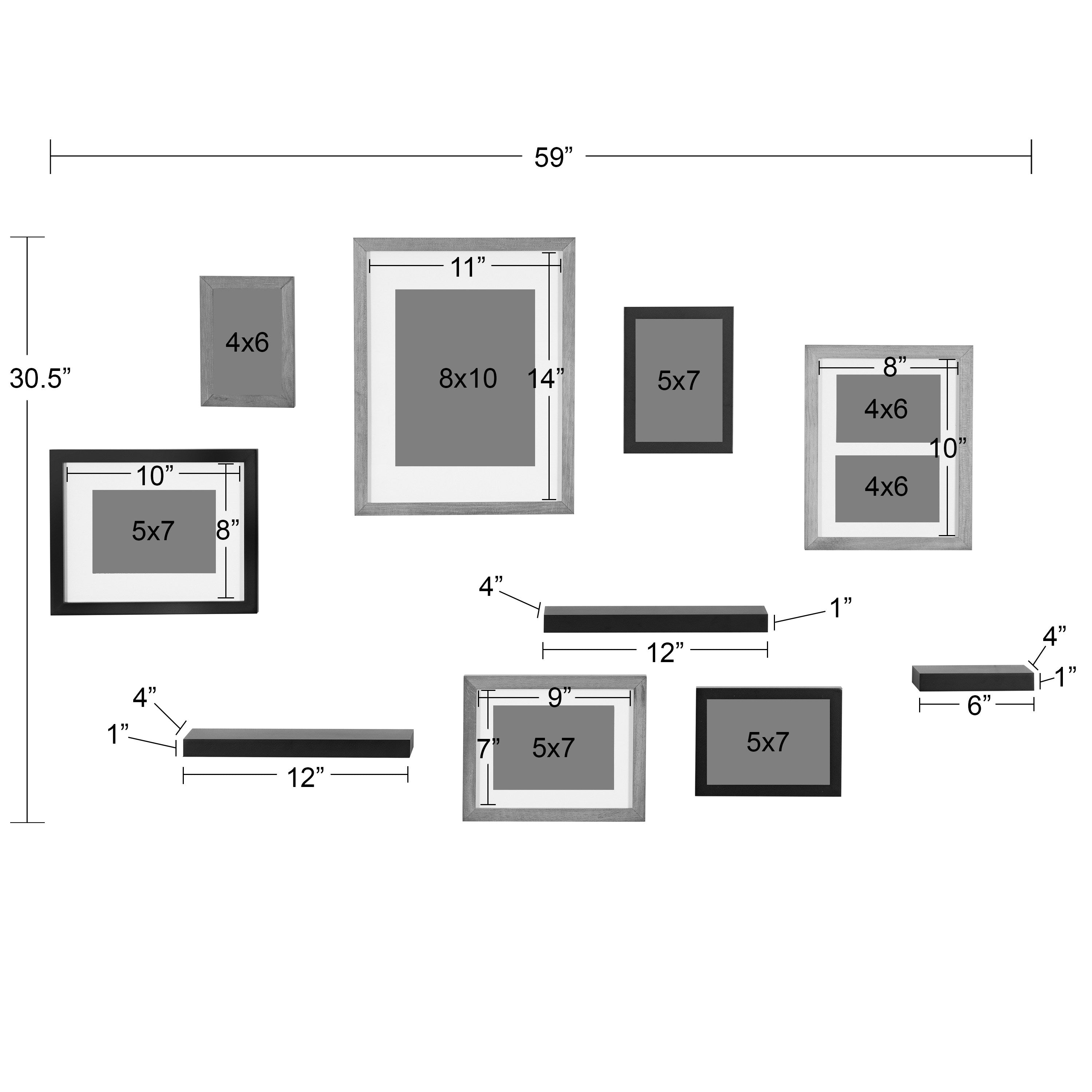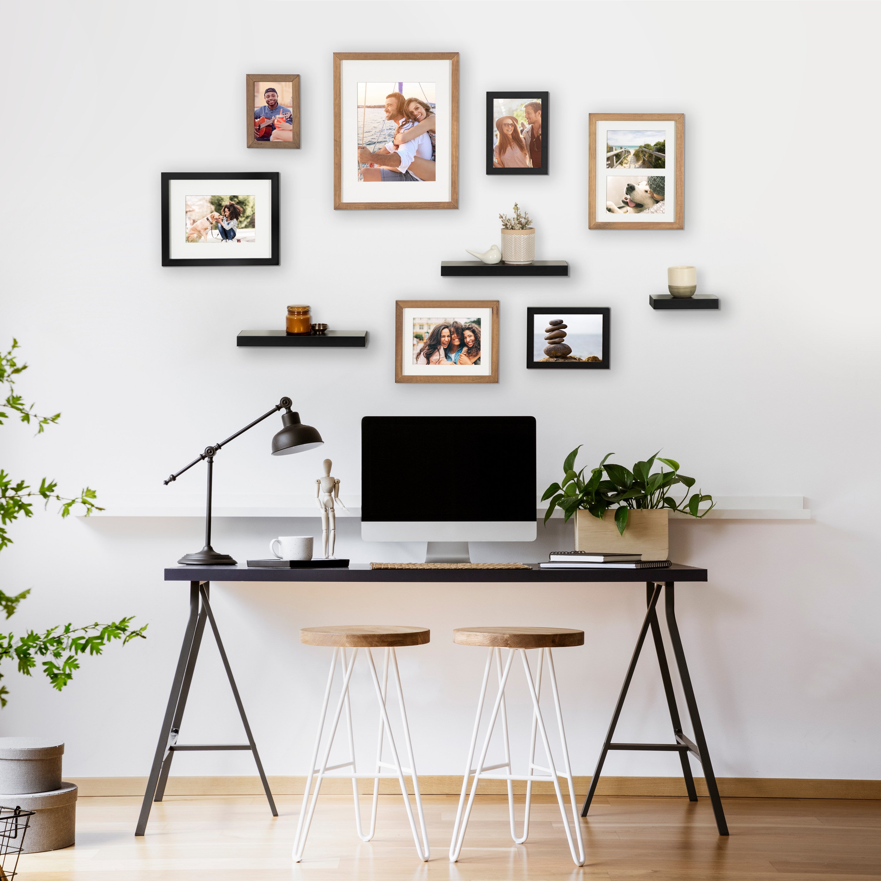 This sophisticated Gallery wall frame and shelf kit bring a farmhouse elegance to any wall while celebrating your most cherished memories. This set features seven frames of various sizes and three shelves for convenient storage and display. Each of these frames has multiple rustic finishes inspired by simplistic, farmhouse aesthetics. These cozy and rustic frames are a beautiful addition to any living space.