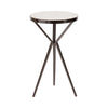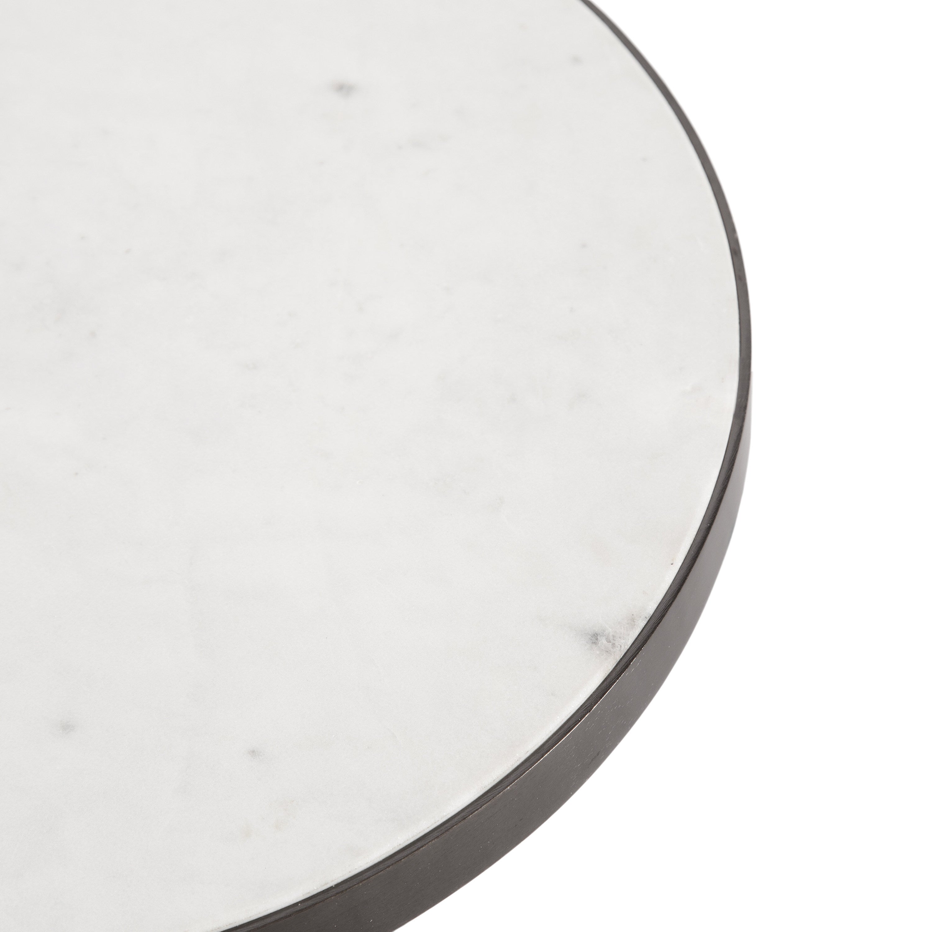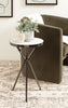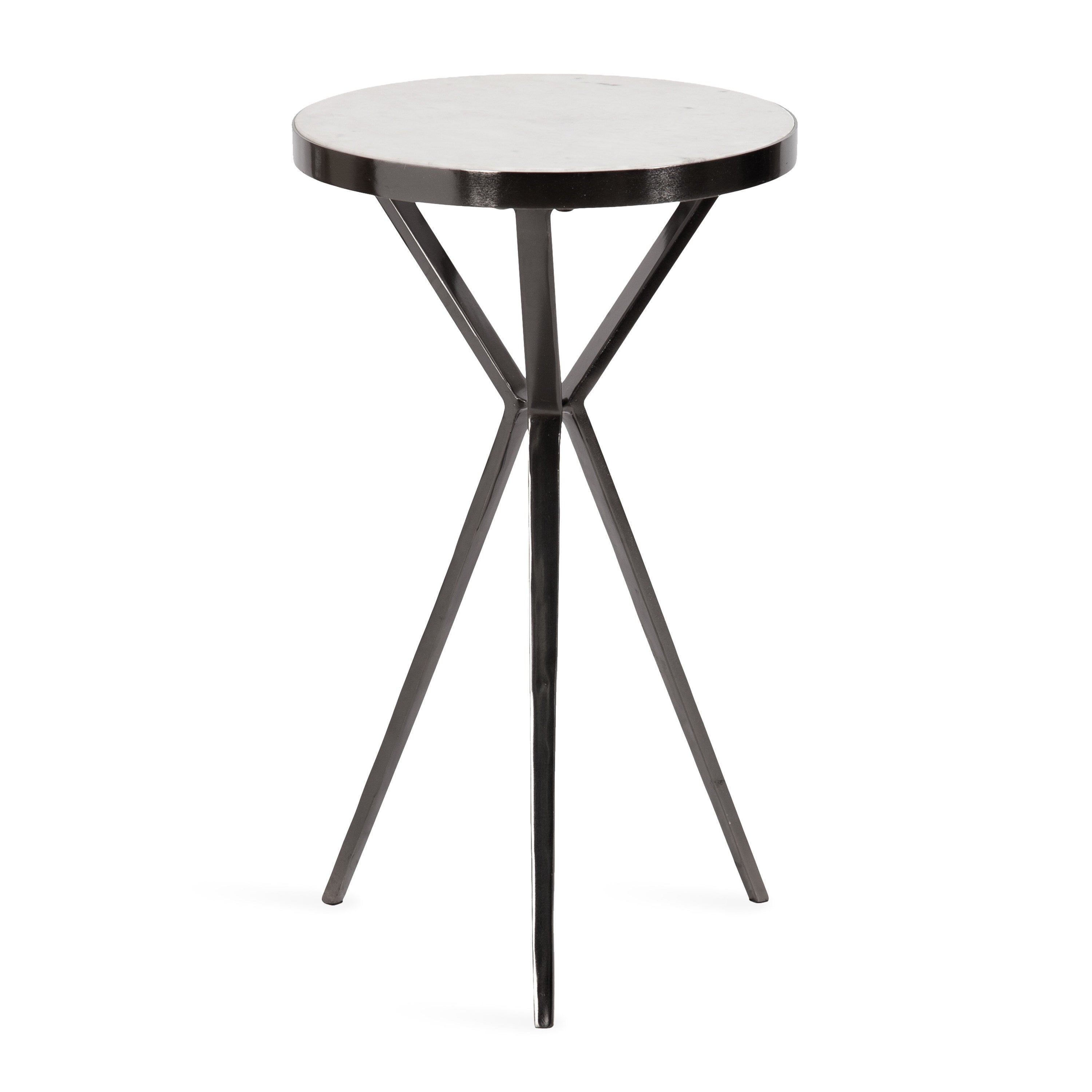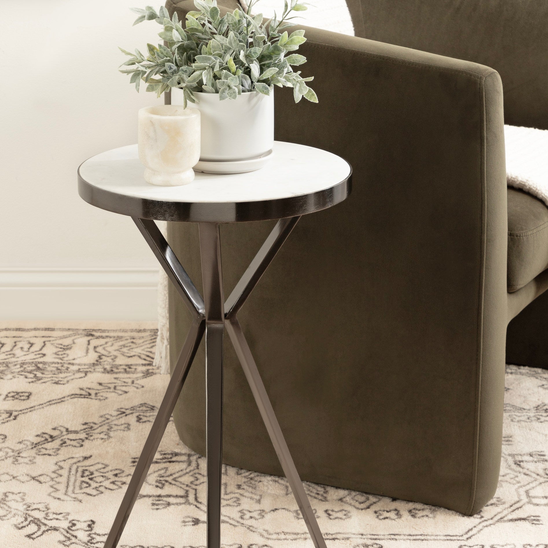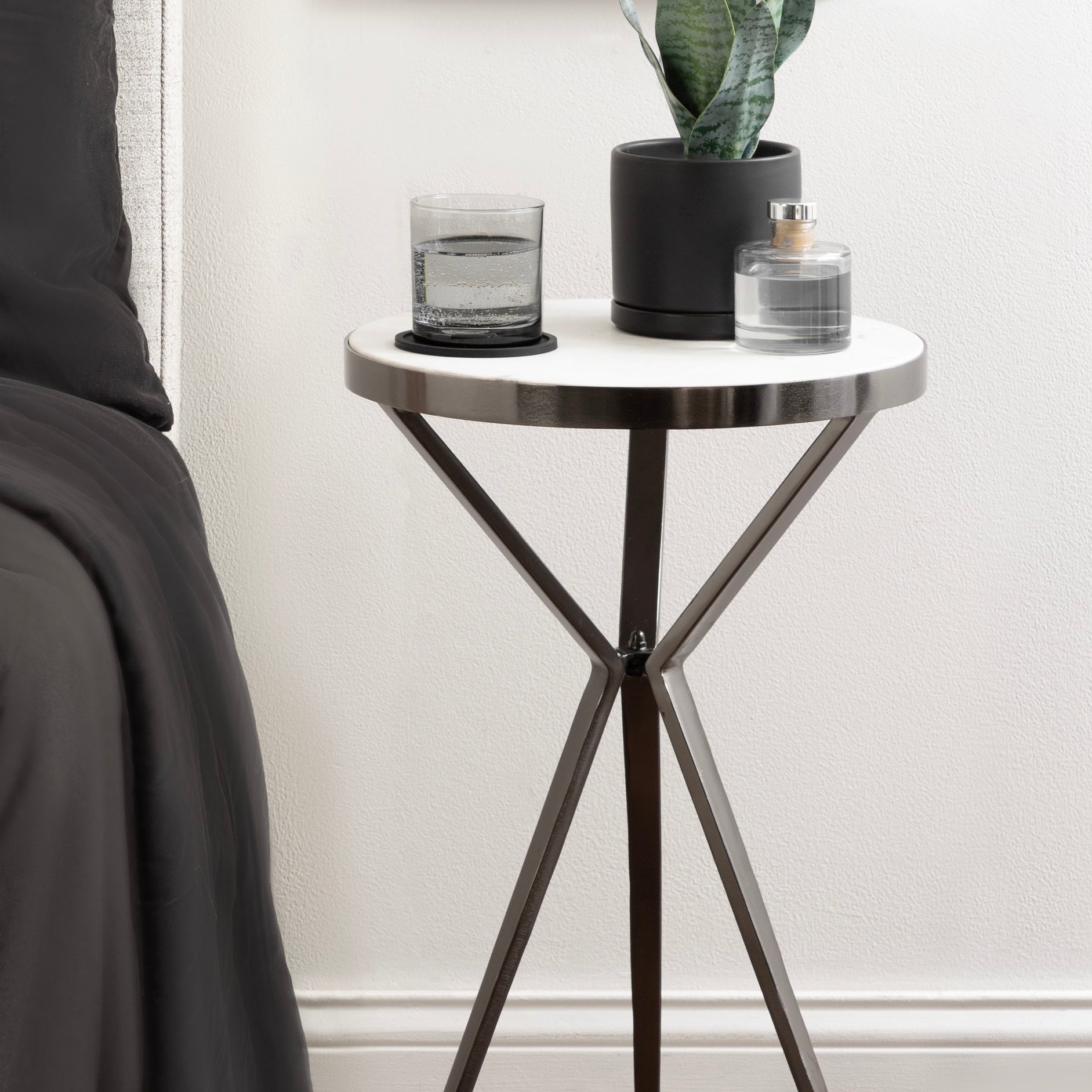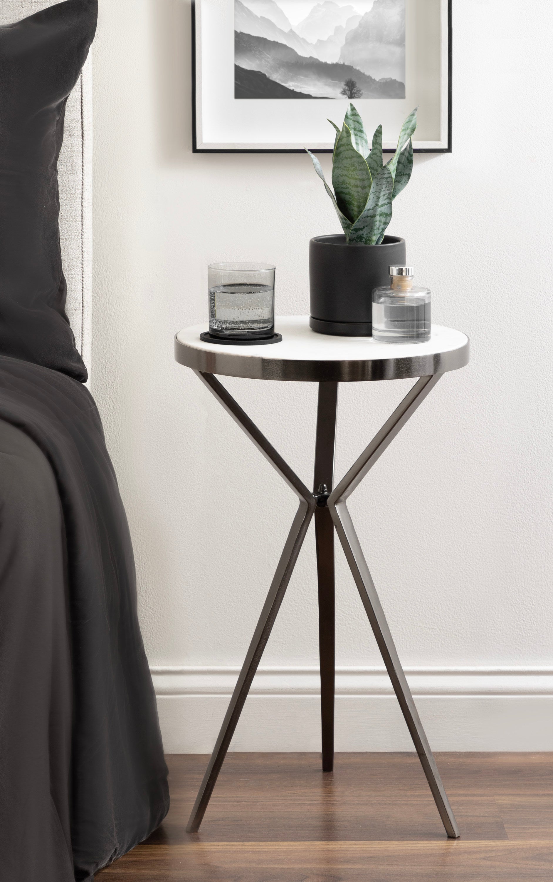 The bold and artistic modern look of the side table is the perfect display piece for your home. This marble side table offers a bold and sophisticated look, featuring a tabletop that is crafted in India from authentic marble. The round nightstand's base boasts an elevated finish and tripod leg design, making it a fabulous standout in any living room, bedroom, entryway, or dining room. The tripod legs are each tapered, giving them a chic look. The natural marble top features variations within the veining, giving your space a one-of-a-kind living room table. This end table is fantastic for showcasing elegant decor accents, faux plants, media remotes, and more. Assemble this fabulous statement piece in a matter of minutes with the quick two-step assembly process.